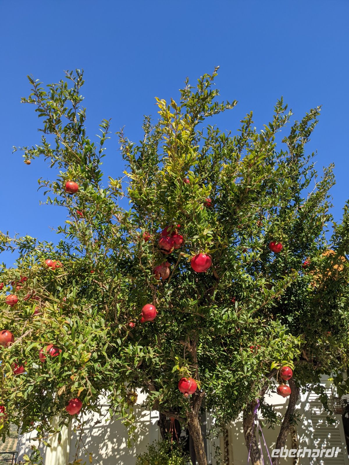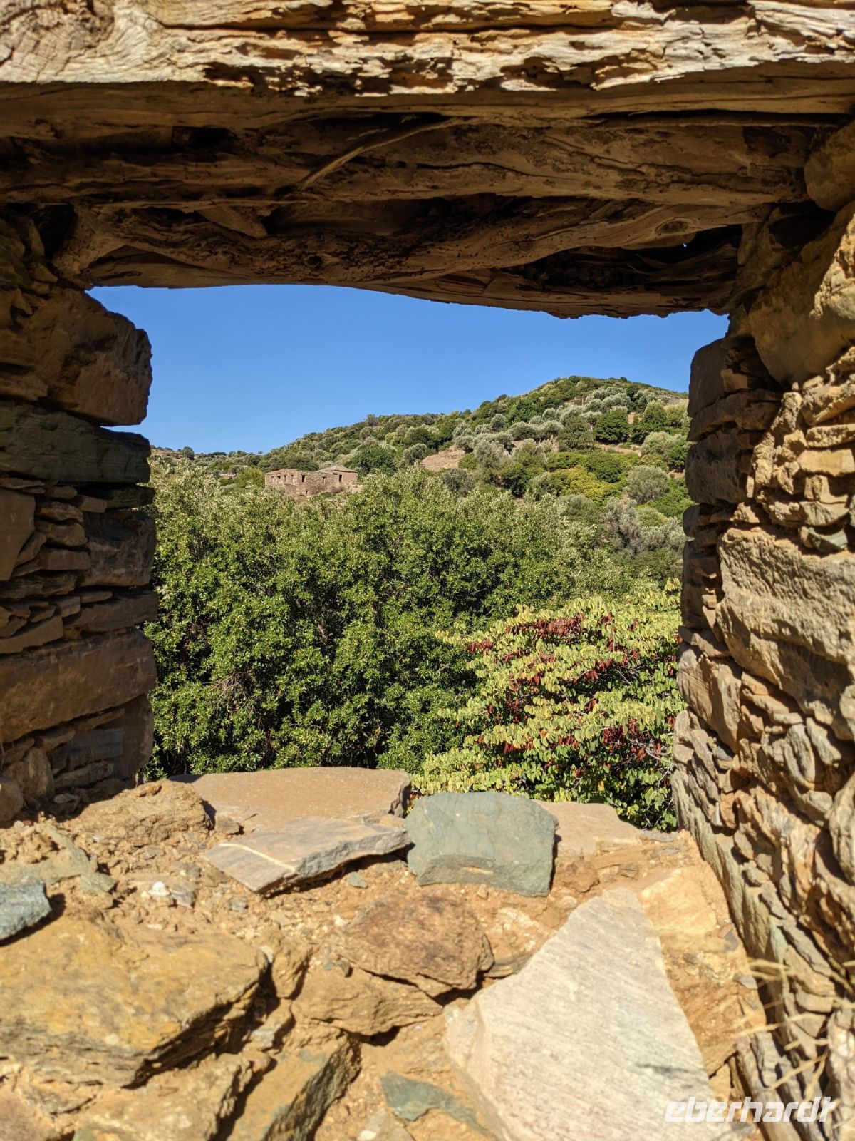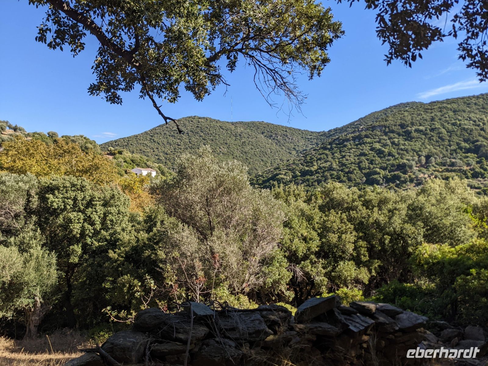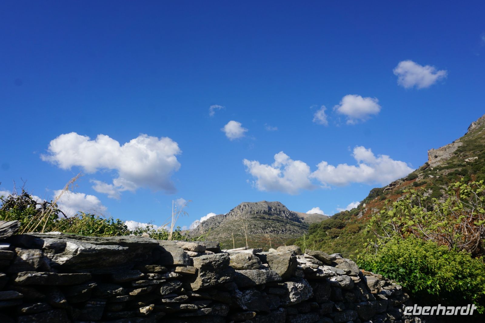 Auch unser nächster Startpunkt war nicht weit vom Hotel entfernt. Vom Dorf Reouzi ging es auf schönen breiten Wegen ein Stück bergauf zum verlassenen Dorf Kellia. Die noch bestehenden Ruinen ermöglichten einen Eindruck davon, wie das Leben vor rund 100 Jahren dort ausgesehen haben muss. Eine vielfältige Vegetation am Wegesrand mit Granatapfelbäumen und Olivenbäumen bot ein bisschen Schatten. Nach den Ausführungen von Kostas über das Dorf ging es weiter zu einem schönen Aussichtspunkt mit Blick auf das Meer. Die Wanderung war für alle gut machbar und ist definitiv auch für Wanderanfänger geeignet. Wieder zurück in Reozzi kehrten wir noch in einer Taverne ein, wo alle ein erfrischendes Getränk oder einen griechischen Kaffee zu sich nahmen. Ein wunderbarer Abschluss der letzten Wanderung. Hier mussten wir uns dann auch leider bereits von Kostas verabschieden.