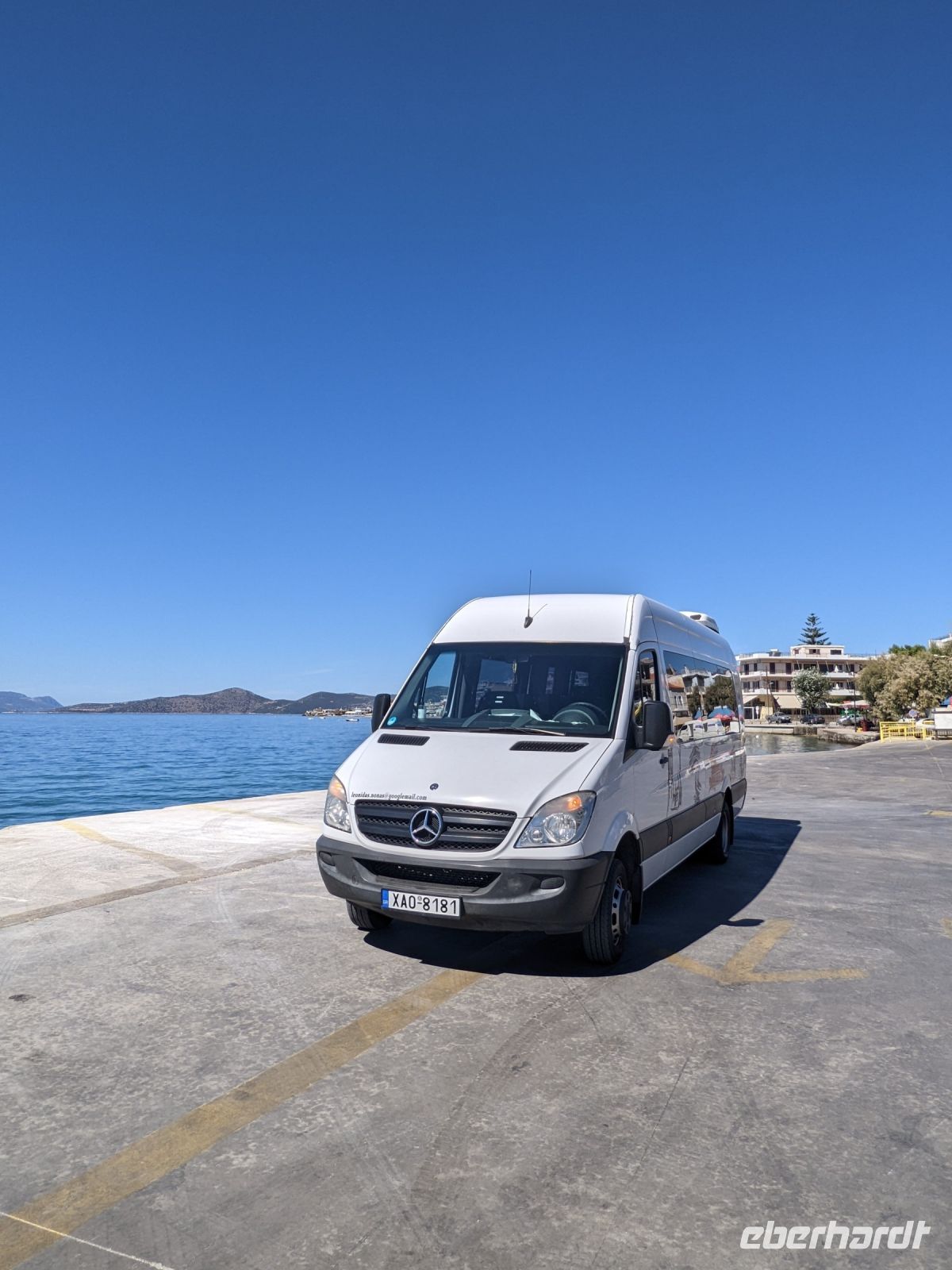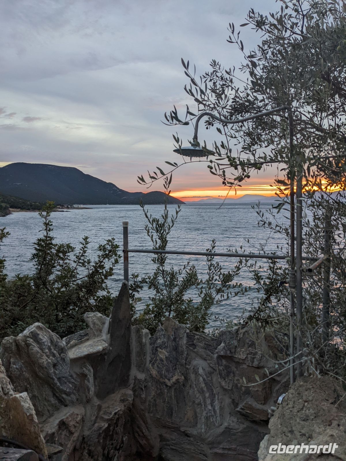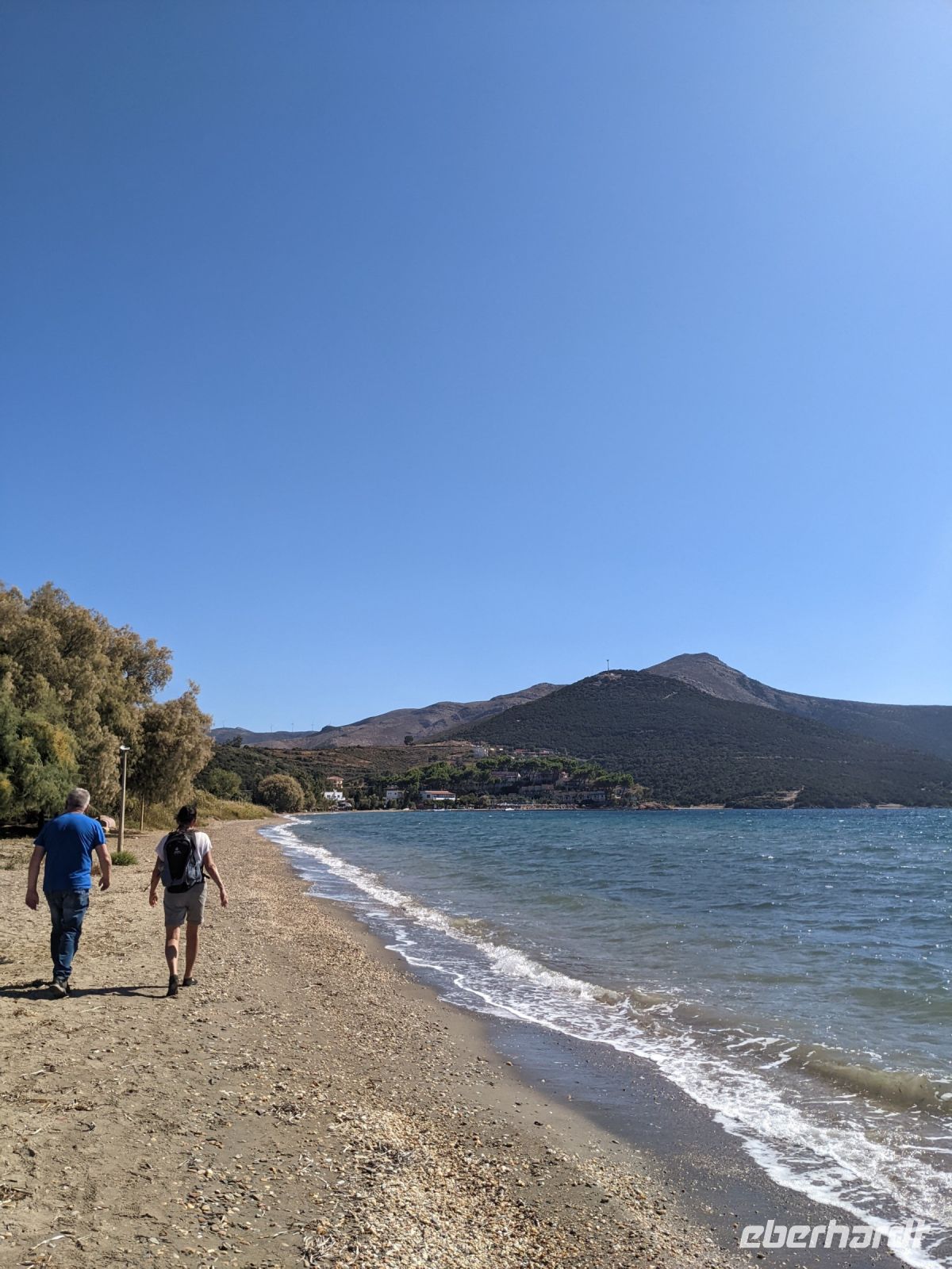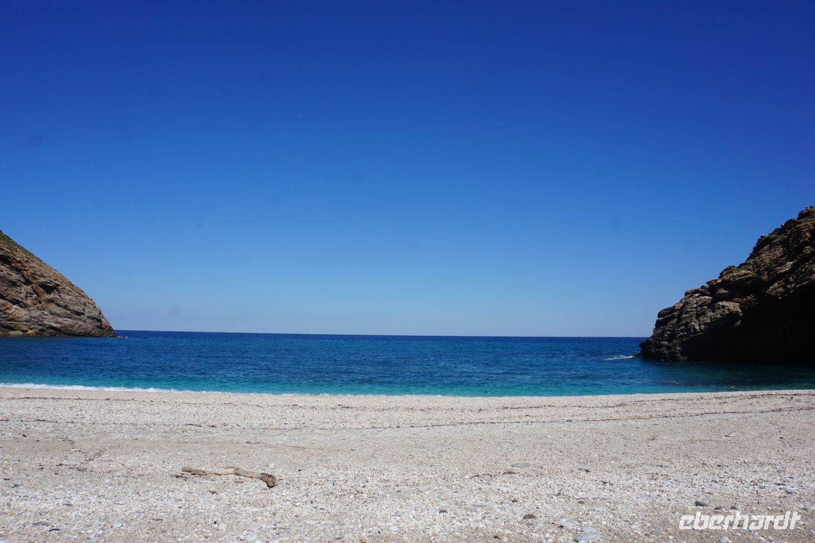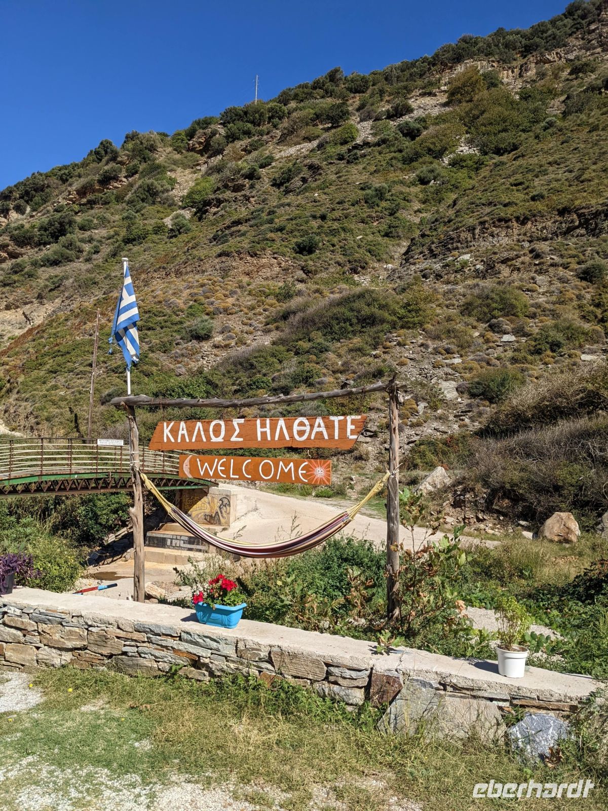 Nach dem ersten Kennenlernen aller Reiseteilnehmer beim Frühstück stieß unser Wanderreiseleiter Kostas zu uns. Der gebürtige Grieche wirkte unumstößlich mit seinem Wanderstock, der sonnengegerbten Haut und seiner ruhigen Art. Und schon ging es los! Wir erreichten unseren Startpunkt nach etwa 1,5 h Fahrt durch die wunderschönen Landschaften des Südostens der Insel. Alle konnten an einer Quelle die Trinkvorräte nochmals auffüllen. Zum Einstieg war diese Wanderung hervorragend - eine gute Mischung zwischen bergauf und bergab, teilweise schmale Pfade und immer mal wieder schattige Plätzchen für eine Trinkpause oder zum Genuss des Ausblicks. Nach etwas mehr als einer Stunde laufen, blitzte dann auch erstmals das Meer zwischen den Bergen auf - unser Ziel war in Sichtweise. Damit stieg auch der Antrieb und als es nach einiger Zeit runter zum Strand ging, neigte sich die erste Wanderung des Urlaubs nach etwa 3 Stunden dem Ende zu. Eine Erfrischung an der Kantina mit Soda, Wasser oder Bier kam da genau richtig. Dann ging es auch schon an den Strand. Nach zwei Stunden Entspannung machten wir uns auf den Weg Richtung Bus, der ein kleines Stück oberhalb des Strandes auf uns wartete. Wieder zurück am Hotel nutzten einige die Möglichkeit bei herrlichem Sonnenschein ins glasklare Meer zu springen. Danach gab es Abendessen. An zwei großen Tischen im Außenbereich des Restaurants saßen wir gemeinsam, besprachen die Ereignisse des Tages und lernten uns mehr und mehr bei einem wunderschönen Blick auf den Sonnenuntergang kennen.