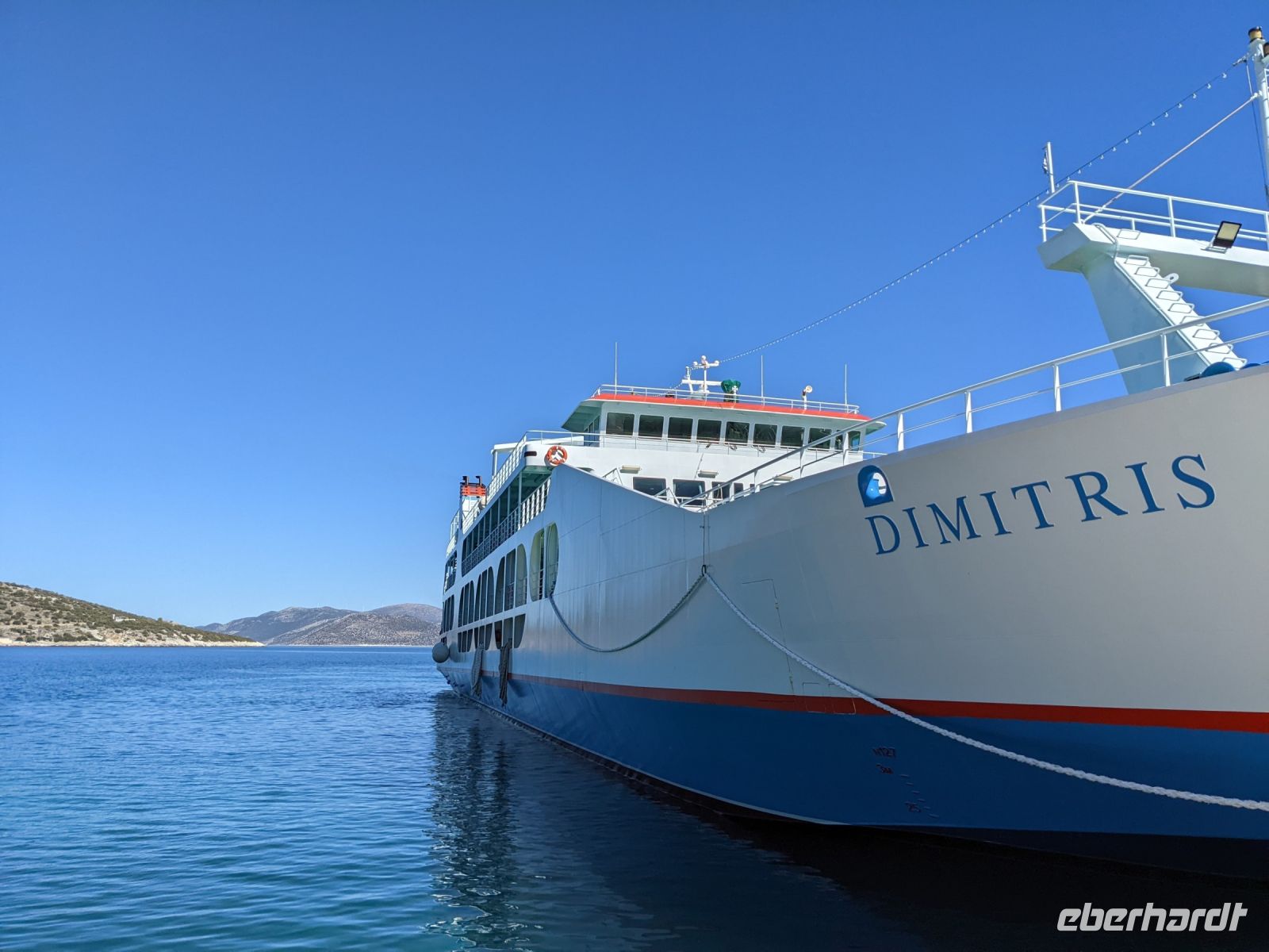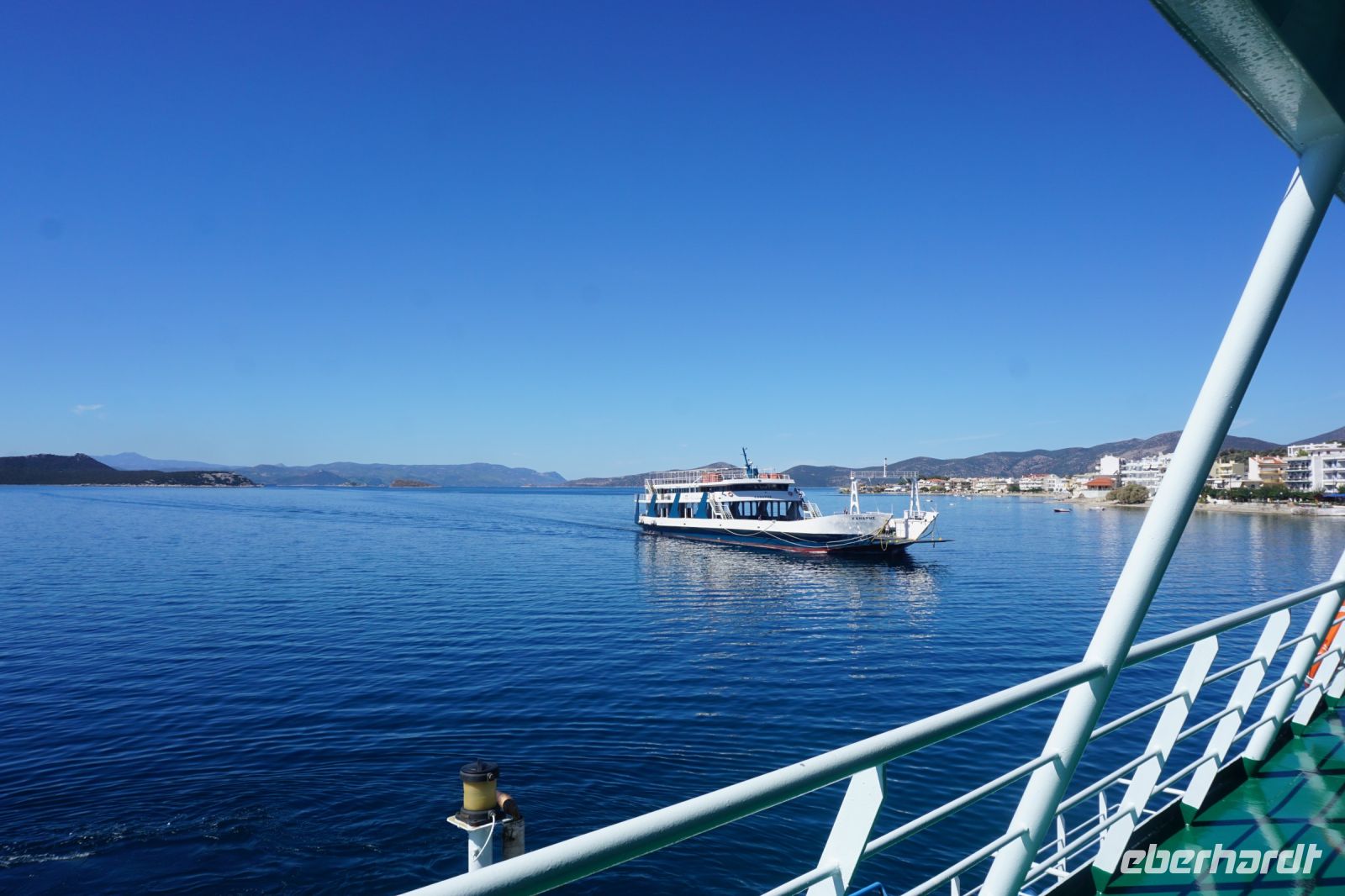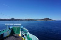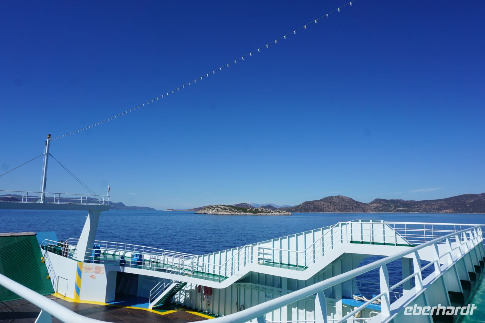 Für die Gruppe gab es unterschiedliche Zeiten der Abreise. Einige starteten direkt nach dem Frühstück, andere blieben noch bis zum frühen Nachmittag. Die Teilnehmer aus Berlin gehörten zu letzteren dazu. Daher konnten wir den Vormittag am Hotelstrand genießen und nochmal in das glasklare, an diesem Tag vollkommen wellenarme Meer springen. Dann mussten auch wir Euböa leider verlassen und nahmen die Fähre nach Agia Maria. Die Überfahrt war ein wirklich toller Abschluss der Woche - eine eindrucksvolle Erfahrung. Wir hatten noch ein wenig Zeit bis wir zum Flughafen mussten und stoppten in Nea Makri. Dort ging es für Proviant und Mitbringsel in einen Supermarkt. Gleich nebenan wurde gerade eine Kirche für eine Trauung vorbereitet und wir konnten einen Blick hineinwerfen. Die bunte Bemalung und die imposanten Kronleuchter stachen besonders hervor. Danach fuhren wir zum Flughafen. Angekommen wieder in Deutschland, erhielten wir alle nach einer kleinen Wartezeit unser Gepäck und die Zeit des Abschieds rückte heran. Mit vielen neuen Eindrücken und Erinnerungen im Sinn fuhren wir in Richtung unserer Zuhause. Eine schöne gemeinsame Woche hatte ihren Abschluss gefunden.