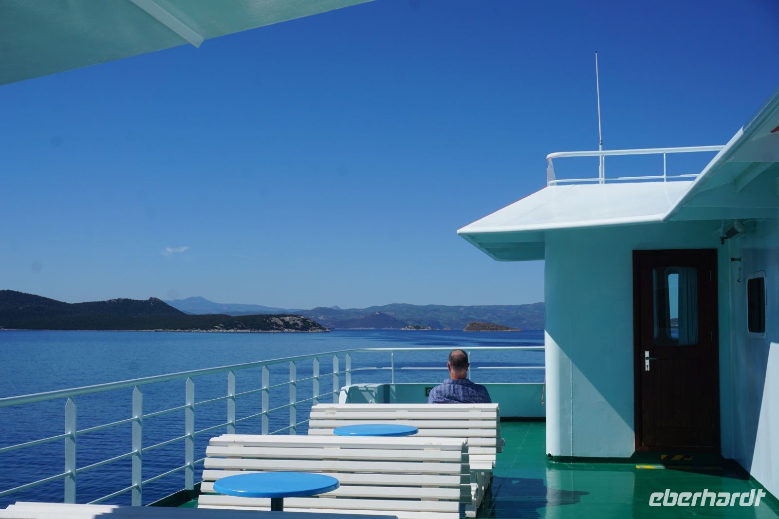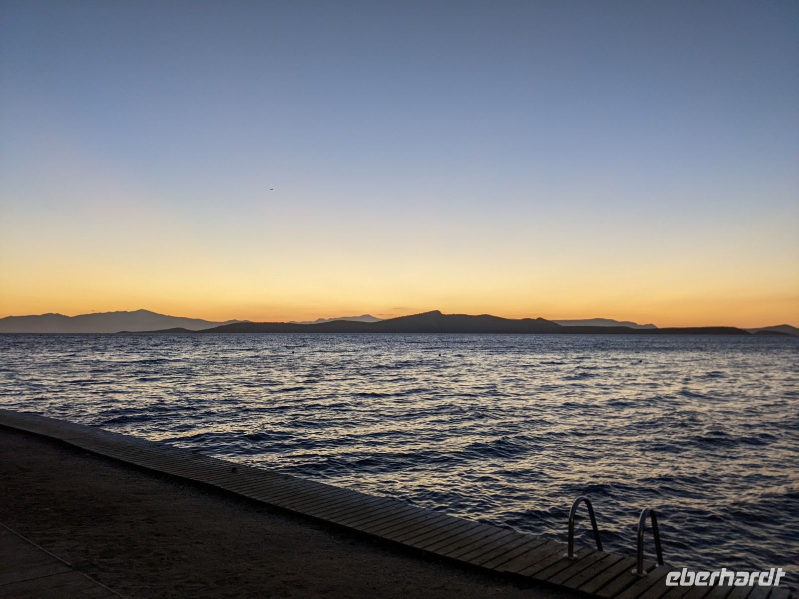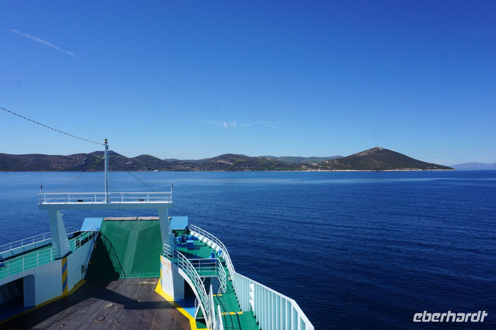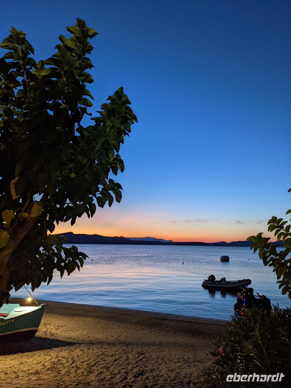 Für die Gruppe gab es unterschiedliche Zeiten der Abreise. Einige starteten direkt nach dem Frühstück, andere blieben noch bis zum frühen Nachmittag. Die Teilnehmer aus Berlin gehörten zu letzteren dazu. Daher konnten wir den Vormittag am Hotelstrand genießen und nochmal in das glasklare, an diesem Tag vollkommen wellenarme Meer springen. Dann mussten auch wir Euböa leider verlassen und nahmen die Fähre nach Agia Maria. Die Überfahrt war ein wirklich toller Abschluss der Woche - eine eindrucksvolle Erfahrung. Wir hatten noch ein wenig Zeit bis wir zum Flughafen mussten und stoppten in Nea Makri. Dort ging es für Proviant und Mitbringsel in einen Supermarkt. Gleich nebenan wurde gerade eine Kirche für eine Trauung vorbereitet und wir konnten einen Blick hineinwerfen. Die bunte Bemalung und die imposanten Kronleuchter stachen besonders hervor. Danach fuhren wir zum Flughafen. Angekommen wieder in Deutschland, erhielten wir alle nach einer kleinen Wartezeit unser Gepäck und die Zeit des Abschieds rückte heran. Mit vielen neuen Eindrücken und Erinnerungen im Sinn fuhren wir in Richtung unserer Zuhause. Eine schöne gemeinsame Woche hatte ihren Abschluss gefunden.
