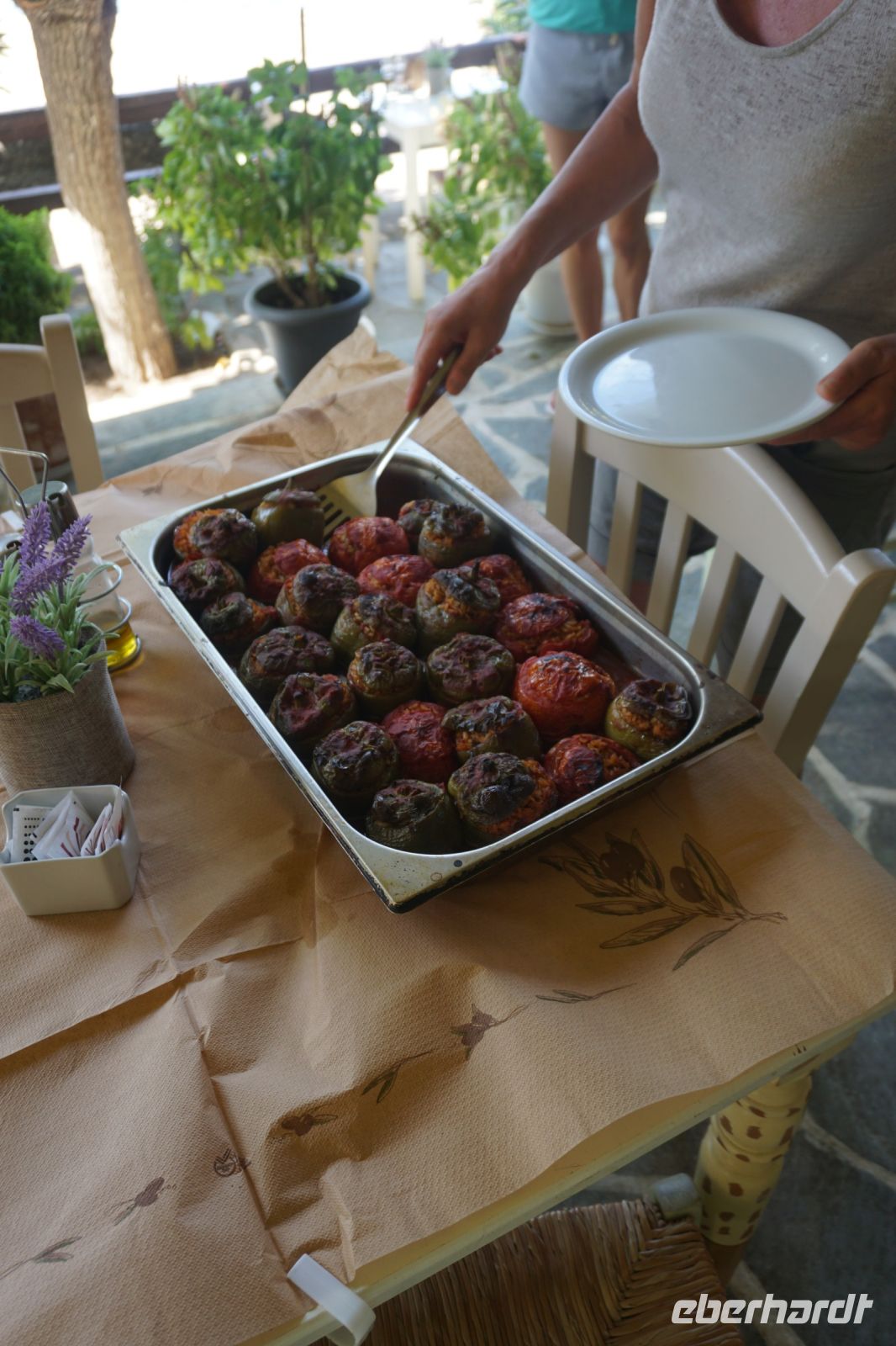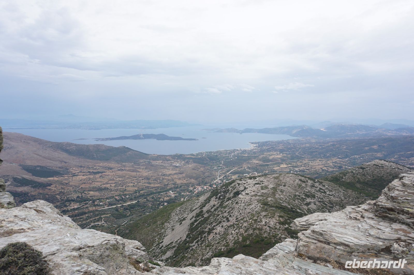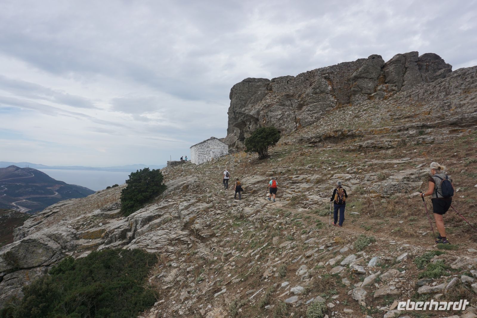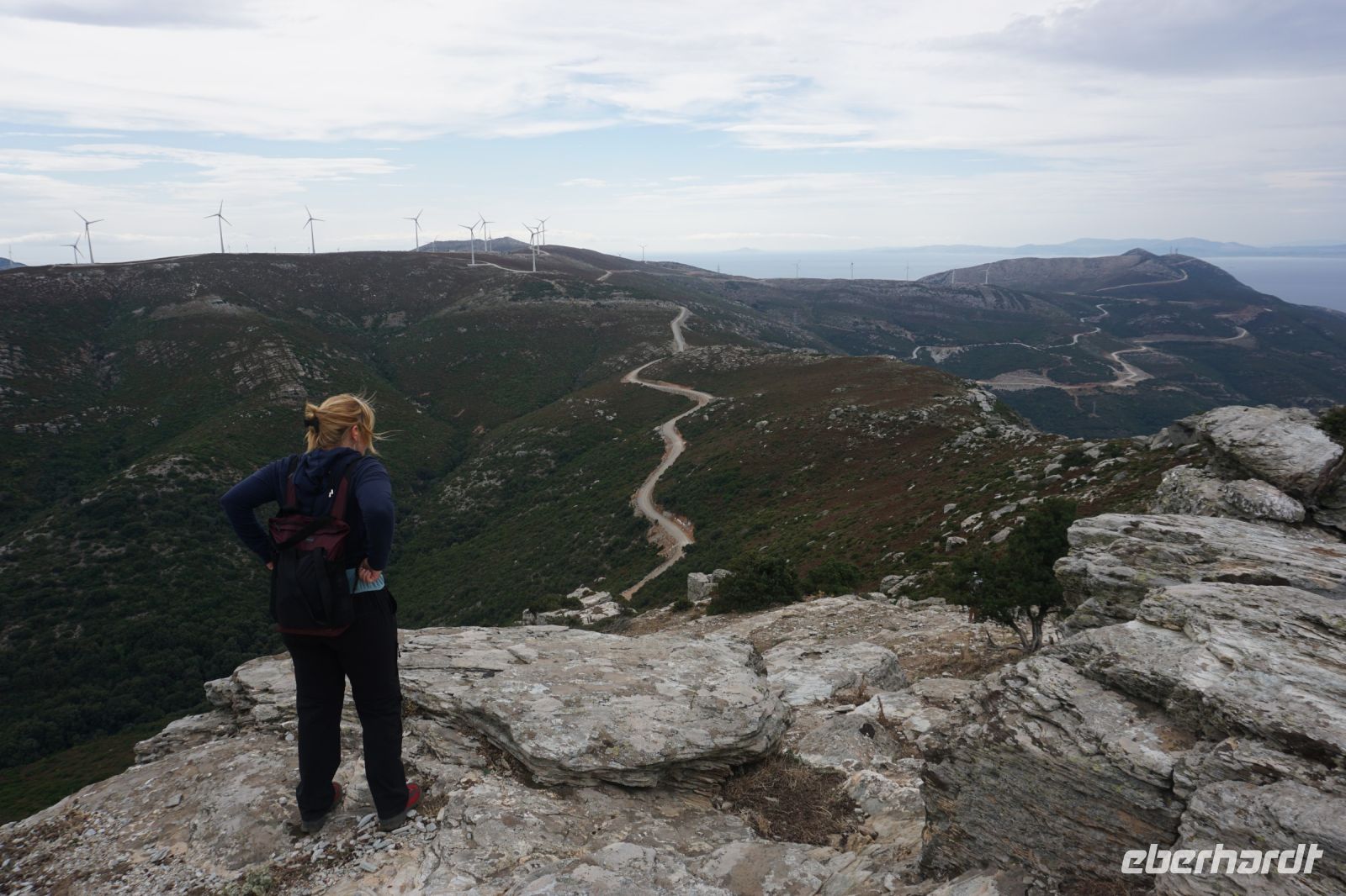 Nach Absprache mit der Gruppe starteten wir heute etwas später mit der Wanderung. Auf der etwa zweistündigen Fahrt in den Norden der Insel gab uns Kostas einige interessante Informationen über die Insel. So ging es beispielsweise um die Olivenbäume und woran man gutes Olivenöl erkennt sowie um die Herstellung von Schieferplatten. Begleitet wurden diese Ausführungen von den schönen Ausblicken auf der Fahrt entlang der Küstenstraße der Westseite. Vorweg warnte uns Kostas, dass die heutige Wanderung sehr anspruchsvoll sei und es streckenweise nur bergauf ginge. Er besprach mit dem Busfahrer die Möglichkeit bis zu einem gewissen Punkt hoch zu fahren. Von dort waren es noch etwa 30 Minuten zu Fuß zu unserem Zielpunkt. Einige aus der Gruppe entschieden sich für diese Variante. Der Rest ging mit Kostas. Unten konnten wir unsere Trinkwasservorräte nochmals an einer kalten Quelle auffüllen. Die ursprünglich von ihm angedachte Route war dann durch ein Radsportevent gesperrt, daher wählte er eine Alternativroute. Diese lässt sich als sehr anspruchsvoll einstufen und ist nicht für Wanderanfänger geeignet. Gutes Schuhwerk und Wanderstöcke sind empfehlenswert. Nach etwa 3 Stunden erreichten wir dann ziemlich geschafft, aber stolz, das Ziel. Diese Wanderung, so anstrengend sie auch war, schweißte die Gruppe wirklich zusammen. Man unterstützte, motivierte und baute sich gegenseitig auf. Oben angekommen, genossen wir den spektakulären Ausblick, stärkten uns mit dem mitgebrachten Proviant und tauschten uns mit den anderen aus. Der Bus wartete ein Stück unterhalb an der Straße auf uns. Durch den verzögerten Start am Morgen kamen wir erst relativ spät zurück, machten uns kurz frisch und gingen dann direkt zum Abendessen. Danach wechselten wir noch in die Hotelbar und ließen den Tag Revue passieren.