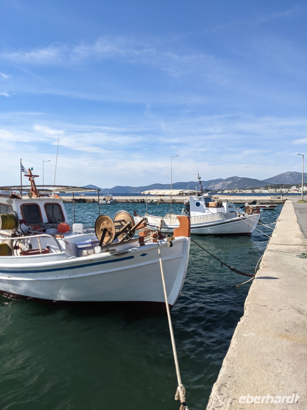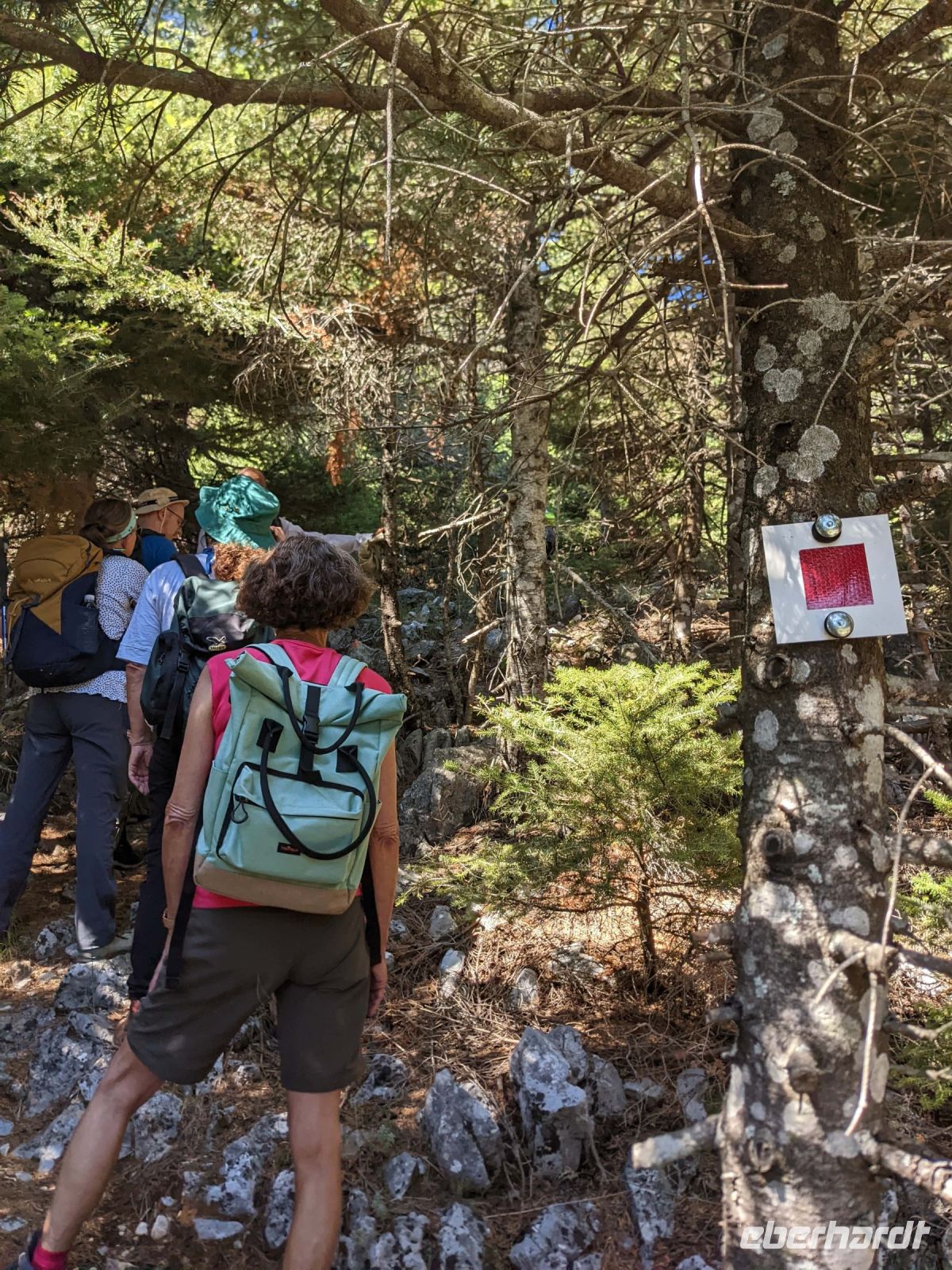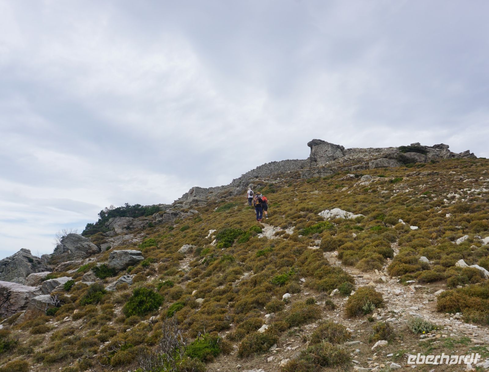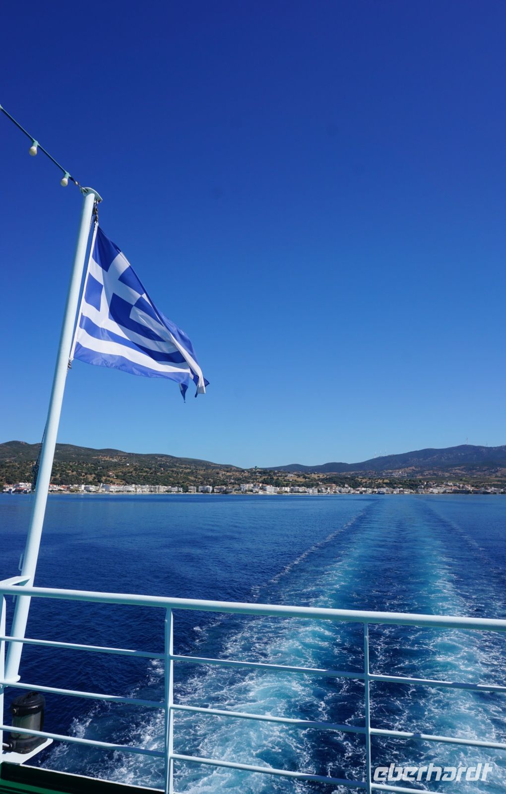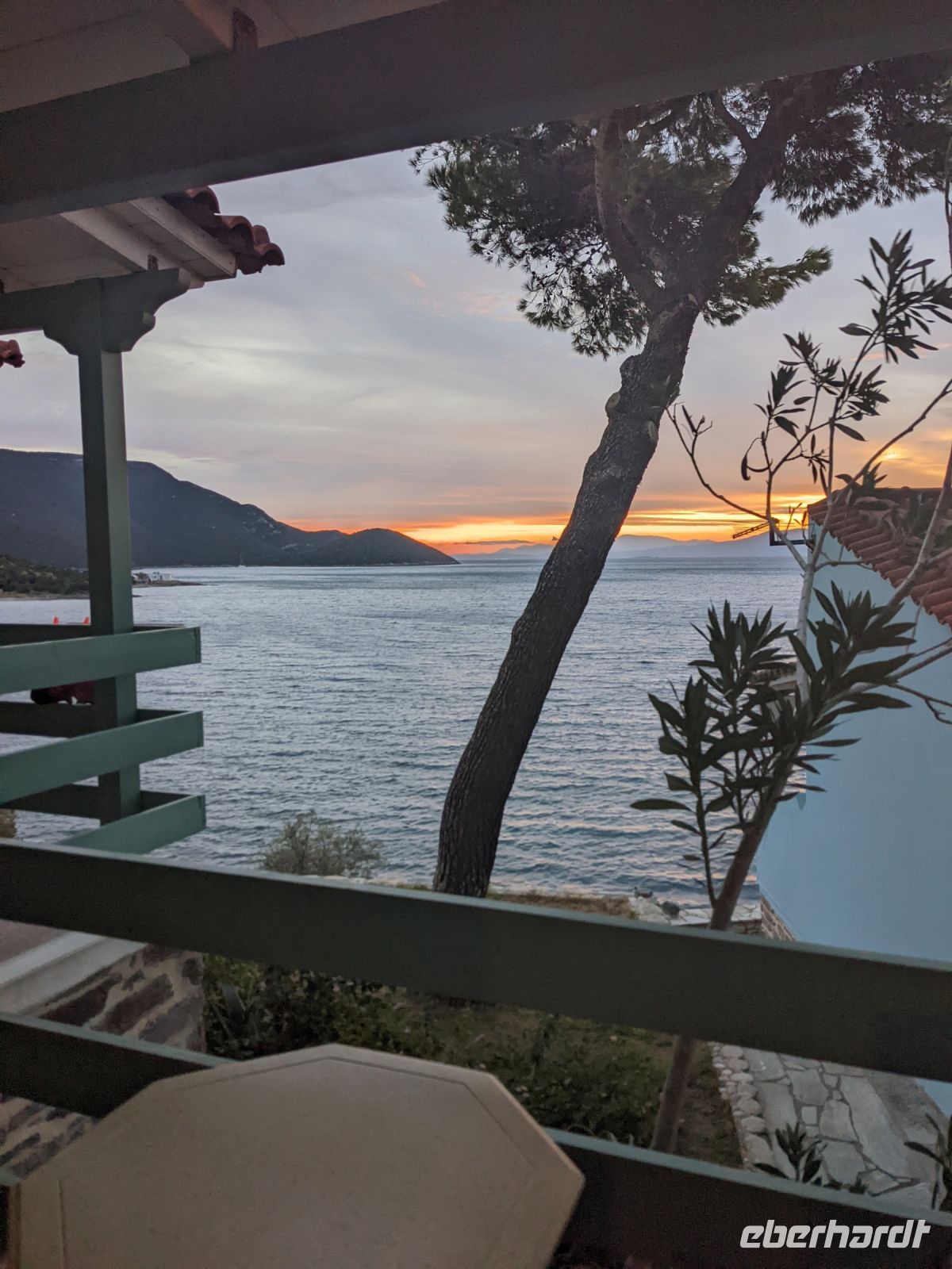 Nach Absprache mit der Gruppe starteten wir heute etwas später mit der Wanderung. Auf der etwa zweistündigen Fahrt in den Norden der Insel gab uns Kostas einige interessante Informationen über die Insel. So ging es beispielsweise um die Olivenbäume und woran man gutes Olivenöl erkennt sowie um die Herstellung von Schieferplatten. Begleitet wurden diese Ausführungen von den schönen Ausblicken auf der Fahrt entlang der Küstenstraße der Westseite. Vorweg warnte uns Kostas, dass die heutige Wanderung sehr anspruchsvoll sei und es streckenweise nur bergauf ginge. Er besprach mit dem Busfahrer die Möglichkeit bis zu einem gewissen Punkt hoch zu fahren. Von dort waren es noch etwa 30 Minuten zu Fuß zu unserem Zielpunkt. Einige aus der Gruppe entschieden sich für diese Variante. Der Rest ging mit Kostas. Unten konnten wir unsere Trinkwasservorräte nochmals an einer kalten Quelle auffüllen. Die ursprünglich von ihm angedachte Route war dann durch ein Radsportevent gesperrt, daher wählte er eine Alternativroute. Diese lässt sich als sehr anspruchsvoll einstufen und ist nicht für Wanderanfänger geeignet. Gutes Schuhwerk und Wanderstöcke sind empfehlenswert. Nach etwa 3 Stunden erreichten wir dann ziemlich geschafft, aber stolz, das Ziel. Diese Wanderung, so anstrengend sie auch war, schweißte die Gruppe wirklich zusammen. Man unterstützte, motivierte und baute sich gegenseitig auf. Oben angekommen, genossen wir den spektakulären Ausblick, stärkten uns mit dem mitgebrachten Proviant und tauschten uns mit den anderen aus. Der Bus wartete ein Stück unterhalb an der Straße auf uns. Durch den verzögerten Start am Morgen kamen wir erst relativ spät zurück, machten uns kurz frisch und gingen dann direkt zum Abendessen. Danach wechselten wir noch in die Hotelbar und ließen den Tag Revue passieren.