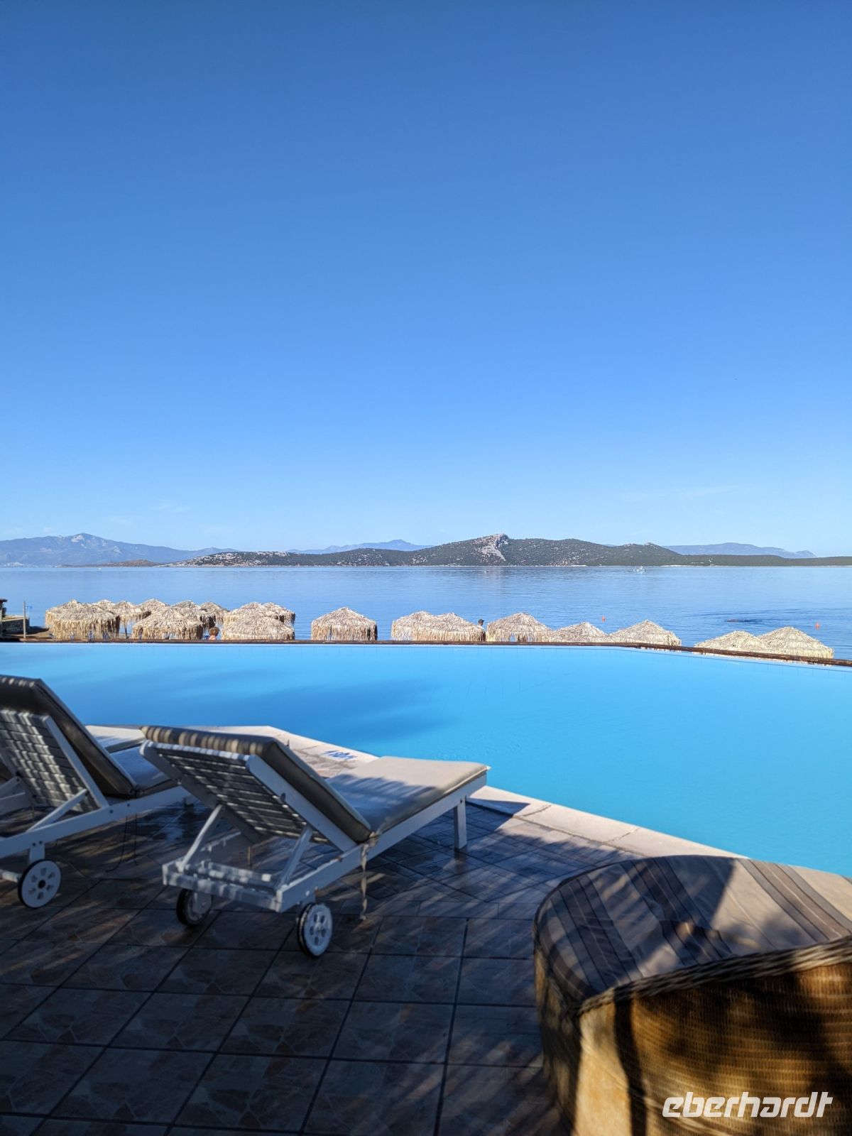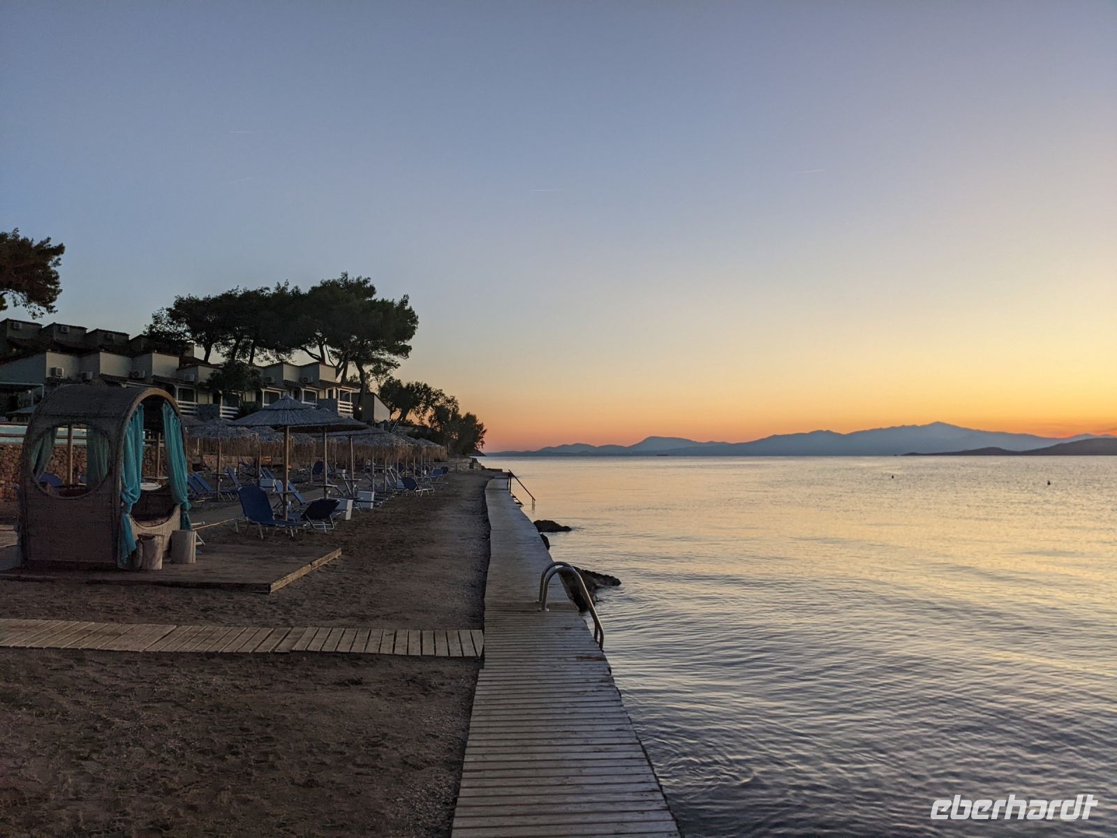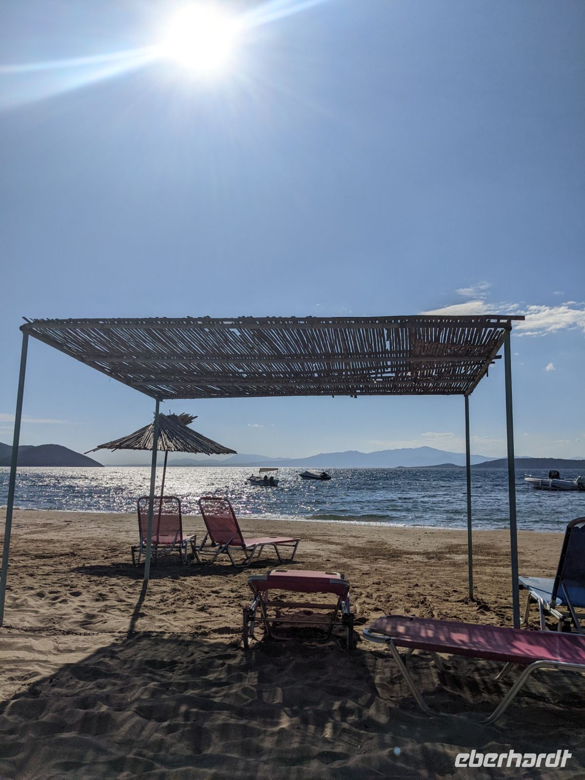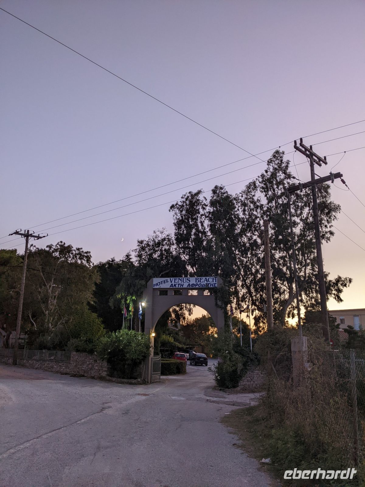 Der Großteil der Gruppe flog von Berlin aus los. Wir trafen uns dann um die Mittagszeit herum dort am Flughafen. Einige kamen per Zubringer, andere wiederum mit dem Zug oder dem Auto. Nach dem ersten Kennenlernen ging es dann durch den Security Check zum Gate. Zum Glück haben es alle rechtzeitig geschafft und wir konnten gemeinsam in den Urlaub starten. Nach einem entspannten Flug holte uns der Bus in Athen ab und wir fuhren nach Nea Styra zum Venus Beach Hotel. Da es recht spät geworden war und das Abendbrotbuffet schon geschlossen hatte, stellte uns das Hotel netterweise noch ein Verpflegungspaket zusammen. Es ging dann sofort auf die Zimmer, um am nächsten Tag wieder fit zu sein. Diese standen als Bungalows verteilt auf der Anlage bereit. Mit dem Meeresrauschen im Ohr ließ es sich gleich viel besser schlafen.