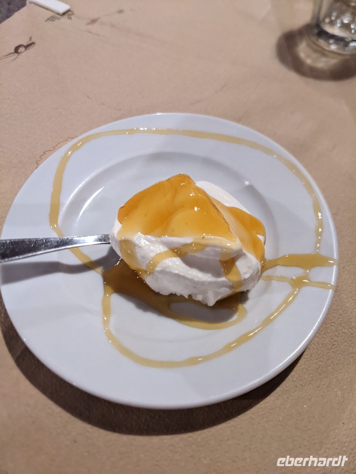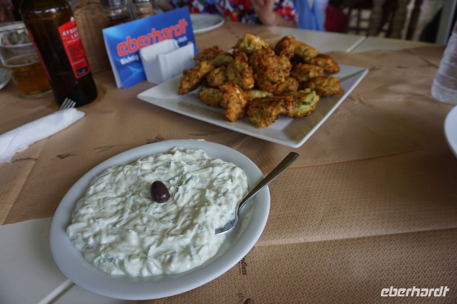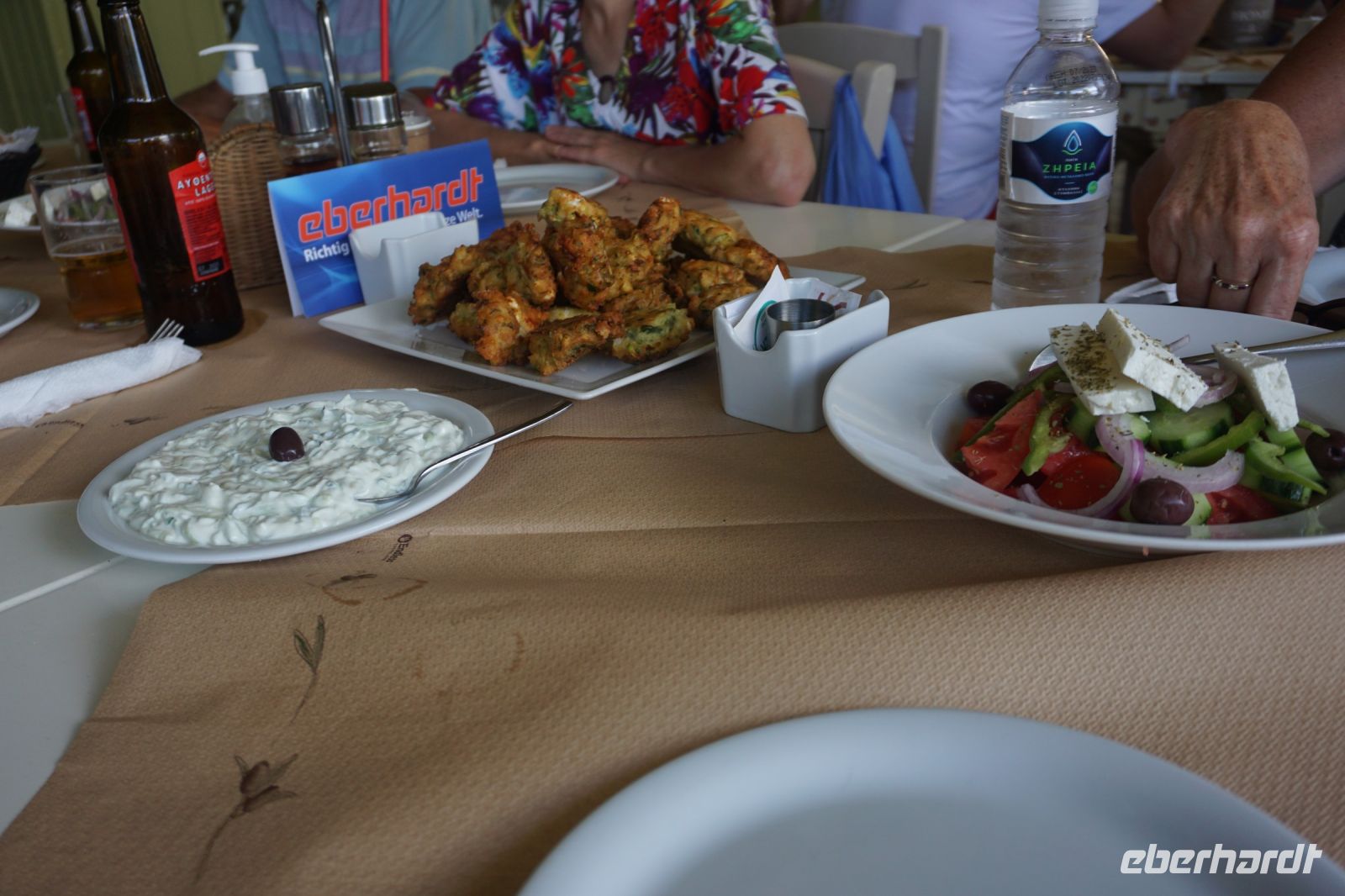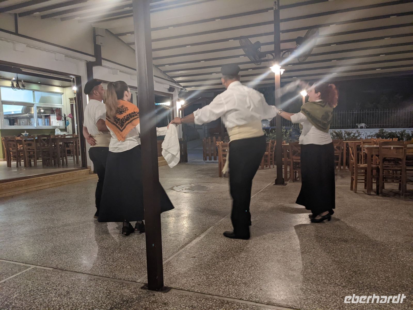 Recht früh am Nachmittag kehrten wir zurück zum Hotel und konnten die restliche Zeit noch am Strand genießen. Auf den Liegestühlen des Hotels lässt es sich gut entspannen, wobei Sonnenschirme aus Bast Schatten bieten. Es blieb dann auch genug Zeit sich frisch zu machen, um sich auf den Griechischen Abend außerhalb des Hotels vorzubereiten. Dieser fand in eben jener Taverne des Nachmittags statt und für uns wurden drei große Tische vorbereitet. Zur Begrüßung reichte man uns einen Ouzo und den ganzen Abend über wurden Wein, Wasser und Erfrischungsgetränke ausgeschenkt. Das Essen war überaus lecker. Es gab griechischen Bauernsalat, frittierte Zucchini, Tsatsiki, frittierten Käse und Brot als Vorspeise. Dann konnte man zwischen Lamm, Schwein und Rind für die Hauptspeise wählen und als Nachtisch wurde leckerer Yogurt mit Honig aufgetischt. Ein gelungenes Essen, das allen sehr geschmeckt hat. Im Anschluss daran fand eine kleine Tanzstunde statt. Wir lernten die Grundschritte eines griechischen Tanzes und konnten diese im Anschluss zu Genüge testen. Zwischen den Einlagen der vier Tänzer griffen sie sich immer mal wieder den ein oder anderen heraus, um mitzutanzen. Nach gelungener Vorstellung und reichlich Applaus für die Tänzer übten wir unter uns die Schrittfolge noch bis weit in den Abend hinein. Ein wunderschöner Abend, der allen in Erinnerung bleiben wird.