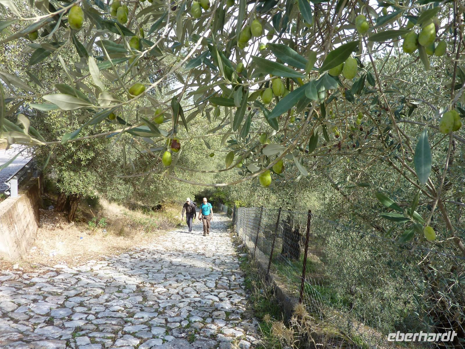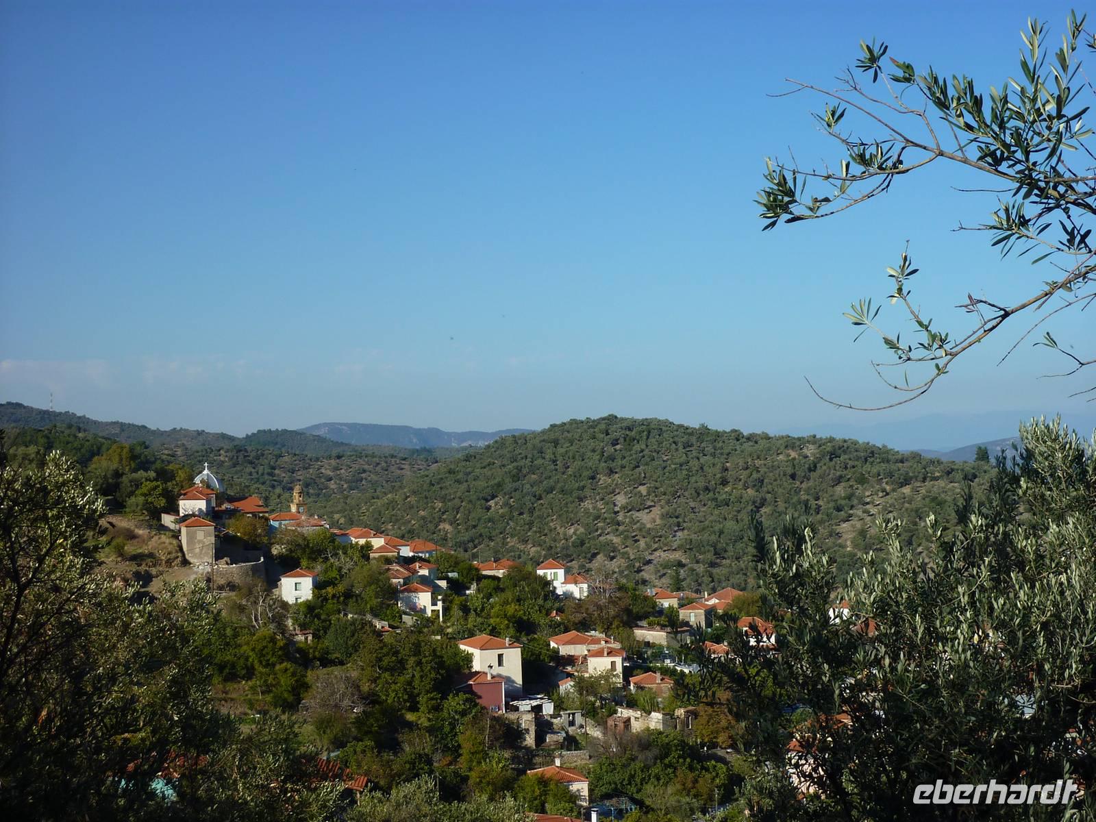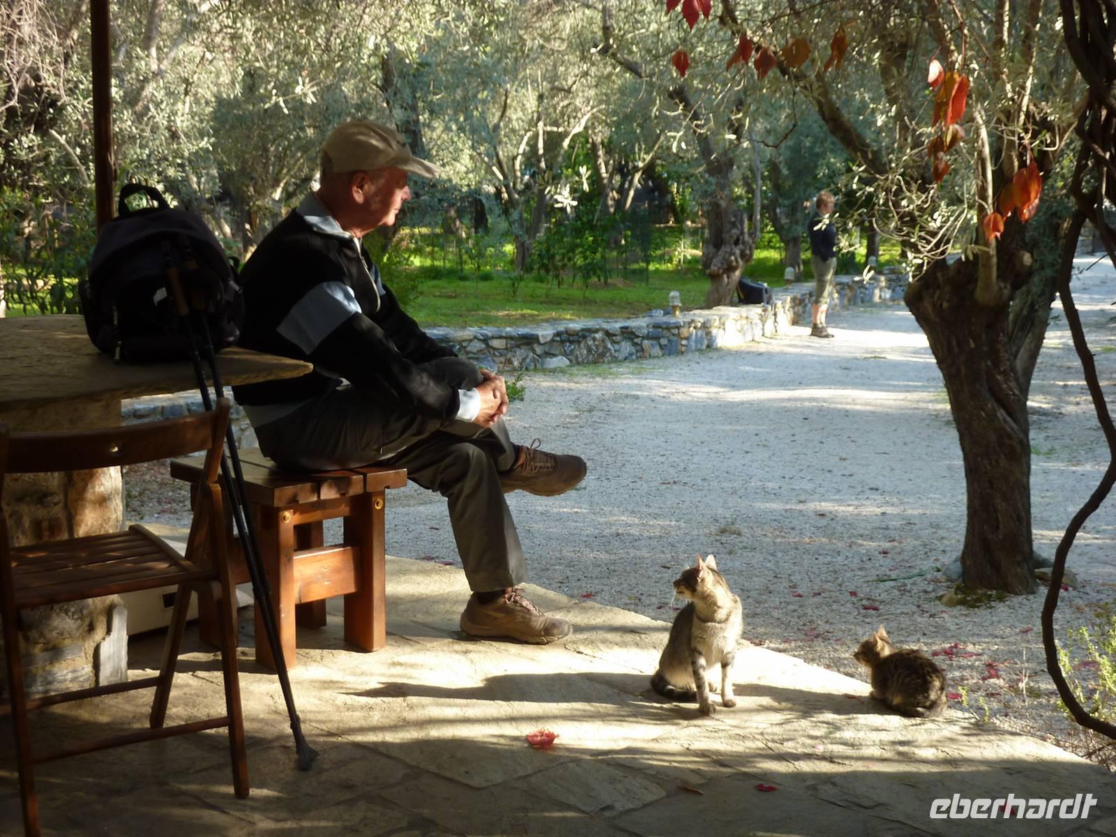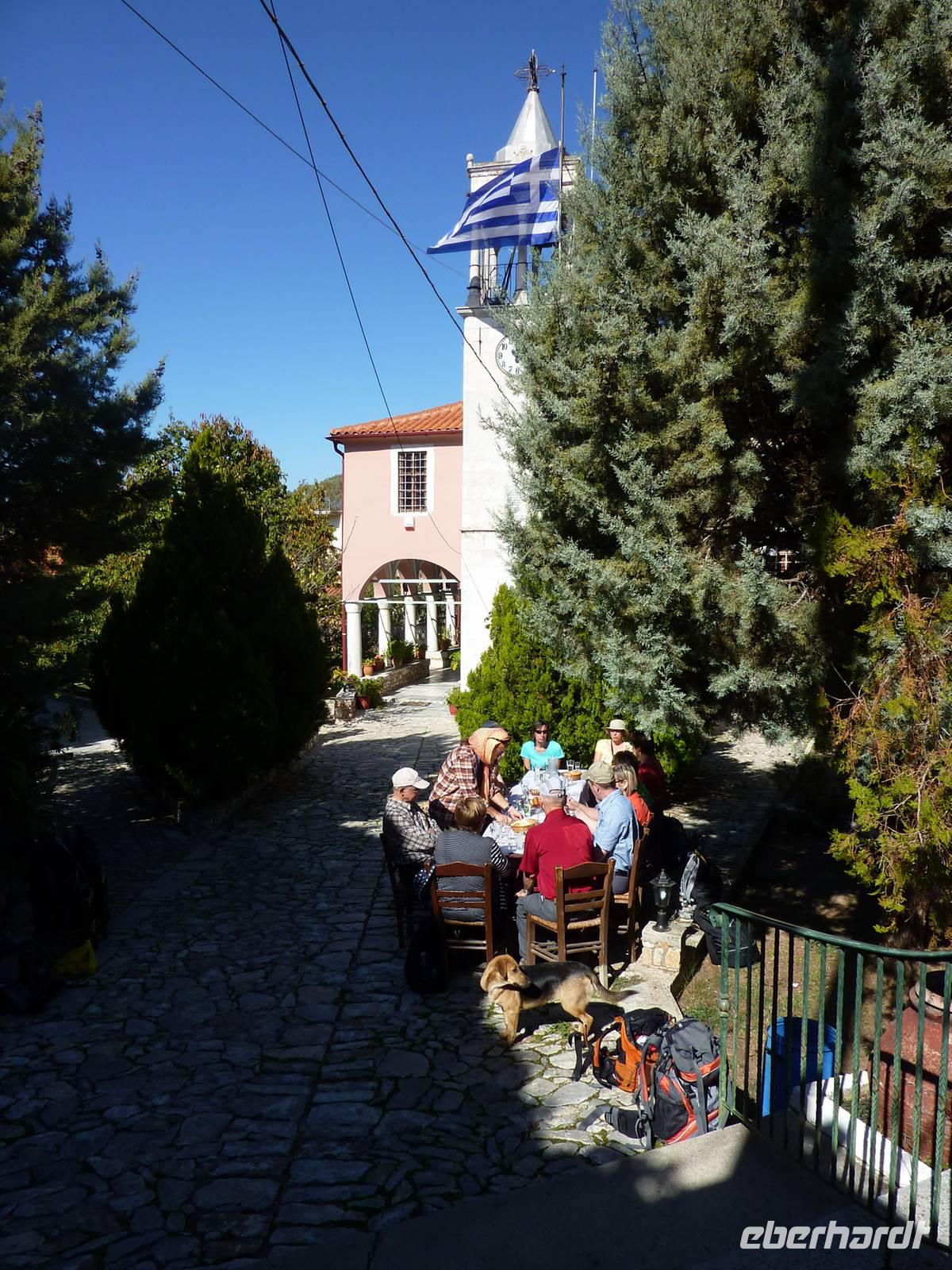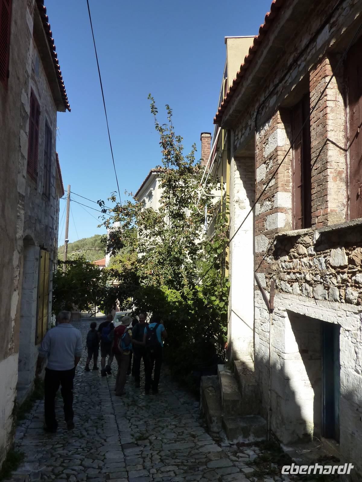 Ganz gemütlich gingen wir den Tag an, schließlich wollten unsere Gäste sich ja erholen. Um 08.30 Uhr gab es auf der Frühstücksterrasse (open-air) eine Stärkung mit Brot, Eier, Schafskäse, Schnittkäse, Wurst, Oliven, Tomaten, Gurke, frisch gepressten Orangensaft, Kaffee und/oder Tee. Eva und ich hatten uns am Morgen im Internet die Wetterkarte angesehen, naja nicht so grandios und die ganze Nacht hatte es reichlich geregnet. Wir besprachen uns und beschlossen, die geplante Wanderung den Witterungsbedingungen ein wenig anzupassen. Regensachen wurden in den Rucksack gepackt für den Fall der Fälle und so brachen wir um 10.00 Uhr zu unserer ersten Wanderung auf. Der Himmel war wolkenverhangen, aber es war angenehm warm und wir in Wanderlaune. Unser Bus brachte uns zunächst zu unserem Ausgangspunkt der Wanderung, einem netten Rastplatz. Hier konnten wir uns mit frischem Obst oder Trockenfrüchten als Wegzehrung eindecken. Ganz gemütlich, ganz siga, siga (langsam, langsam) wie Eva uns immer wieder in den nächsten Tagen auffordern würde, wanderten wir nun los. Das mit dem „siga, siga" mussten wir allerdings erst noch lernen, denn irgendwie waren wir von unserem Alltag noch ganz schön gehetzt. Unsere Sinne mussten sich erst noch öffnen und schärfen. Über alte Karrenwege, leicht bergan, vorbei an unzähligen Oliven-, Feigenbäumen, Platanen und Pinien erreichten wir schließlich das noch sehr traditionsreiche Bergstädtchen Agiasos auf immerhin 700 Metern über dem Meeresspiegel, das sich malerisch an die Hänge des Olymposgebirges schmiegt. Schmale, gepflasterte Gassen mit zahlreichen Cafenions und Tavernen zeichnen diesen Ort gleichermaßen aus, wie deren berühmte Keramikkunst. Wir besichtigen zunächst die Kirche, bevor wir bei einem griechischen Kaffee und den Leckereien aus der Bäckerei gegenüber eine Rast einlegen. Eva liest dazu aus dem Buch von Eva Demski, die darin Ihre Liebe zu dieser Insel beschreibt, z.B. die Form der Insel mit der eines Platanenblattes vergleicht und uns auffordert „mit den Füßen einer Bergziege und dem furchtlosen Herzen eines Wanderfalken" das Inselinnere zu erobern. Wir lauschen Eva dabei ganz gespannt zu, und ganz allmählich gelingt es uns, die Gelassenheit und Ruhe der Menschen dieser Insel auch in uns aufzunehmen. In unserer Freizeit lassen wir das Flair der Gassen auf uns wirken, mit den Häusern deren vorspringende Obergeschosse, bekannt als sachnisia, und hölzerne Balkone mit Blumentöpfen von Begonien, Nelken und Geranien uns verzaubern. Schließlich erwartet uns wieder unser Chauffeur und fährt uns sicher über die engen Bergstraßen zurück in unser Hotel. Das Abendessen lassen wir uns wiederum in der Taverne nahe unseres Hotels servieren. Moussaka wurde heute von Eva bestellt, ein ganz typisches Gericht, bei dem Lammhack und Auberginen geschichtet und mit Schafskäse überbacken wird. Einfach lecker.. Zum Verdauen abermals ein Ouzo hinterher, das hilft.