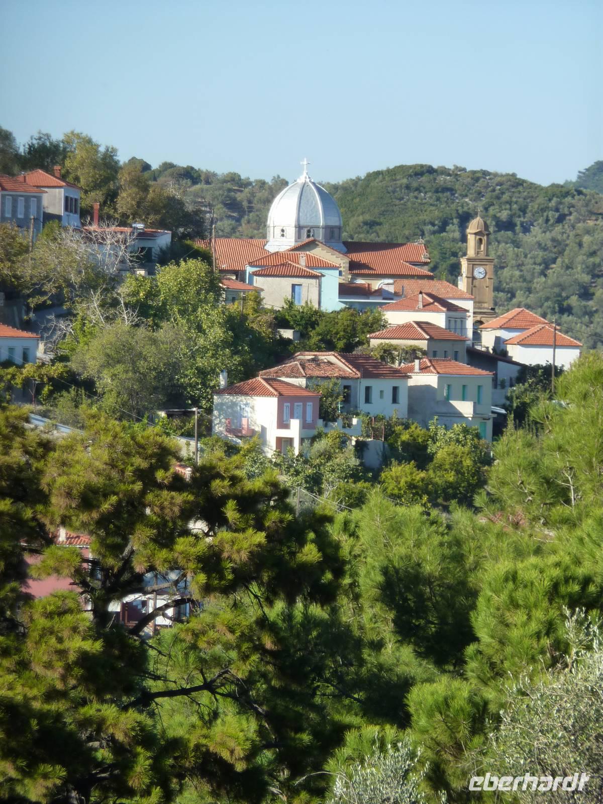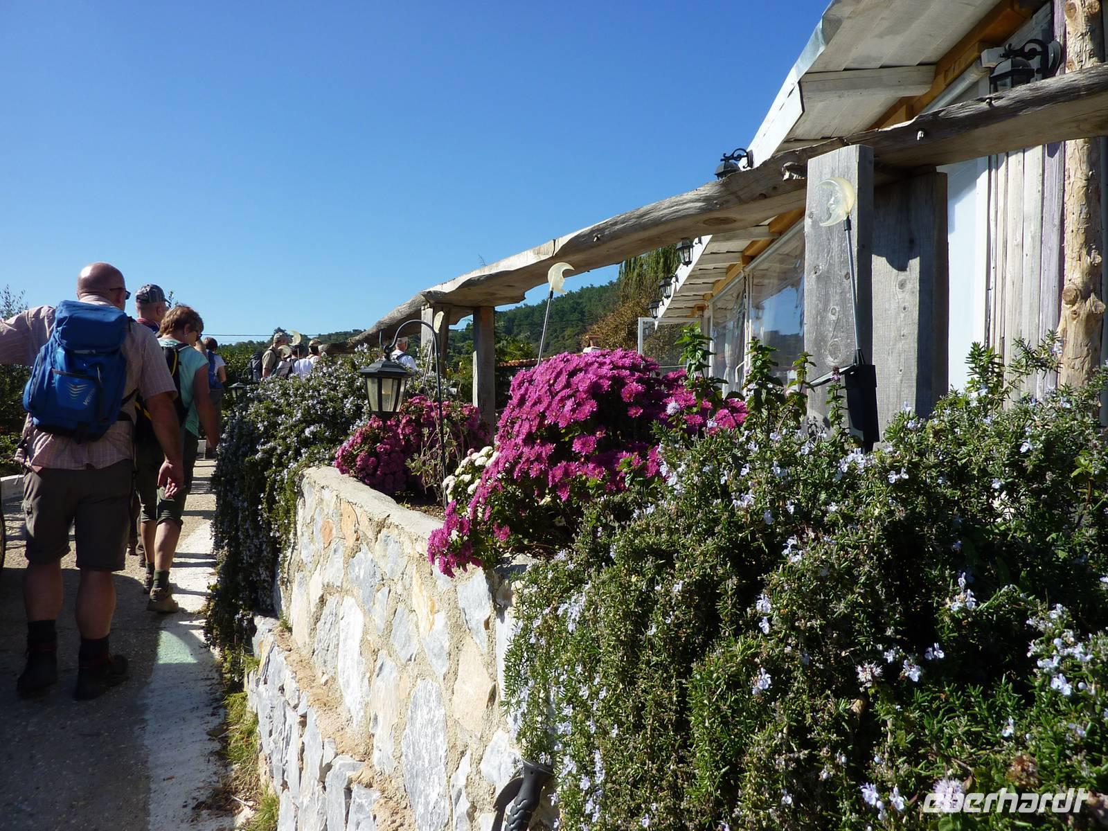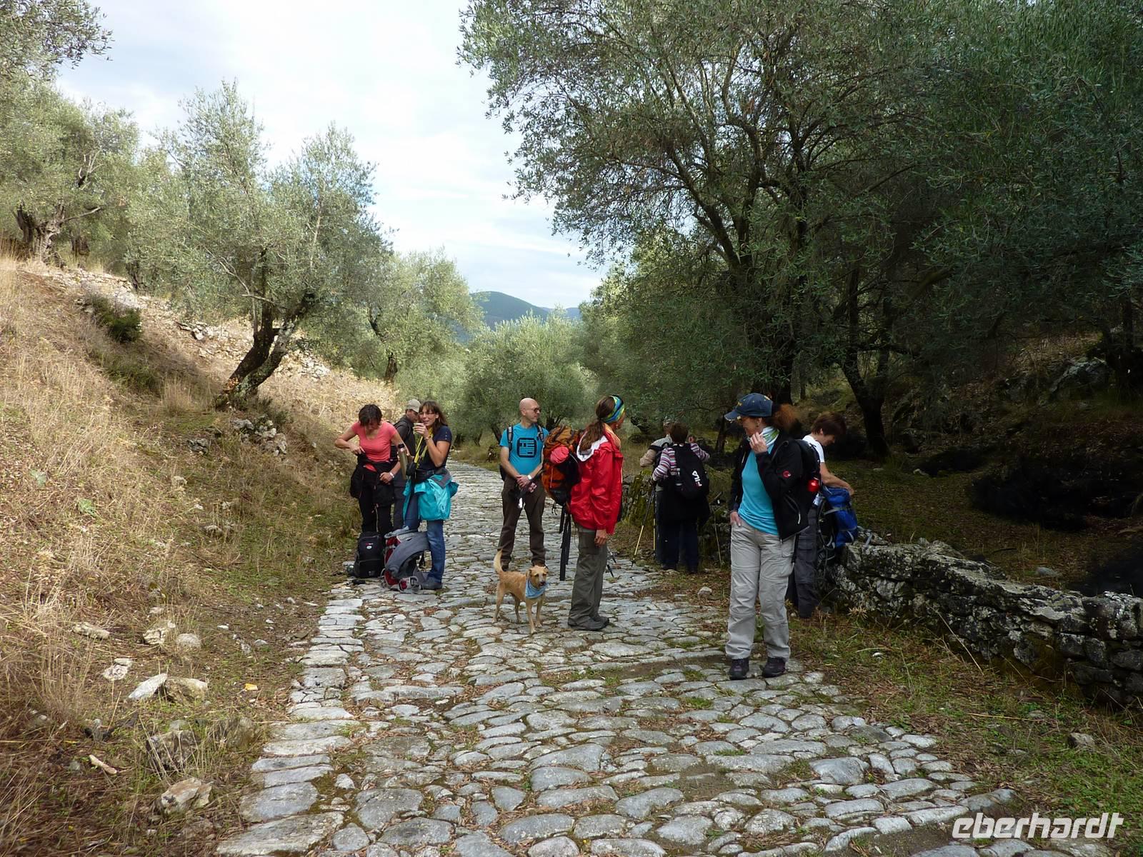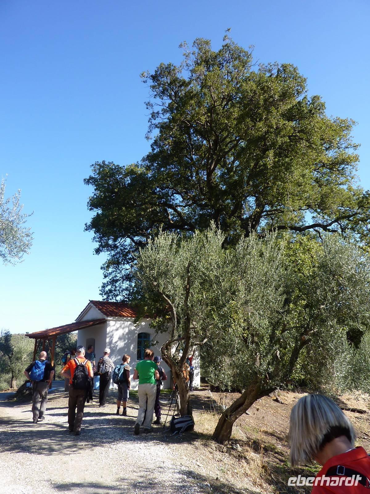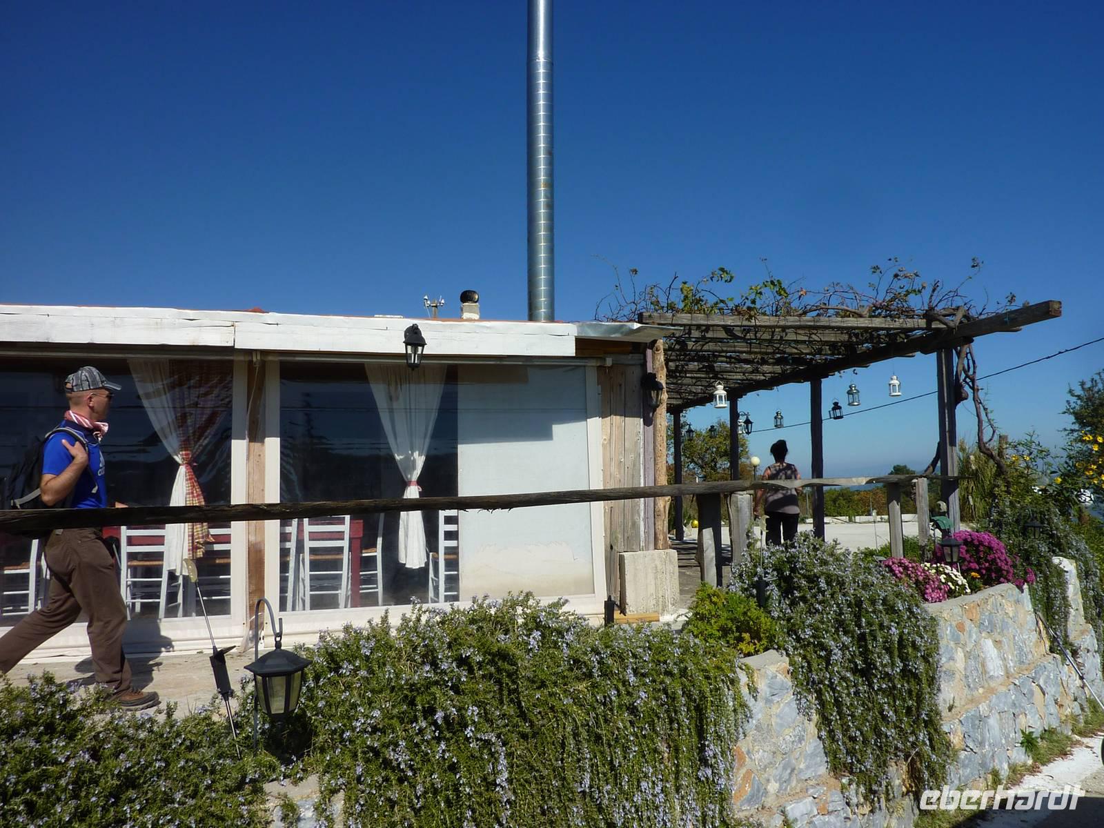 Ganz gemütlich gingen wir den Tag an, schließlich wollten unsere Gäste sich ja erholen. Um 08.30 Uhr gab es auf der Frühstücksterrasse (open-air) eine Stärkung mit Brot, Eier, Schafskäse, Schnittkäse, Wurst, Oliven, Tomaten, Gurke, frisch gepressten Orangensaft, Kaffee und/oder Tee. Eva und ich hatten uns am Morgen im Internet die Wetterkarte angesehen, naja nicht so grandios und die ganze Nacht hatte es reichlich geregnet. Wir besprachen uns und beschlossen, die geplante Wanderung den Witterungsbedingungen ein wenig anzupassen. Regensachen wurden in den Rucksack gepackt für den Fall der Fälle und so brachen wir um 10.00 Uhr zu unserer ersten Wanderung auf. Der Himmel war wolkenverhangen, aber es war angenehm warm und wir in Wanderlaune. Unser Bus brachte uns zunächst zu unserem Ausgangspunkt der Wanderung, einem netten Rastplatz. Hier konnten wir uns mit frischem Obst oder Trockenfrüchten als Wegzehrung eindecken. Ganz gemütlich, ganz siga, siga (langsam, langsam) wie Eva uns immer wieder in den nächsten Tagen auffordern würde, wanderten wir nun los. Das mit dem „siga, siga" mussten wir allerdings erst noch lernen, denn irgendwie waren wir von unserem Alltag noch ganz schön gehetzt. Unsere Sinne mussten sich erst noch öffnen und schärfen. Über alte Karrenwege, leicht bergan, vorbei an unzähligen Oliven-, Feigenbäumen, Platanen und Pinien erreichten wir schließlich das noch sehr traditionsreiche Bergstädtchen Agiasos auf immerhin 700 Metern über dem Meeresspiegel, das sich malerisch an die Hänge des Olymposgebirges schmiegt. Schmale, gepflasterte Gassen mit zahlreichen Cafenions und Tavernen zeichnen diesen Ort gleichermaßen aus, wie deren berühmte Keramikkunst. Wir besichtigen zunächst die Kirche, bevor wir bei einem griechischen Kaffee und den Leckereien aus der Bäckerei gegenüber eine Rast einlegen. Eva liest dazu aus dem Buch von Eva Demski, die darin Ihre Liebe zu dieser Insel beschreibt, z.B. die Form der Insel mit der eines Platanenblattes vergleicht und uns auffordert „mit den Füßen einer Bergziege und dem furchtlosen Herzen eines Wanderfalken" das Inselinnere zu erobern. Wir lauschen Eva dabei ganz gespannt zu, und ganz allmählich gelingt es uns, die Gelassenheit und Ruhe der Menschen dieser Insel auch in uns aufzunehmen. In unserer Freizeit lassen wir das Flair der Gassen auf uns wirken, mit den Häusern deren vorspringende Obergeschosse, bekannt als sachnisia, und hölzerne Balkone mit Blumentöpfen von Begonien, Nelken und Geranien uns verzaubern. Schließlich erwartet uns wieder unser Chauffeur und fährt uns sicher über die engen Bergstraßen zurück in unser Hotel. Das Abendessen lassen wir uns wiederum in der Taverne nahe unseres Hotels servieren. Moussaka wurde heute von Eva bestellt, ein ganz typisches Gericht, bei dem Lammhack und Auberginen geschichtet und mit Schafskäse überbacken wird. Einfach lecker.. Zum Verdauen abermals ein Ouzo hinterher, das hilft.