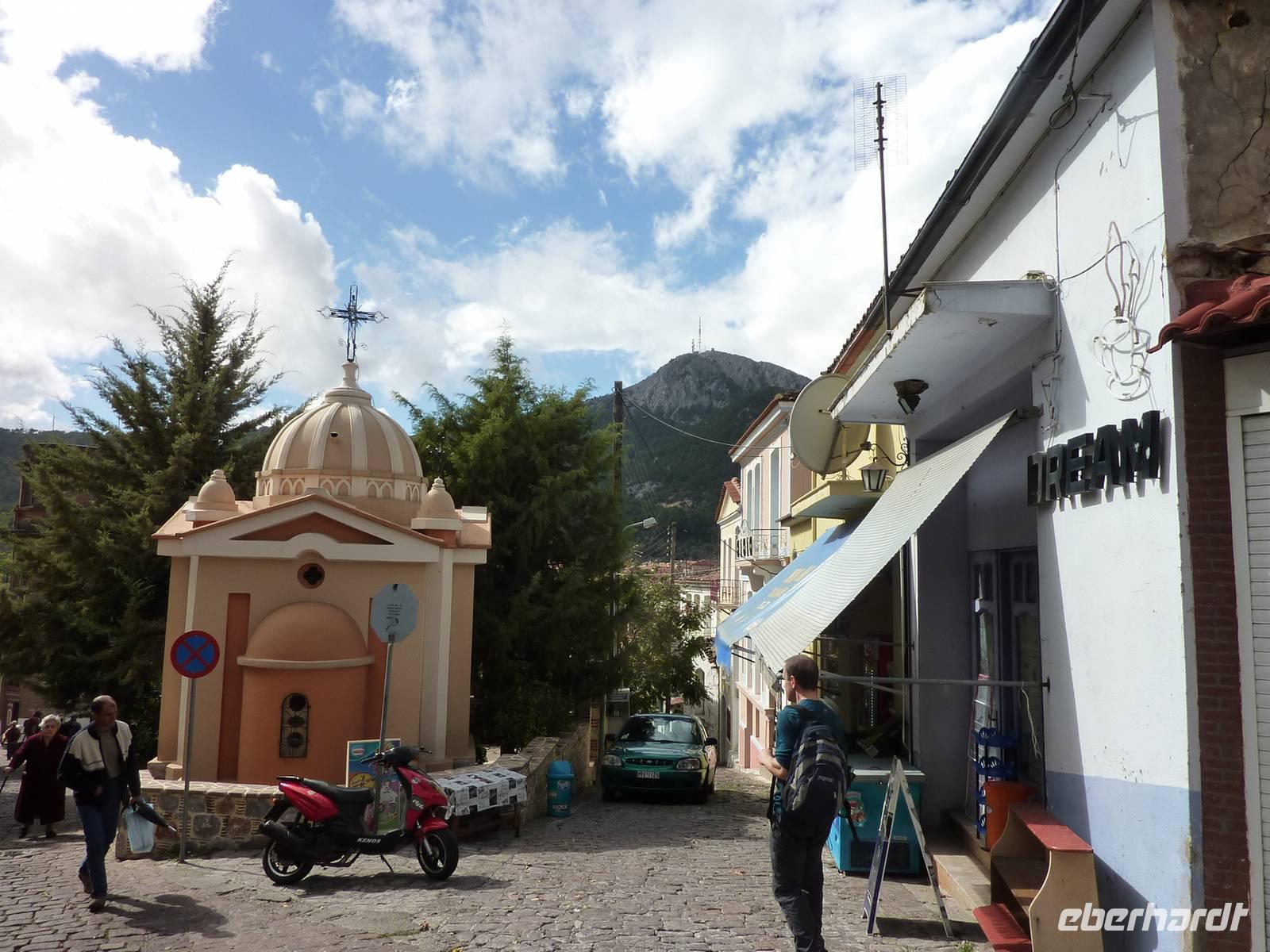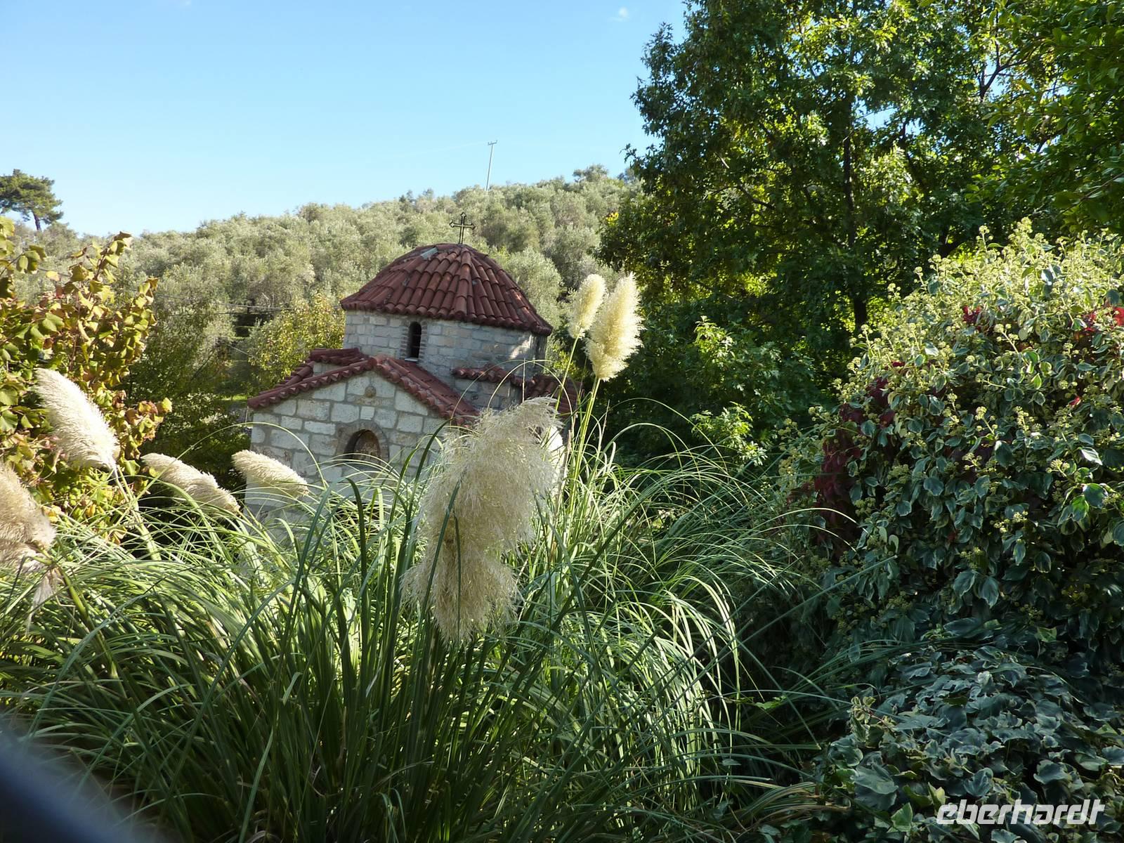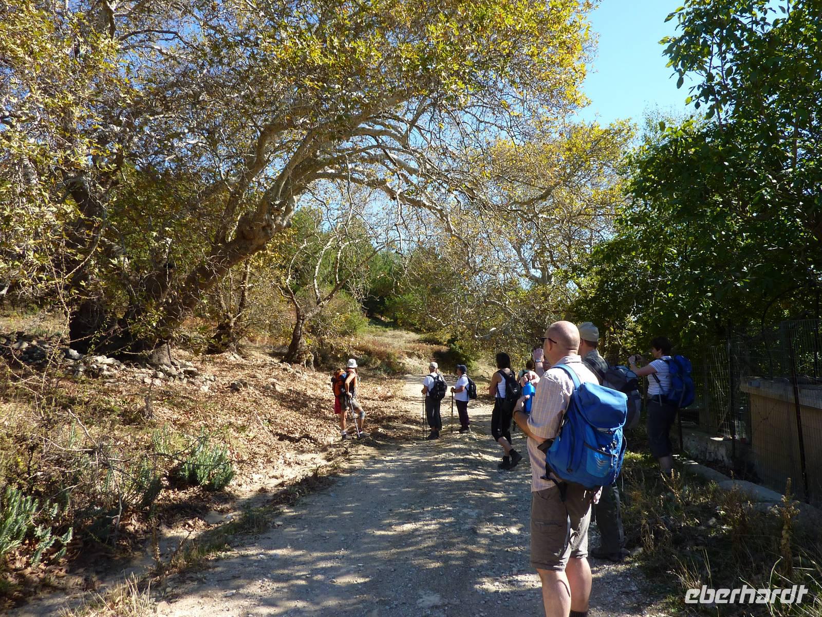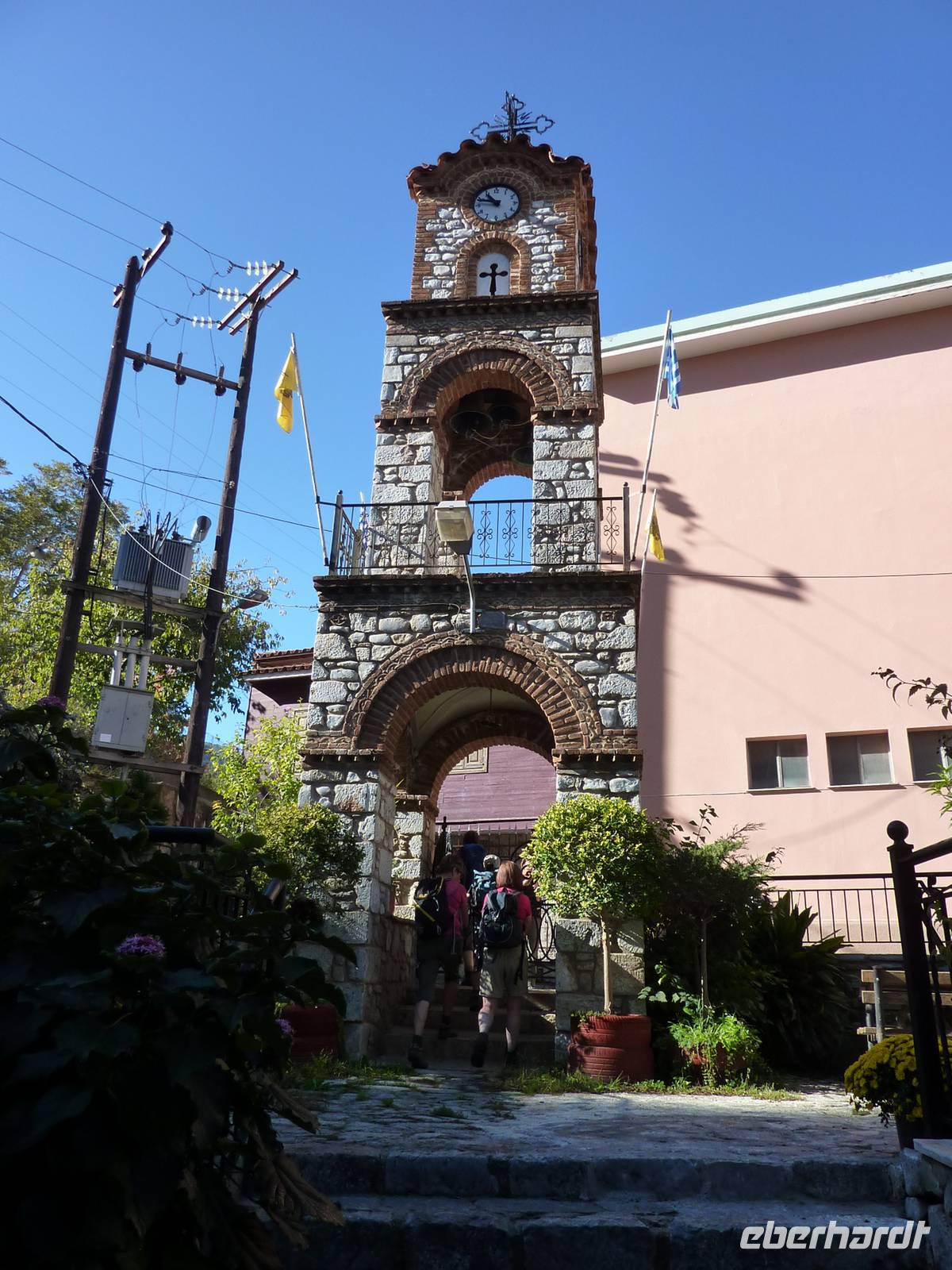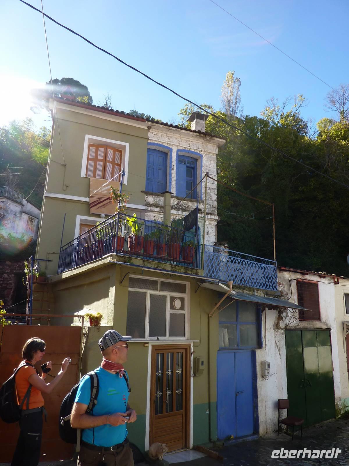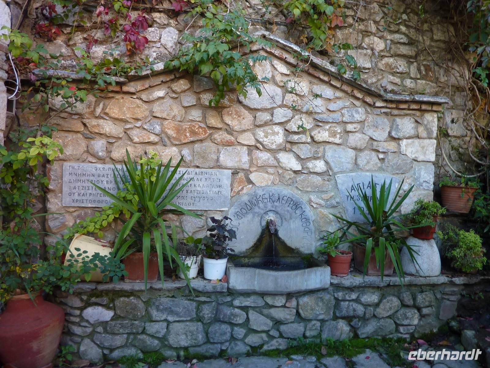 Ganz gemütlich gingen wir den Tag an, schließlich wollten unsere Gäste sich ja erholen. Um 08.30 Uhr gab es auf der Frühstücksterrasse (open-air) eine Stärkung mit Brot, Eier, Schafskäse, Schnittkäse, Wurst, Oliven, Tomaten, Gurke, frisch gepressten Orangensaft, Kaffee und/oder Tee. Eva und ich hatten uns am Morgen im Internet die Wetterkarte angesehen, naja nicht so grandios und die ganze Nacht hatte es reichlich geregnet. Wir besprachen uns und beschlossen, die geplante Wanderung den Witterungsbedingungen ein wenig anzupassen. Regensachen wurden in den Rucksack gepackt für den Fall der Fälle und so brachen wir um 10.00 Uhr zu unserer ersten Wanderung auf. Der Himmel war wolkenverhangen, aber es war angenehm warm und wir in Wanderlaune. Unser Bus brachte uns zunächst zu unserem Ausgangspunkt der Wanderung, einem netten Rastplatz. Hier konnten wir uns mit frischem Obst oder Trockenfrüchten als Wegzehrung eindecken. Ganz gemütlich, ganz siga, siga (langsam, langsam) wie Eva uns immer wieder in den nächsten Tagen auffordern würde, wanderten wir nun los. Das mit dem „siga, siga" mussten wir allerdings erst noch lernen, denn irgendwie waren wir von unserem Alltag noch ganz schön gehetzt. Unsere Sinne mussten sich erst noch öffnen und schärfen. Über alte Karrenwege, leicht bergan, vorbei an unzähligen Oliven-, Feigenbäumen, Platanen und Pinien erreichten wir schließlich das noch sehr traditionsreiche Bergstädtchen Agiasos auf immerhin 700 Metern über dem Meeresspiegel, das sich malerisch an die Hänge des Olymposgebirges schmiegt. Schmale, gepflasterte Gassen mit zahlreichen Cafenions und Tavernen zeichnen diesen Ort gleichermaßen aus, wie deren berühmte Keramikkunst. Wir besichtigen zunächst die Kirche, bevor wir bei einem griechischen Kaffee und den Leckereien aus der Bäckerei gegenüber eine Rast einlegen. Eva liest dazu aus dem Buch von Eva Demski, die darin Ihre Liebe zu dieser Insel beschreibt, z.B. die Form der Insel mit der eines Platanenblattes vergleicht und uns auffordert „mit den Füßen einer Bergziege und dem furchtlosen Herzen eines Wanderfalken" das Inselinnere zu erobern. Wir lauschen Eva dabei ganz gespannt zu, und ganz allmählich gelingt es uns, die Gelassenheit und Ruhe der Menschen dieser Insel auch in uns aufzunehmen. In unserer Freizeit lassen wir das Flair der Gassen auf uns wirken, mit den Häusern deren vorspringende Obergeschosse, bekannt als sachnisia, und hölzerne Balkone mit Blumentöpfen von Begonien, Nelken und Geranien uns verzaubern. Schließlich erwartet uns wieder unser Chauffeur und fährt uns sicher über die engen Bergstraßen zurück in unser Hotel. Das Abendessen lassen wir uns wiederum in der Taverne nahe unseres Hotels servieren. Moussaka wurde heute von Eva bestellt, ein ganz typisches Gericht, bei dem Lammhack und Auberginen geschichtet und mit Schafskäse überbacken wird. Einfach lecker.. Zum Verdauen abermals ein Ouzo hinterher, das hilft.