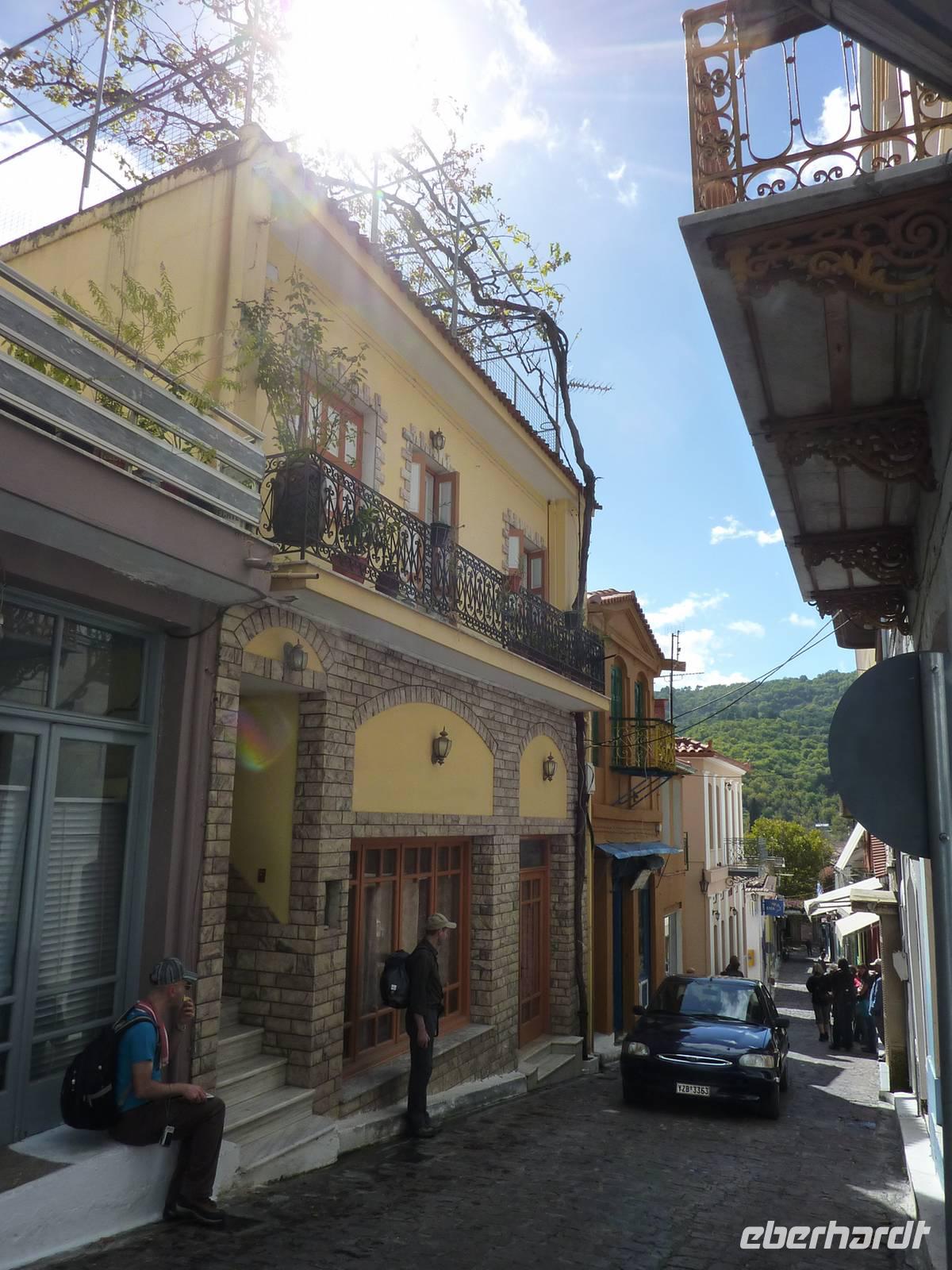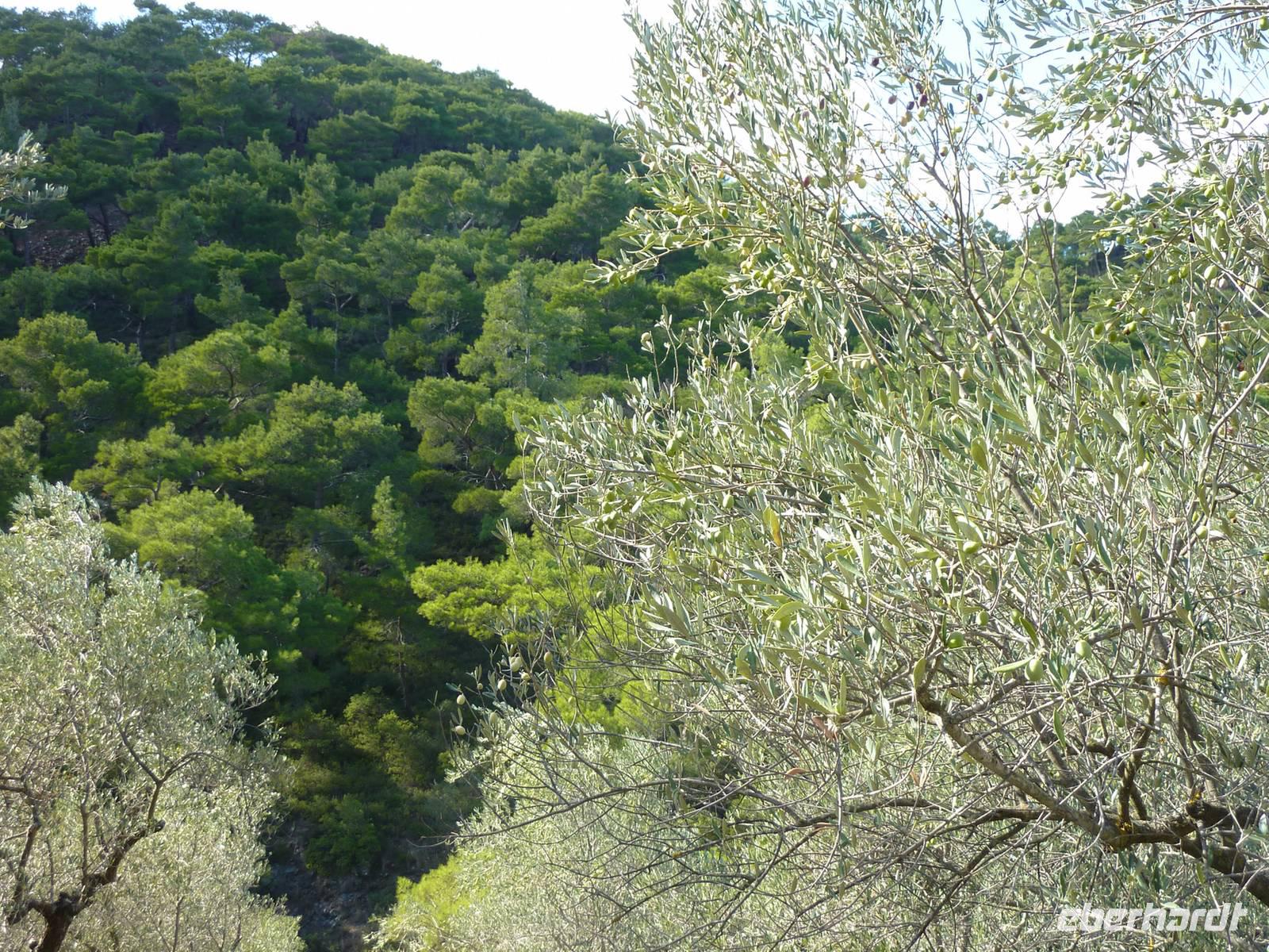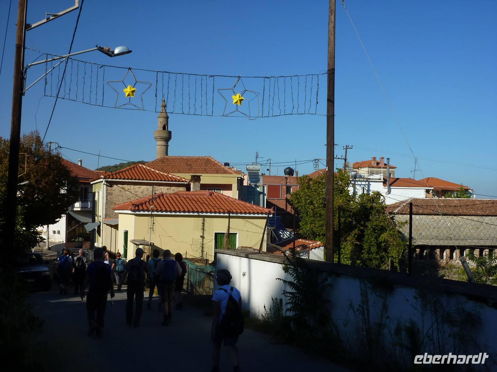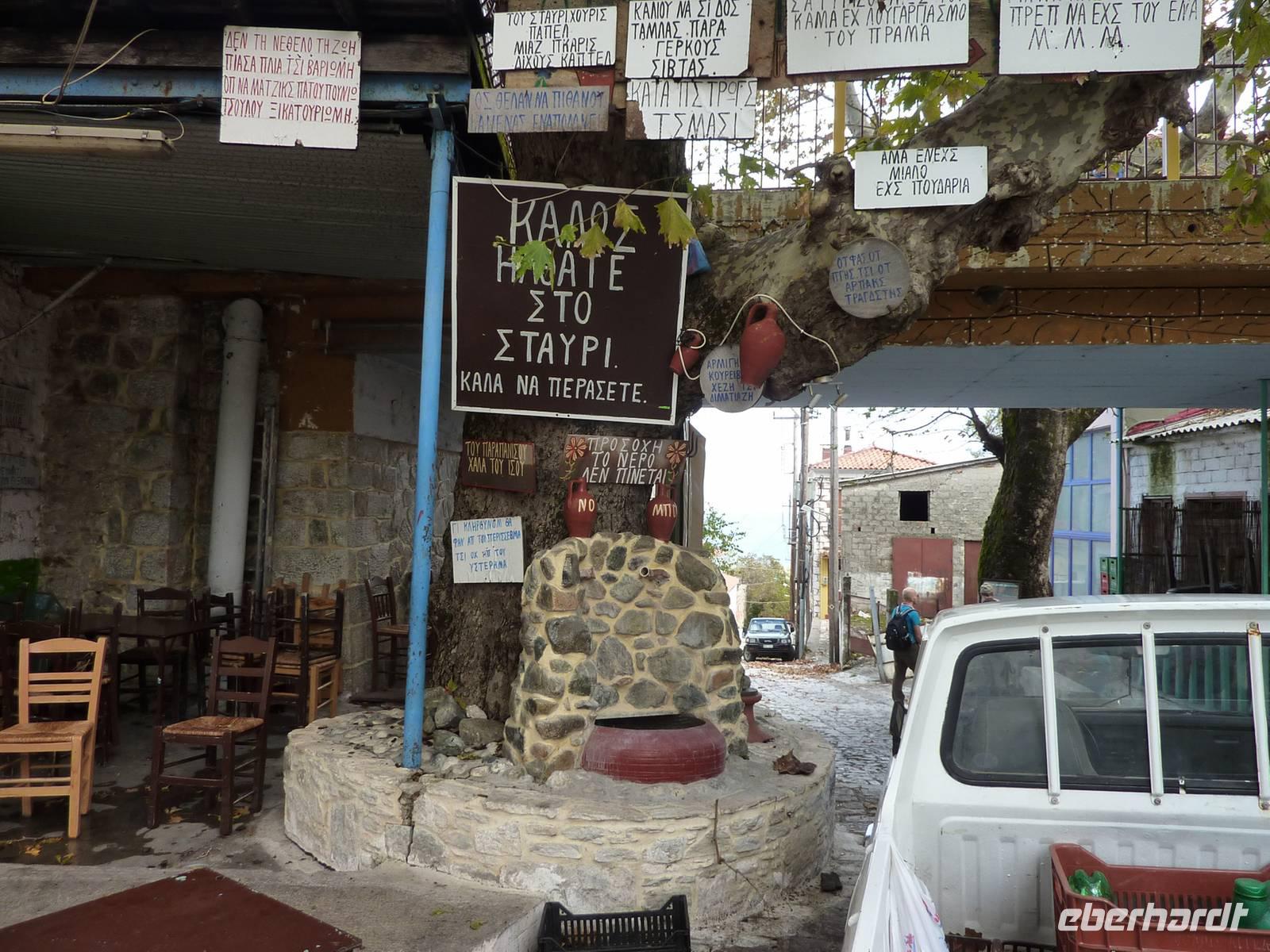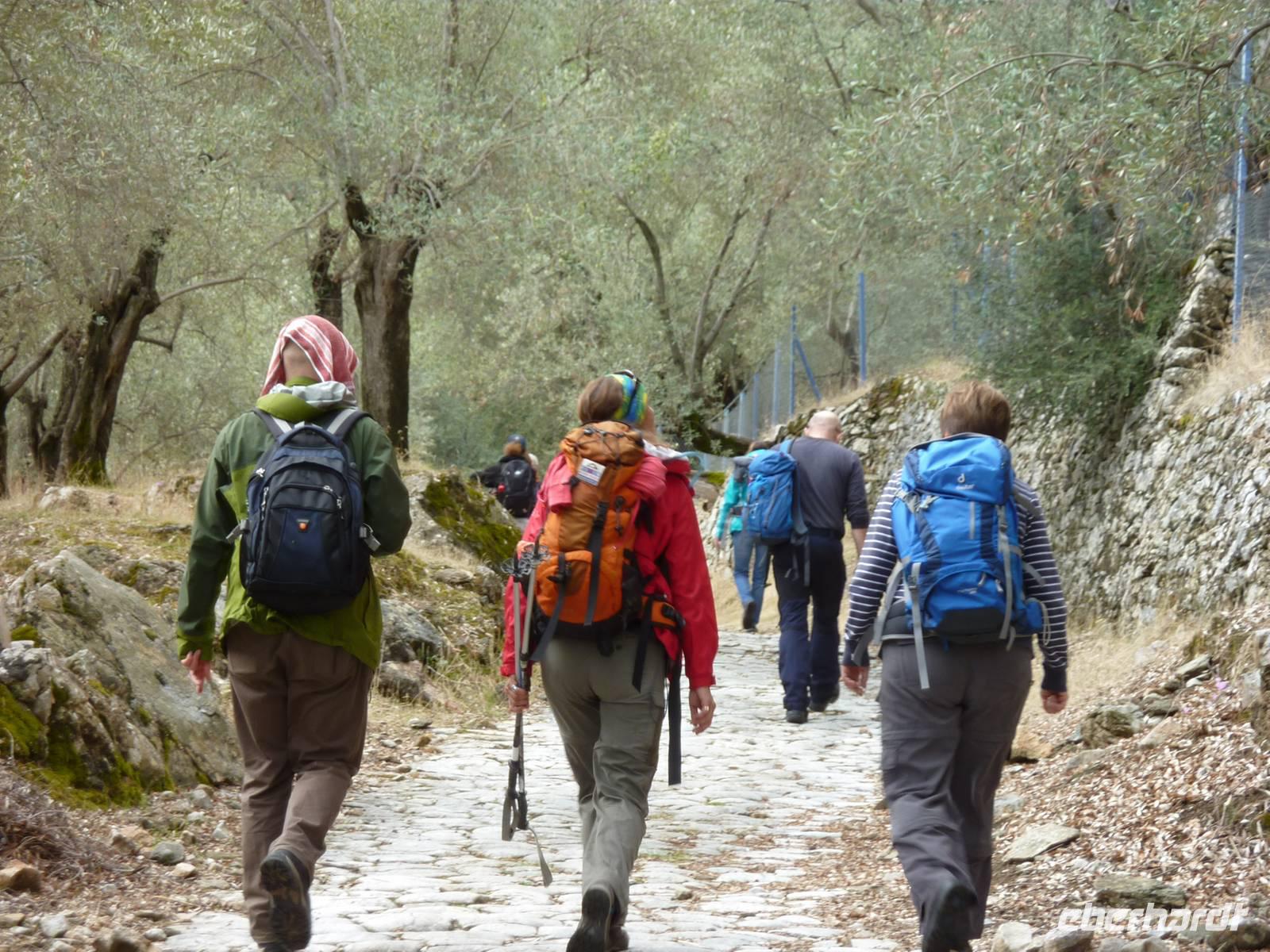 Ganz gemütlich gingen wir den Tag an, schließlich wollten unsere Gäste sich ja erholen. Um 08.30 Uhr gab es auf der Frühstücksterrasse (open-air) eine Stärkung mit Brot, Eier, Schafskäse, Schnittkäse, Wurst, Oliven, Tomaten, Gurke, frisch gepressten Orangensaft, Kaffee und/oder Tee. Eva und ich hatten uns am Morgen im Internet die Wetterkarte angesehen, naja nicht so grandios und die ganze Nacht hatte es reichlich geregnet. Wir besprachen uns und beschlossen, die geplante Wanderung den Witterungsbedingungen ein wenig anzupassen. Regensachen wurden in den Rucksack gepackt für den Fall der Fälle und so brachen wir um 10.00 Uhr zu unserer ersten Wanderung auf. Der Himmel war wolkenverhangen, aber es war angenehm warm und wir in Wanderlaune. Unser Bus brachte uns zunächst zu unserem Ausgangspunkt der Wanderung, einem netten Rastplatz. Hier konnten wir uns mit frischem Obst oder Trockenfrüchten als Wegzehrung eindecken. Ganz gemütlich, ganz siga, siga (langsam, langsam) wie Eva uns immer wieder in den nächsten Tagen auffordern würde, wanderten wir nun los. Das mit dem „siga, siga" mussten wir allerdings erst noch lernen, denn irgendwie waren wir von unserem Alltag noch ganz schön gehetzt. Unsere Sinne mussten sich erst noch öffnen und schärfen. Über alte Karrenwege, leicht bergan, vorbei an unzähligen Oliven-, Feigenbäumen, Platanen und Pinien erreichten wir schließlich das noch sehr traditionsreiche Bergstädtchen Agiasos auf immerhin 700 Metern über dem Meeresspiegel, das sich malerisch an die Hänge des Olymposgebirges schmiegt. Schmale, gepflasterte Gassen mit zahlreichen Cafenions und Tavernen zeichnen diesen Ort gleichermaßen aus, wie deren berühmte Keramikkunst. Wir besichtigen zunächst die Kirche, bevor wir bei einem griechischen Kaffee und den Leckereien aus der Bäckerei gegenüber eine Rast einlegen. Eva liest dazu aus dem Buch von Eva Demski, die darin Ihre Liebe zu dieser Insel beschreibt, z.B. die Form der Insel mit der eines Platanenblattes vergleicht und uns auffordert „mit den Füßen einer Bergziege und dem furchtlosen Herzen eines Wanderfalken" das Inselinnere zu erobern. Wir lauschen Eva dabei ganz gespannt zu, und ganz allmählich gelingt es uns, die Gelassenheit und Ruhe der Menschen dieser Insel auch in uns aufzunehmen. In unserer Freizeit lassen wir das Flair der Gassen auf uns wirken, mit den Häusern deren vorspringende Obergeschosse, bekannt als sachnisia, und hölzerne Balkone mit Blumentöpfen von Begonien, Nelken und Geranien uns verzaubern. Schließlich erwartet uns wieder unser Chauffeur und fährt uns sicher über die engen Bergstraßen zurück in unser Hotel. Das Abendessen lassen wir uns wiederum in der Taverne nahe unseres Hotels servieren. Moussaka wurde heute von Eva bestellt, ein ganz typisches Gericht, bei dem Lammhack und Auberginen geschichtet und mit Schafskäse überbacken wird. Einfach lecker.. Zum Verdauen abermals ein Ouzo hinterher, das hilft.