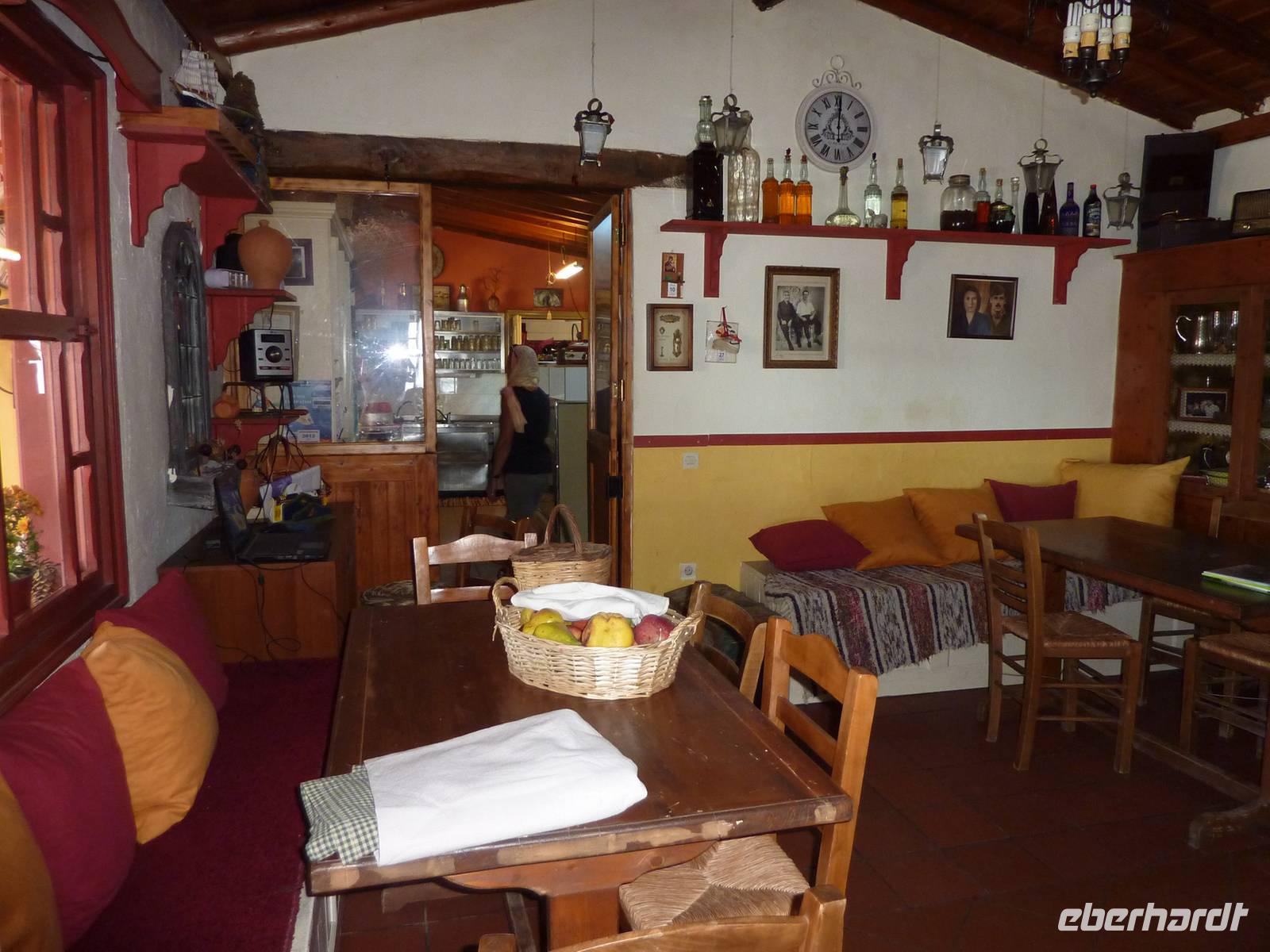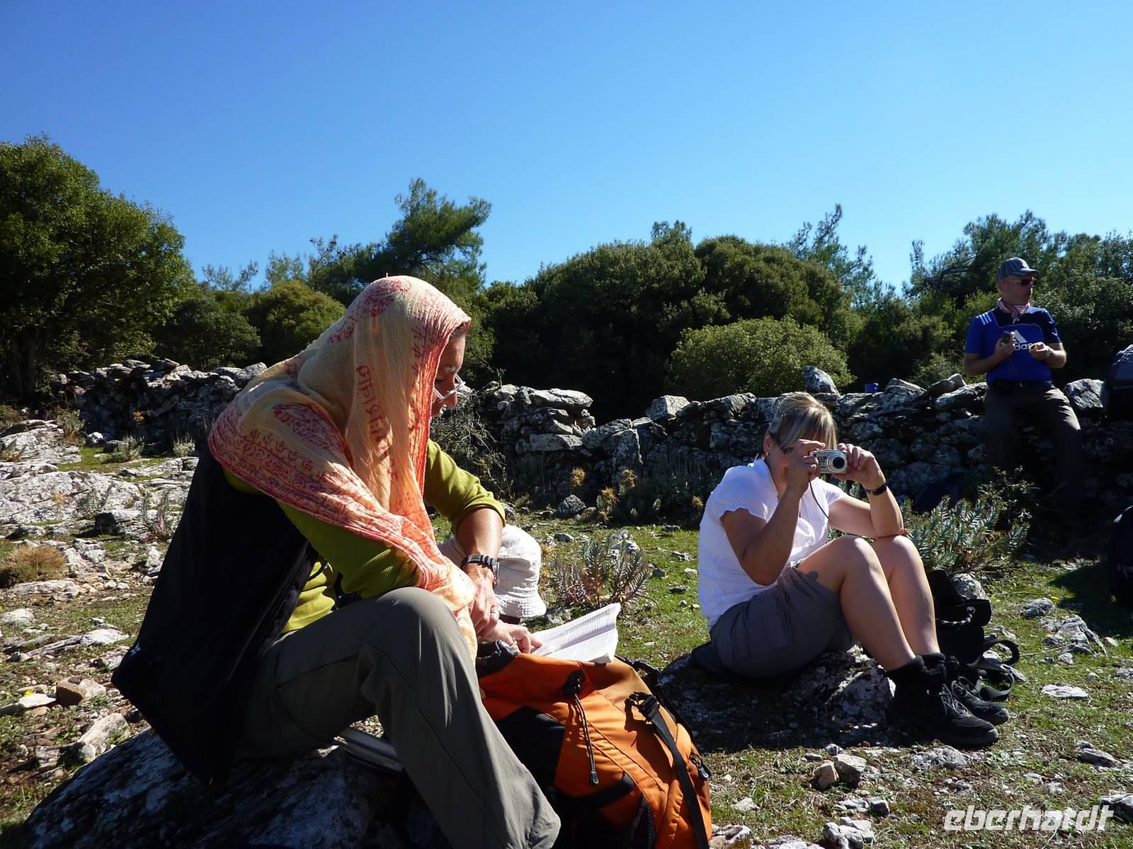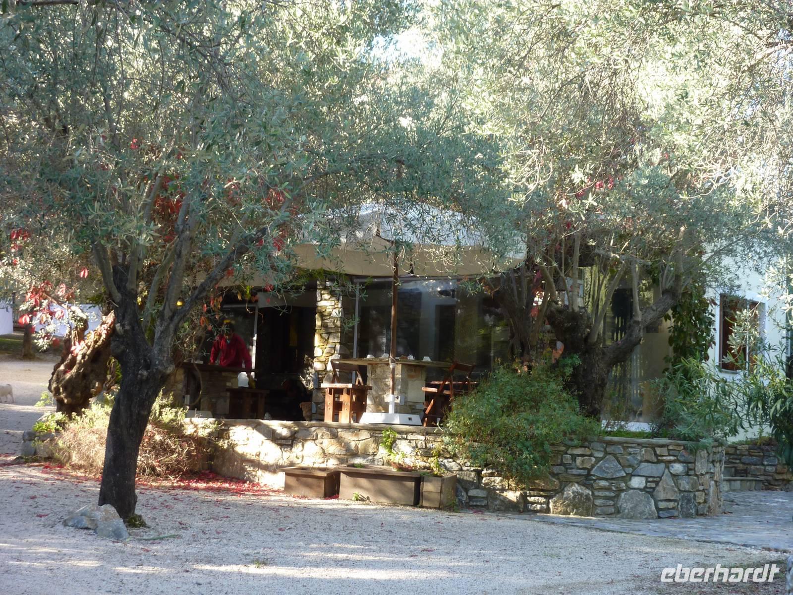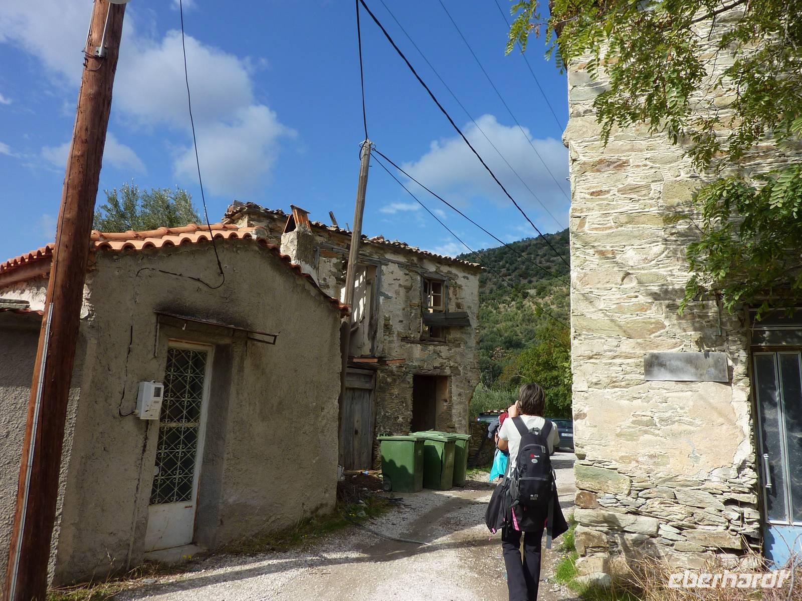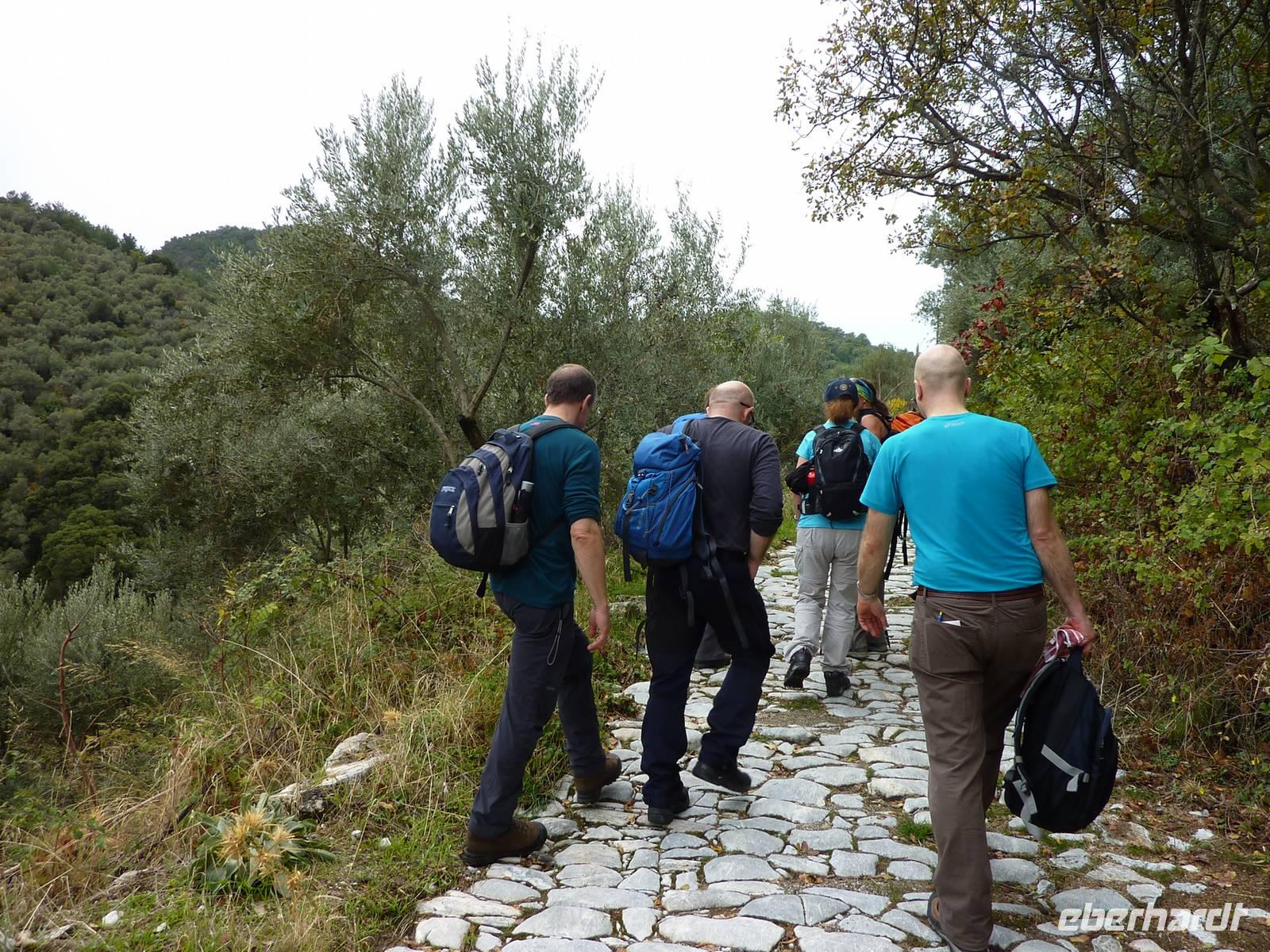 Ganz gemütlich gingen wir den Tag an, schließlich wollten unsere Gäste sich ja erholen. Um 08.30 Uhr gab es auf der Frühstücksterrasse (open-air) eine Stärkung mit Brot, Eier, Schafskäse, Schnittkäse, Wurst, Oliven, Tomaten, Gurke, frisch gepressten Orangensaft, Kaffee und/oder Tee. Eva und ich hatten uns am Morgen im Internet die Wetterkarte angesehen, naja nicht so grandios und die ganze Nacht hatte es reichlich geregnet. Wir besprachen uns und beschlossen, die geplante Wanderung den Witterungsbedingungen ein wenig anzupassen. Regensachen wurden in den Rucksack gepackt für den Fall der Fälle und so brachen wir um 10.00 Uhr zu unserer ersten Wanderung auf. Der Himmel war wolkenverhangen, aber es war angenehm warm und wir in Wanderlaune. Unser Bus brachte uns zunächst zu unserem Ausgangspunkt der Wanderung, einem netten Rastplatz. Hier konnten wir uns mit frischem Obst oder Trockenfrüchten als Wegzehrung eindecken. Ganz gemütlich, ganz siga, siga (langsam, langsam) wie Eva uns immer wieder in den nächsten Tagen auffordern würde, wanderten wir nun los. Das mit dem „siga, siga" mussten wir allerdings erst noch lernen, denn irgendwie waren wir von unserem Alltag noch ganz schön gehetzt. Unsere Sinne mussten sich erst noch öffnen und schärfen. Über alte Karrenwege, leicht bergan, vorbei an unzähligen Oliven-, Feigenbäumen, Platanen und Pinien erreichten wir schließlich das noch sehr traditionsreiche Bergstädtchen Agiasos auf immerhin 700 Metern über dem Meeresspiegel, das sich malerisch an die Hänge des Olymposgebirges schmiegt. Schmale, gepflasterte Gassen mit zahlreichen Cafenions und Tavernen zeichnen diesen Ort gleichermaßen aus, wie deren berühmte Keramikkunst. Wir besichtigen zunächst die Kirche, bevor wir bei einem griechischen Kaffee und den Leckereien aus der Bäckerei gegenüber eine Rast einlegen. Eva liest dazu aus dem Buch von Eva Demski, die darin Ihre Liebe zu dieser Insel beschreibt, z.B. die Form der Insel mit der eines Platanenblattes vergleicht und uns auffordert „mit den Füßen einer Bergziege und dem furchtlosen Herzen eines Wanderfalken" das Inselinnere zu erobern. Wir lauschen Eva dabei ganz gespannt zu, und ganz allmählich gelingt es uns, die Gelassenheit und Ruhe der Menschen dieser Insel auch in uns aufzunehmen. In unserer Freizeit lassen wir das Flair der Gassen auf uns wirken, mit den Häusern deren vorspringende Obergeschosse, bekannt als sachnisia, und hölzerne Balkone mit Blumentöpfen von Begonien, Nelken und Geranien uns verzaubern. Schließlich erwartet uns wieder unser Chauffeur und fährt uns sicher über die engen Bergstraßen zurück in unser Hotel. Das Abendessen lassen wir uns wiederum in der Taverne nahe unseres Hotels servieren. Moussaka wurde heute von Eva bestellt, ein ganz typisches Gericht, bei dem Lammhack und Auberginen geschichtet und mit Schafskäse überbacken wird. Einfach lecker.. Zum Verdauen abermals ein Ouzo hinterher, das hilft.