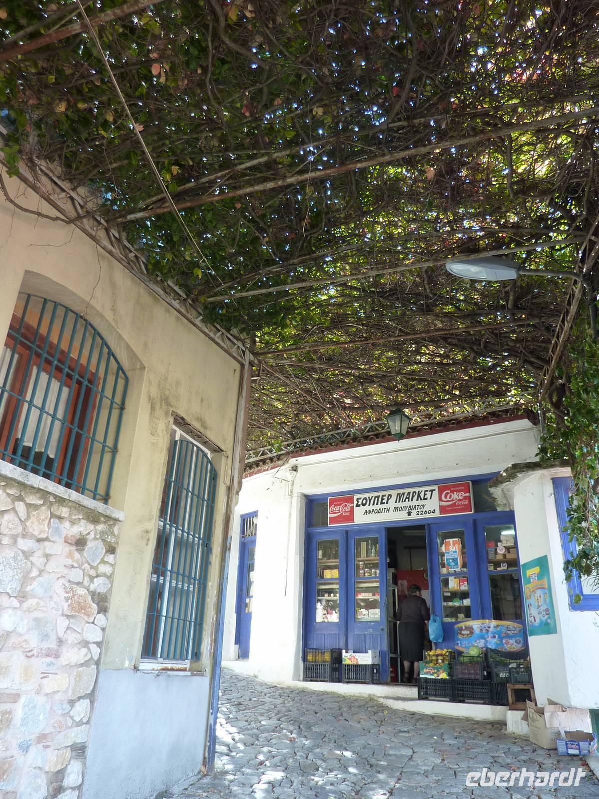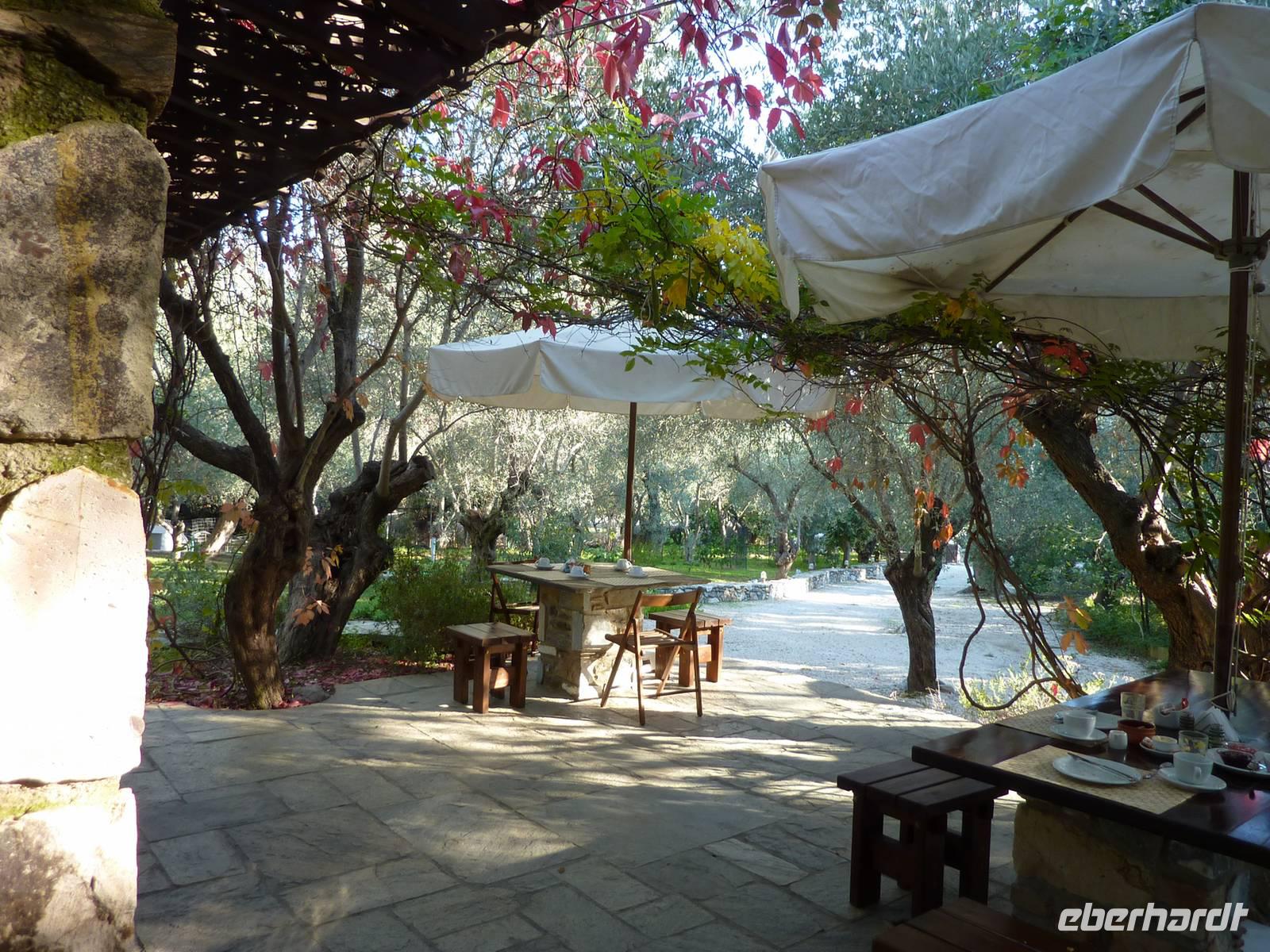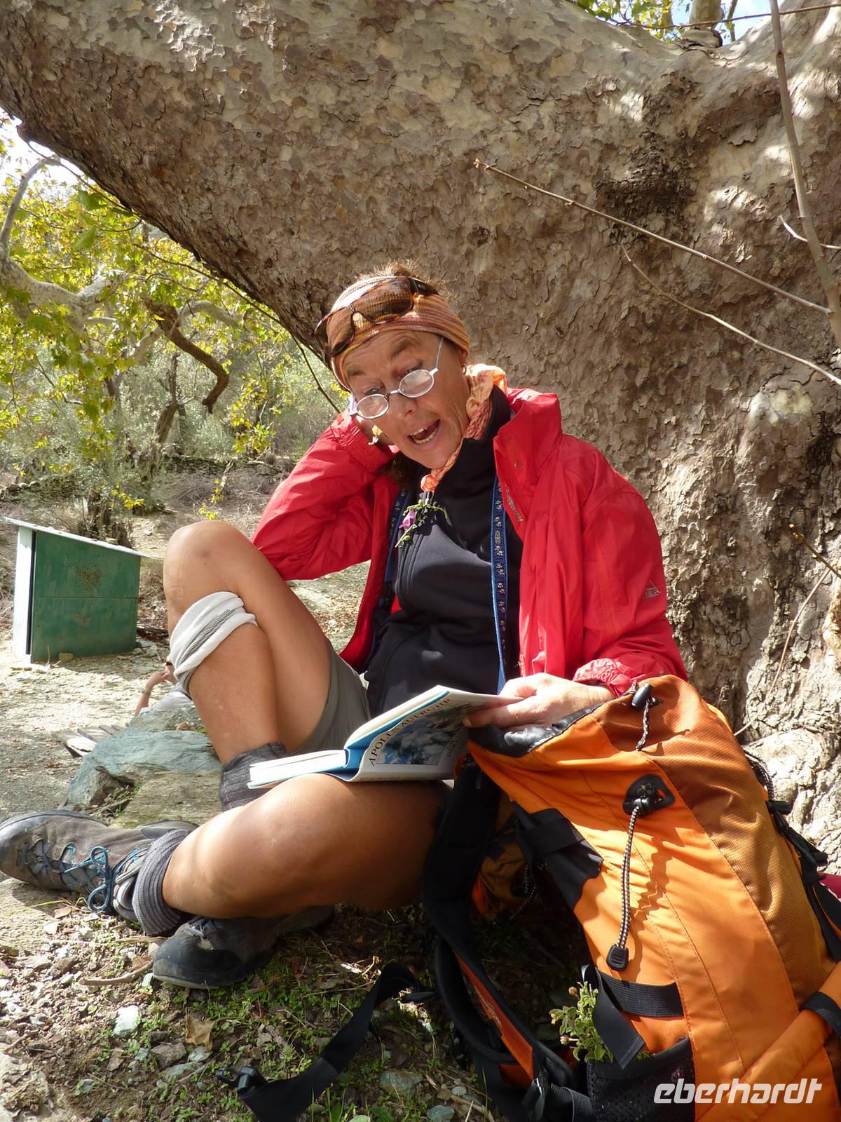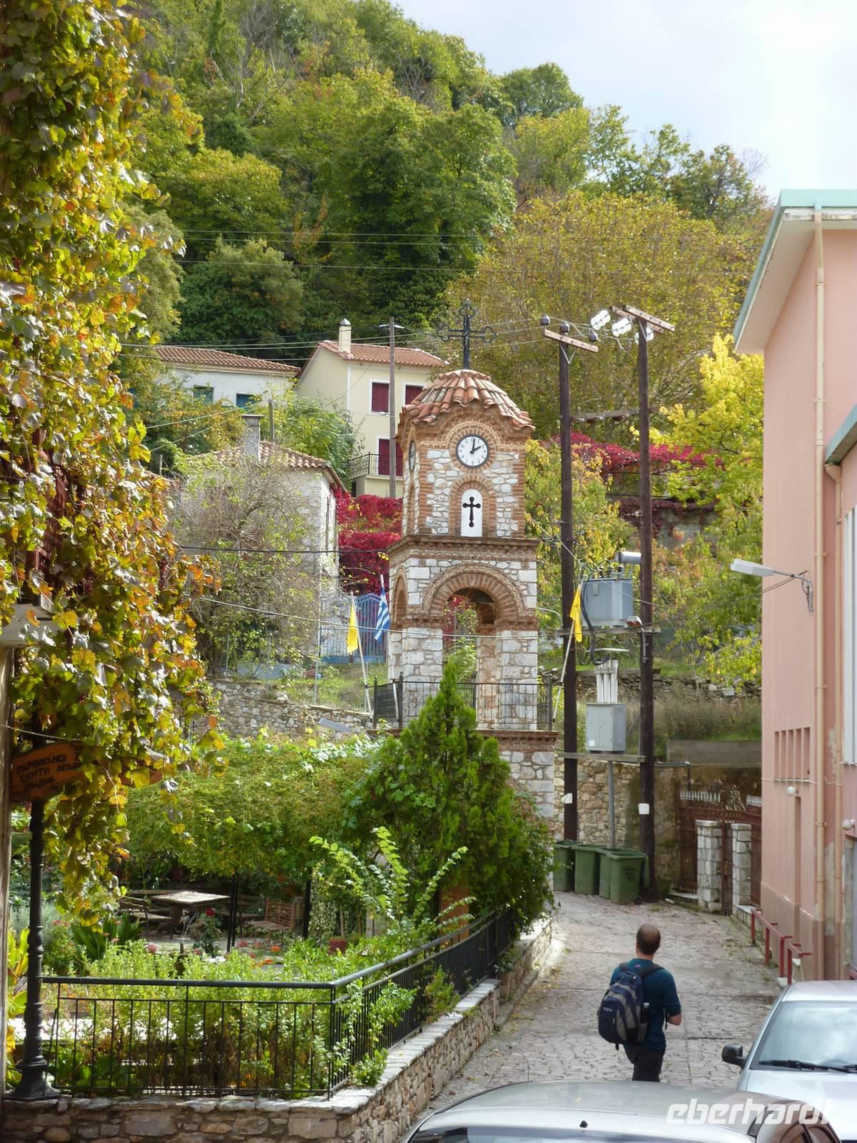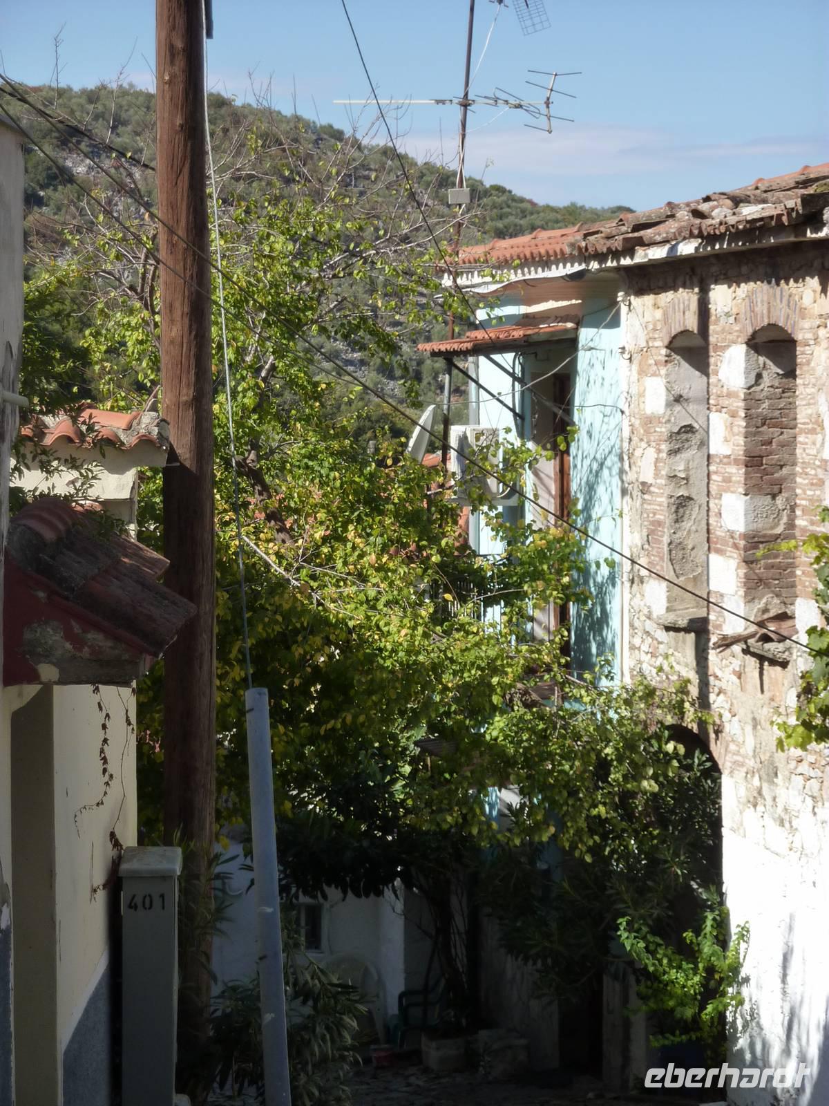Ganz gemütlich gingen wir den Tag an, schließlich wollten unsere Gäste sich ja erholen. Um 08.30 Uhr gab es auf der Frühstücksterrasse (open-air) eine Stärkung mit Brot, Eier, Schafskäse, Schnittkäse, Wurst, Oliven, Tomaten, Gurke, frisch gepressten Orangensaft, Kaffee und/oder Tee. Eva und ich hatten uns am Morgen im Internet die Wetterkarte angesehen, naja nicht so grandios und die ganze Nacht hatte es reichlich geregnet. Wir besprachen uns und beschlossen, die geplante Wanderung den Witterungsbedingungen ein wenig anzupassen. Regensachen wurden in den Rucksack gepackt für den Fall der Fälle und so brachen wir um 10.00 Uhr zu unserer ersten Wanderung auf. Der Himmel war wolkenverhangen, aber es war angenehm warm und wir in Wanderlaune. Unser Bus brachte uns zunächst zu unserem Ausgangspunkt der Wanderung, einem netten Rastplatz. Hier konnten wir uns mit frischem Obst oder Trockenfrüchten als Wegzehrung eindecken. Ganz gemütlich, ganz siga, siga (langsam, langsam) wie Eva uns immer wieder in den nächsten Tagen auffordern würde, wanderten wir nun los. Das mit dem „siga, siga" mussten wir allerdings erst noch lernen, denn irgendwie waren wir von unserem Alltag noch ganz schön gehetzt. Unsere Sinne mussten sich erst noch öffnen und schärfen. Über alte Karrenwege, leicht bergan, vorbei an unzähligen Oliven-, Feigenbäumen, Platanen und Pinien erreichten wir schließlich das noch sehr traditionsreiche Bergstädtchen Agiasos auf immerhin 700 Metern über dem Meeresspiegel, das sich malerisch an die Hänge des Olymposgebirges schmiegt. Schmale, gepflasterte Gassen mit zahlreichen Cafenions und Tavernen zeichnen diesen Ort gleichermaßen aus, wie deren berühmte Keramikkunst. Wir besichtigen zunächst die Kirche, bevor wir bei einem griechischen Kaffee und den Leckereien aus der Bäckerei gegenüber eine Rast einlegen. Eva liest dazu aus dem Buch von Eva Demski, die darin Ihre Liebe zu dieser Insel beschreibt, z.B. die Form der Insel mit der eines Platanenblattes vergleicht und uns auffordert „mit den Füßen einer Bergziege und dem furchtlosen Herzen eines Wanderfalken" das Inselinnere zu erobern. Wir lauschen Eva dabei ganz gespannt zu, und ganz allmählich gelingt es uns, die Gelassenheit und Ruhe der Menschen dieser Insel auch in uns aufzunehmen. In unserer Freizeit lassen wir das Flair der Gassen auf uns wirken, mit den Häusern deren vorspringende Obergeschosse, bekannt als sachnisia, und hölzerne Balkone mit Blumentöpfen von Begonien, Nelken und Geranien uns verzaubern. Schließlich erwartet uns wieder unser Chauffeur und fährt uns sicher über die engen Bergstraßen zurück in unser Hotel. Das Abendessen lassen wir uns wiederum in der Taverne nahe unseres Hotels servieren. Moussaka wurde heute von Eva bestellt, ein ganz typisches Gericht, bei dem Lammhack und Auberginen geschichtet und mit Schafskäse überbacken wird. Einfach lecker.. Zum Verdauen abermals ein Ouzo hinterher, das hilft.