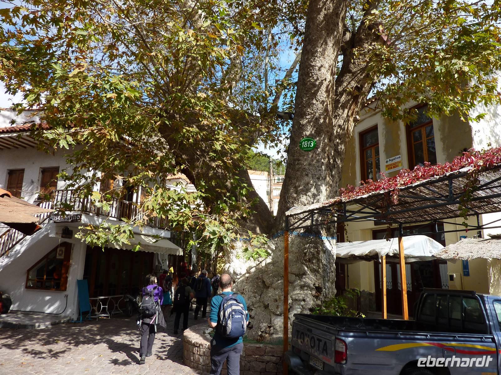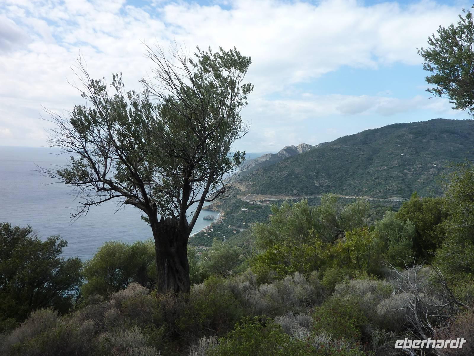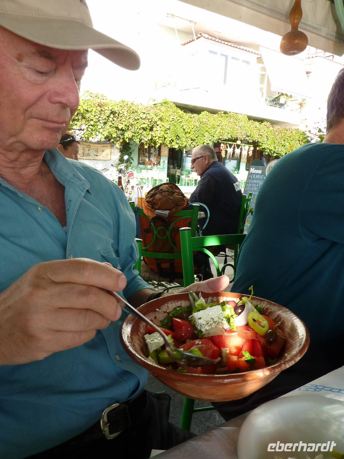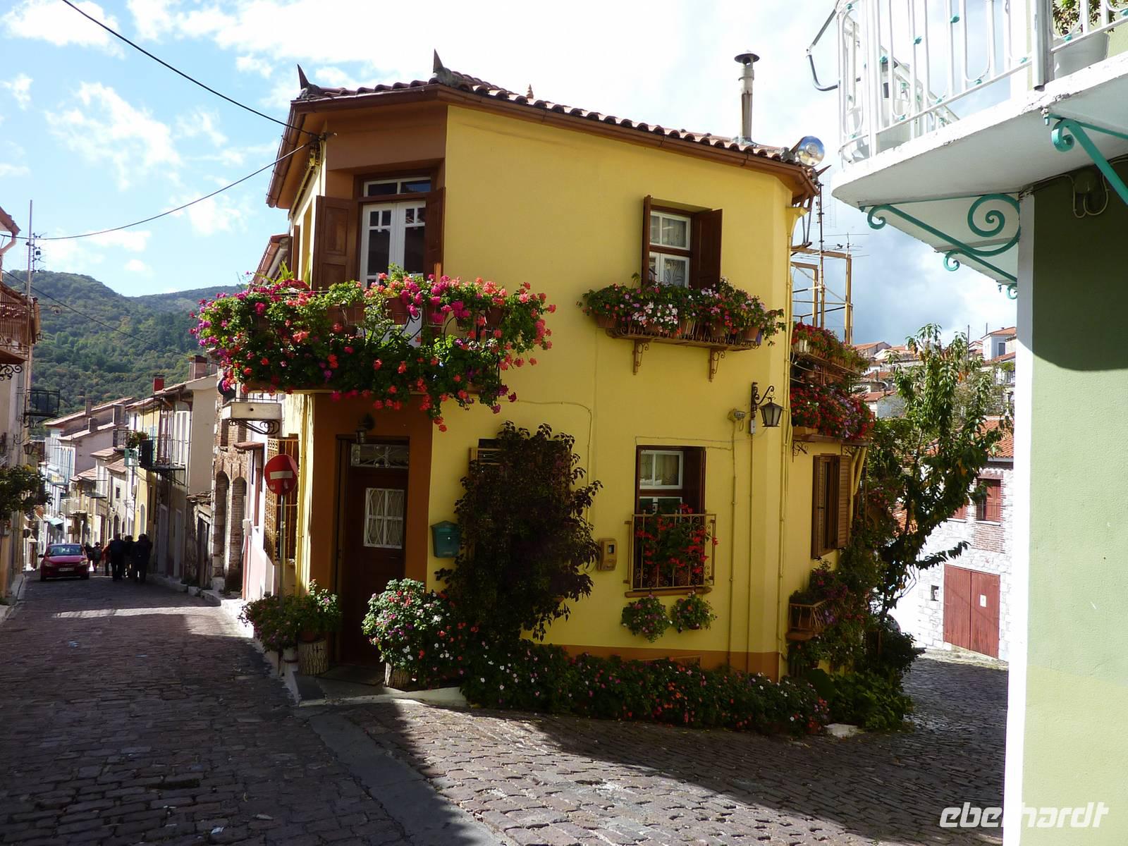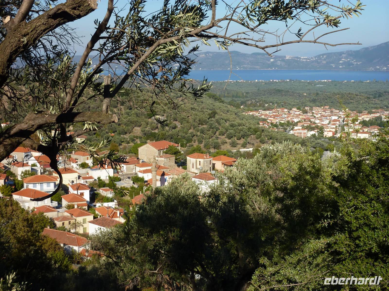 Ganz gemütlich gingen wir den Tag an, schließlich wollten unsere Gäste sich ja erholen. Um 08.30 Uhr gab es auf der Frühstücksterrasse (open-air) eine Stärkung mit Brot, Eier, Schafskäse, Schnittkäse, Wurst, Oliven, Tomaten, Gurke, frisch gepressten Orangensaft, Kaffee und/oder Tee. Eva und ich hatten uns am Morgen im Internet die Wetterkarte angesehen, naja nicht so grandios und die ganze Nacht hatte es reichlich geregnet. Wir besprachen uns und beschlossen, die geplante Wanderung den Witterungsbedingungen ein wenig anzupassen. Regensachen wurden in den Rucksack gepackt für den Fall der Fälle und so brachen wir um 10.00 Uhr zu unserer ersten Wanderung auf. Der Himmel war wolkenverhangen, aber es war angenehm warm und wir in Wanderlaune. Unser Bus brachte uns zunächst zu unserem Ausgangspunkt der Wanderung, einem netten Rastplatz. Hier konnten wir uns mit frischem Obst oder Trockenfrüchten als Wegzehrung eindecken. Ganz gemütlich, ganz siga, siga (langsam, langsam) wie Eva uns immer wieder in den nächsten Tagen auffordern würde, wanderten wir nun los. Das mit dem „siga, siga" mussten wir allerdings erst noch lernen, denn irgendwie waren wir von unserem Alltag noch ganz schön gehetzt. Unsere Sinne mussten sich erst noch öffnen und schärfen. Über alte Karrenwege, leicht bergan, vorbei an unzähligen Oliven-, Feigenbäumen, Platanen und Pinien erreichten wir schließlich das noch sehr traditionsreiche Bergstädtchen Agiasos auf immerhin 700 Metern über dem Meeresspiegel, das sich malerisch an die Hänge des Olymposgebirges schmiegt. Schmale, gepflasterte Gassen mit zahlreichen Cafenions und Tavernen zeichnen diesen Ort gleichermaßen aus, wie deren berühmte Keramikkunst. Wir besichtigen zunächst die Kirche, bevor wir bei einem griechischen Kaffee und den Leckereien aus der Bäckerei gegenüber eine Rast einlegen. Eva liest dazu aus dem Buch von Eva Demski, die darin Ihre Liebe zu dieser Insel beschreibt, z.B. die Form der Insel mit der eines Platanenblattes vergleicht und uns auffordert „mit den Füßen einer Bergziege und dem furchtlosen Herzen eines Wanderfalken" das Inselinnere zu erobern. Wir lauschen Eva dabei ganz gespannt zu, und ganz allmählich gelingt es uns, die Gelassenheit und Ruhe der Menschen dieser Insel auch in uns aufzunehmen. In unserer Freizeit lassen wir das Flair der Gassen auf uns wirken, mit den Häusern deren vorspringende Obergeschosse, bekannt als sachnisia, und hölzerne Balkone mit Blumentöpfen von Begonien, Nelken und Geranien uns verzaubern. Schließlich erwartet uns wieder unser Chauffeur und fährt uns sicher über die engen Bergstraßen zurück in unser Hotel. Das Abendessen lassen wir uns wiederum in der Taverne nahe unseres Hotels servieren. Moussaka wurde heute von Eva bestellt, ein ganz typisches Gericht, bei dem Lammhack und Auberginen geschichtet und mit Schafskäse überbacken wird. Einfach lecker.. Zum Verdauen abermals ein Ouzo hinterher, das hilft.