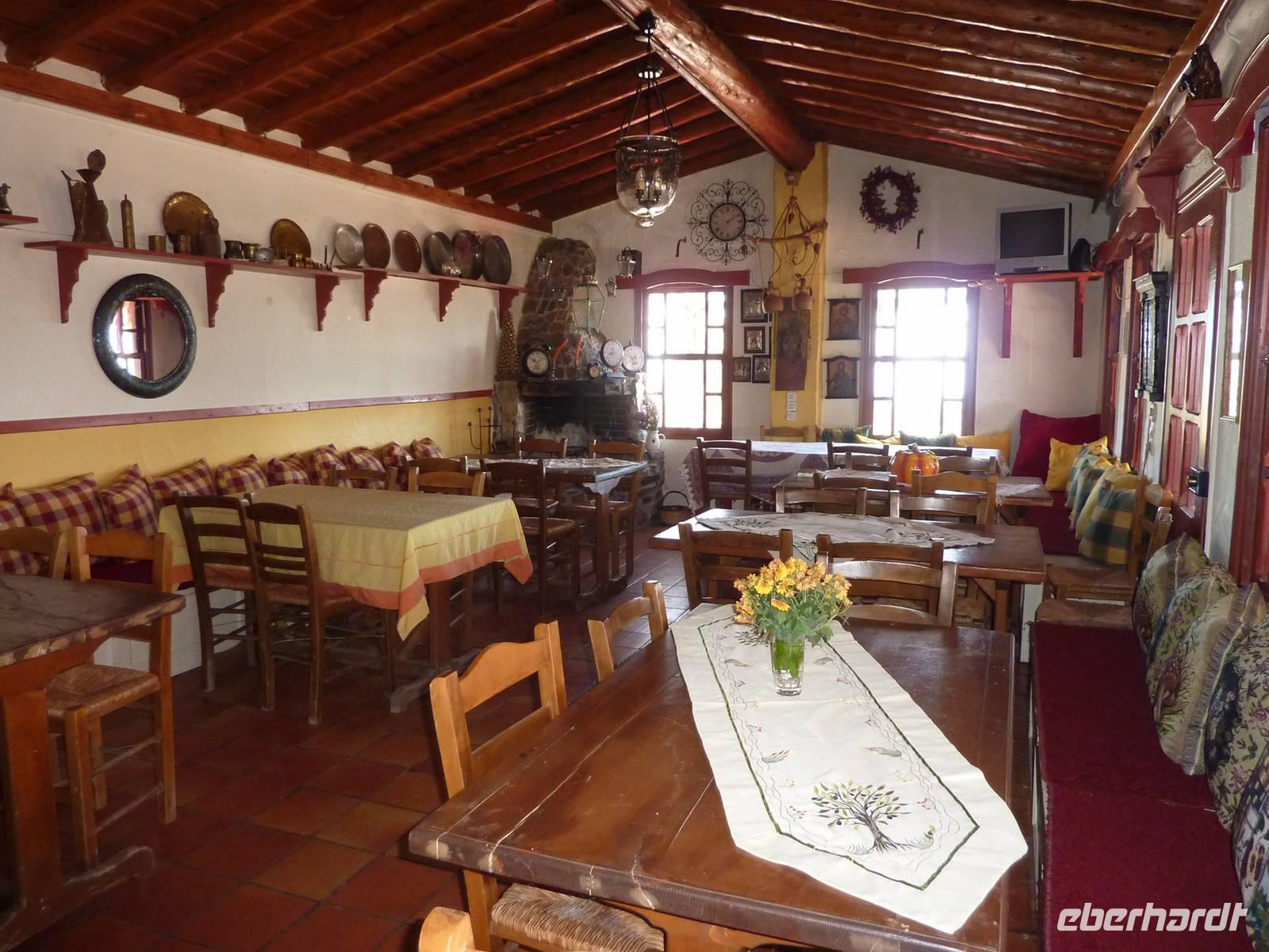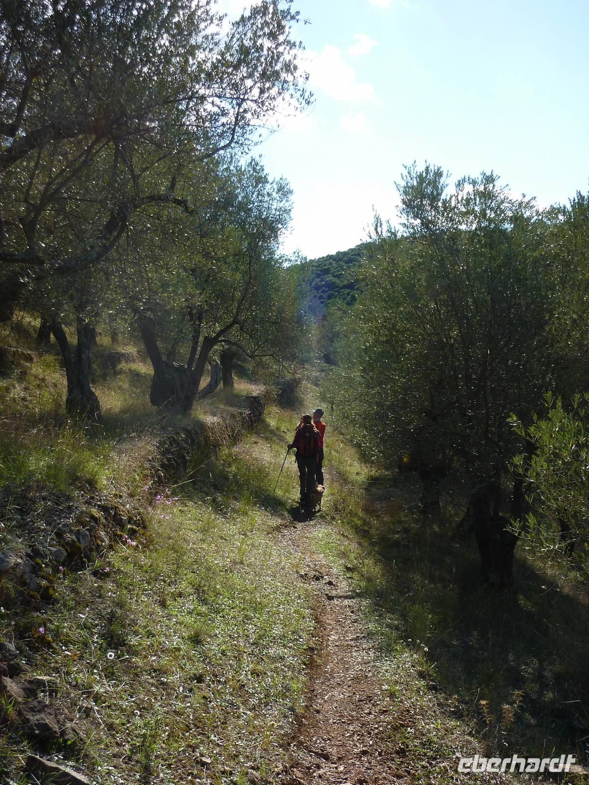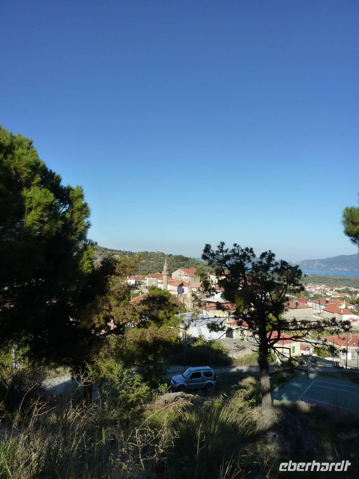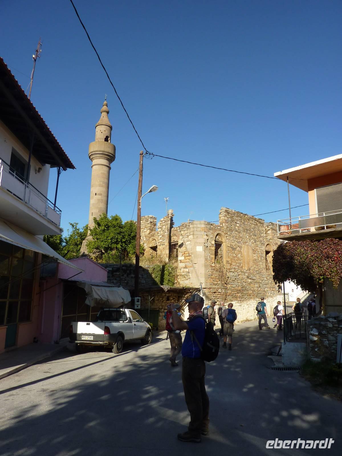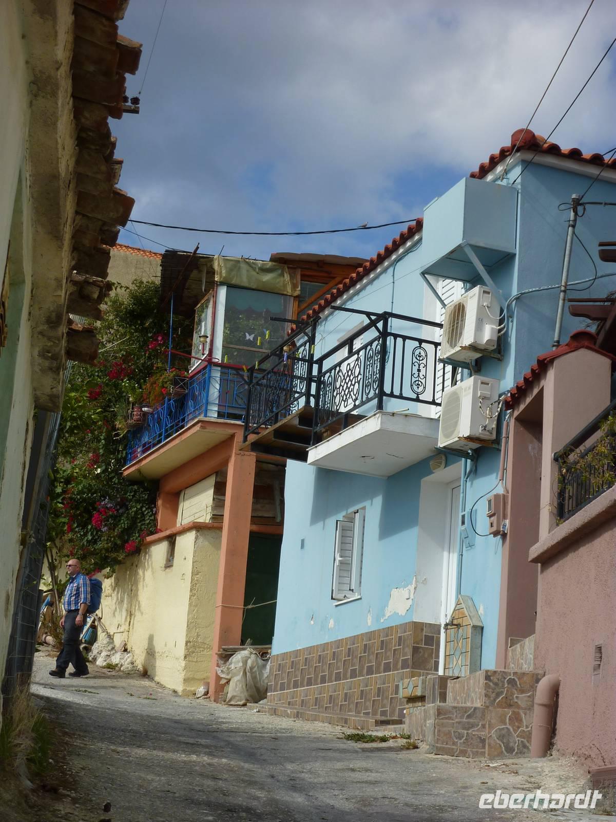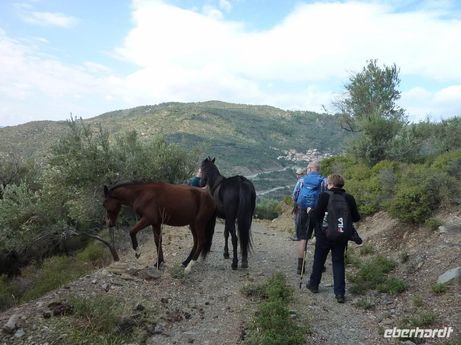 Ganz gemütlich gingen wir den Tag an, schließlich wollten unsere Gäste sich ja erholen. Um 08.30 Uhr gab es auf der Frühstücksterrasse (open-air) eine Stärkung mit Brot, Eier, Schafskäse, Schnittkäse, Wurst, Oliven, Tomaten, Gurke, frisch gepressten Orangensaft, Kaffee und/oder Tee. Eva und ich hatten uns am Morgen im Internet die Wetterkarte angesehen, naja nicht so grandios und die ganze Nacht hatte es reichlich geregnet. Wir besprachen uns und beschlossen, die geplante Wanderung den Witterungsbedingungen ein wenig anzupassen. Regensachen wurden in den Rucksack gepackt für den Fall der Fälle und so brachen wir um 10.00 Uhr zu unserer ersten Wanderung auf. Der Himmel war wolkenverhangen, aber es war angenehm warm und wir in Wanderlaune. Unser Bus brachte uns zunächst zu unserem Ausgangspunkt der Wanderung, einem netten Rastplatz. Hier konnten wir uns mit frischem Obst oder Trockenfrüchten als Wegzehrung eindecken. Ganz gemütlich, ganz siga, siga (langsam, langsam) wie Eva uns immer wieder in den nächsten Tagen auffordern würde, wanderten wir nun los. Das mit dem „siga, siga" mussten wir allerdings erst noch lernen, denn irgendwie waren wir von unserem Alltag noch ganz schön gehetzt. Unsere Sinne mussten sich erst noch öffnen und schärfen. Über alte Karrenwege, leicht bergan, vorbei an unzähligen Oliven-, Feigenbäumen, Platanen und Pinien erreichten wir schließlich das noch sehr traditionsreiche Bergstädtchen Agiasos auf immerhin 700 Metern über dem Meeresspiegel, das sich malerisch an die Hänge des Olymposgebirges schmiegt. Schmale, gepflasterte Gassen mit zahlreichen Cafenions und Tavernen zeichnen diesen Ort gleichermaßen aus, wie deren berühmte Keramikkunst. Wir besichtigen zunächst die Kirche, bevor wir bei einem griechischen Kaffee und den Leckereien aus der Bäckerei gegenüber eine Rast einlegen. Eva liest dazu aus dem Buch von Eva Demski, die darin Ihre Liebe zu dieser Insel beschreibt, z.B. die Form der Insel mit der eines Platanenblattes vergleicht und uns auffordert „mit den Füßen einer Bergziege und dem furchtlosen Herzen eines Wanderfalken" das Inselinnere zu erobern. Wir lauschen Eva dabei ganz gespannt zu, und ganz allmählich gelingt es uns, die Gelassenheit und Ruhe der Menschen dieser Insel auch in uns aufzunehmen. In unserer Freizeit lassen wir das Flair der Gassen auf uns wirken, mit den Häusern deren vorspringende Obergeschosse, bekannt als sachnisia, und hölzerne Balkone mit Blumentöpfen von Begonien, Nelken und Geranien uns verzaubern. Schließlich erwartet uns wieder unser Chauffeur und fährt uns sicher über die engen Bergstraßen zurück in unser Hotel. Das Abendessen lassen wir uns wiederum in der Taverne nahe unseres Hotels servieren. Moussaka wurde heute von Eva bestellt, ein ganz typisches Gericht, bei dem Lammhack und Auberginen geschichtet und mit Schafskäse überbacken wird. Einfach lecker.. Zum Verdauen abermals ein Ouzo hinterher, das hilft.