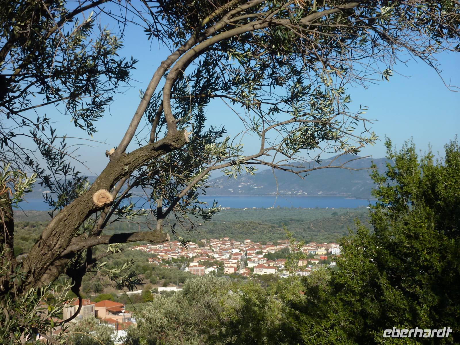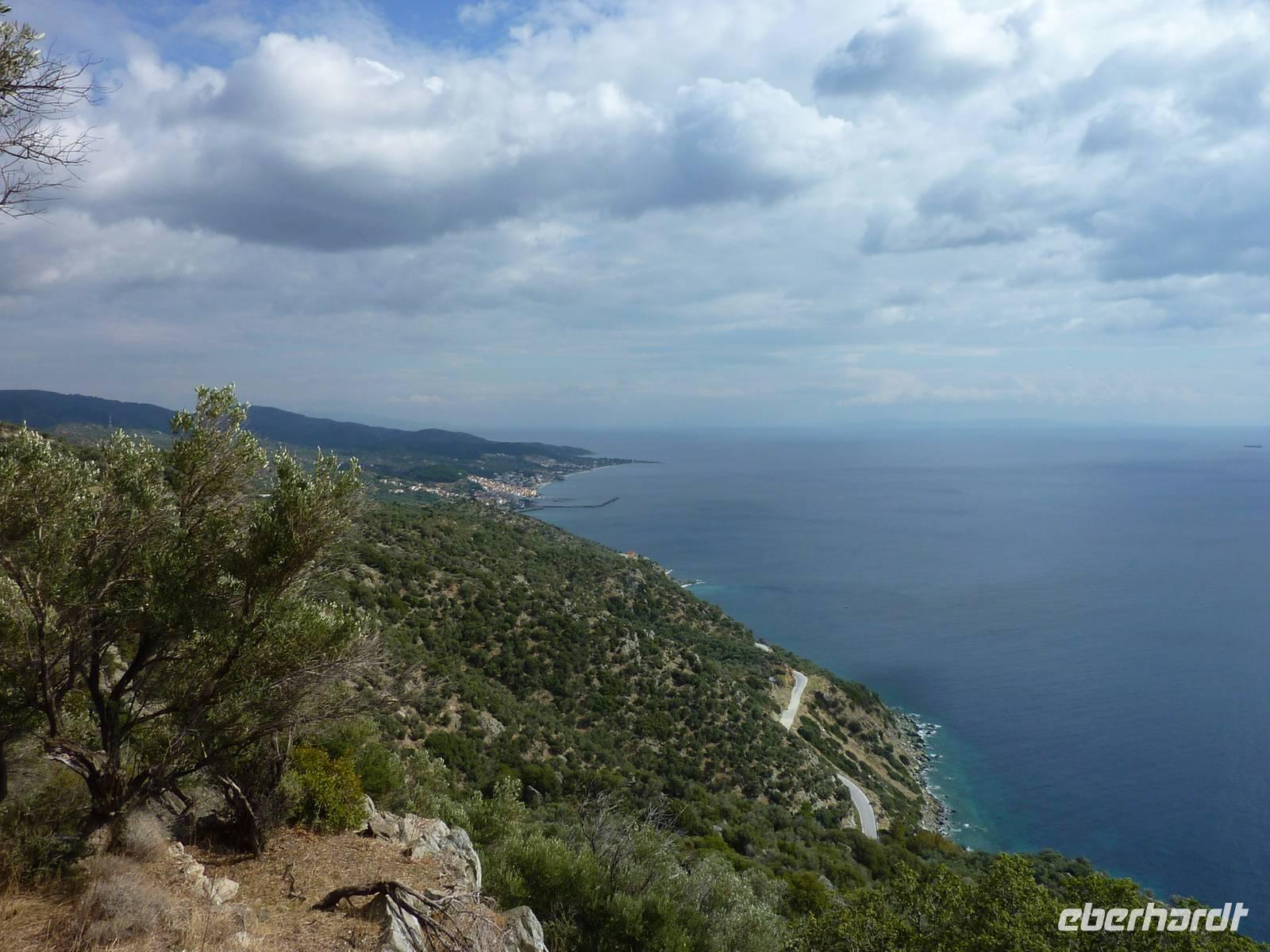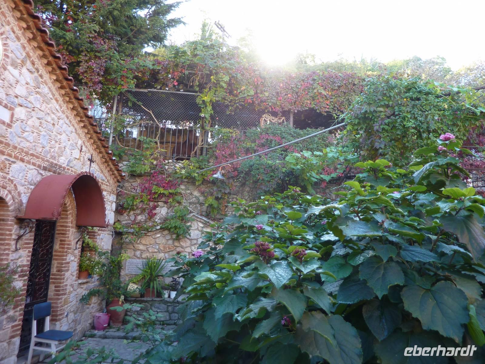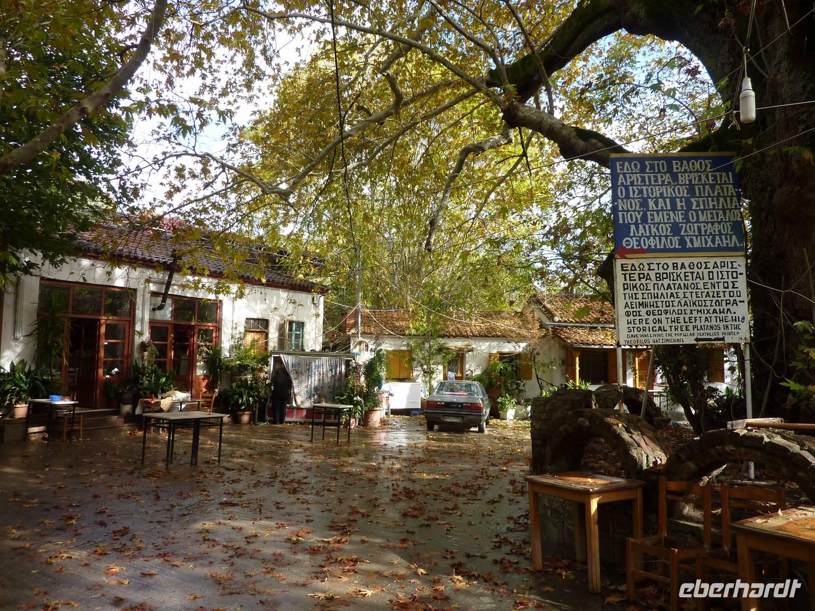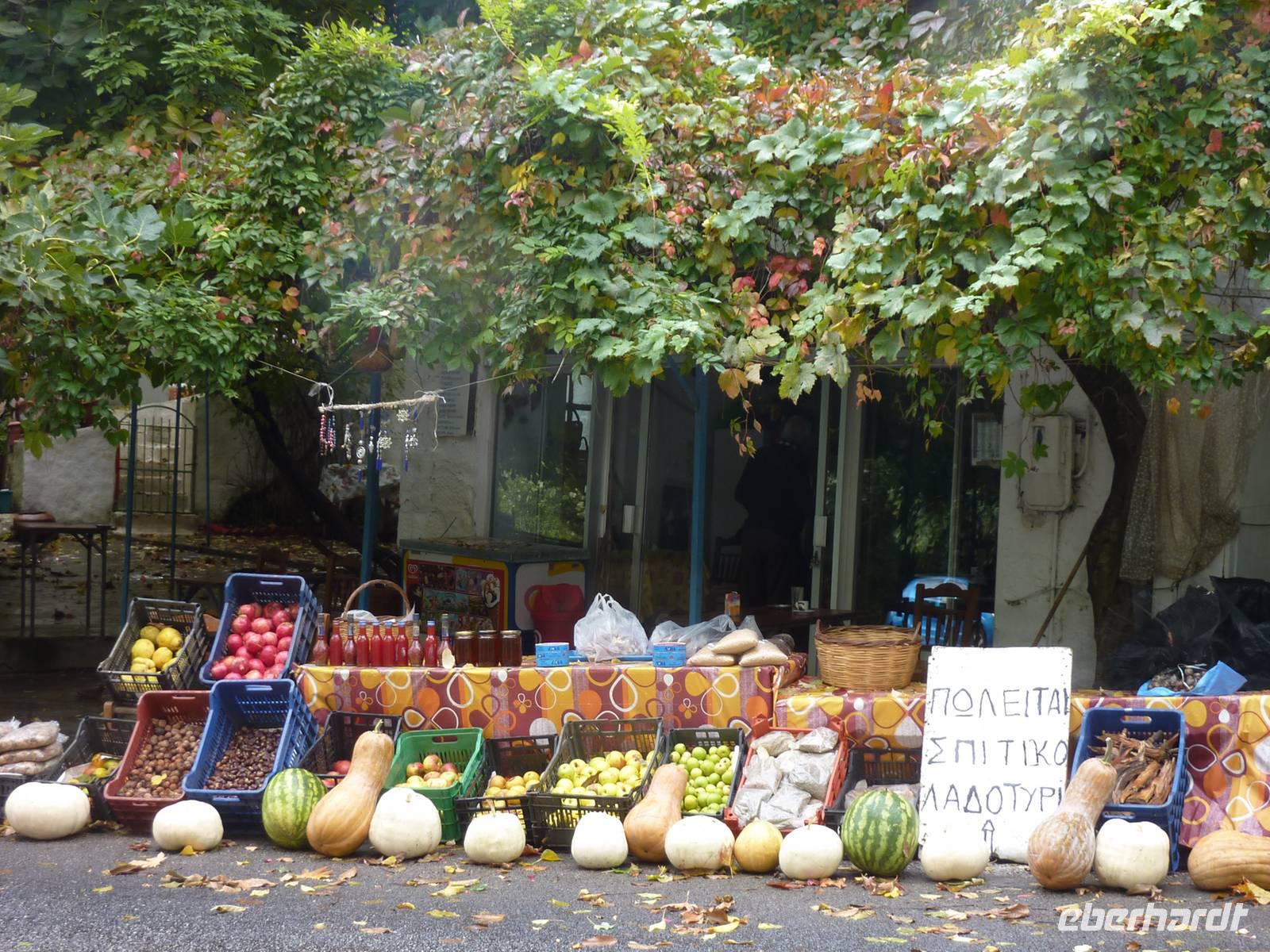 Ganz gemütlich gingen wir den Tag an, schließlich wollten unsere Gäste sich ja erholen. Um 08.30 Uhr gab es auf der Frühstücksterrasse (open-air) eine Stärkung mit Brot, Eier, Schafskäse, Schnittkäse, Wurst, Oliven, Tomaten, Gurke, frisch gepressten Orangensaft, Kaffee und/oder Tee. Eva und ich hatten uns am Morgen im Internet die Wetterkarte angesehen, naja nicht so grandios und die ganze Nacht hatte es reichlich geregnet. Wir besprachen uns und beschlossen, die geplante Wanderung den Witterungsbedingungen ein wenig anzupassen. Regensachen wurden in den Rucksack gepackt für den Fall der Fälle und so brachen wir um 10.00 Uhr zu unserer ersten Wanderung auf. Der Himmel war wolkenverhangen, aber es war angenehm warm und wir in Wanderlaune. Unser Bus brachte uns zunächst zu unserem Ausgangspunkt der Wanderung, einem netten Rastplatz. Hier konnten wir uns mit frischem Obst oder Trockenfrüchten als Wegzehrung eindecken. Ganz gemütlich, ganz siga, siga (langsam, langsam) wie Eva uns immer wieder in den nächsten Tagen auffordern würde, wanderten wir nun los. Das mit dem „siga, siga" mussten wir allerdings erst noch lernen, denn irgendwie waren wir von unserem Alltag noch ganz schön gehetzt. Unsere Sinne mussten sich erst noch öffnen und schärfen. Über alte Karrenwege, leicht bergan, vorbei an unzähligen Oliven-, Feigenbäumen, Platanen und Pinien erreichten wir schließlich das noch sehr traditionsreiche Bergstädtchen Agiasos auf immerhin 700 Metern über dem Meeresspiegel, das sich malerisch an die Hänge des Olymposgebirges schmiegt. Schmale, gepflasterte Gassen mit zahlreichen Cafenions und Tavernen zeichnen diesen Ort gleichermaßen aus, wie deren berühmte Keramikkunst. Wir besichtigen zunächst die Kirche, bevor wir bei einem griechischen Kaffee und den Leckereien aus der Bäckerei gegenüber eine Rast einlegen. Eva liest dazu aus dem Buch von Eva Demski, die darin Ihre Liebe zu dieser Insel beschreibt, z.B. die Form der Insel mit der eines Platanenblattes vergleicht und uns auffordert „mit den Füßen einer Bergziege und dem furchtlosen Herzen eines Wanderfalken" das Inselinnere zu erobern. Wir lauschen Eva dabei ganz gespannt zu, und ganz allmählich gelingt es uns, die Gelassenheit und Ruhe der Menschen dieser Insel auch in uns aufzunehmen. In unserer Freizeit lassen wir das Flair der Gassen auf uns wirken, mit den Häusern deren vorspringende Obergeschosse, bekannt als sachnisia, und hölzerne Balkone mit Blumentöpfen von Begonien, Nelken und Geranien uns verzaubern. Schließlich erwartet uns wieder unser Chauffeur und fährt uns sicher über die engen Bergstraßen zurück in unser Hotel. Das Abendessen lassen wir uns wiederum in der Taverne nahe unseres Hotels servieren. Moussaka wurde heute von Eva bestellt, ein ganz typisches Gericht, bei dem Lammhack und Auberginen geschichtet und mit Schafskäse überbacken wird. Einfach lecker.. Zum Verdauen abermals ein Ouzo hinterher, das hilft.