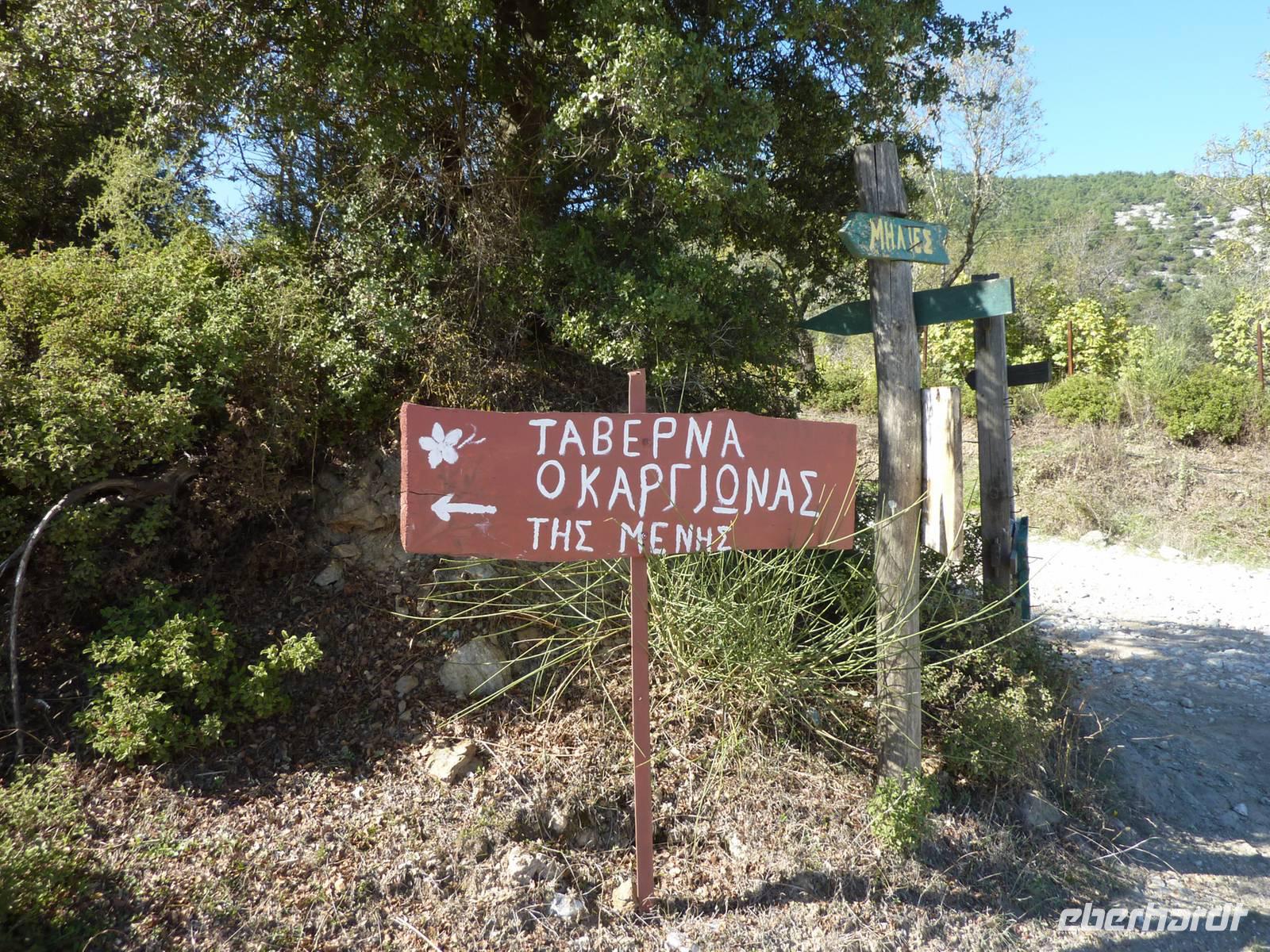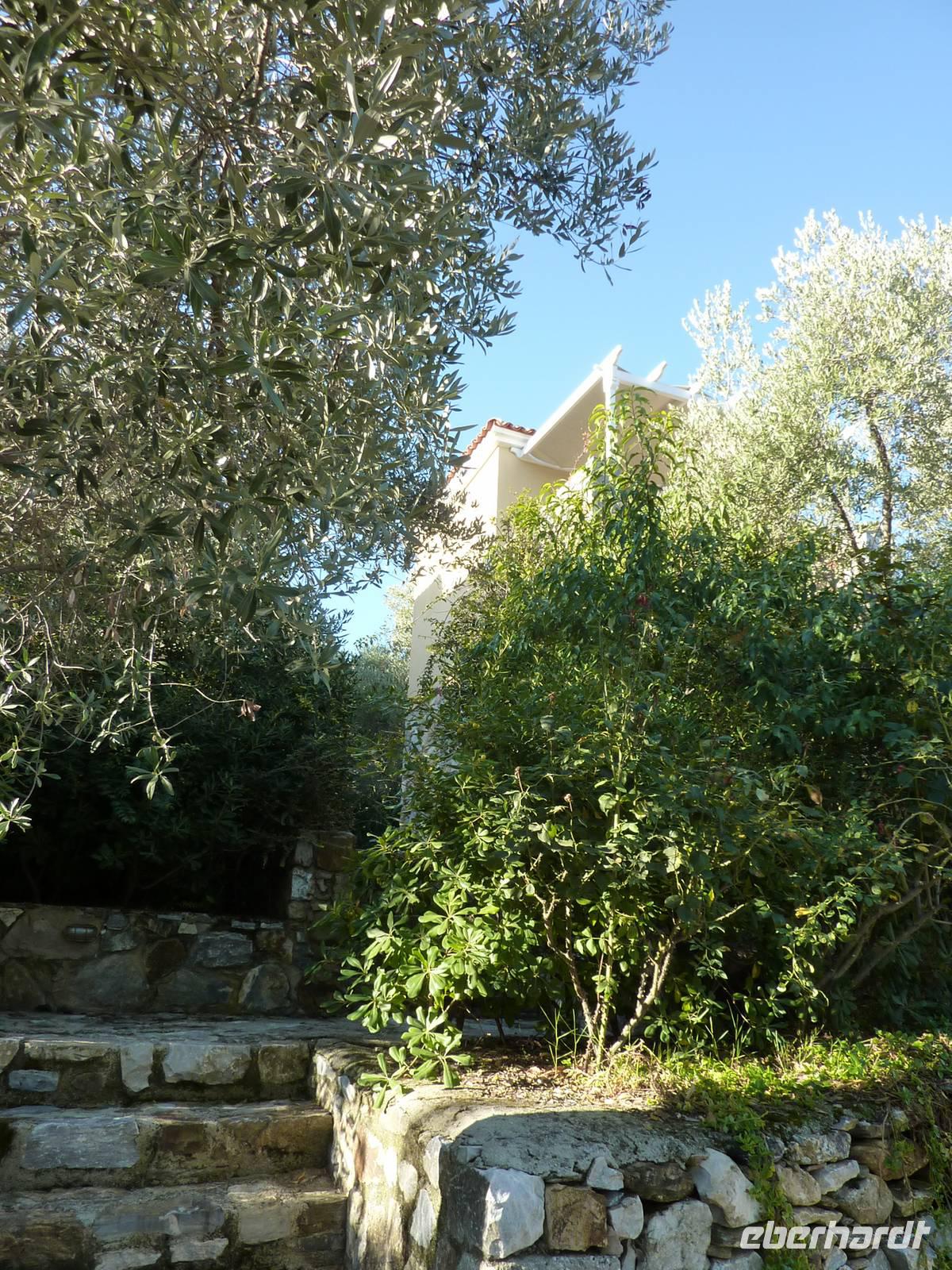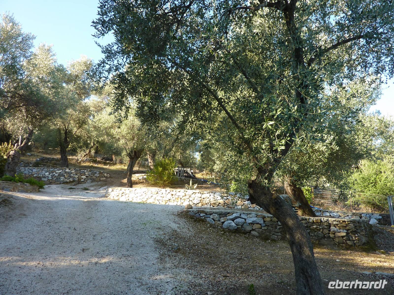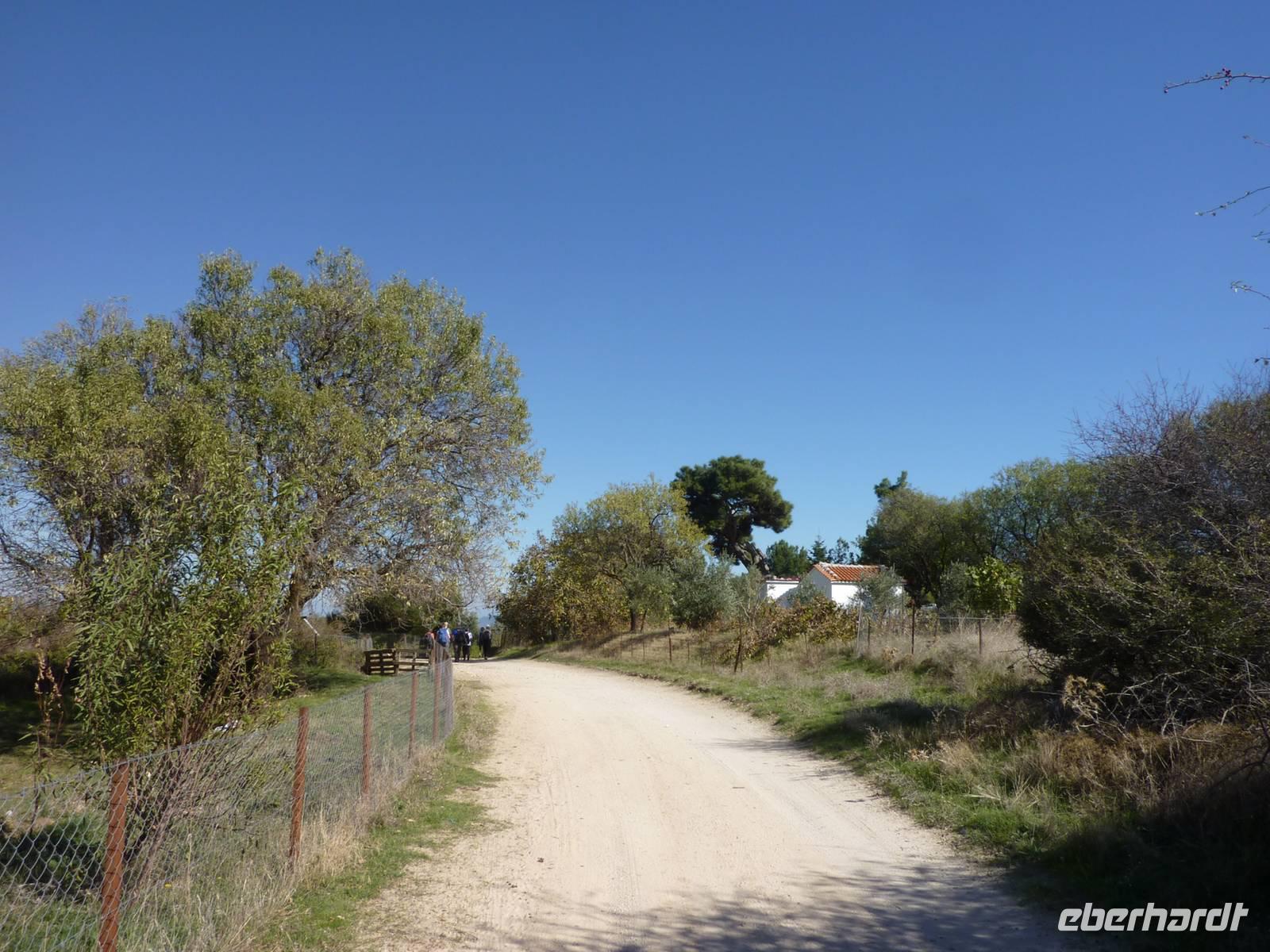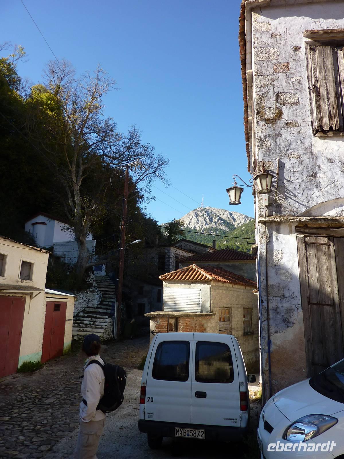 Ganz gemütlich gingen wir den Tag an, schließlich wollten unsere Gäste sich ja erholen. Um 08.30 Uhr gab es auf der Frühstücksterrasse (open-air) eine Stärkung mit Brot, Eier, Schafskäse, Schnittkäse, Wurst, Oliven, Tomaten, Gurke, frisch gepressten Orangensaft, Kaffee und/oder Tee. Eva und ich hatten uns am Morgen im Internet die Wetterkarte angesehen, naja nicht so grandios und die ganze Nacht hatte es reichlich geregnet. Wir besprachen uns und beschlossen, die geplante Wanderung den Witterungsbedingungen ein wenig anzupassen. Regensachen wurden in den Rucksack gepackt für den Fall der Fälle und so brachen wir um 10.00 Uhr zu unserer ersten Wanderung auf. Der Himmel war wolkenverhangen, aber es war angenehm warm und wir in Wanderlaune. Unser Bus brachte uns zunächst zu unserem Ausgangspunkt der Wanderung, einem netten Rastplatz. Hier konnten wir uns mit frischem Obst oder Trockenfrüchten als Wegzehrung eindecken. Ganz gemütlich, ganz siga, siga (langsam, langsam) wie Eva uns immer wieder in den nächsten Tagen auffordern würde, wanderten wir nun los. Das mit dem „siga, siga" mussten wir allerdings erst noch lernen, denn irgendwie waren wir von unserem Alltag noch ganz schön gehetzt. Unsere Sinne mussten sich erst noch öffnen und schärfen. Über alte Karrenwege, leicht bergan, vorbei an unzähligen Oliven-, Feigenbäumen, Platanen und Pinien erreichten wir schließlich das noch sehr traditionsreiche Bergstädtchen Agiasos auf immerhin 700 Metern über dem Meeresspiegel, das sich malerisch an die Hänge des Olymposgebirges schmiegt. Schmale, gepflasterte Gassen mit zahlreichen Cafenions und Tavernen zeichnen diesen Ort gleichermaßen aus, wie deren berühmte Keramikkunst. Wir besichtigen zunächst die Kirche, bevor wir bei einem griechischen Kaffee und den Leckereien aus der Bäckerei gegenüber eine Rast einlegen. Eva liest dazu aus dem Buch von Eva Demski, die darin Ihre Liebe zu dieser Insel beschreibt, z.B. die Form der Insel mit der eines Platanenblattes vergleicht und uns auffordert „mit den Füßen einer Bergziege und dem furchtlosen Herzen eines Wanderfalken" das Inselinnere zu erobern. Wir lauschen Eva dabei ganz gespannt zu, und ganz allmählich gelingt es uns, die Gelassenheit und Ruhe der Menschen dieser Insel auch in uns aufzunehmen. In unserer Freizeit lassen wir das Flair der Gassen auf uns wirken, mit den Häusern deren vorspringende Obergeschosse, bekannt als sachnisia, und hölzerne Balkone mit Blumentöpfen von Begonien, Nelken und Geranien uns verzaubern. Schließlich erwartet uns wieder unser Chauffeur und fährt uns sicher über die engen Bergstraßen zurück in unser Hotel. Das Abendessen lassen wir uns wiederum in der Taverne nahe unseres Hotels servieren. Moussaka wurde heute von Eva bestellt, ein ganz typisches Gericht, bei dem Lammhack und Auberginen geschichtet und mit Schafskäse überbacken wird. Einfach lecker.. Zum Verdauen abermals ein Ouzo hinterher, das hilft.