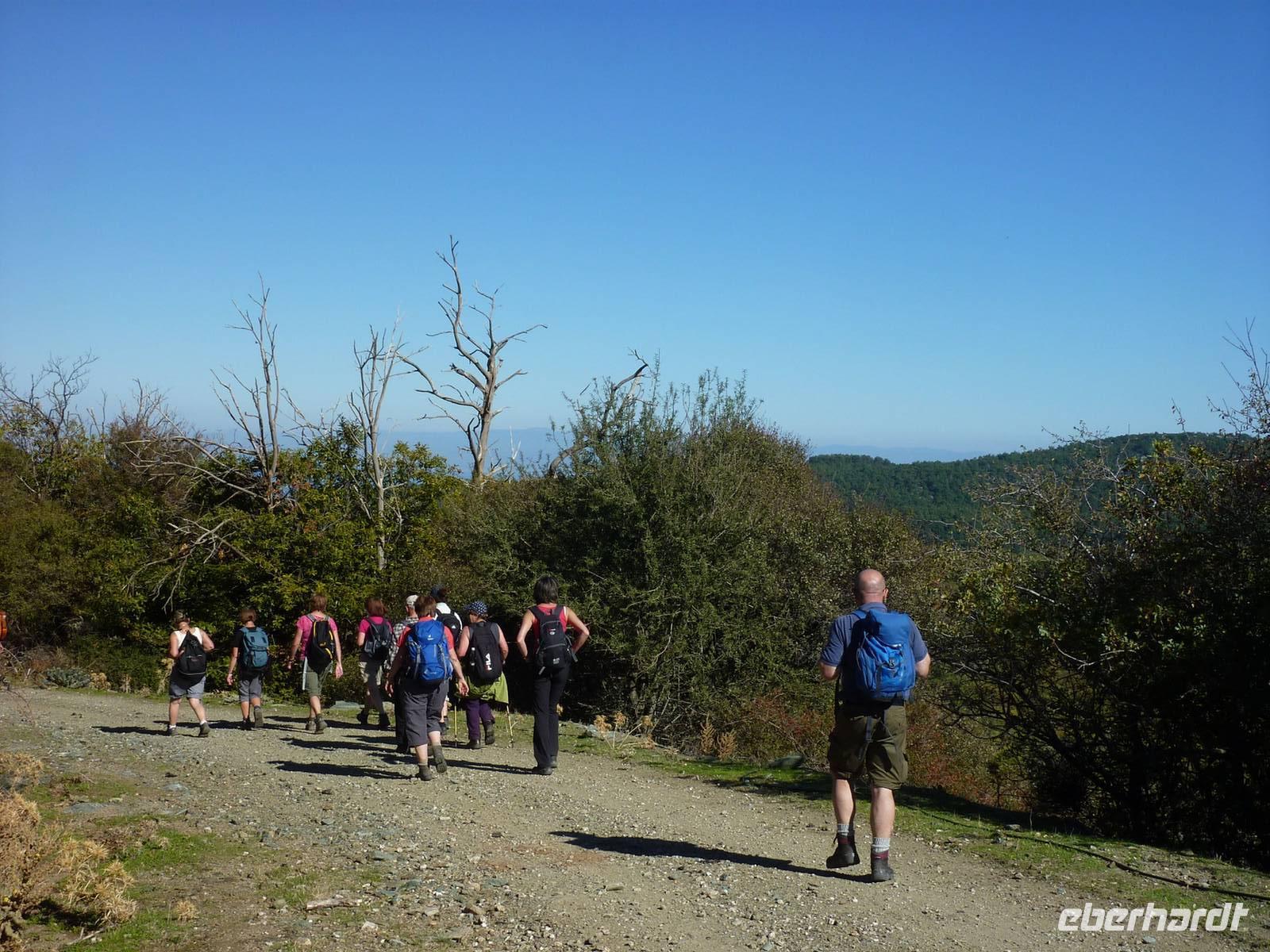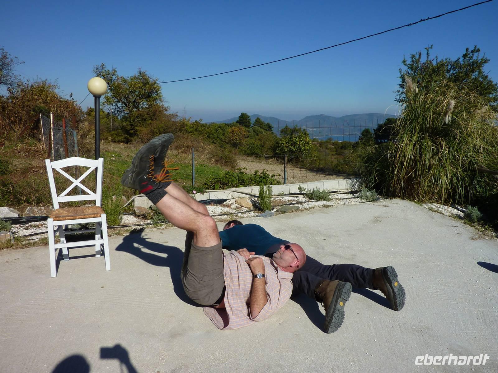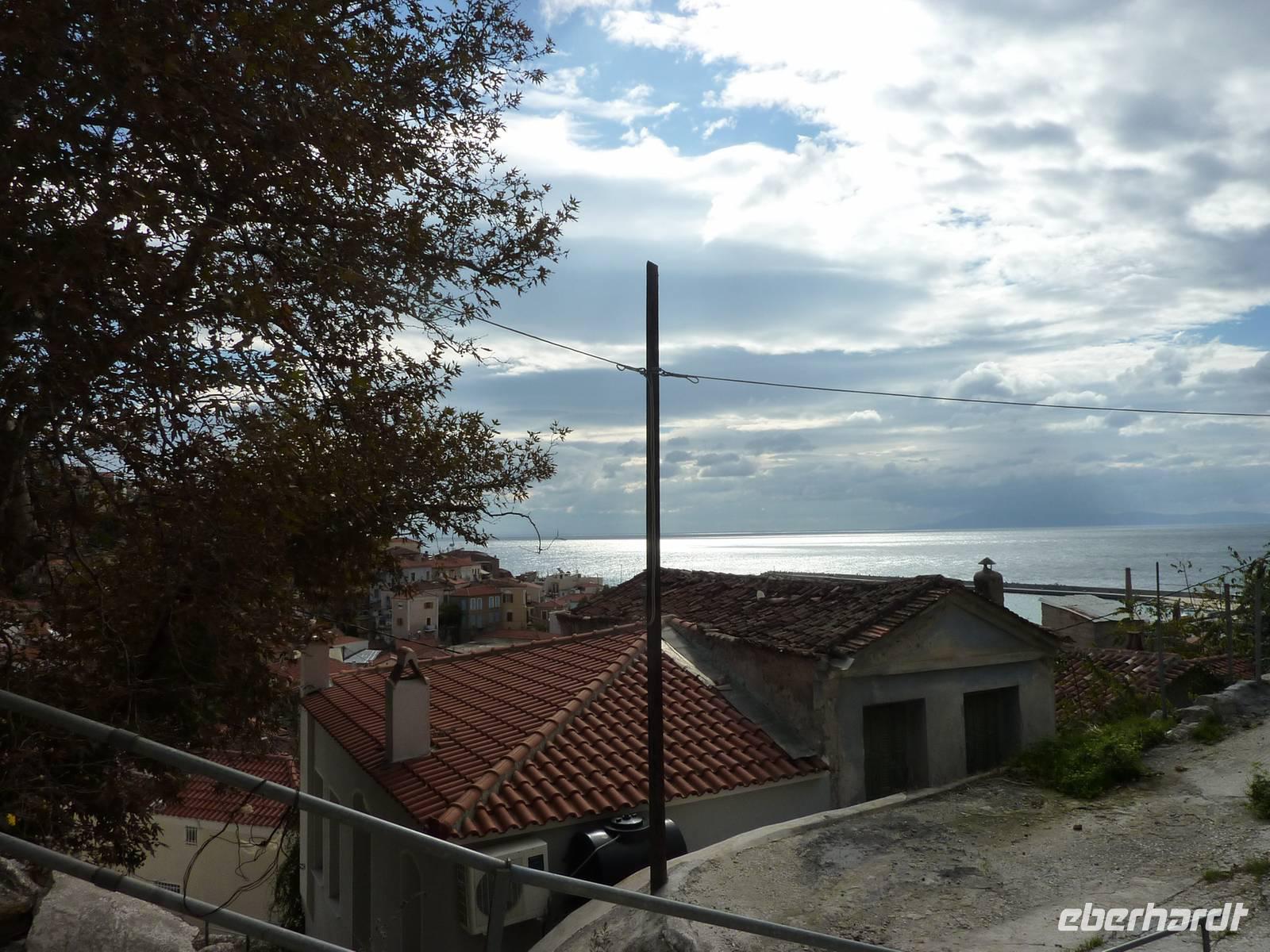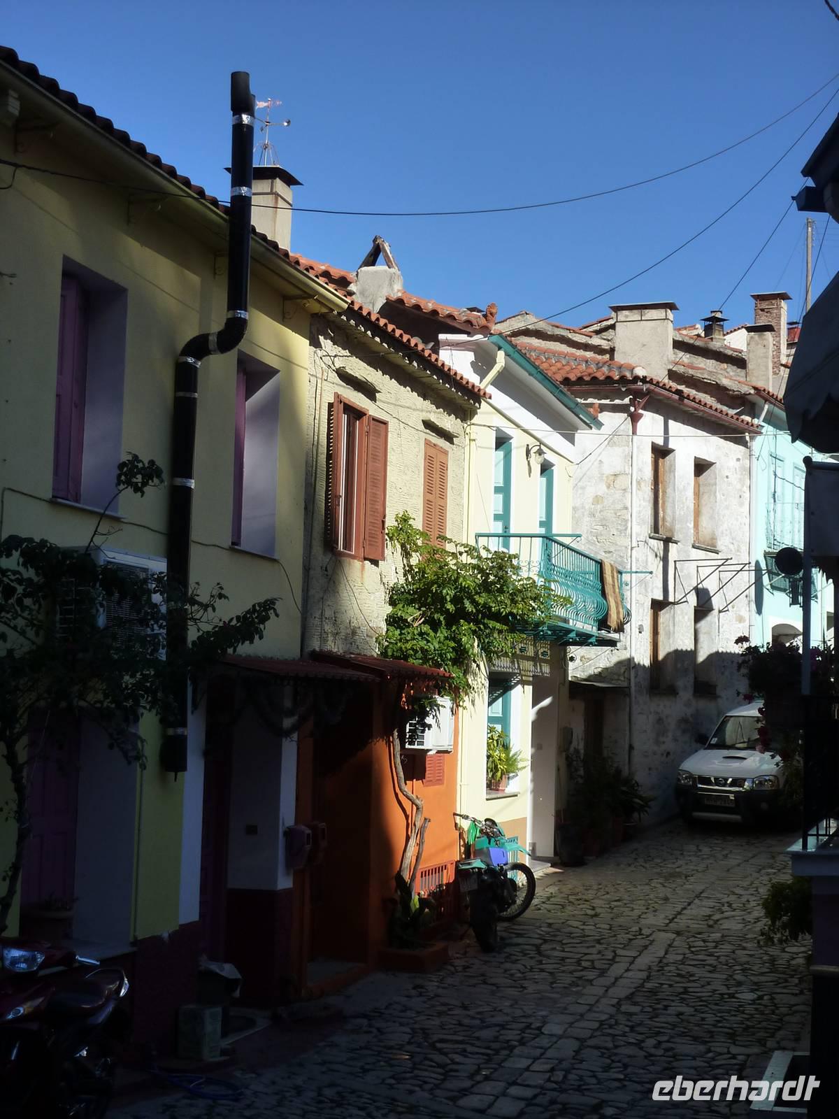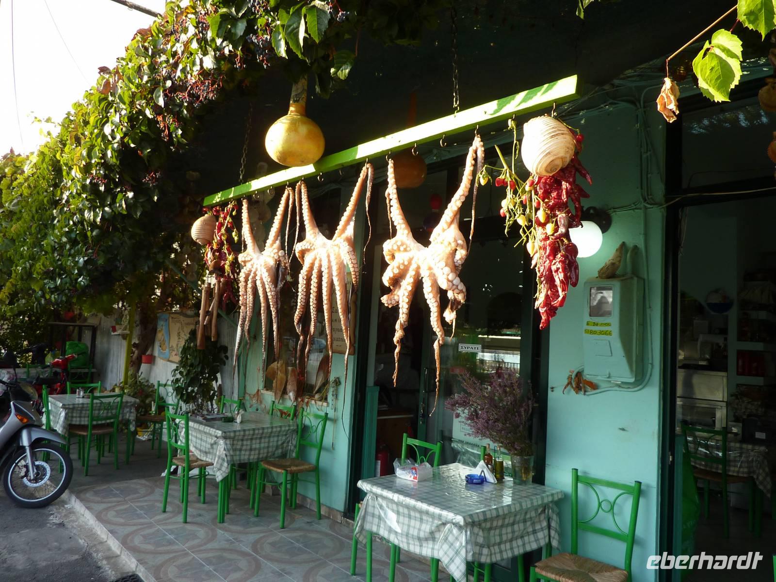Ganz gemütlich gingen wir den Tag an, schließlich wollten unsere Gäste sich ja erholen. Um 08.30 Uhr gab es auf der Frühstücksterrasse (open-air) eine Stärkung mit Brot, Eier, Schafskäse, Schnittkäse, Wurst, Oliven, Tomaten, Gurke, frisch gepressten Orangensaft, Kaffee und/oder Tee. Eva und ich hatten uns am Morgen im Internet die Wetterkarte angesehen, naja nicht so grandios und die ganze Nacht hatte es reichlich geregnet. Wir besprachen uns und beschlossen, die geplante Wanderung den Witterungsbedingungen ein wenig anzupassen. Regensachen wurden in den Rucksack gepackt für den Fall der Fälle und so brachen wir um 10.00 Uhr zu unserer ersten Wanderung auf. Der Himmel war wolkenverhangen, aber es war angenehm warm und wir in Wanderlaune. Unser Bus brachte uns zunächst zu unserem Ausgangspunkt der Wanderung, einem netten Rastplatz. Hier konnten wir uns mit frischem Obst oder Trockenfrüchten als Wegzehrung eindecken. Ganz gemütlich, ganz siga, siga (langsam, langsam) wie Eva uns immer wieder in den nächsten Tagen auffordern würde, wanderten wir nun los. Das mit dem „siga, siga" mussten wir allerdings erst noch lernen, denn irgendwie waren wir von unserem Alltag noch ganz schön gehetzt. Unsere Sinne mussten sich erst noch öffnen und schärfen. Über alte Karrenwege, leicht bergan, vorbei an unzähligen Oliven-, Feigenbäumen, Platanen und Pinien erreichten wir schließlich das noch sehr traditionsreiche Bergstädtchen Agiasos auf immerhin 700 Metern über dem Meeresspiegel, das sich malerisch an die Hänge des Olymposgebirges schmiegt. Schmale, gepflasterte Gassen mit zahlreichen Cafenions und Tavernen zeichnen diesen Ort gleichermaßen aus, wie deren berühmte Keramikkunst. Wir besichtigen zunächst die Kirche, bevor wir bei einem griechischen Kaffee und den Leckereien aus der Bäckerei gegenüber eine Rast einlegen. Eva liest dazu aus dem Buch von Eva Demski, die darin Ihre Liebe zu dieser Insel beschreibt, z.B. die Form der Insel mit der eines Platanenblattes vergleicht und uns auffordert „mit den Füßen einer Bergziege und dem furchtlosen Herzen eines Wanderfalken" das Inselinnere zu erobern. Wir lauschen Eva dabei ganz gespannt zu, und ganz allmählich gelingt es uns, die Gelassenheit und Ruhe der Menschen dieser Insel auch in uns aufzunehmen. In unserer Freizeit lassen wir das Flair der Gassen auf uns wirken, mit den Häusern deren vorspringende Obergeschosse, bekannt als sachnisia, und hölzerne Balkone mit Blumentöpfen von Begonien, Nelken und Geranien uns verzaubern. Schließlich erwartet uns wieder unser Chauffeur und fährt uns sicher über die engen Bergstraßen zurück in unser Hotel. Das Abendessen lassen wir uns wiederum in der Taverne nahe unseres Hotels servieren. Moussaka wurde heute von Eva bestellt, ein ganz typisches Gericht, bei dem Lammhack und Auberginen geschichtet und mit Schafskäse überbacken wird. Einfach lecker.. Zum Verdauen abermals ein Ouzo hinterher, das hilft.