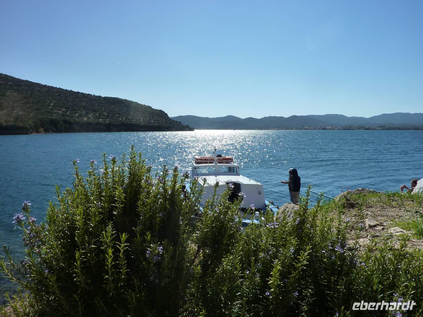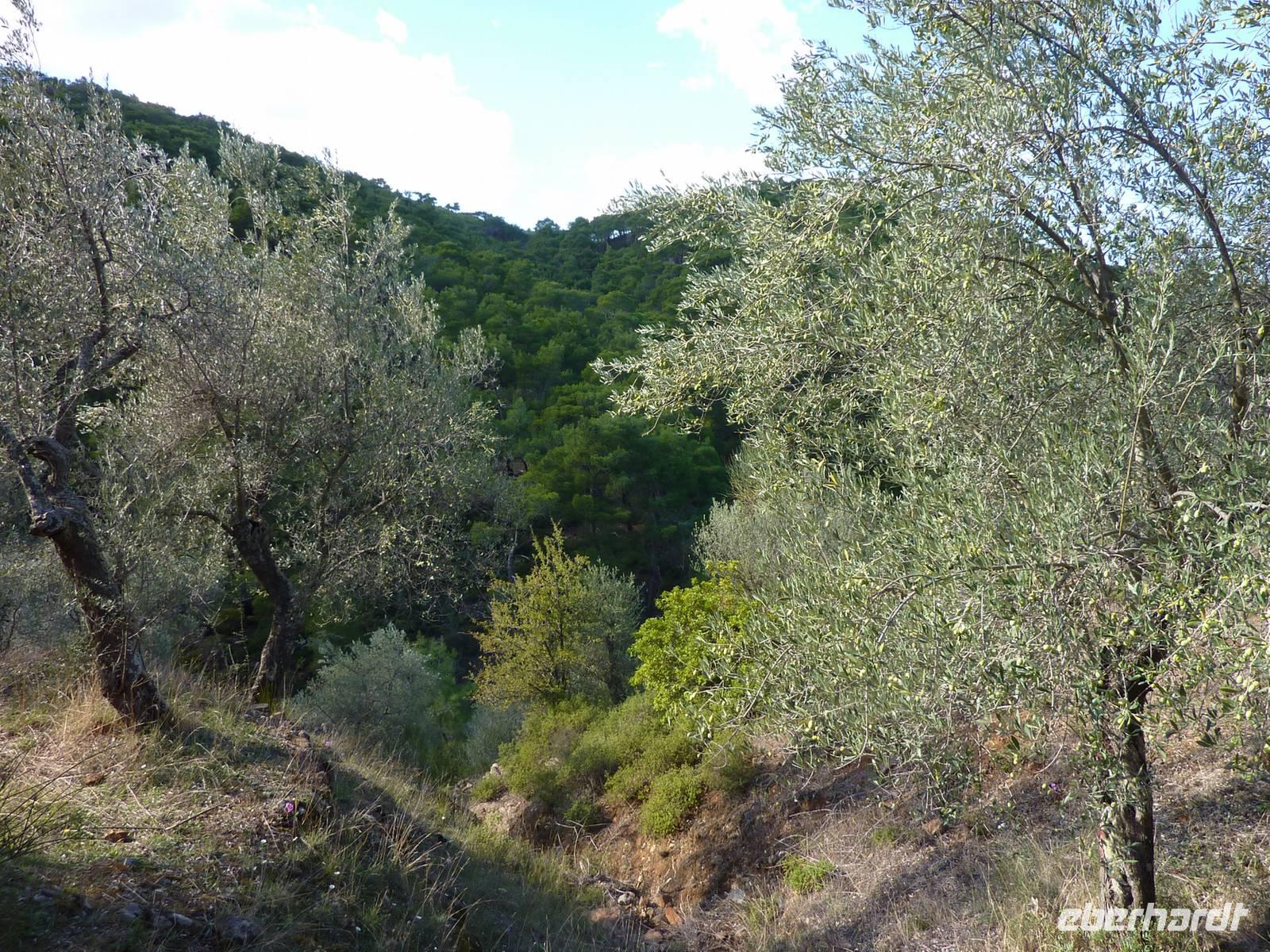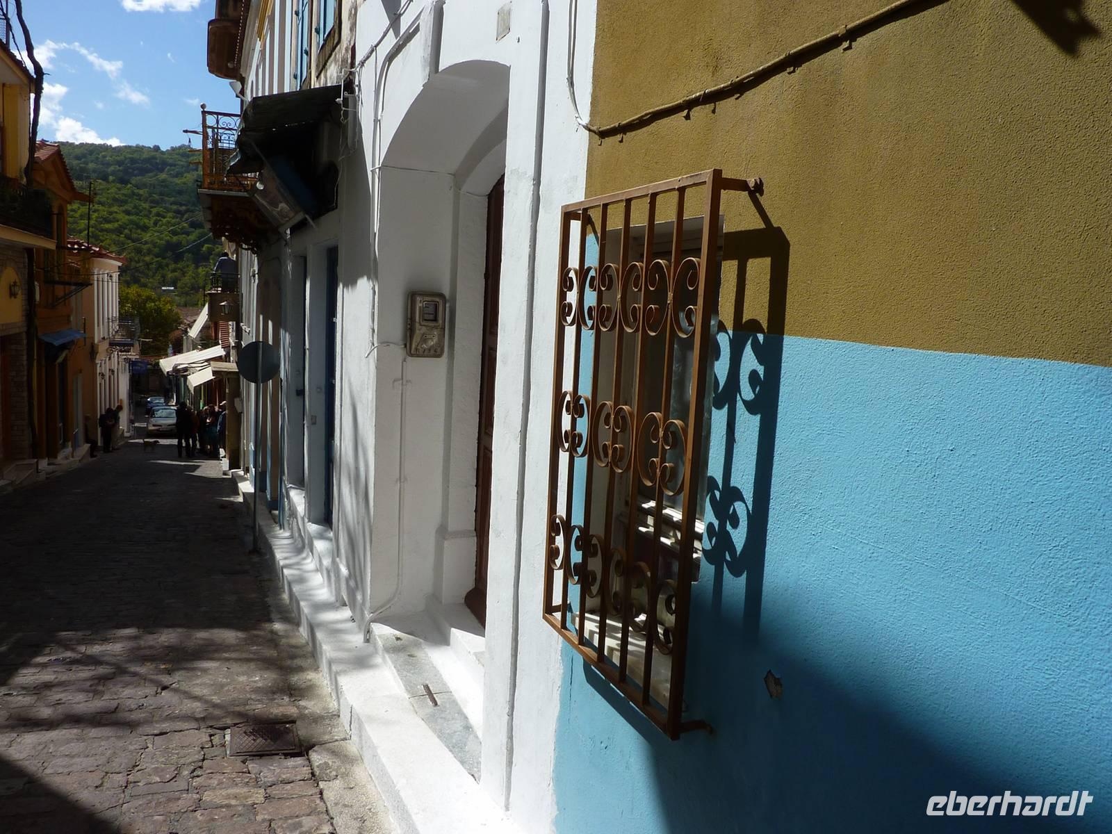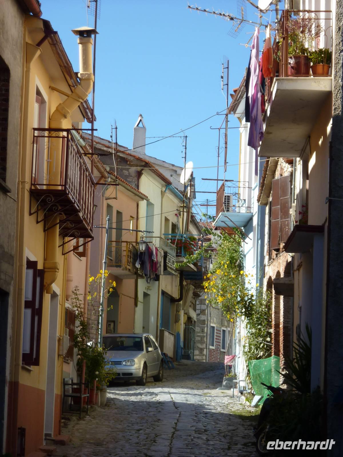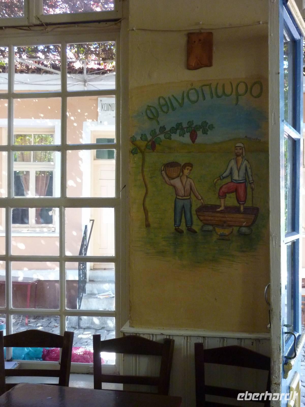 Ganz gemütlich gingen wir den Tag an, schließlich wollten unsere Gäste sich ja erholen. Um 08.30 Uhr gab es auf der Frühstücksterrasse (open-air) eine Stärkung mit Brot, Eier, Schafskäse, Schnittkäse, Wurst, Oliven, Tomaten, Gurke, frisch gepressten Orangensaft, Kaffee und/oder Tee. Eva und ich hatten uns am Morgen im Internet die Wetterkarte angesehen, naja nicht so grandios und die ganze Nacht hatte es reichlich geregnet. Wir besprachen uns und beschlossen, die geplante Wanderung den Witterungsbedingungen ein wenig anzupassen. Regensachen wurden in den Rucksack gepackt für den Fall der Fälle und so brachen wir um 10.00 Uhr zu unserer ersten Wanderung auf. Der Himmel war wolkenverhangen, aber es war angenehm warm und wir in Wanderlaune. Unser Bus brachte uns zunächst zu unserem Ausgangspunkt der Wanderung, einem netten Rastplatz. Hier konnten wir uns mit frischem Obst oder Trockenfrüchten als Wegzehrung eindecken. Ganz gemütlich, ganz siga, siga (langsam, langsam) wie Eva uns immer wieder in den nächsten Tagen auffordern würde, wanderten wir nun los. Das mit dem „siga, siga" mussten wir allerdings erst noch lernen, denn irgendwie waren wir von unserem Alltag noch ganz schön gehetzt. Unsere Sinne mussten sich erst noch öffnen und schärfen. Über alte Karrenwege, leicht bergan, vorbei an unzähligen Oliven-, Feigenbäumen, Platanen und Pinien erreichten wir schließlich das noch sehr traditionsreiche Bergstädtchen Agiasos auf immerhin 700 Metern über dem Meeresspiegel, das sich malerisch an die Hänge des Olymposgebirges schmiegt. Schmale, gepflasterte Gassen mit zahlreichen Cafenions und Tavernen zeichnen diesen Ort gleichermaßen aus, wie deren berühmte Keramikkunst. Wir besichtigen zunächst die Kirche, bevor wir bei einem griechischen Kaffee und den Leckereien aus der Bäckerei gegenüber eine Rast einlegen. Eva liest dazu aus dem Buch von Eva Demski, die darin Ihre Liebe zu dieser Insel beschreibt, z.B. die Form der Insel mit der eines Platanenblattes vergleicht und uns auffordert „mit den Füßen einer Bergziege und dem furchtlosen Herzen eines Wanderfalken" das Inselinnere zu erobern. Wir lauschen Eva dabei ganz gespannt zu, und ganz allmählich gelingt es uns, die Gelassenheit und Ruhe der Menschen dieser Insel auch in uns aufzunehmen. In unserer Freizeit lassen wir das Flair der Gassen auf uns wirken, mit den Häusern deren vorspringende Obergeschosse, bekannt als sachnisia, und hölzerne Balkone mit Blumentöpfen von Begonien, Nelken und Geranien uns verzaubern. Schließlich erwartet uns wieder unser Chauffeur und fährt uns sicher über die engen Bergstraßen zurück in unser Hotel. Das Abendessen lassen wir uns wiederum in der Taverne nahe unseres Hotels servieren. Moussaka wurde heute von Eva bestellt, ein ganz typisches Gericht, bei dem Lammhack und Auberginen geschichtet und mit Schafskäse überbacken wird. Einfach lecker.. Zum Verdauen abermals ein Ouzo hinterher, das hilft.