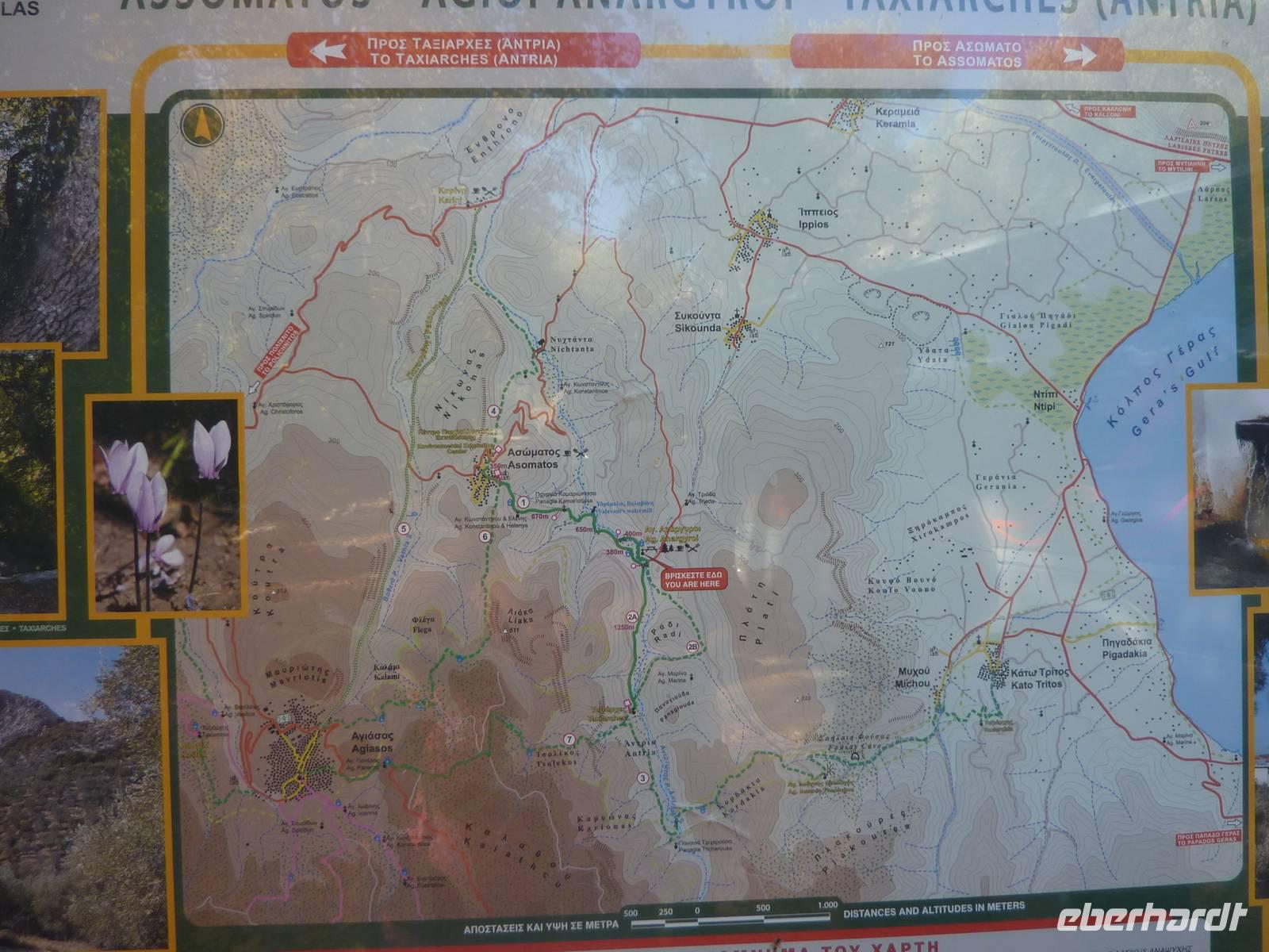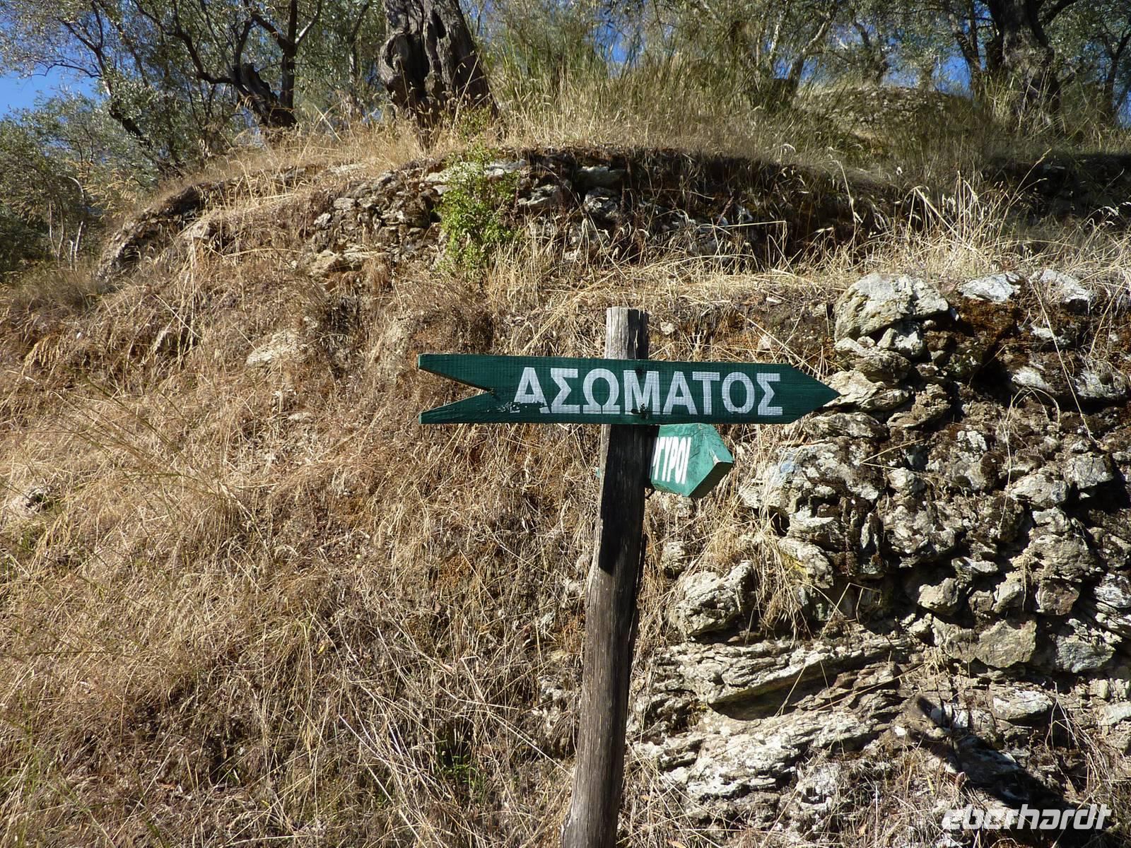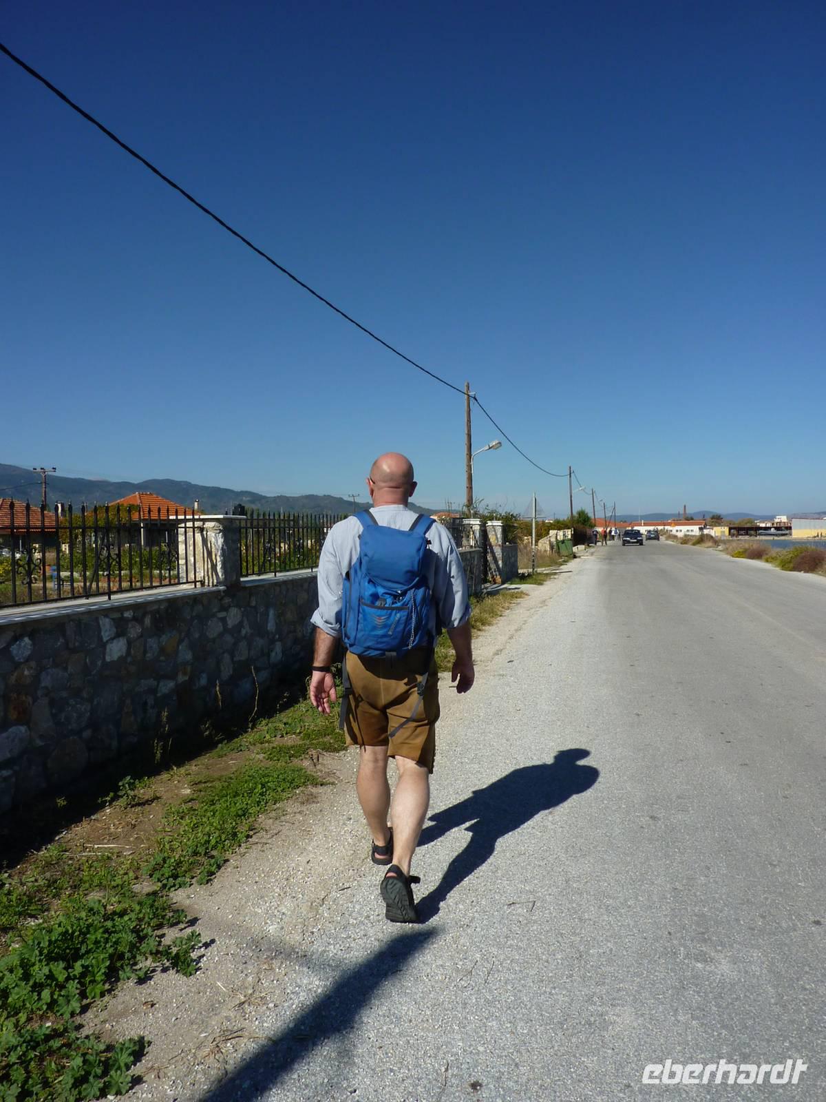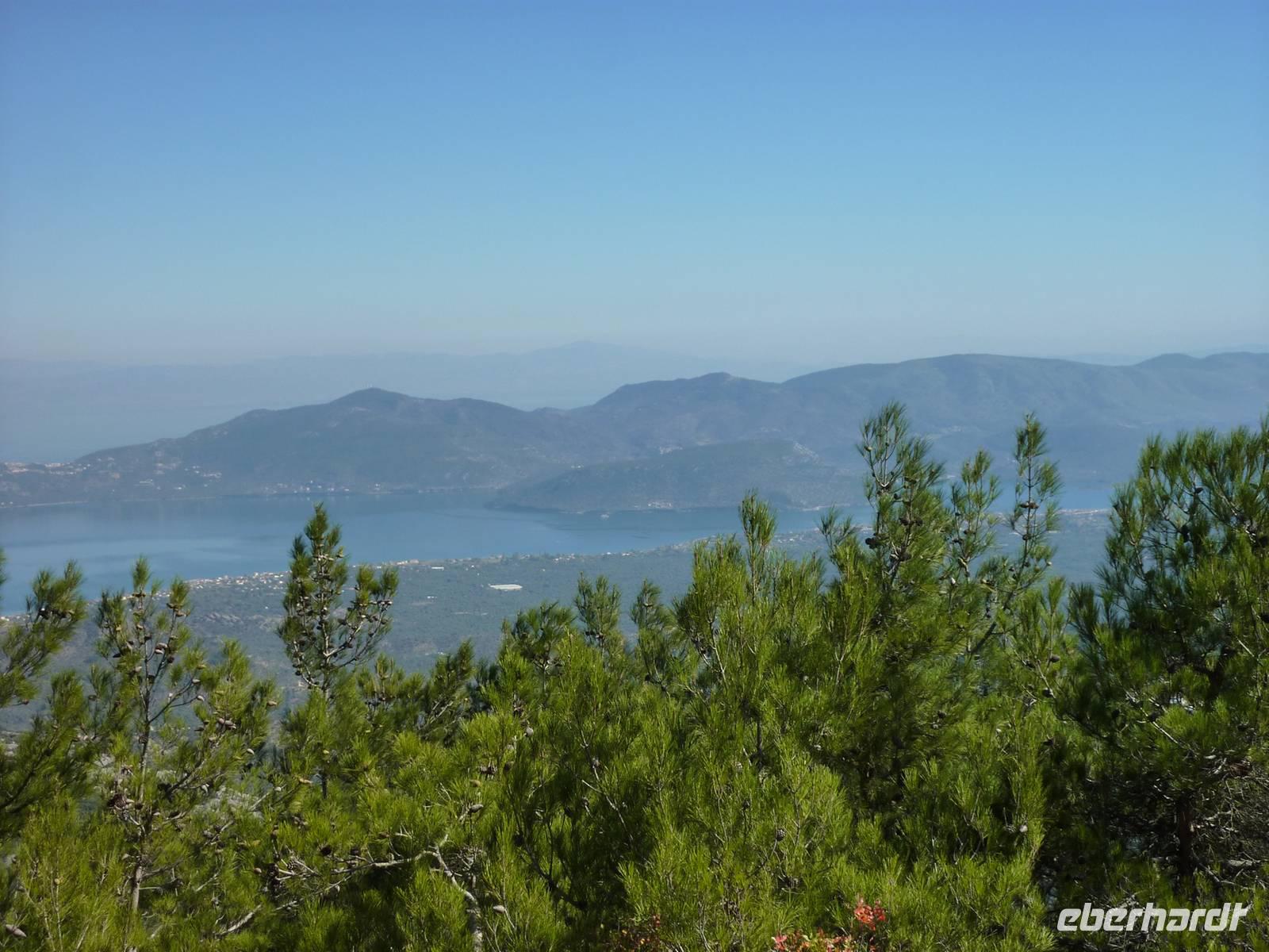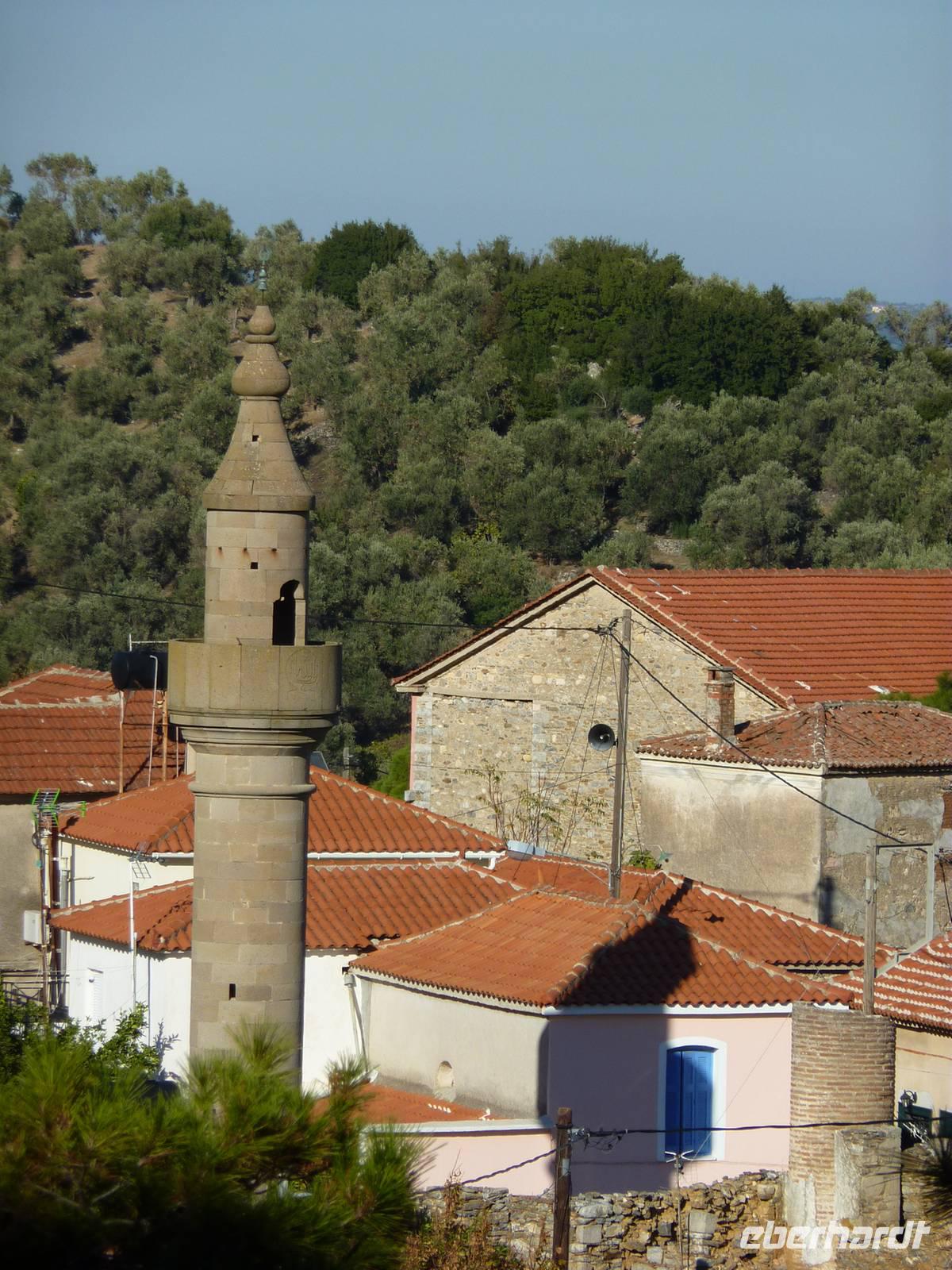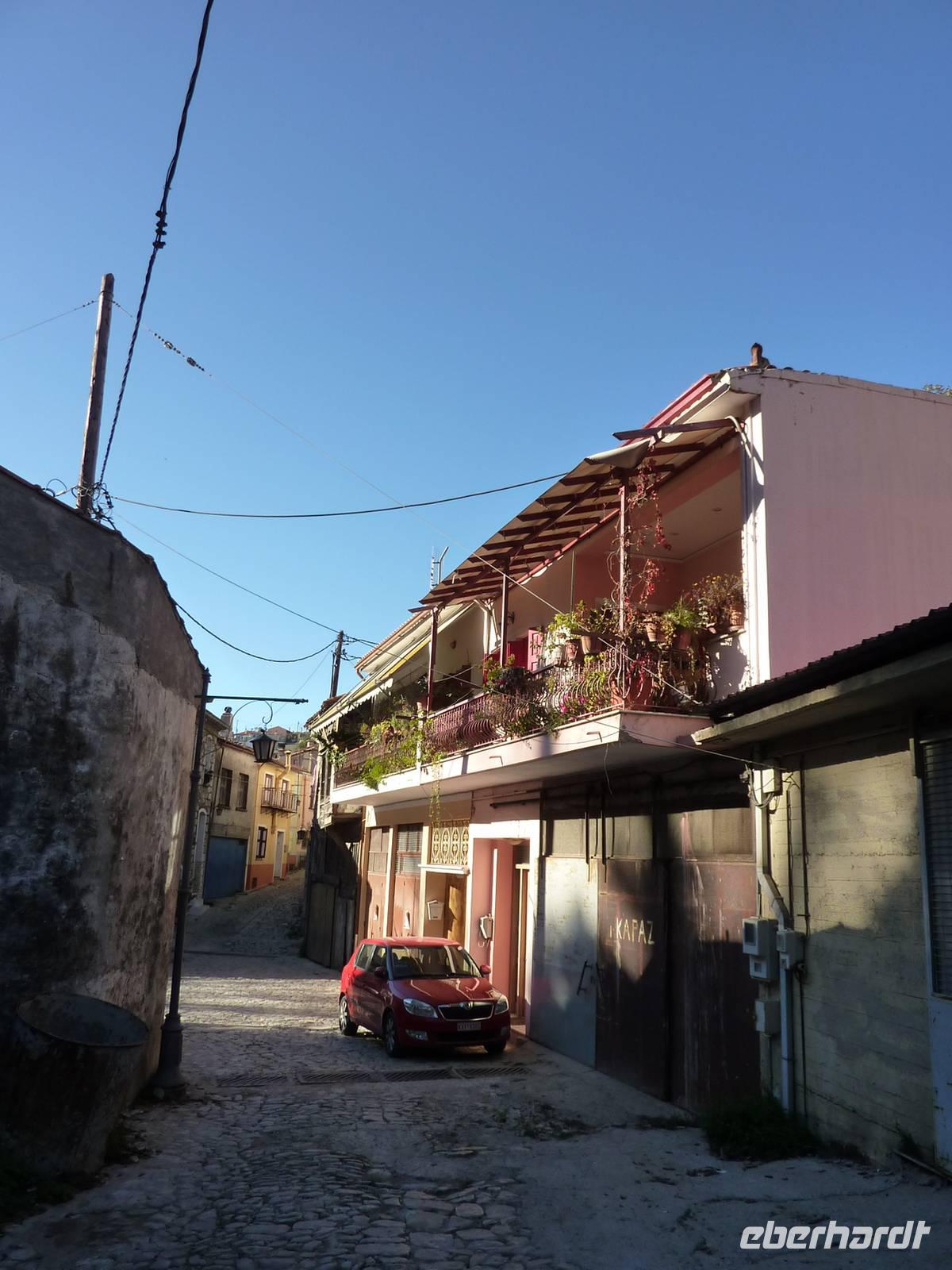 Ganz gemütlich gingen wir den Tag an, schließlich wollten unsere Gäste sich ja erholen. Um 08.30 Uhr gab es auf der Frühstücksterrasse (open-air) eine Stärkung mit Brot, Eier, Schafskäse, Schnittkäse, Wurst, Oliven, Tomaten, Gurke, frisch gepressten Orangensaft, Kaffee und/oder Tee. Eva und ich hatten uns am Morgen im Internet die Wetterkarte angesehen, naja nicht so grandios und die ganze Nacht hatte es reichlich geregnet. Wir besprachen uns und beschlossen, die geplante Wanderung den Witterungsbedingungen ein wenig anzupassen. Regensachen wurden in den Rucksack gepackt für den Fall der Fälle und so brachen wir um 10.00 Uhr zu unserer ersten Wanderung auf. Der Himmel war wolkenverhangen, aber es war angenehm warm und wir in Wanderlaune. Unser Bus brachte uns zunächst zu unserem Ausgangspunkt der Wanderung, einem netten Rastplatz. Hier konnten wir uns mit frischem Obst oder Trockenfrüchten als Wegzehrung eindecken. Ganz gemütlich, ganz siga, siga (langsam, langsam) wie Eva uns immer wieder in den nächsten Tagen auffordern würde, wanderten wir nun los. Das mit dem „siga, siga" mussten wir allerdings erst noch lernen, denn irgendwie waren wir von unserem Alltag noch ganz schön gehetzt. Unsere Sinne mussten sich erst noch öffnen und schärfen. Über alte Karrenwege, leicht bergan, vorbei an unzähligen Oliven-, Feigenbäumen, Platanen und Pinien erreichten wir schließlich das noch sehr traditionsreiche Bergstädtchen Agiasos auf immerhin 700 Metern über dem Meeresspiegel, das sich malerisch an die Hänge des Olymposgebirges schmiegt. Schmale, gepflasterte Gassen mit zahlreichen Cafenions und Tavernen zeichnen diesen Ort gleichermaßen aus, wie deren berühmte Keramikkunst. Wir besichtigen zunächst die Kirche, bevor wir bei einem griechischen Kaffee und den Leckereien aus der Bäckerei gegenüber eine Rast einlegen. Eva liest dazu aus dem Buch von Eva Demski, die darin Ihre Liebe zu dieser Insel beschreibt, z.B. die Form der Insel mit der eines Platanenblattes vergleicht und uns auffordert „mit den Füßen einer Bergziege und dem furchtlosen Herzen eines Wanderfalken" das Inselinnere zu erobern. Wir lauschen Eva dabei ganz gespannt zu, und ganz allmählich gelingt es uns, die Gelassenheit und Ruhe der Menschen dieser Insel auch in uns aufzunehmen. In unserer Freizeit lassen wir das Flair der Gassen auf uns wirken, mit den Häusern deren vorspringende Obergeschosse, bekannt als sachnisia, und hölzerne Balkone mit Blumentöpfen von Begonien, Nelken und Geranien uns verzaubern. Schließlich erwartet uns wieder unser Chauffeur und fährt uns sicher über die engen Bergstraßen zurück in unser Hotel. Das Abendessen lassen wir uns wiederum in der Taverne nahe unseres Hotels servieren. Moussaka wurde heute von Eva bestellt, ein ganz typisches Gericht, bei dem Lammhack und Auberginen geschichtet und mit Schafskäse überbacken wird. Einfach lecker.. Zum Verdauen abermals ein Ouzo hinterher, das hilft.