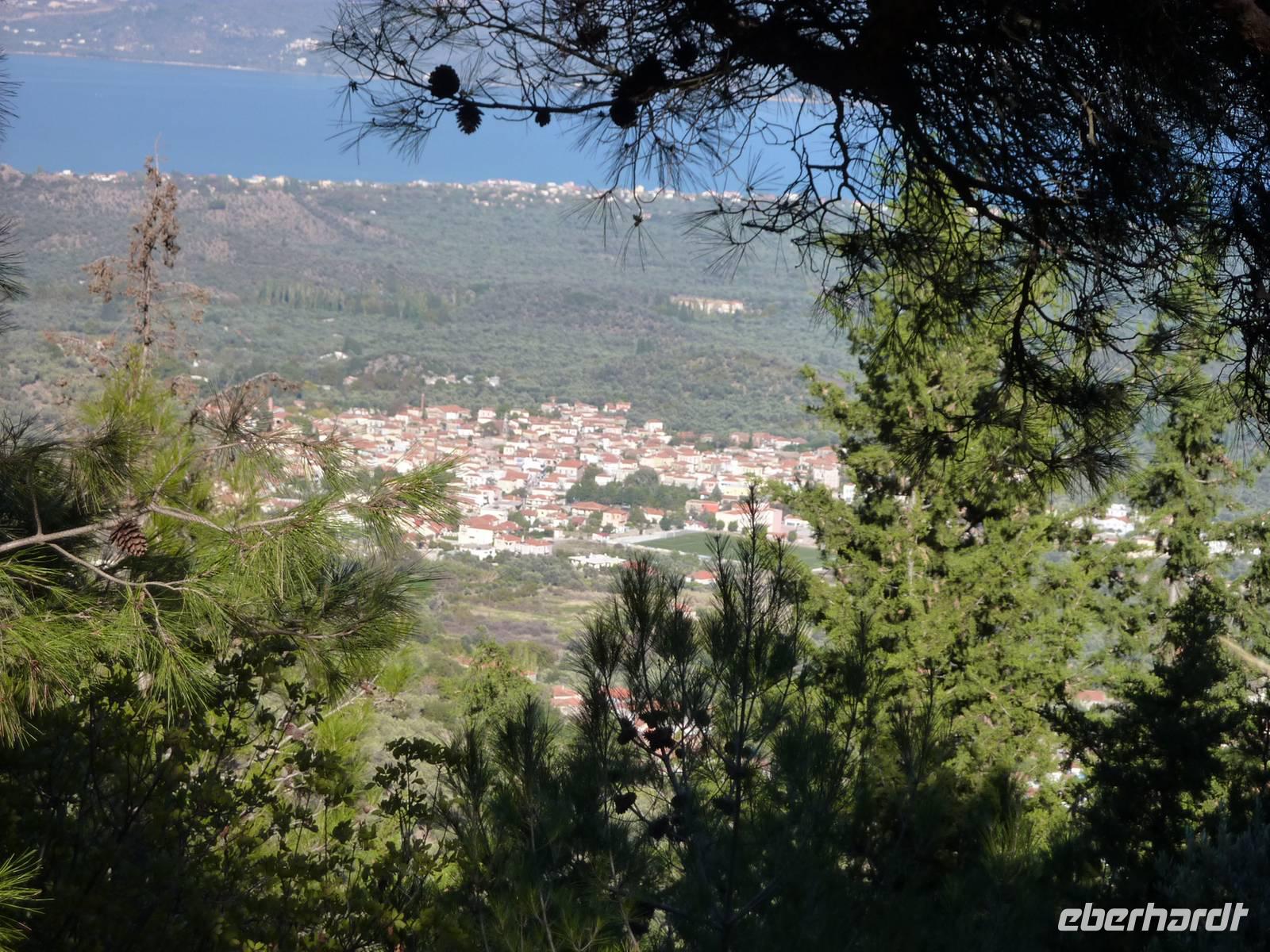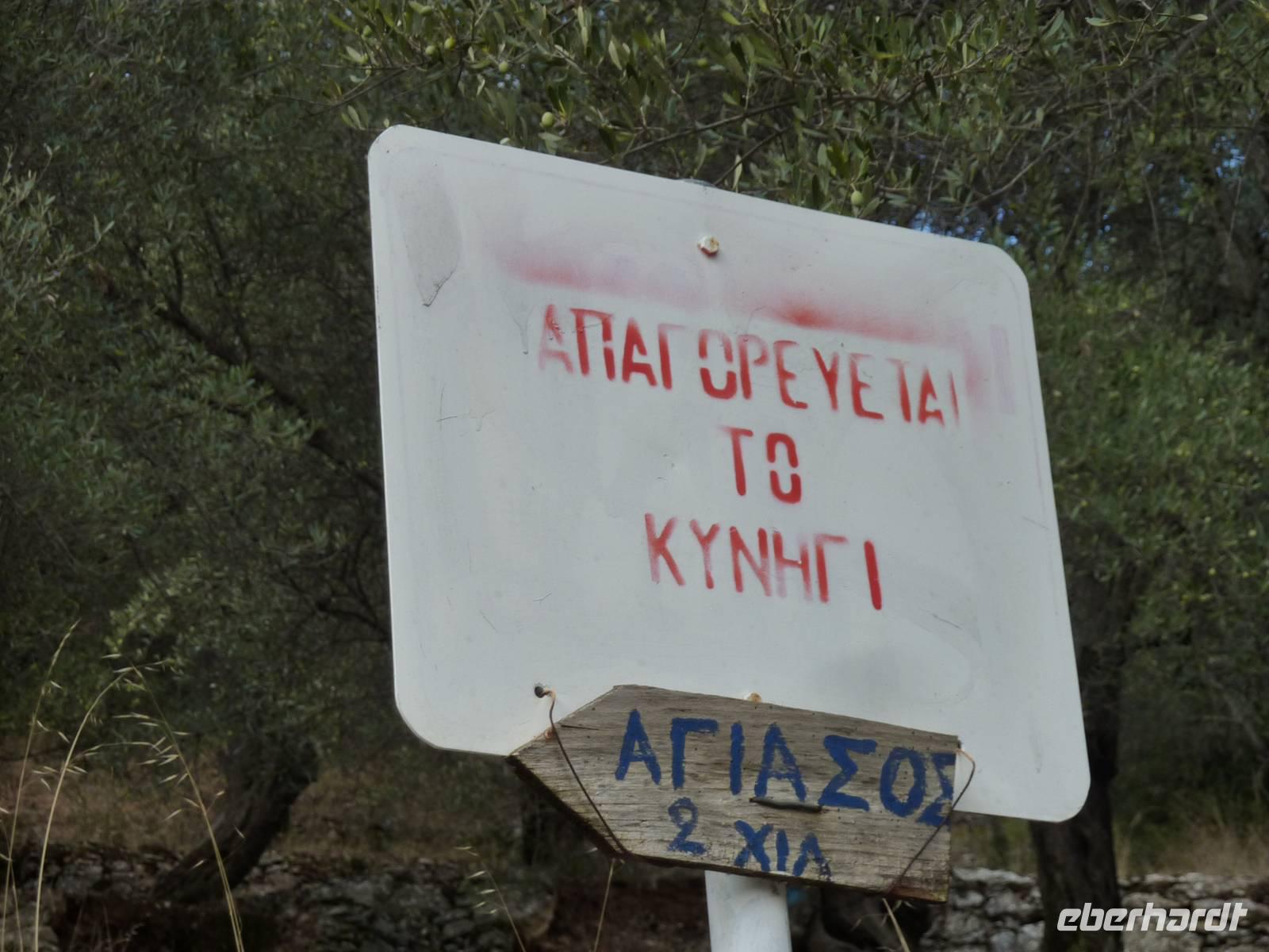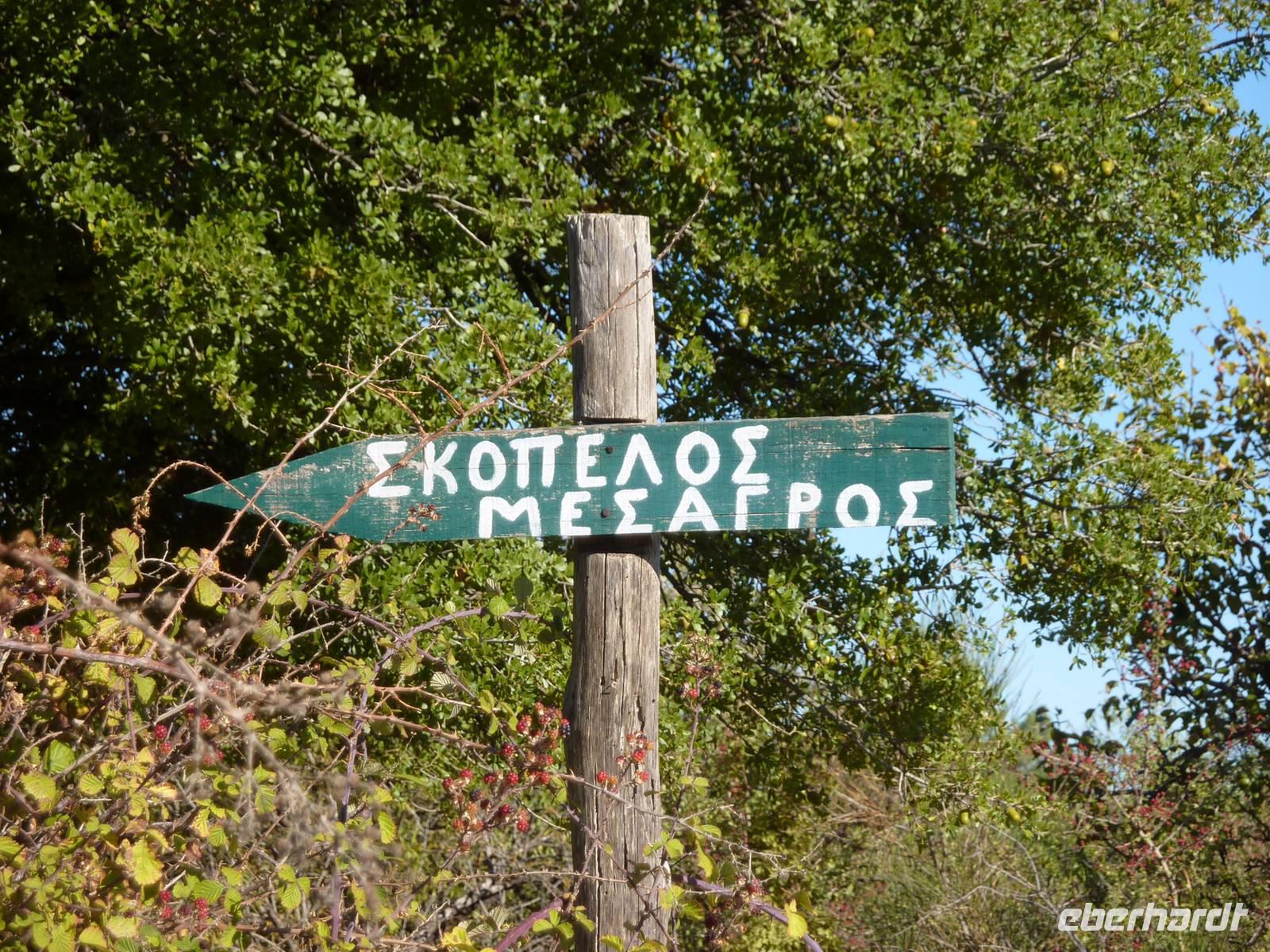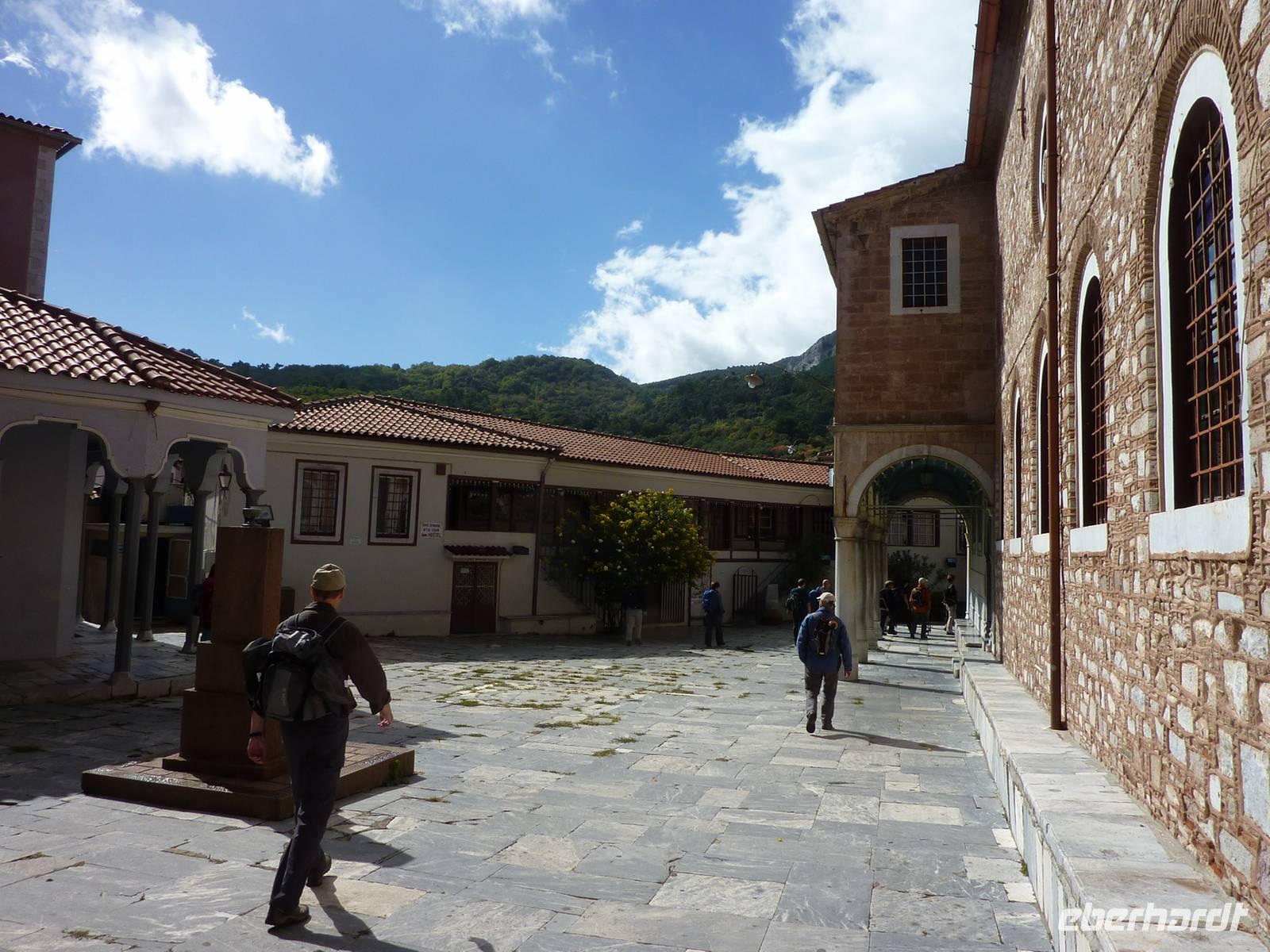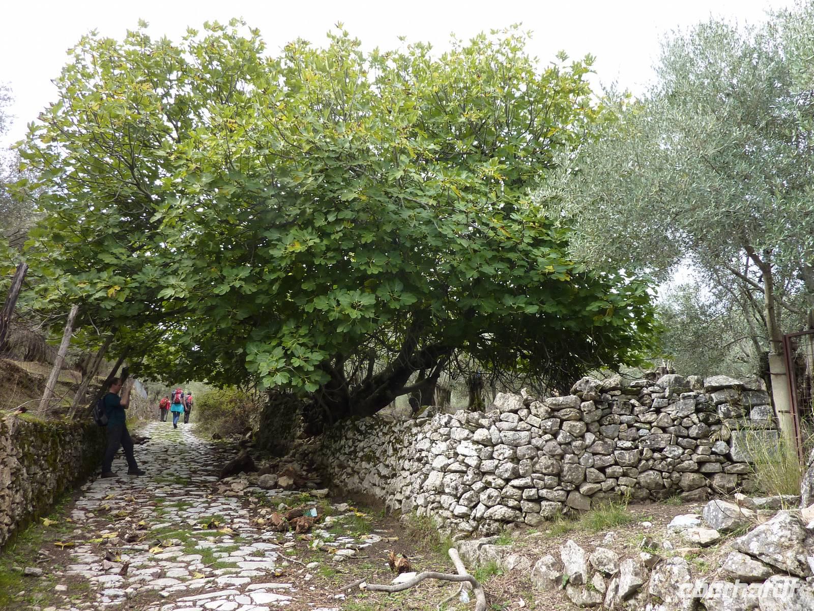 Ganz gemütlich gingen wir den Tag an, schließlich wollten unsere Gäste sich ja erholen. Um 08.30 Uhr gab es auf der Frühstücksterrasse (open-air) eine Stärkung mit Brot, Eier, Schafskäse, Schnittkäse, Wurst, Oliven, Tomaten, Gurke, frisch gepressten Orangensaft, Kaffee und/oder Tee. Eva und ich hatten uns am Morgen im Internet die Wetterkarte angesehen, naja nicht so grandios und die ganze Nacht hatte es reichlich geregnet. Wir besprachen uns und beschlossen, die geplante Wanderung den Witterungsbedingungen ein wenig anzupassen. Regensachen wurden in den Rucksack gepackt für den Fall der Fälle und so brachen wir um 10.00 Uhr zu unserer ersten Wanderung auf. Der Himmel war wolkenverhangen, aber es war angenehm warm und wir in Wanderlaune. Unser Bus brachte uns zunächst zu unserem Ausgangspunkt der Wanderung, einem netten Rastplatz. Hier konnten wir uns mit frischem Obst oder Trockenfrüchten als Wegzehrung eindecken. Ganz gemütlich, ganz siga, siga (langsam, langsam) wie Eva uns immer wieder in den nächsten Tagen auffordern würde, wanderten wir nun los. Das mit dem „siga, siga" mussten wir allerdings erst noch lernen, denn irgendwie waren wir von unserem Alltag noch ganz schön gehetzt. Unsere Sinne mussten sich erst noch öffnen und schärfen. Über alte Karrenwege, leicht bergan, vorbei an unzähligen Oliven-, Feigenbäumen, Platanen und Pinien erreichten wir schließlich das noch sehr traditionsreiche Bergstädtchen Agiasos auf immerhin 700 Metern über dem Meeresspiegel, das sich malerisch an die Hänge des Olymposgebirges schmiegt. Schmale, gepflasterte Gassen mit zahlreichen Cafenions und Tavernen zeichnen diesen Ort gleichermaßen aus, wie deren berühmte Keramikkunst. Wir besichtigen zunächst die Kirche, bevor wir bei einem griechischen Kaffee und den Leckereien aus der Bäckerei gegenüber eine Rast einlegen. Eva liest dazu aus dem Buch von Eva Demski, die darin Ihre Liebe zu dieser Insel beschreibt, z.B. die Form der Insel mit der eines Platanenblattes vergleicht und uns auffordert „mit den Füßen einer Bergziege und dem furchtlosen Herzen eines Wanderfalken" das Inselinnere zu erobern. Wir lauschen Eva dabei ganz gespannt zu, und ganz allmählich gelingt es uns, die Gelassenheit und Ruhe der Menschen dieser Insel auch in uns aufzunehmen. In unserer Freizeit lassen wir das Flair der Gassen auf uns wirken, mit den Häusern deren vorspringende Obergeschosse, bekannt als sachnisia, und hölzerne Balkone mit Blumentöpfen von Begonien, Nelken und Geranien uns verzaubern. Schließlich erwartet uns wieder unser Chauffeur und fährt uns sicher über die engen Bergstraßen zurück in unser Hotel. Das Abendessen lassen wir uns wiederum in der Taverne nahe unseres Hotels servieren. Moussaka wurde heute von Eva bestellt, ein ganz typisches Gericht, bei dem Lammhack und Auberginen geschichtet und mit Schafskäse überbacken wird. Einfach lecker.. Zum Verdauen abermals ein Ouzo hinterher, das hilft.
