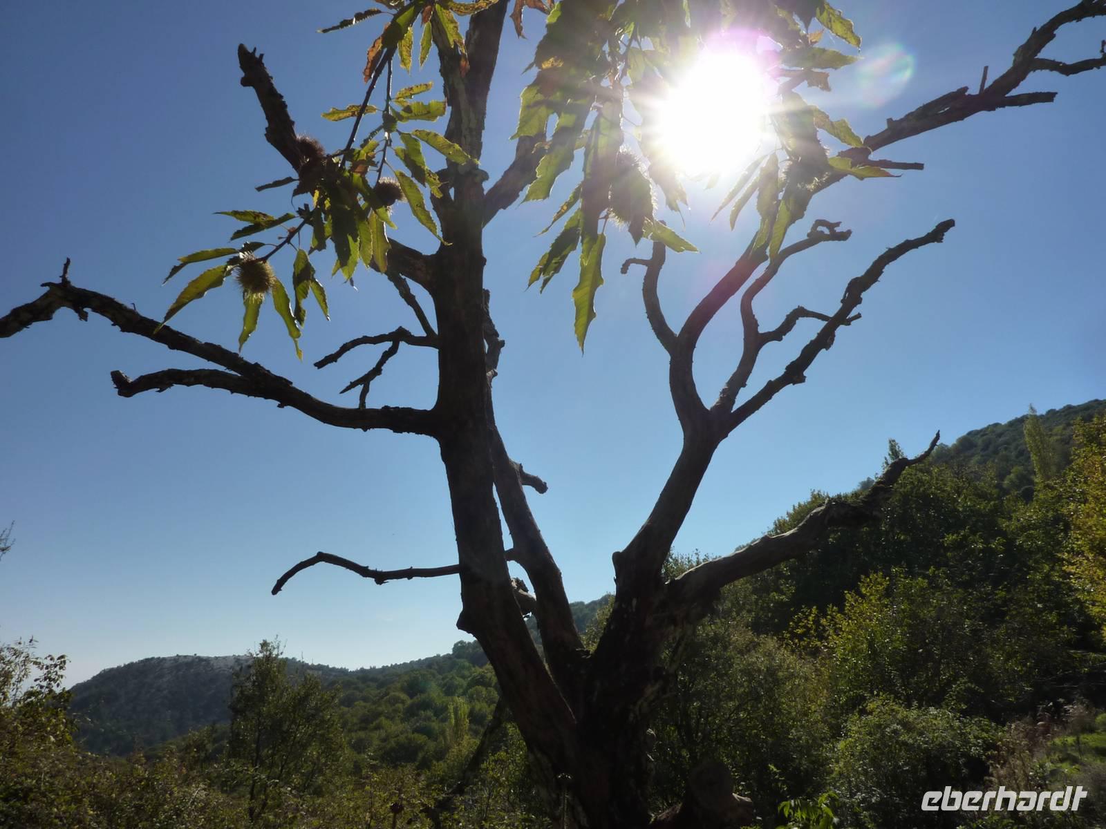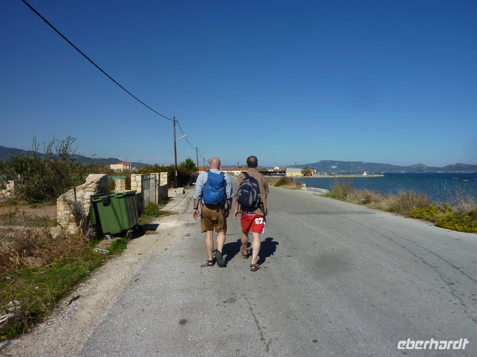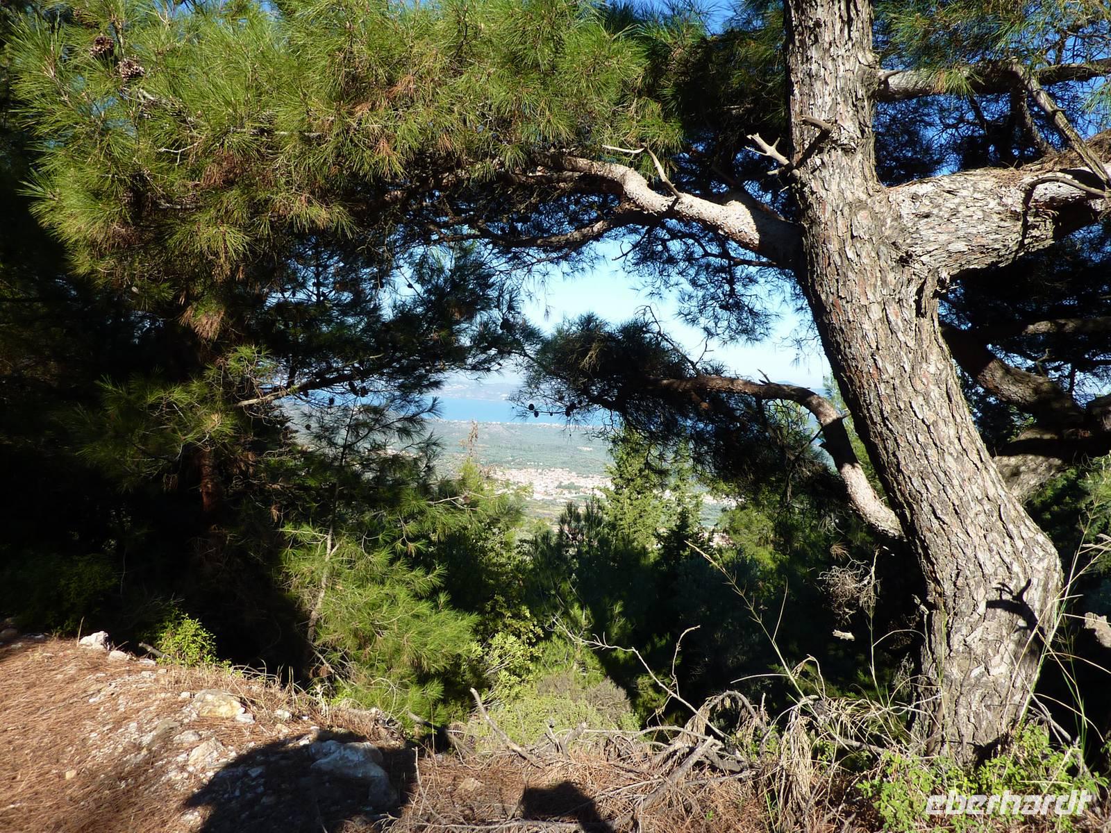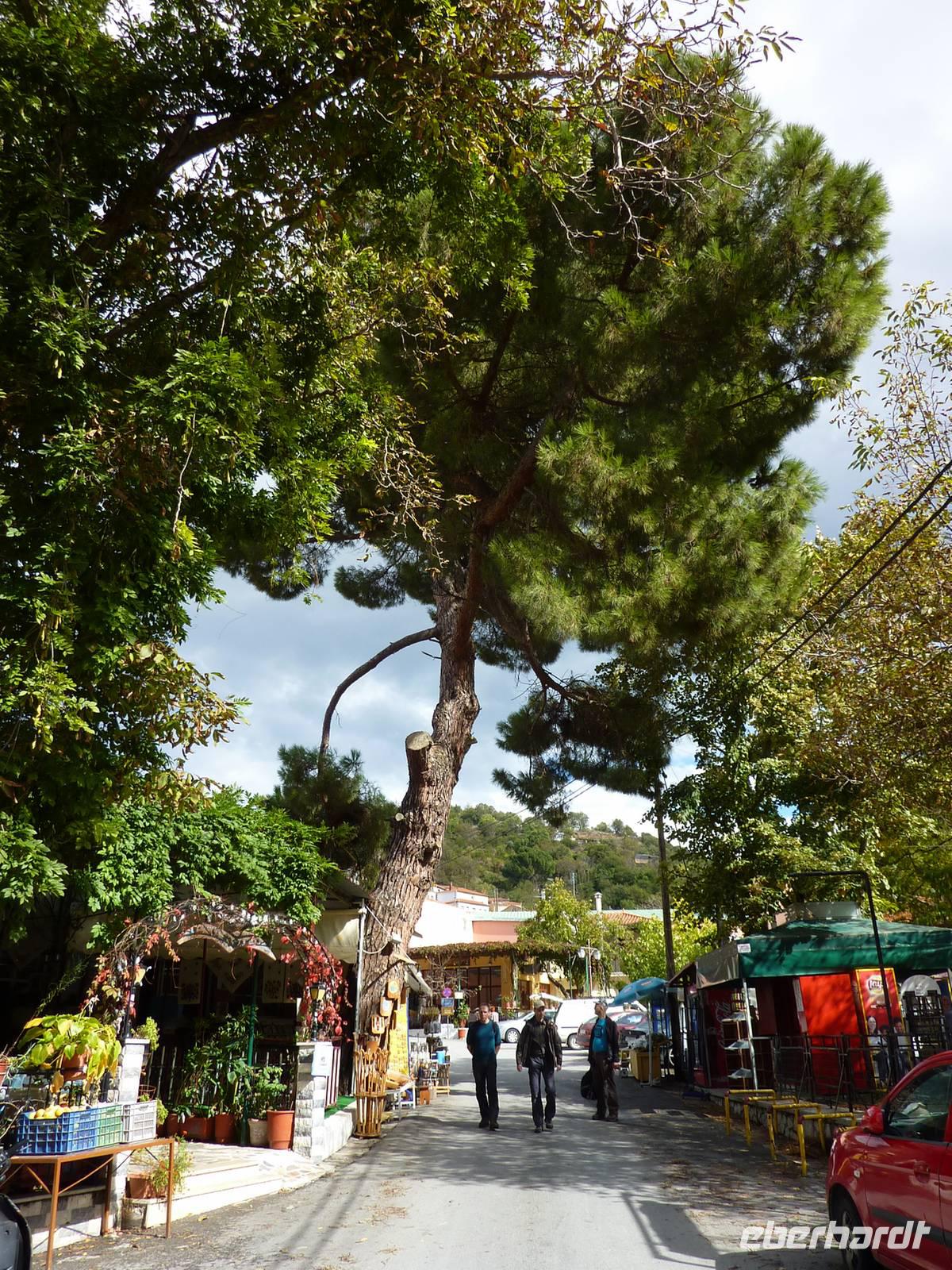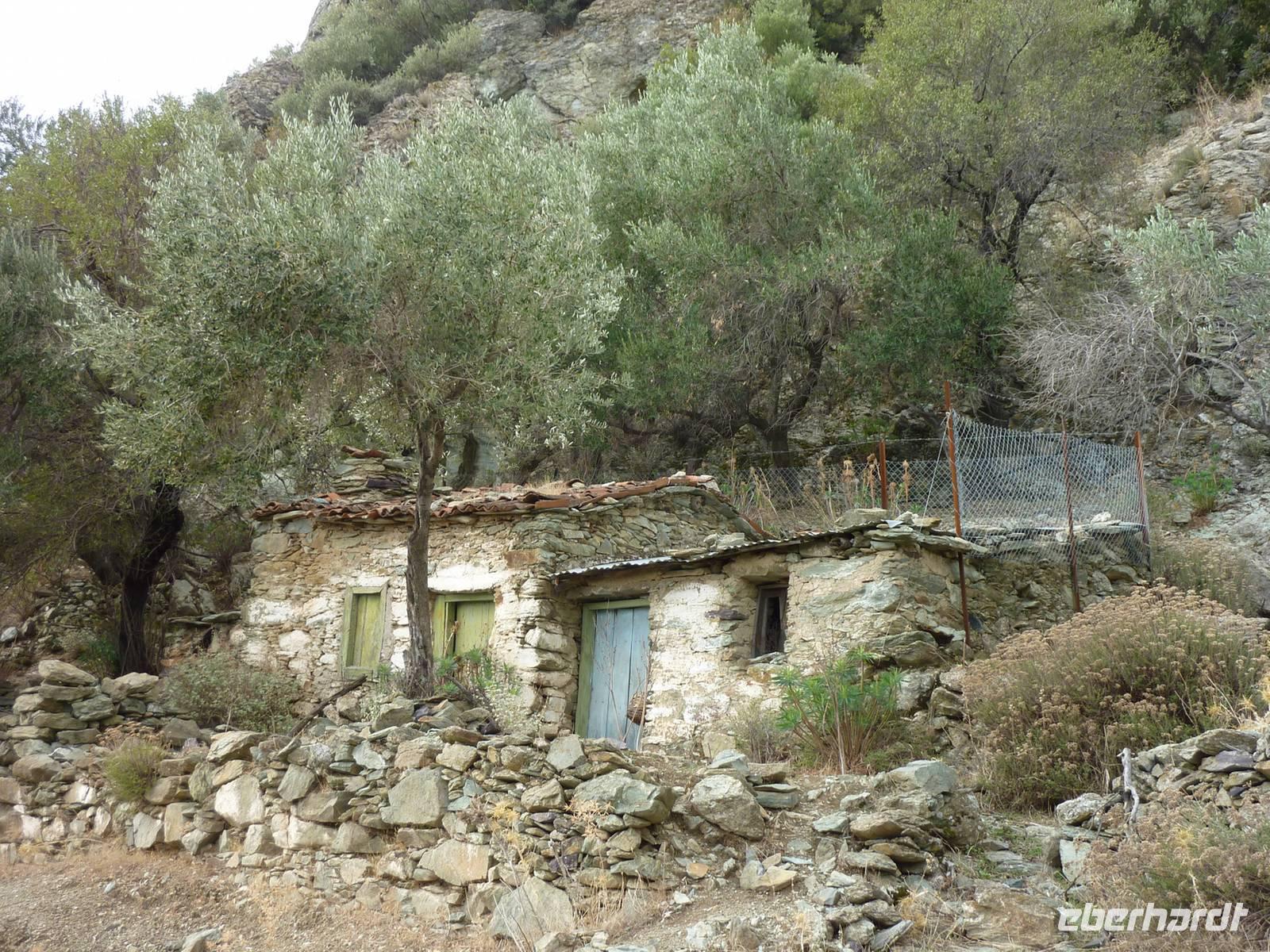Ganz gemütlich gingen wir den Tag an, schließlich wollten unsere Gäste sich ja erholen. Um 08.30 Uhr gab es auf der Frühstücksterrasse (open-air) eine Stärkung mit Brot, Eier, Schafskäse, Schnittkäse, Wurst, Oliven, Tomaten, Gurke, frisch gepressten Orangensaft, Kaffee und/oder Tee. Eva und ich hatten uns am Morgen im Internet die Wetterkarte angesehen, naja nicht so grandios und die ganze Nacht hatte es reichlich geregnet. Wir besprachen uns und beschlossen, die geplante Wanderung den Witterungsbedingungen ein wenig anzupassen. Regensachen wurden in den Rucksack gepackt für den Fall der Fälle und so brachen wir um 10.00 Uhr zu unserer ersten Wanderung auf. Der Himmel war wolkenverhangen, aber es war angenehm warm und wir in Wanderlaune. Unser Bus brachte uns zunächst zu unserem Ausgangspunkt der Wanderung, einem netten Rastplatz. Hier konnten wir uns mit frischem Obst oder Trockenfrüchten als Wegzehrung eindecken. Ganz gemütlich, ganz siga, siga (langsam, langsam) wie Eva uns immer wieder in den nächsten Tagen auffordern würde, wanderten wir nun los. Das mit dem „siga, siga" mussten wir allerdings erst noch lernen, denn irgendwie waren wir von unserem Alltag noch ganz schön gehetzt. Unsere Sinne mussten sich erst noch öffnen und schärfen. Über alte Karrenwege, leicht bergan, vorbei an unzähligen Oliven-, Feigenbäumen, Platanen und Pinien erreichten wir schließlich das noch sehr traditionsreiche Bergstädtchen Agiasos auf immerhin 700 Metern über dem Meeresspiegel, das sich malerisch an die Hänge des Olymposgebirges schmiegt. Schmale, gepflasterte Gassen mit zahlreichen Cafenions und Tavernen zeichnen diesen Ort gleichermaßen aus, wie deren berühmte Keramikkunst. Wir besichtigen zunächst die Kirche, bevor wir bei einem griechischen Kaffee und den Leckereien aus der Bäckerei gegenüber eine Rast einlegen. Eva liest dazu aus dem Buch von Eva Demski, die darin Ihre Liebe zu dieser Insel beschreibt, z.B. die Form der Insel mit der eines Platanenblattes vergleicht und uns auffordert „mit den Füßen einer Bergziege und dem furchtlosen Herzen eines Wanderfalken" das Inselinnere zu erobern. Wir lauschen Eva dabei ganz gespannt zu, und ganz allmählich gelingt es uns, die Gelassenheit und Ruhe der Menschen dieser Insel auch in uns aufzunehmen. In unserer Freizeit lassen wir das Flair der Gassen auf uns wirken, mit den Häusern deren vorspringende Obergeschosse, bekannt als sachnisia, und hölzerne Balkone mit Blumentöpfen von Begonien, Nelken und Geranien uns verzaubern. Schließlich erwartet uns wieder unser Chauffeur und fährt uns sicher über die engen Bergstraßen zurück in unser Hotel. Das Abendessen lassen wir uns wiederum in der Taverne nahe unseres Hotels servieren. Moussaka wurde heute von Eva bestellt, ein ganz typisches Gericht, bei dem Lammhack und Auberginen geschichtet und mit Schafskäse überbacken wird. Einfach lecker.. Zum Verdauen abermals ein Ouzo hinterher, das hilft.