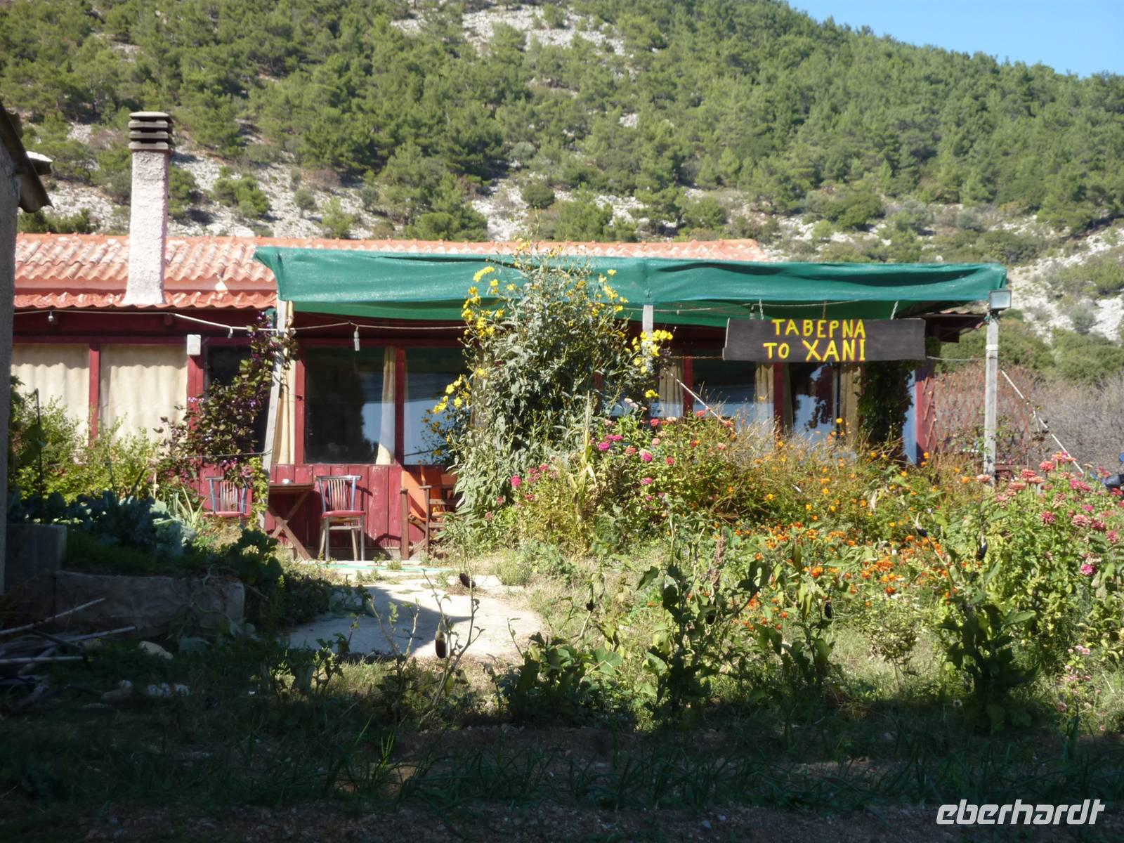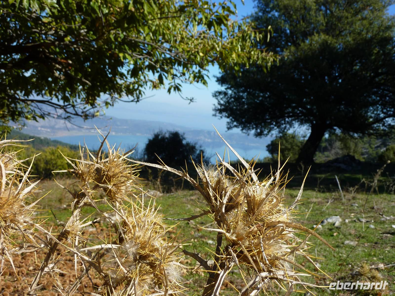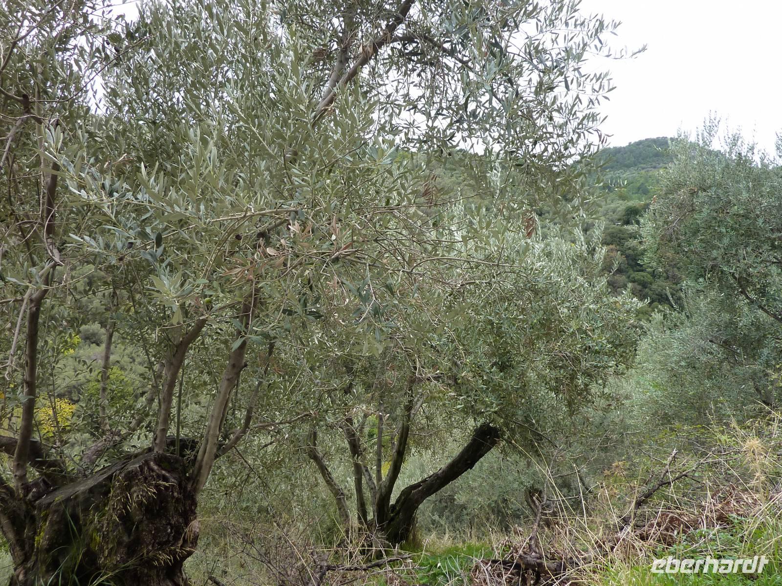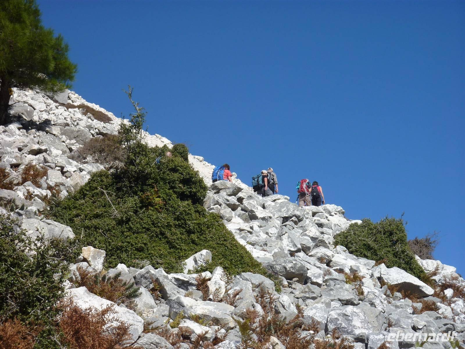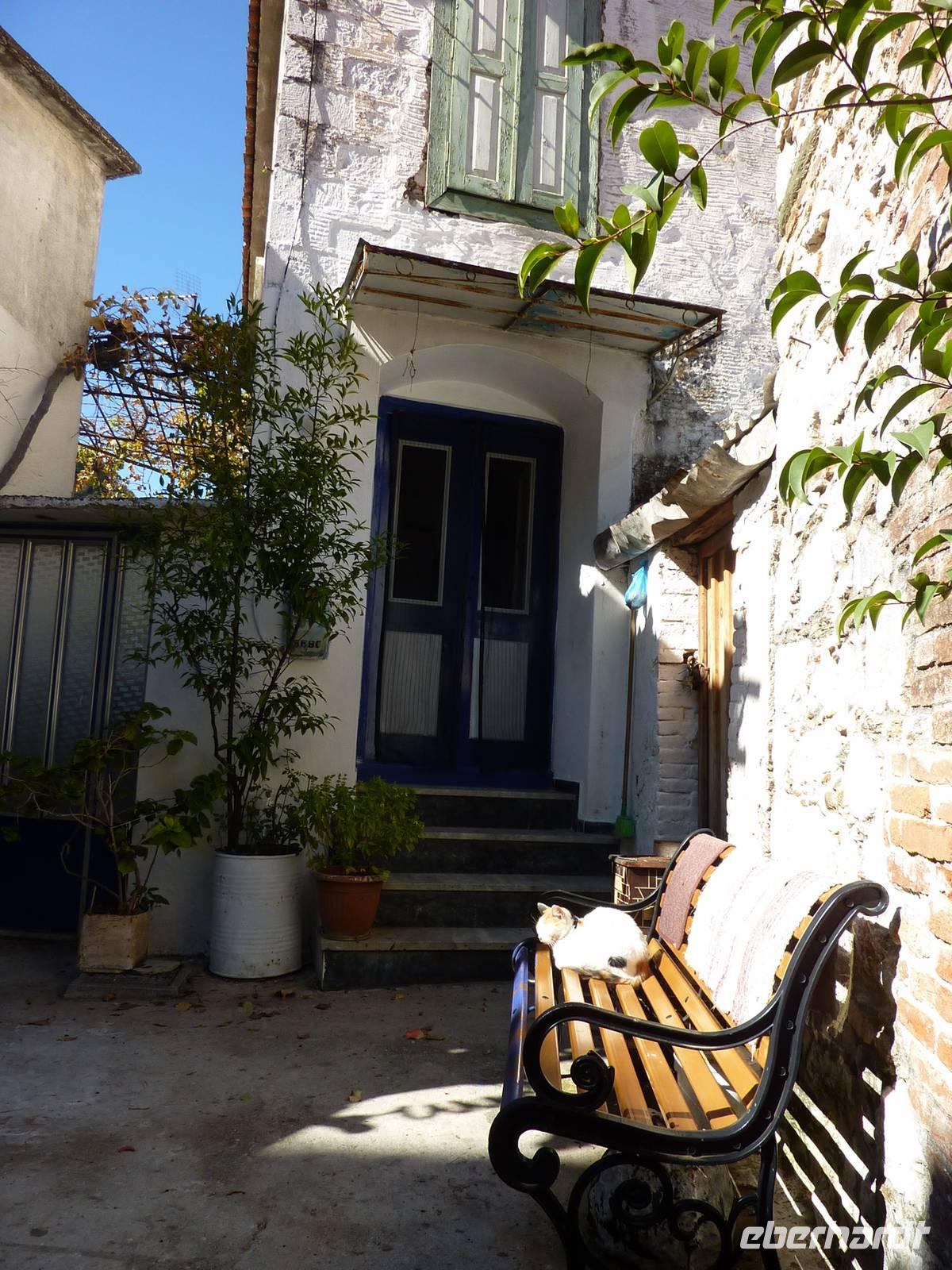 Ganz gemütlich gingen wir den Tag an, schließlich wollten unsere Gäste sich ja erholen. Um 08.30 Uhr gab es auf der Frühstücksterrasse (open-air) eine Stärkung mit Brot, Eier, Schafskäse, Schnittkäse, Wurst, Oliven, Tomaten, Gurke, frisch gepressten Orangensaft, Kaffee und/oder Tee. Eva und ich hatten uns am Morgen im Internet die Wetterkarte angesehen, naja nicht so grandios und die ganze Nacht hatte es reichlich geregnet. Wir besprachen uns und beschlossen, die geplante Wanderung den Witterungsbedingungen ein wenig anzupassen. Regensachen wurden in den Rucksack gepackt für den Fall der Fälle und so brachen wir um 10.00 Uhr zu unserer ersten Wanderung auf. Der Himmel war wolkenverhangen, aber es war angenehm warm und wir in Wanderlaune. Unser Bus brachte uns zunächst zu unserem Ausgangspunkt der Wanderung, einem netten Rastplatz. Hier konnten wir uns mit frischem Obst oder Trockenfrüchten als Wegzehrung eindecken. Ganz gemütlich, ganz siga, siga (langsam, langsam) wie Eva uns immer wieder in den nächsten Tagen auffordern würde, wanderten wir nun los. Das mit dem „siga, siga" mussten wir allerdings erst noch lernen, denn irgendwie waren wir von unserem Alltag noch ganz schön gehetzt. Unsere Sinne mussten sich erst noch öffnen und schärfen. Über alte Karrenwege, leicht bergan, vorbei an unzähligen Oliven-, Feigenbäumen, Platanen und Pinien erreichten wir schließlich das noch sehr traditionsreiche Bergstädtchen Agiasos auf immerhin 700 Metern über dem Meeresspiegel, das sich malerisch an die Hänge des Olymposgebirges schmiegt. Schmale, gepflasterte Gassen mit zahlreichen Cafenions und Tavernen zeichnen diesen Ort gleichermaßen aus, wie deren berühmte Keramikkunst. Wir besichtigen zunächst die Kirche, bevor wir bei einem griechischen Kaffee und den Leckereien aus der Bäckerei gegenüber eine Rast einlegen. Eva liest dazu aus dem Buch von Eva Demski, die darin Ihre Liebe zu dieser Insel beschreibt, z.B. die Form der Insel mit der eines Platanenblattes vergleicht und uns auffordert „mit den Füßen einer Bergziege und dem furchtlosen Herzen eines Wanderfalken" das Inselinnere zu erobern. Wir lauschen Eva dabei ganz gespannt zu, und ganz allmählich gelingt es uns, die Gelassenheit und Ruhe der Menschen dieser Insel auch in uns aufzunehmen. In unserer Freizeit lassen wir das Flair der Gassen auf uns wirken, mit den Häusern deren vorspringende Obergeschosse, bekannt als sachnisia, und hölzerne Balkone mit Blumentöpfen von Begonien, Nelken und Geranien uns verzaubern. Schließlich erwartet uns wieder unser Chauffeur und fährt uns sicher über die engen Bergstraßen zurück in unser Hotel. Das Abendessen lassen wir uns wiederum in der Taverne nahe unseres Hotels servieren. Moussaka wurde heute von Eva bestellt, ein ganz typisches Gericht, bei dem Lammhack und Auberginen geschichtet und mit Schafskäse überbacken wird. Einfach lecker.. Zum Verdauen abermals ein Ouzo hinterher, das hilft.