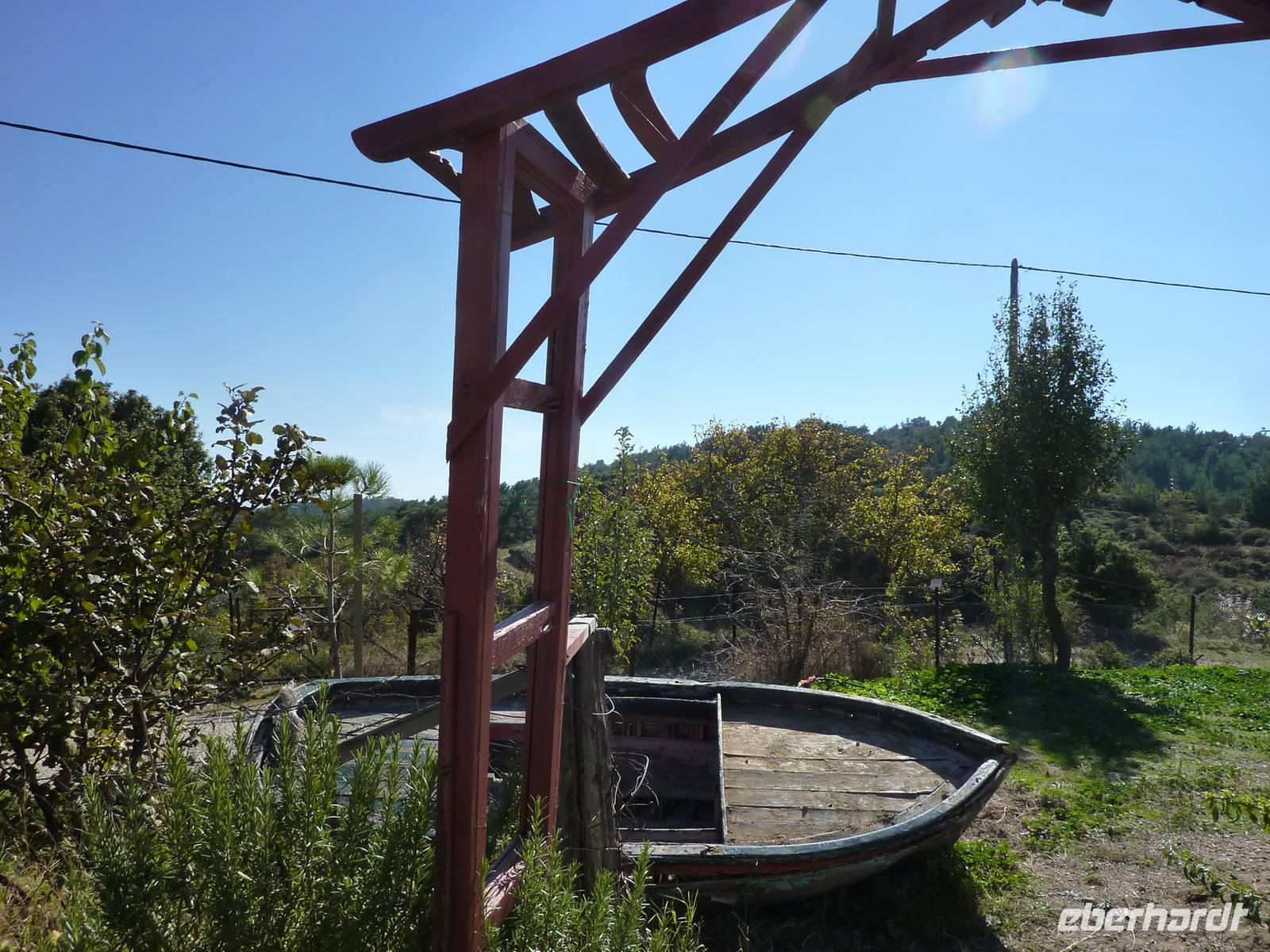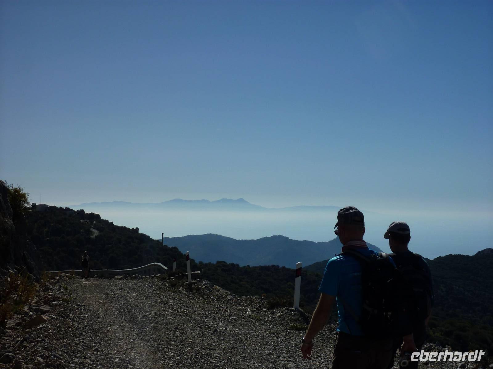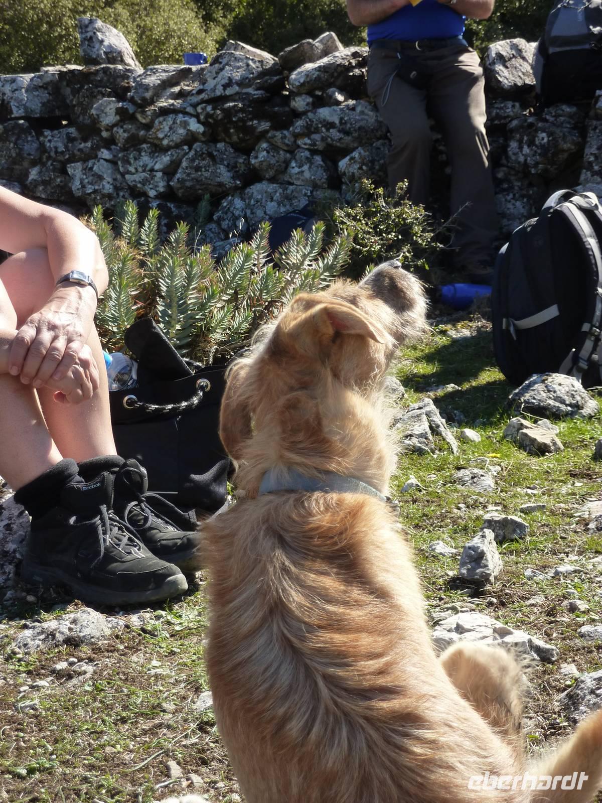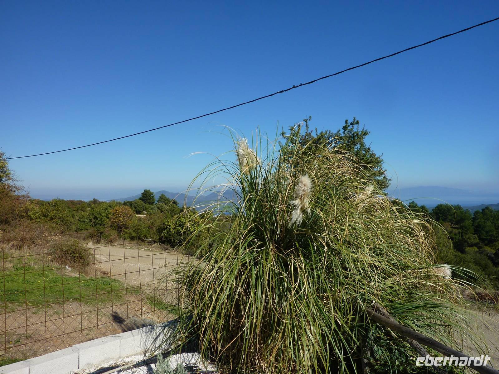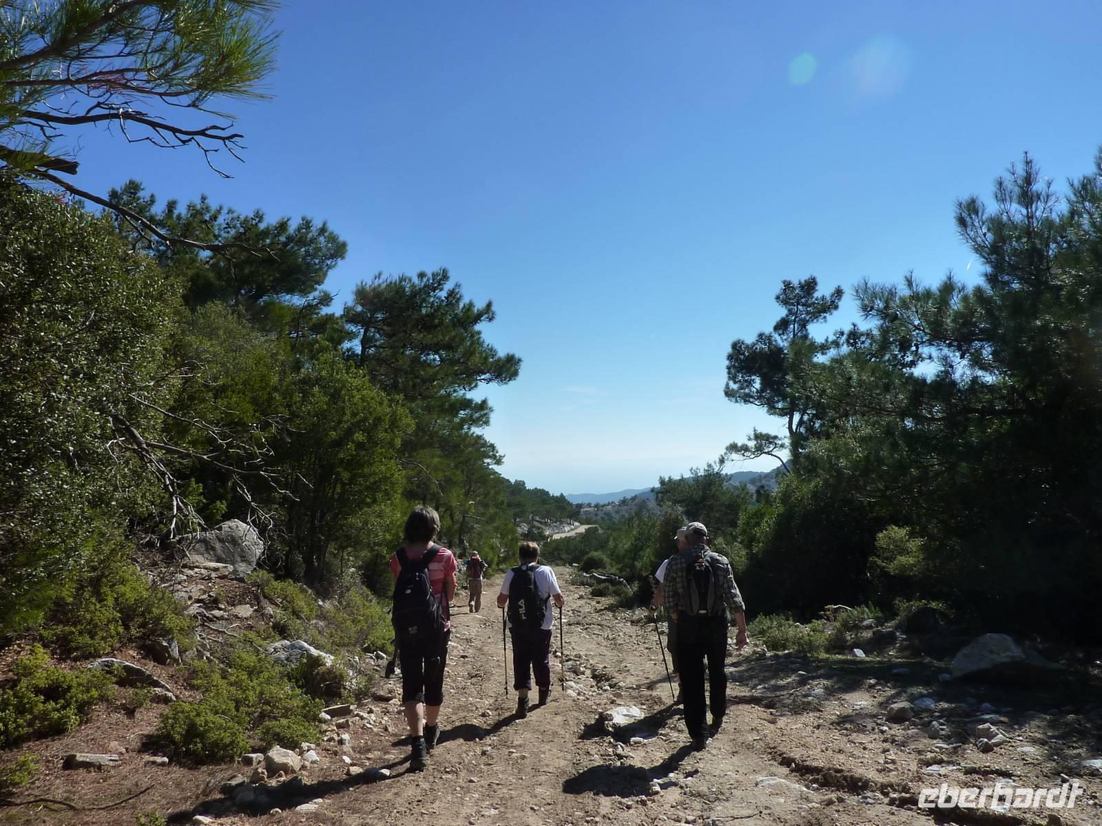 Ganz gemütlich gingen wir den Tag an, schließlich wollten unsere Gäste sich ja erholen. Um 08.30 Uhr gab es auf der Frühstücksterrasse (open-air) eine Stärkung mit Brot, Eier, Schafskäse, Schnittkäse, Wurst, Oliven, Tomaten, Gurke, frisch gepressten Orangensaft, Kaffee und/oder Tee. Eva und ich hatten uns am Morgen im Internet die Wetterkarte angesehen, naja nicht so grandios und die ganze Nacht hatte es reichlich geregnet. Wir besprachen uns und beschlossen, die geplante Wanderung den Witterungsbedingungen ein wenig anzupassen. Regensachen wurden in den Rucksack gepackt für den Fall der Fälle und so brachen wir um 10.00 Uhr zu unserer ersten Wanderung auf. Der Himmel war wolkenverhangen, aber es war angenehm warm und wir in Wanderlaune. Unser Bus brachte uns zunächst zu unserem Ausgangspunkt der Wanderung, einem netten Rastplatz. Hier konnten wir uns mit frischem Obst oder Trockenfrüchten als Wegzehrung eindecken. Ganz gemütlich, ganz siga, siga (langsam, langsam) wie Eva uns immer wieder in den nächsten Tagen auffordern würde, wanderten wir nun los. Das mit dem „siga, siga" mussten wir allerdings erst noch lernen, denn irgendwie waren wir von unserem Alltag noch ganz schön gehetzt. Unsere Sinne mussten sich erst noch öffnen und schärfen. Über alte Karrenwege, leicht bergan, vorbei an unzähligen Oliven-, Feigenbäumen, Platanen und Pinien erreichten wir schließlich das noch sehr traditionsreiche Bergstädtchen Agiasos auf immerhin 700 Metern über dem Meeresspiegel, das sich malerisch an die Hänge des Olymposgebirges schmiegt. Schmale, gepflasterte Gassen mit zahlreichen Cafenions und Tavernen zeichnen diesen Ort gleichermaßen aus, wie deren berühmte Keramikkunst. Wir besichtigen zunächst die Kirche, bevor wir bei einem griechischen Kaffee und den Leckereien aus der Bäckerei gegenüber eine Rast einlegen. Eva liest dazu aus dem Buch von Eva Demski, die darin Ihre Liebe zu dieser Insel beschreibt, z.B. die Form der Insel mit der eines Platanenblattes vergleicht und uns auffordert „mit den Füßen einer Bergziege und dem furchtlosen Herzen eines Wanderfalken" das Inselinnere zu erobern. Wir lauschen Eva dabei ganz gespannt zu, und ganz allmählich gelingt es uns, die Gelassenheit und Ruhe der Menschen dieser Insel auch in uns aufzunehmen. In unserer Freizeit lassen wir das Flair der Gassen auf uns wirken, mit den Häusern deren vorspringende Obergeschosse, bekannt als sachnisia, und hölzerne Balkone mit Blumentöpfen von Begonien, Nelken und Geranien uns verzaubern. Schließlich erwartet uns wieder unser Chauffeur und fährt uns sicher über die engen Bergstraßen zurück in unser Hotel. Das Abendessen lassen wir uns wiederum in der Taverne nahe unseres Hotels servieren. Moussaka wurde heute von Eva bestellt, ein ganz typisches Gericht, bei dem Lammhack und Auberginen geschichtet und mit Schafskäse überbacken wird. Einfach lecker.. Zum Verdauen abermals ein Ouzo hinterher, das hilft.