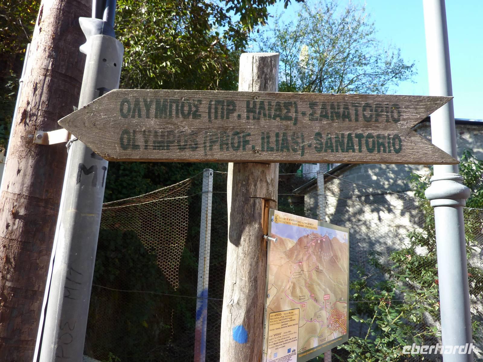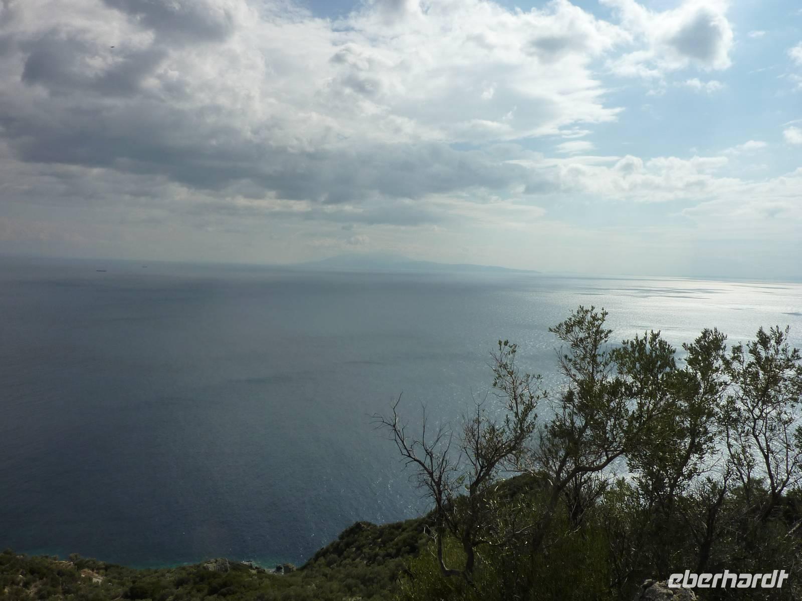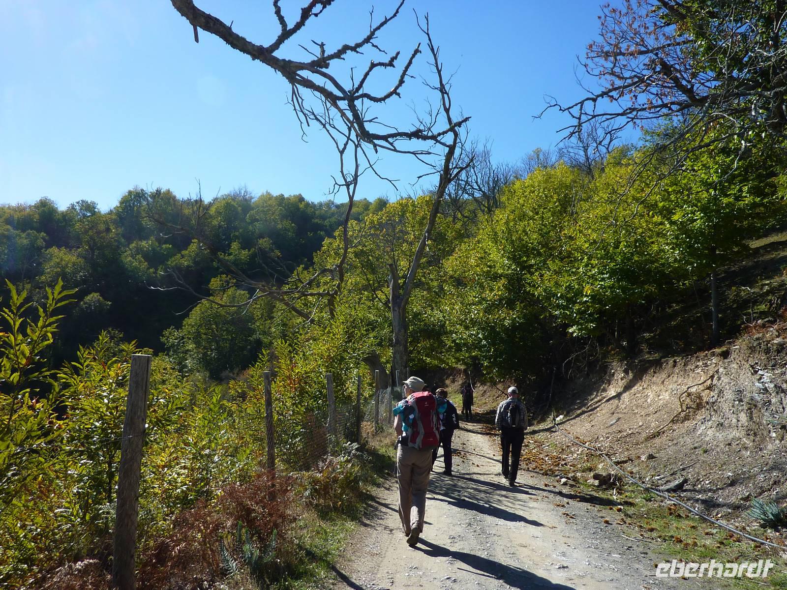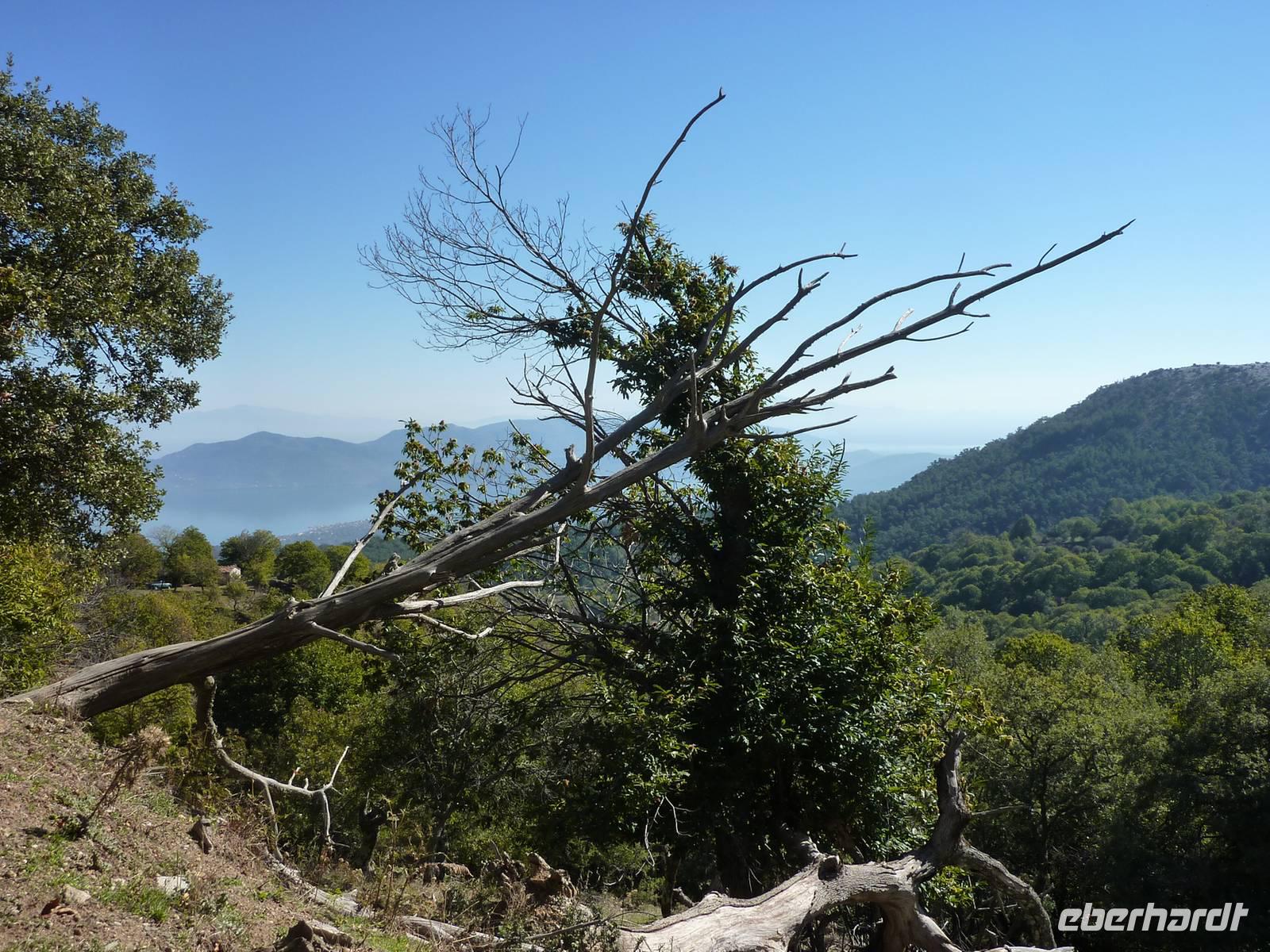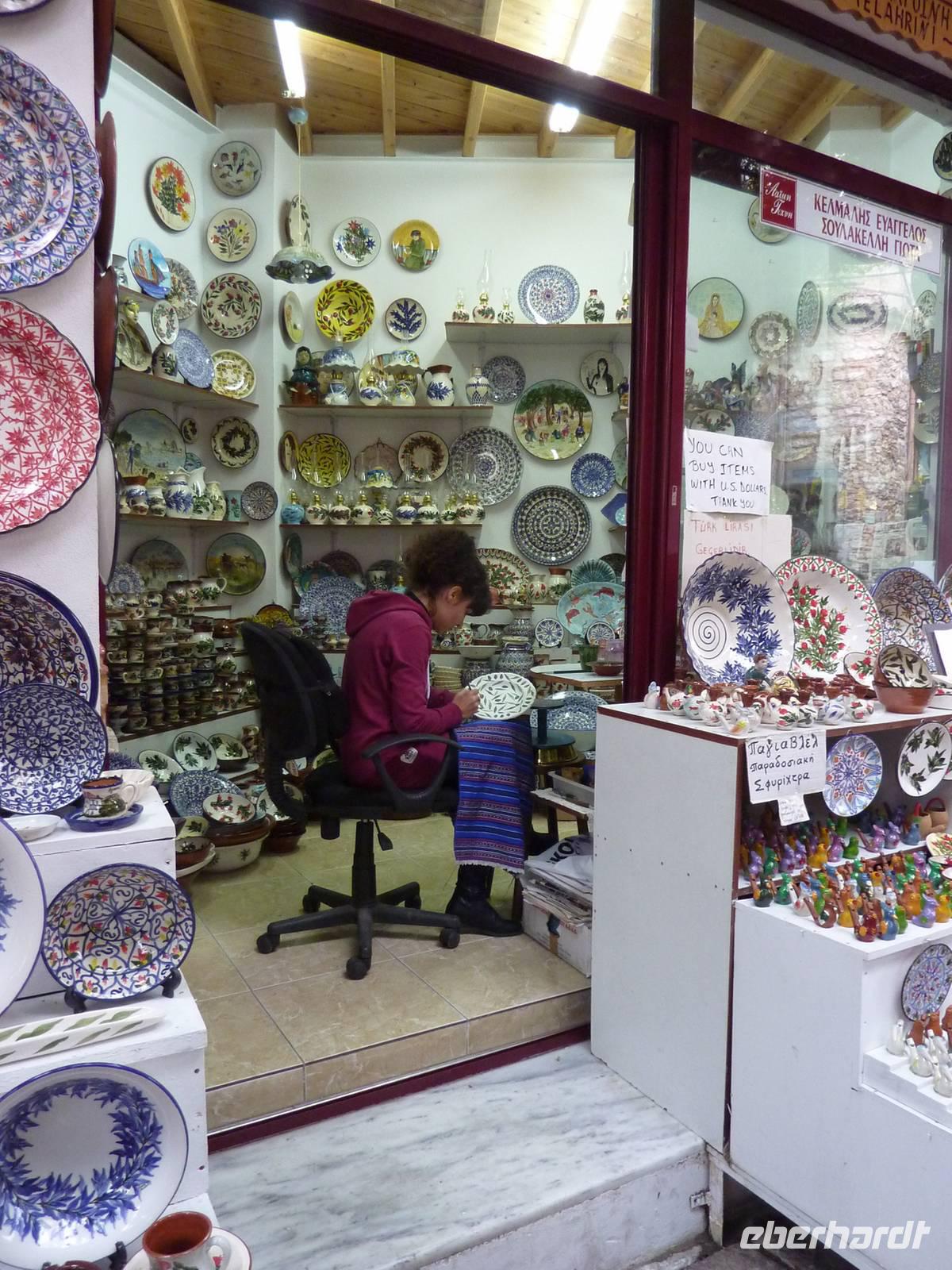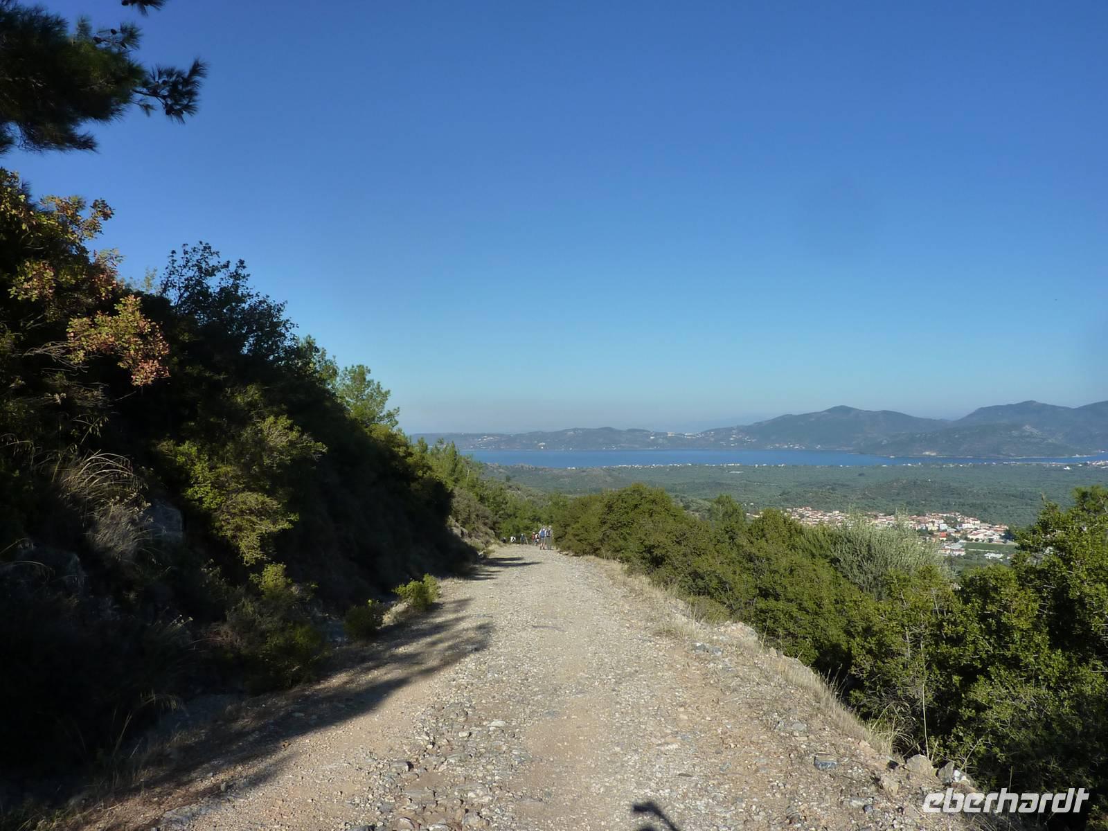 Ganz gemütlich gingen wir den Tag an, schließlich wollten unsere Gäste sich ja erholen. Um 08.30 Uhr gab es auf der Frühstücksterrasse (open-air) eine Stärkung mit Brot, Eier, Schafskäse, Schnittkäse, Wurst, Oliven, Tomaten, Gurke, frisch gepressten Orangensaft, Kaffee und/oder Tee. Eva und ich hatten uns am Morgen im Internet die Wetterkarte angesehen, naja nicht so grandios und die ganze Nacht hatte es reichlich geregnet. Wir besprachen uns und beschlossen, die geplante Wanderung den Witterungsbedingungen ein wenig anzupassen. Regensachen wurden in den Rucksack gepackt für den Fall der Fälle und so brachen wir um 10.00 Uhr zu unserer ersten Wanderung auf. Der Himmel war wolkenverhangen, aber es war angenehm warm und wir in Wanderlaune. Unser Bus brachte uns zunächst zu unserem Ausgangspunkt der Wanderung, einem netten Rastplatz. Hier konnten wir uns mit frischem Obst oder Trockenfrüchten als Wegzehrung eindecken. Ganz gemütlich, ganz siga, siga (langsam, langsam) wie Eva uns immer wieder in den nächsten Tagen auffordern würde, wanderten wir nun los. Das mit dem „siga, siga" mussten wir allerdings erst noch lernen, denn irgendwie waren wir von unserem Alltag noch ganz schön gehetzt. Unsere Sinne mussten sich erst noch öffnen und schärfen. Über alte Karrenwege, leicht bergan, vorbei an unzähligen Oliven-, Feigenbäumen, Platanen und Pinien erreichten wir schließlich das noch sehr traditionsreiche Bergstädtchen Agiasos auf immerhin 700 Metern über dem Meeresspiegel, das sich malerisch an die Hänge des Olymposgebirges schmiegt. Schmale, gepflasterte Gassen mit zahlreichen Cafenions und Tavernen zeichnen diesen Ort gleichermaßen aus, wie deren berühmte Keramikkunst. Wir besichtigen zunächst die Kirche, bevor wir bei einem griechischen Kaffee und den Leckereien aus der Bäckerei gegenüber eine Rast einlegen. Eva liest dazu aus dem Buch von Eva Demski, die darin Ihre Liebe zu dieser Insel beschreibt, z.B. die Form der Insel mit der eines Platanenblattes vergleicht und uns auffordert „mit den Füßen einer Bergziege und dem furchtlosen Herzen eines Wanderfalken" das Inselinnere zu erobern. Wir lauschen Eva dabei ganz gespannt zu, und ganz allmählich gelingt es uns, die Gelassenheit und Ruhe der Menschen dieser Insel auch in uns aufzunehmen. In unserer Freizeit lassen wir das Flair der Gassen auf uns wirken, mit den Häusern deren vorspringende Obergeschosse, bekannt als sachnisia, und hölzerne Balkone mit Blumentöpfen von Begonien, Nelken und Geranien uns verzaubern. Schließlich erwartet uns wieder unser Chauffeur und fährt uns sicher über die engen Bergstraßen zurück in unser Hotel. Das Abendessen lassen wir uns wiederum in der Taverne nahe unseres Hotels servieren. Moussaka wurde heute von Eva bestellt, ein ganz typisches Gericht, bei dem Lammhack und Auberginen geschichtet und mit Schafskäse überbacken wird. Einfach lecker.. Zum Verdauen abermals ein Ouzo hinterher, das hilft.