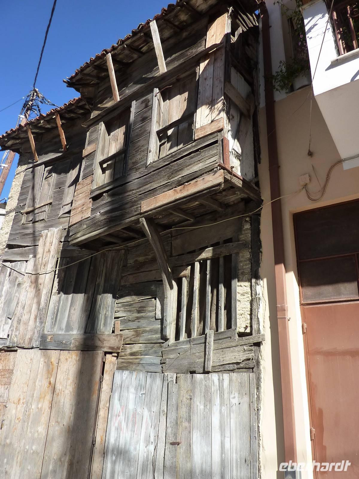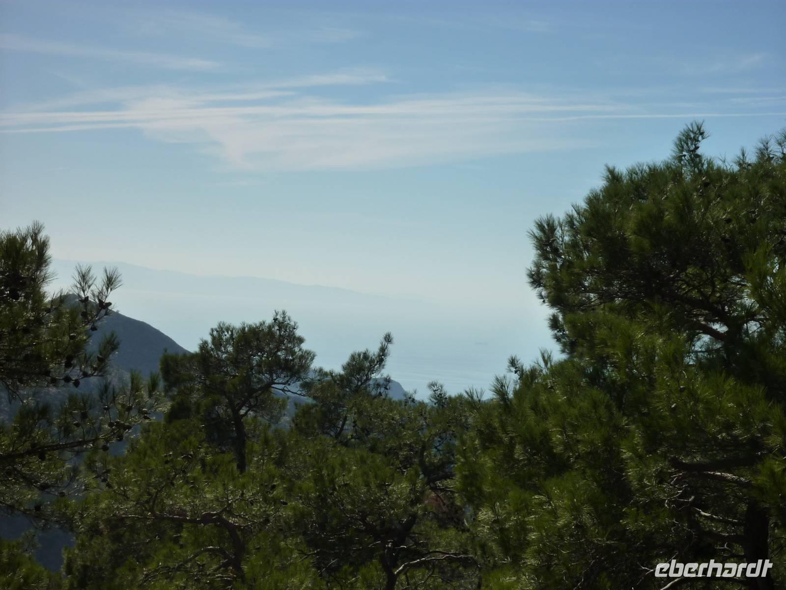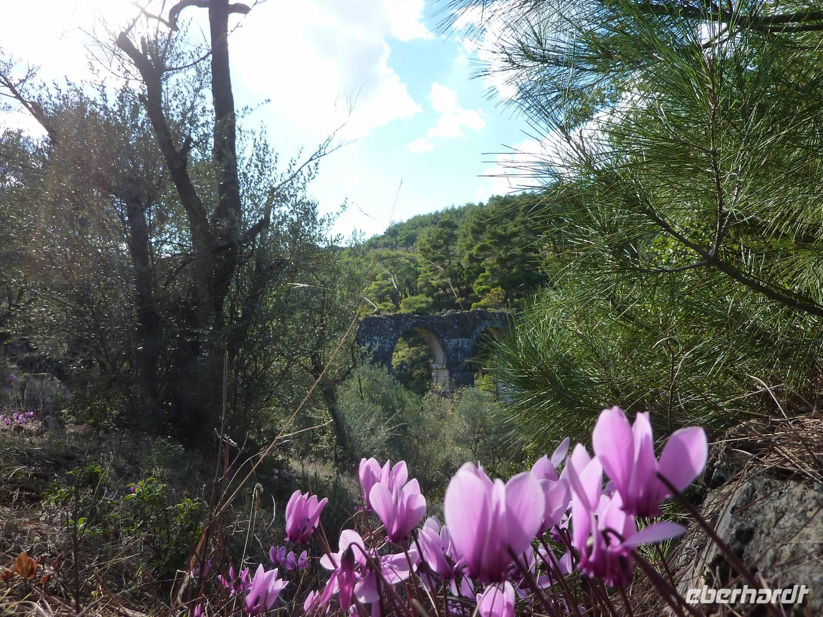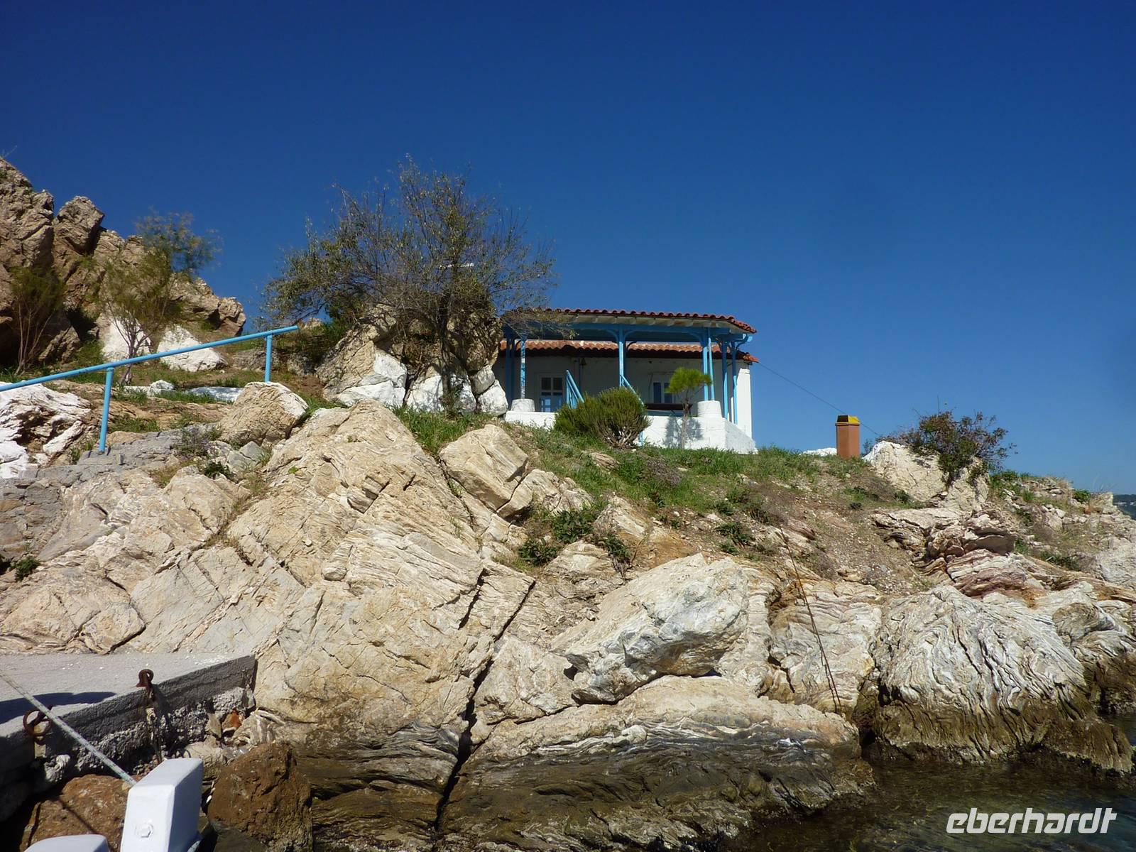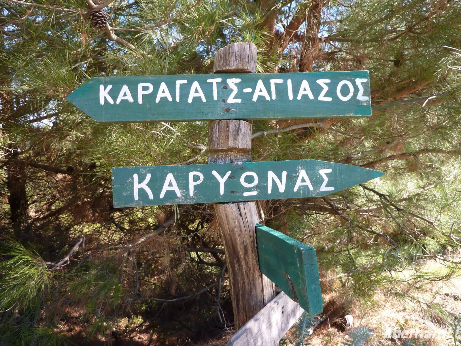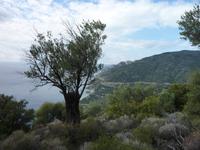 Ganz gemütlich gingen wir den Tag an, schließlich wollten unsere Gäste sich ja erholen. Um 08.30 Uhr gab es auf der Frühstücksterrasse (open-air) eine Stärkung mit Brot, Eier, Schafskäse, Schnittkäse, Wurst, Oliven, Tomaten, Gurke, frisch gepressten Orangensaft, Kaffee und/oder Tee. Eva und ich hatten uns am Morgen im Internet die Wetterkarte angesehen, naja nicht so grandios und die ganze Nacht hatte es reichlich geregnet. Wir besprachen uns und beschlossen, die geplante Wanderung den Witterungsbedingungen ein wenig anzupassen. Regensachen wurden in den Rucksack gepackt für den Fall der Fälle und so brachen wir um 10.00 Uhr zu unserer ersten Wanderung auf. Der Himmel war wolkenverhangen, aber es war angenehm warm und wir in Wanderlaune. Unser Bus brachte uns zunächst zu unserem Ausgangspunkt der Wanderung, einem netten Rastplatz. Hier konnten wir uns mit frischem Obst oder Trockenfrüchten als Wegzehrung eindecken. Ganz gemütlich, ganz siga, siga (langsam, langsam) wie Eva uns immer wieder in den nächsten Tagen auffordern würde, wanderten wir nun los. Das mit dem „siga, siga" mussten wir allerdings erst noch lernen, denn irgendwie waren wir von unserem Alltag noch ganz schön gehetzt. Unsere Sinne mussten sich erst noch öffnen und schärfen. Über alte Karrenwege, leicht bergan, vorbei an unzähligen Oliven-, Feigenbäumen, Platanen und Pinien erreichten wir schließlich das noch sehr traditionsreiche Bergstädtchen Agiasos auf immerhin 700 Metern über dem Meeresspiegel, das sich malerisch an die Hänge des Olymposgebirges schmiegt. Schmale, gepflasterte Gassen mit zahlreichen Cafenions und Tavernen zeichnen diesen Ort gleichermaßen aus, wie deren berühmte Keramikkunst. Wir besichtigen zunächst die Kirche, bevor wir bei einem griechischen Kaffee und den Leckereien aus der Bäckerei gegenüber eine Rast einlegen. Eva liest dazu aus dem Buch von Eva Demski, die darin Ihre Liebe zu dieser Insel beschreibt, z.B. die Form der Insel mit der eines Platanenblattes vergleicht und uns auffordert „mit den Füßen einer Bergziege und dem furchtlosen Herzen eines Wanderfalken" das Inselinnere zu erobern. Wir lauschen Eva dabei ganz gespannt zu, und ganz allmählich gelingt es uns, die Gelassenheit und Ruhe der Menschen dieser Insel auch in uns aufzunehmen. In unserer Freizeit lassen wir das Flair der Gassen auf uns wirken, mit den Häusern deren vorspringende Obergeschosse, bekannt als sachnisia, und hölzerne Balkone mit Blumentöpfen von Begonien, Nelken und Geranien uns verzaubern. Schließlich erwartet uns wieder unser Chauffeur und fährt uns sicher über die engen Bergstraßen zurück in unser Hotel. Das Abendessen lassen wir uns wiederum in der Taverne nahe unseres Hotels servieren. Moussaka wurde heute von Eva bestellt, ein ganz typisches Gericht, bei dem Lammhack und Auberginen geschichtet und mit Schafskäse überbacken wird. Einfach lecker.. Zum Verdauen abermals ein Ouzo hinterher, das hilft.