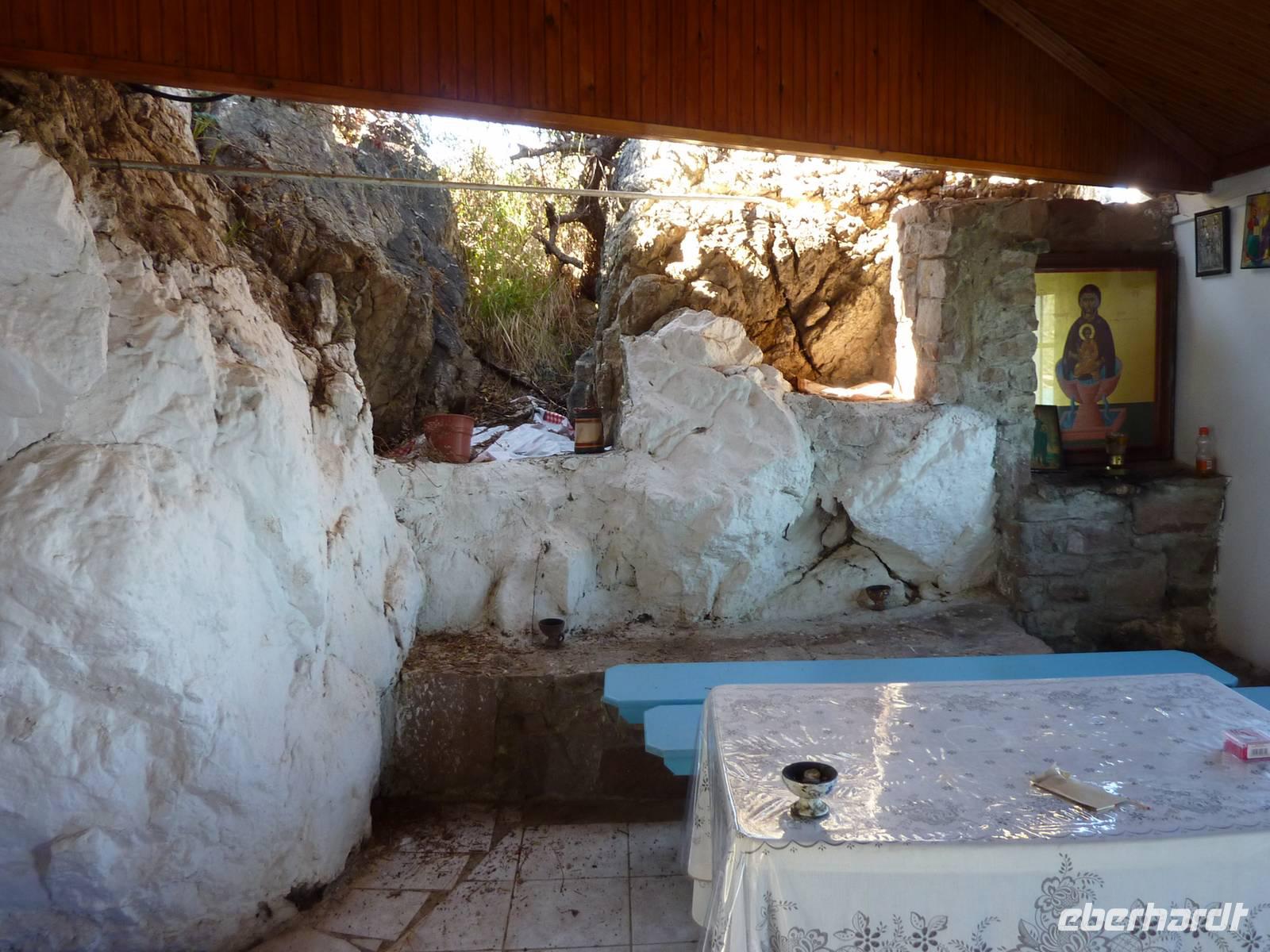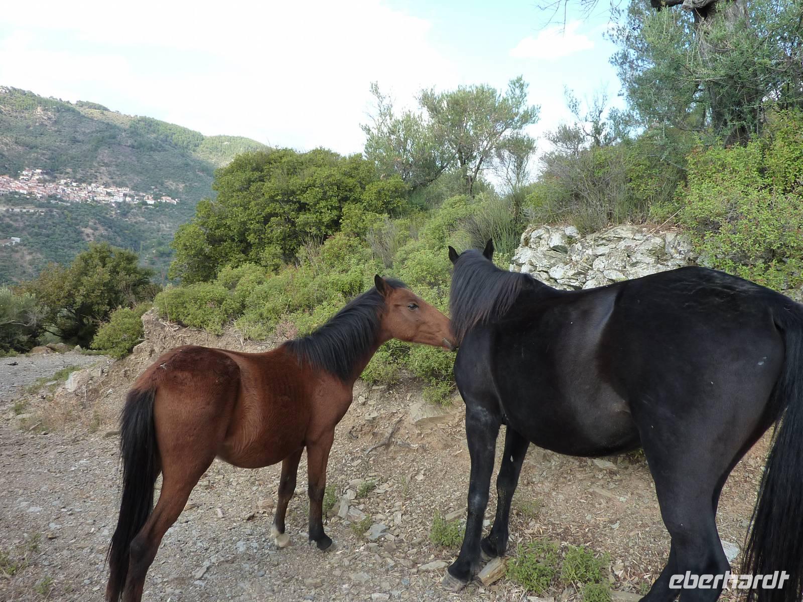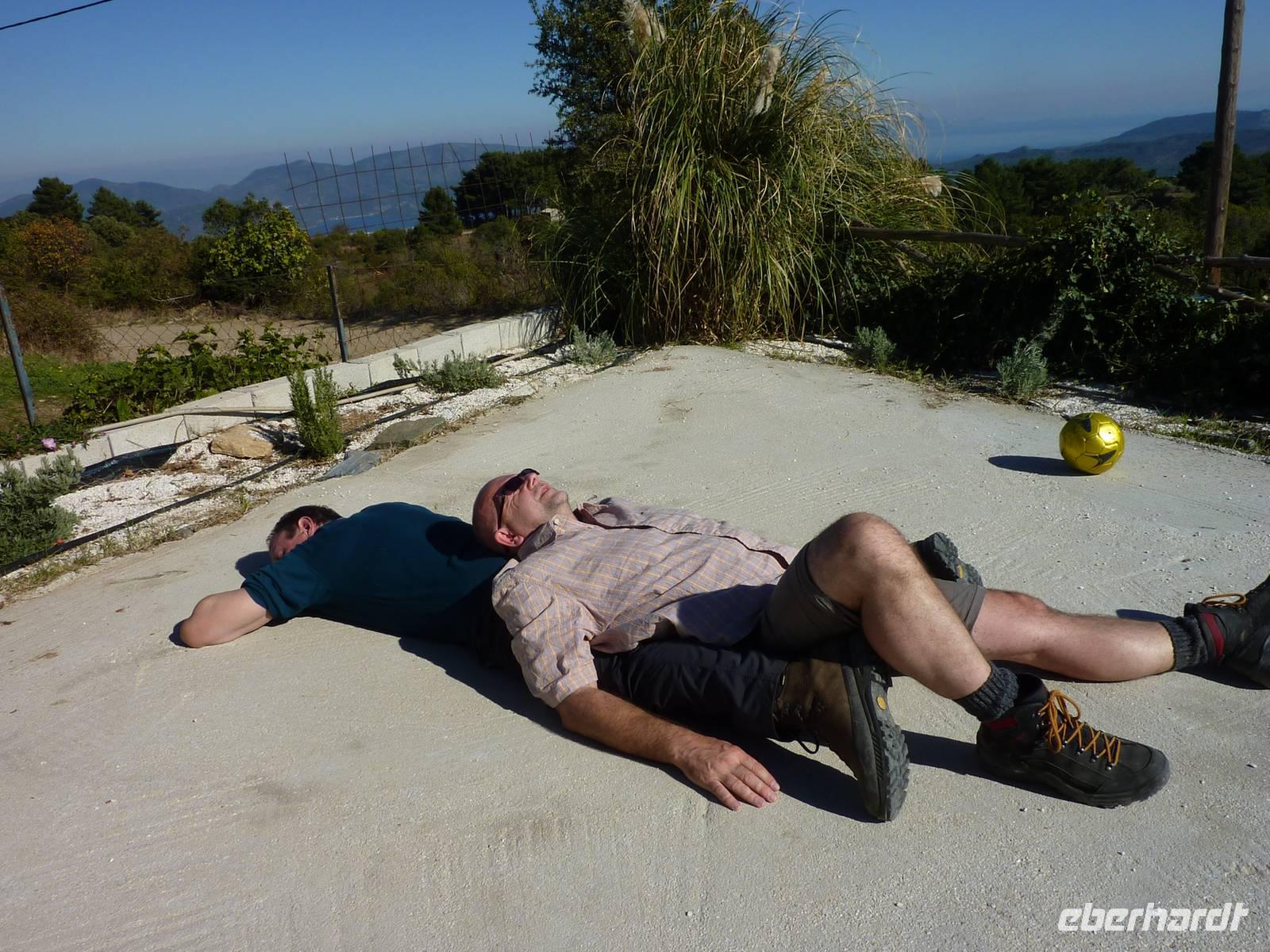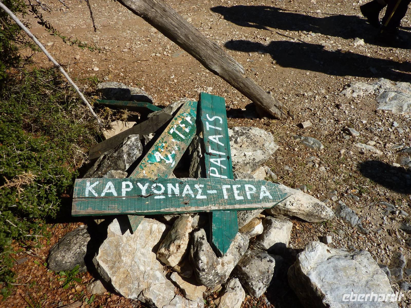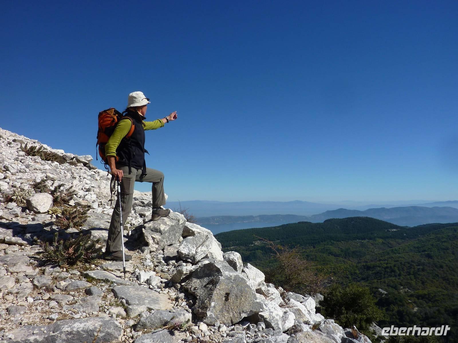 Ganz gemütlich gingen wir den Tag an, schließlich wollten unsere Gäste sich ja erholen. Um 08.30 Uhr gab es auf der Frühstücksterrasse (open-air) eine Stärkung mit Brot, Eier, Schafskäse, Schnittkäse, Wurst, Oliven, Tomaten, Gurke, frisch gepressten Orangensaft, Kaffee und/oder Tee. Eva und ich hatten uns am Morgen im Internet die Wetterkarte angesehen, naja nicht so grandios und die ganze Nacht hatte es reichlich geregnet. Wir besprachen uns und beschlossen, die geplante Wanderung den Witterungsbedingungen ein wenig anzupassen. Regensachen wurden in den Rucksack gepackt für den Fall der Fälle und so brachen wir um 10.00 Uhr zu unserer ersten Wanderung auf. Der Himmel war wolkenverhangen, aber es war angenehm warm und wir in Wanderlaune. Unser Bus brachte uns zunächst zu unserem Ausgangspunkt der Wanderung, einem netten Rastplatz. Hier konnten wir uns mit frischem Obst oder Trockenfrüchten als Wegzehrung eindecken. Ganz gemütlich, ganz siga, siga (langsam, langsam) wie Eva uns immer wieder in den nächsten Tagen auffordern würde, wanderten wir nun los. Das mit dem „siga, siga" mussten wir allerdings erst noch lernen, denn irgendwie waren wir von unserem Alltag noch ganz schön gehetzt. Unsere Sinne mussten sich erst noch öffnen und schärfen. Über alte Karrenwege, leicht bergan, vorbei an unzähligen Oliven-, Feigenbäumen, Platanen und Pinien erreichten wir schließlich das noch sehr traditionsreiche Bergstädtchen Agiasos auf immerhin 700 Metern über dem Meeresspiegel, das sich malerisch an die Hänge des Olymposgebirges schmiegt. Schmale, gepflasterte Gassen mit zahlreichen Cafenions und Tavernen zeichnen diesen Ort gleichermaßen aus, wie deren berühmte Keramikkunst. Wir besichtigen zunächst die Kirche, bevor wir bei einem griechischen Kaffee und den Leckereien aus der Bäckerei gegenüber eine Rast einlegen. Eva liest dazu aus dem Buch von Eva Demski, die darin Ihre Liebe zu dieser Insel beschreibt, z.B. die Form der Insel mit der eines Platanenblattes vergleicht und uns auffordert „mit den Füßen einer Bergziege und dem furchtlosen Herzen eines Wanderfalken" das Inselinnere zu erobern. Wir lauschen Eva dabei ganz gespannt zu, und ganz allmählich gelingt es uns, die Gelassenheit und Ruhe der Menschen dieser Insel auch in uns aufzunehmen. In unserer Freizeit lassen wir das Flair der Gassen auf uns wirken, mit den Häusern deren vorspringende Obergeschosse, bekannt als sachnisia, und hölzerne Balkone mit Blumentöpfen von Begonien, Nelken und Geranien uns verzaubern. Schließlich erwartet uns wieder unser Chauffeur und fährt uns sicher über die engen Bergstraßen zurück in unser Hotel. Das Abendessen lassen wir uns wiederum in der Taverne nahe unseres Hotels servieren. Moussaka wurde heute von Eva bestellt, ein ganz typisches Gericht, bei dem Lammhack und Auberginen geschichtet und mit Schafskäse überbacken wird. Einfach lecker.. Zum Verdauen abermals ein Ouzo hinterher, das hilft.