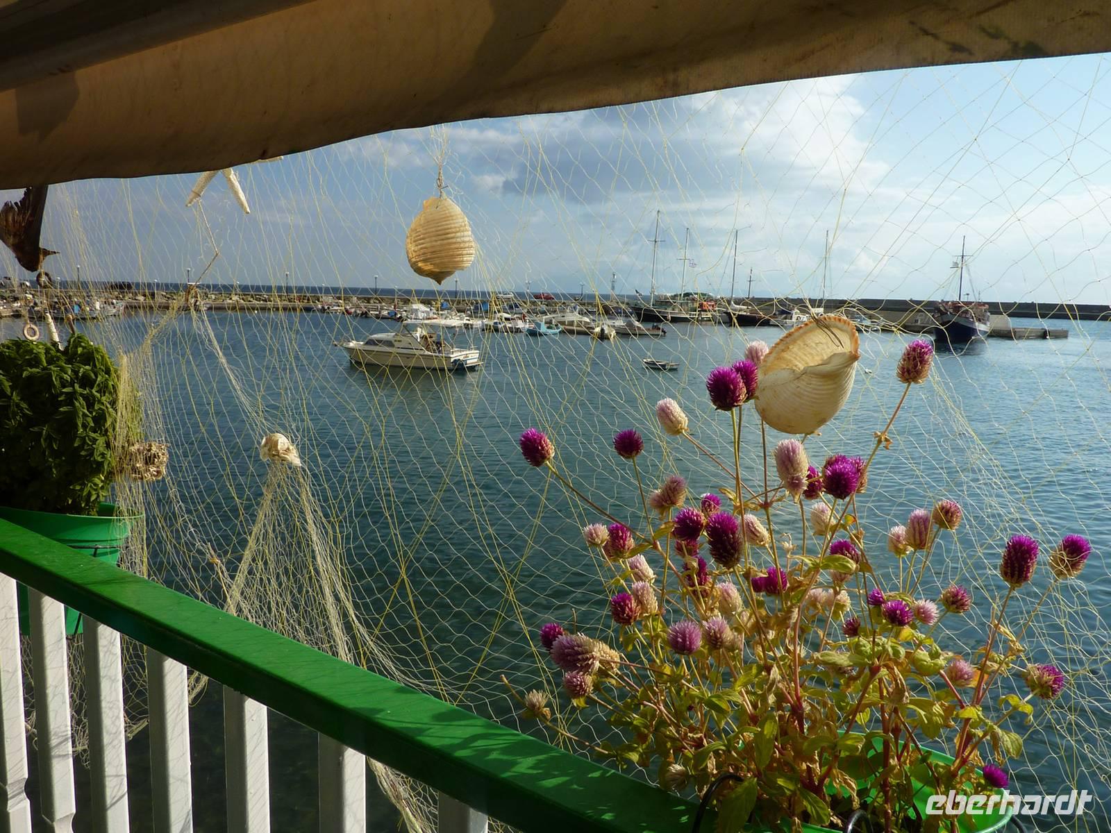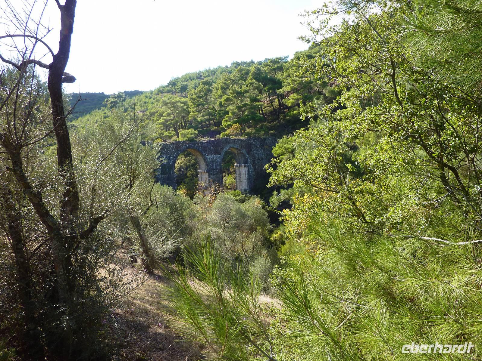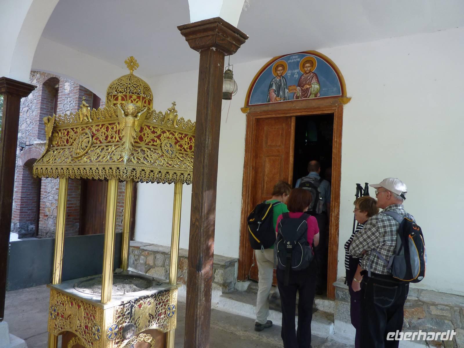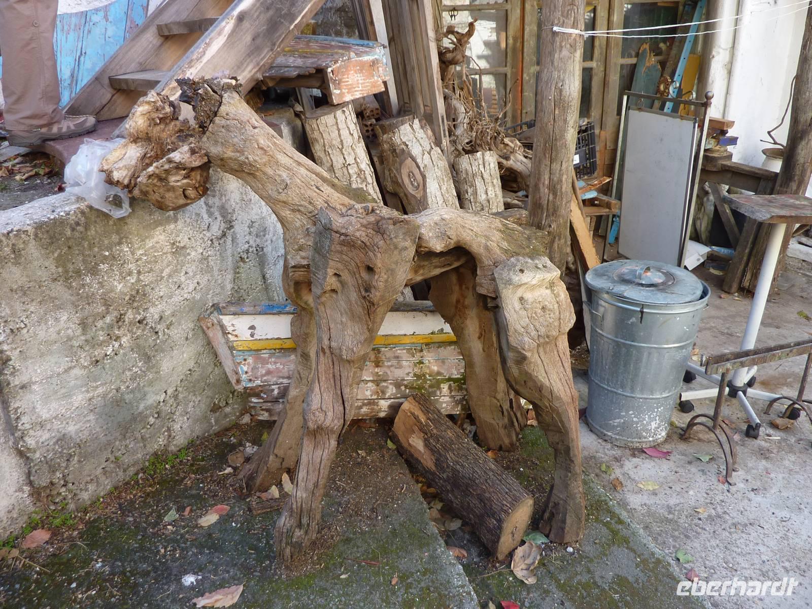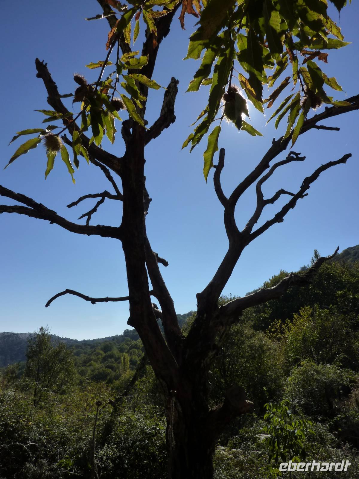 Ganz gemütlich gingen wir den Tag an, schließlich wollten unsere Gäste sich ja erholen. Um 08.30 Uhr gab es auf der Frühstücksterrasse (open-air) eine Stärkung mit Brot, Eier, Schafskäse, Schnittkäse, Wurst, Oliven, Tomaten, Gurke, frisch gepressten Orangensaft, Kaffee und/oder Tee. Eva und ich hatten uns am Morgen im Internet die Wetterkarte angesehen, naja nicht so grandios und die ganze Nacht hatte es reichlich geregnet. Wir besprachen uns und beschlossen, die geplante Wanderung den Witterungsbedingungen ein wenig anzupassen. Regensachen wurden in den Rucksack gepackt für den Fall der Fälle und so brachen wir um 10.00 Uhr zu unserer ersten Wanderung auf. Der Himmel war wolkenverhangen, aber es war angenehm warm und wir in Wanderlaune. Unser Bus brachte uns zunächst zu unserem Ausgangspunkt der Wanderung, einem netten Rastplatz. Hier konnten wir uns mit frischem Obst oder Trockenfrüchten als Wegzehrung eindecken. Ganz gemütlich, ganz siga, siga (langsam, langsam) wie Eva uns immer wieder in den nächsten Tagen auffordern würde, wanderten wir nun los. Das mit dem „siga, siga" mussten wir allerdings erst noch lernen, denn irgendwie waren wir von unserem Alltag noch ganz schön gehetzt. Unsere Sinne mussten sich erst noch öffnen und schärfen. Über alte Karrenwege, leicht bergan, vorbei an unzähligen Oliven-, Feigenbäumen, Platanen und Pinien erreichten wir schließlich das noch sehr traditionsreiche Bergstädtchen Agiasos auf immerhin 700 Metern über dem Meeresspiegel, das sich malerisch an die Hänge des Olymposgebirges schmiegt. Schmale, gepflasterte Gassen mit zahlreichen Cafenions und Tavernen zeichnen diesen Ort gleichermaßen aus, wie deren berühmte Keramikkunst. Wir besichtigen zunächst die Kirche, bevor wir bei einem griechischen Kaffee und den Leckereien aus der Bäckerei gegenüber eine Rast einlegen. Eva liest dazu aus dem Buch von Eva Demski, die darin Ihre Liebe zu dieser Insel beschreibt, z.B. die Form der Insel mit der eines Platanenblattes vergleicht und uns auffordert „mit den Füßen einer Bergziege und dem furchtlosen Herzen eines Wanderfalken" das Inselinnere zu erobern. Wir lauschen Eva dabei ganz gespannt zu, und ganz allmählich gelingt es uns, die Gelassenheit und Ruhe der Menschen dieser Insel auch in uns aufzunehmen. In unserer Freizeit lassen wir das Flair der Gassen auf uns wirken, mit den Häusern deren vorspringende Obergeschosse, bekannt als sachnisia, und hölzerne Balkone mit Blumentöpfen von Begonien, Nelken und Geranien uns verzaubern. Schließlich erwartet uns wieder unser Chauffeur und fährt uns sicher über die engen Bergstraßen zurück in unser Hotel. Das Abendessen lassen wir uns wiederum in der Taverne nahe unseres Hotels servieren. Moussaka wurde heute von Eva bestellt, ein ganz typisches Gericht, bei dem Lammhack und Auberginen geschichtet und mit Schafskäse überbacken wird. Einfach lecker.. Zum Verdauen abermals ein Ouzo hinterher, das hilft.