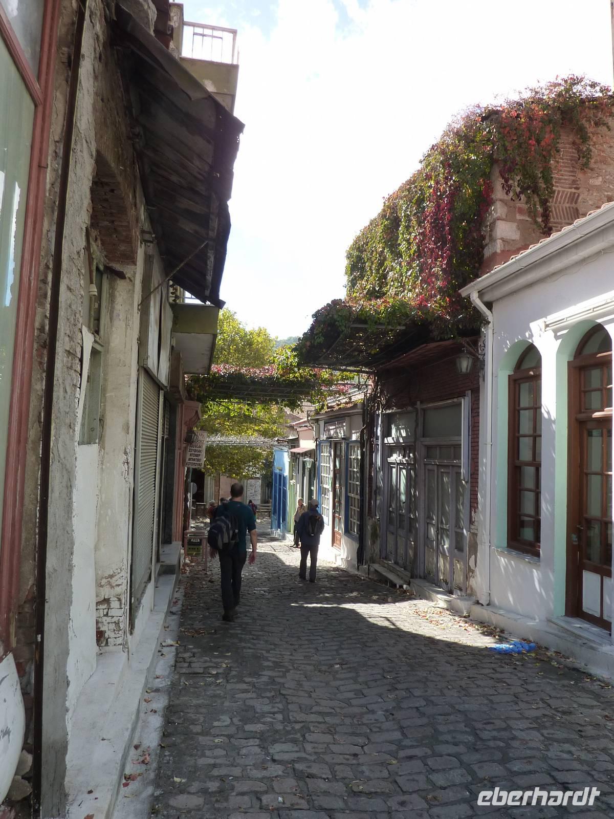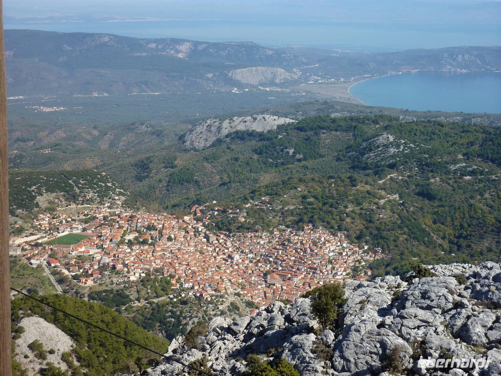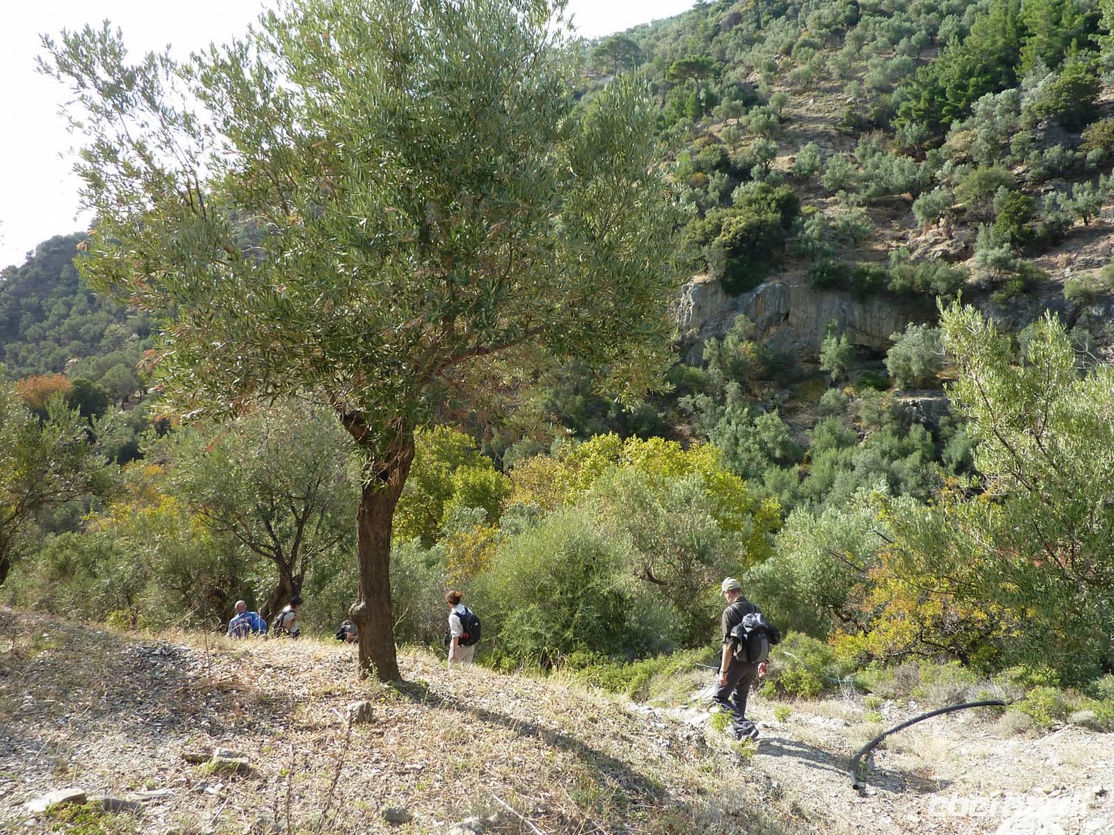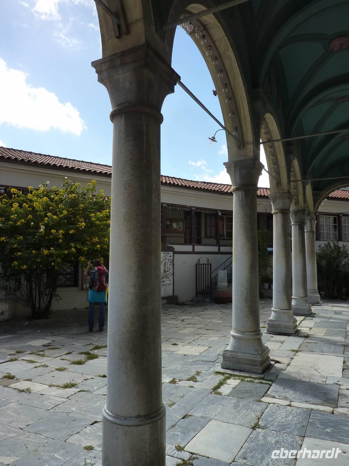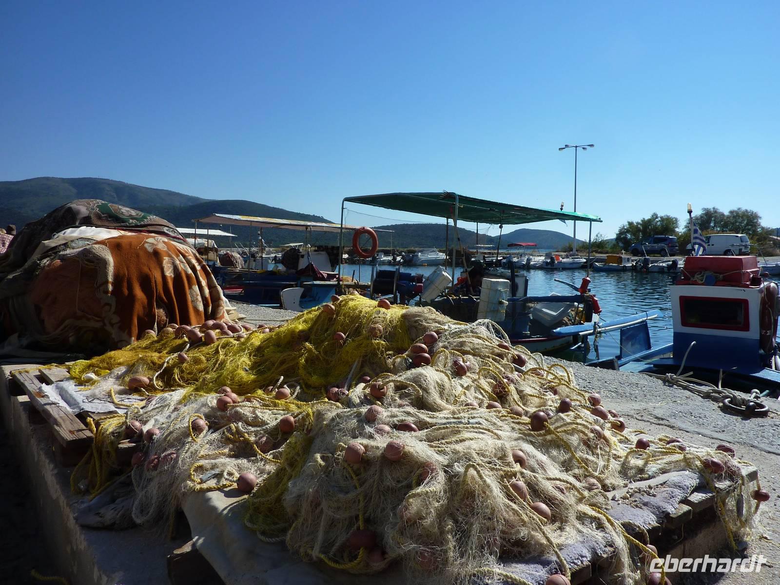 Ganz gemütlich gingen wir den Tag an, schließlich wollten unsere Gäste sich ja erholen. Um 08.30 Uhr gab es auf der Frühstücksterrasse (open-air) eine Stärkung mit Brot, Eier, Schafskäse, Schnittkäse, Wurst, Oliven, Tomaten, Gurke, frisch gepressten Orangensaft, Kaffee und/oder Tee. Eva und ich hatten uns am Morgen im Internet die Wetterkarte angesehen, naja nicht so grandios und die ganze Nacht hatte es reichlich geregnet. Wir besprachen uns und beschlossen, die geplante Wanderung den Witterungsbedingungen ein wenig anzupassen. Regensachen wurden in den Rucksack gepackt für den Fall der Fälle und so brachen wir um 10.00 Uhr zu unserer ersten Wanderung auf. Der Himmel war wolkenverhangen, aber es war angenehm warm und wir in Wanderlaune. Unser Bus brachte uns zunächst zu unserem Ausgangspunkt der Wanderung, einem netten Rastplatz. Hier konnten wir uns mit frischem Obst oder Trockenfrüchten als Wegzehrung eindecken. Ganz gemütlich, ganz siga, siga (langsam, langsam) wie Eva uns immer wieder in den nächsten Tagen auffordern würde, wanderten wir nun los. Das mit dem „siga, siga" mussten wir allerdings erst noch lernen, denn irgendwie waren wir von unserem Alltag noch ganz schön gehetzt. Unsere Sinne mussten sich erst noch öffnen und schärfen. Über alte Karrenwege, leicht bergan, vorbei an unzähligen Oliven-, Feigenbäumen, Platanen und Pinien erreichten wir schließlich das noch sehr traditionsreiche Bergstädtchen Agiasos auf immerhin 700 Metern über dem Meeresspiegel, das sich malerisch an die Hänge des Olymposgebirges schmiegt. Schmale, gepflasterte Gassen mit zahlreichen Cafenions und Tavernen zeichnen diesen Ort gleichermaßen aus, wie deren berühmte Keramikkunst. Wir besichtigen zunächst die Kirche, bevor wir bei einem griechischen Kaffee und den Leckereien aus der Bäckerei gegenüber eine Rast einlegen. Eva liest dazu aus dem Buch von Eva Demski, die darin Ihre Liebe zu dieser Insel beschreibt, z.B. die Form der Insel mit der eines Platanenblattes vergleicht und uns auffordert „mit den Füßen einer Bergziege und dem furchtlosen Herzen eines Wanderfalken" das Inselinnere zu erobern. Wir lauschen Eva dabei ganz gespannt zu, und ganz allmählich gelingt es uns, die Gelassenheit und Ruhe der Menschen dieser Insel auch in uns aufzunehmen. In unserer Freizeit lassen wir das Flair der Gassen auf uns wirken, mit den Häusern deren vorspringende Obergeschosse, bekannt als sachnisia, und hölzerne Balkone mit Blumentöpfen von Begonien, Nelken und Geranien uns verzaubern. Schließlich erwartet uns wieder unser Chauffeur und fährt uns sicher über die engen Bergstraßen zurück in unser Hotel. Das Abendessen lassen wir uns wiederum in der Taverne nahe unseres Hotels servieren. Moussaka wurde heute von Eva bestellt, ein ganz typisches Gericht, bei dem Lammhack und Auberginen geschichtet und mit Schafskäse überbacken wird. Einfach lecker.. Zum Verdauen abermals ein Ouzo hinterher, das hilft.