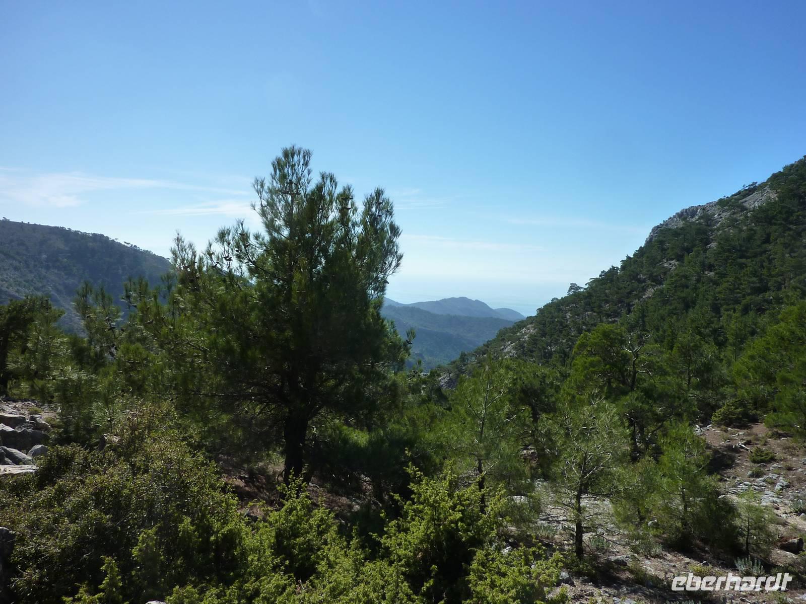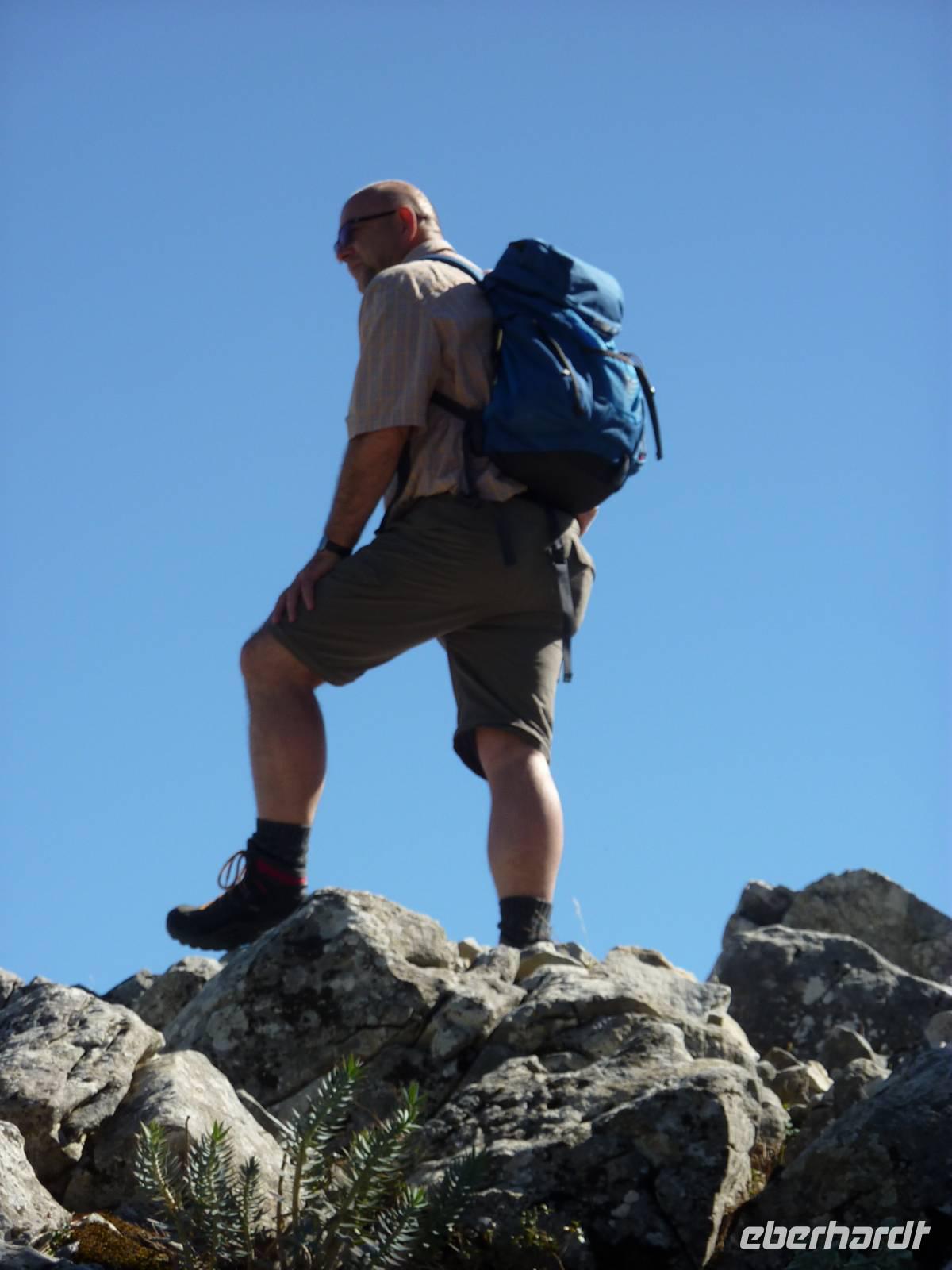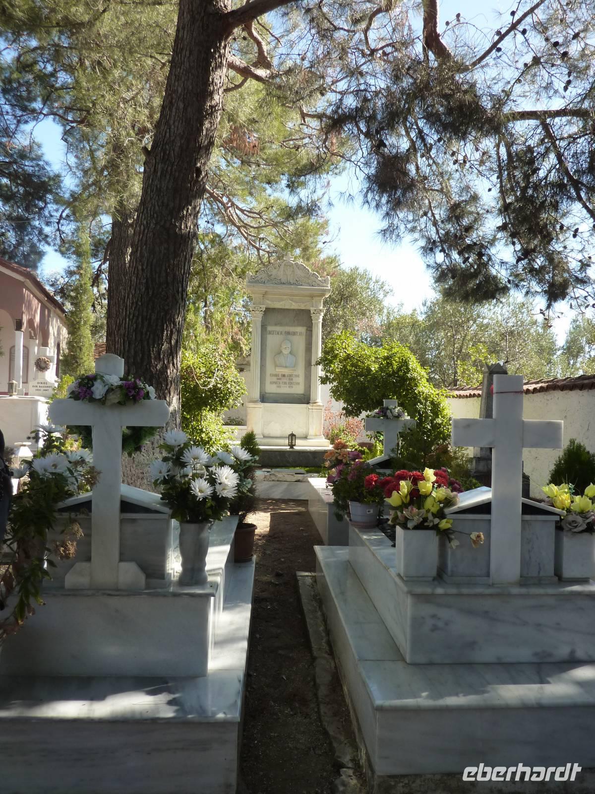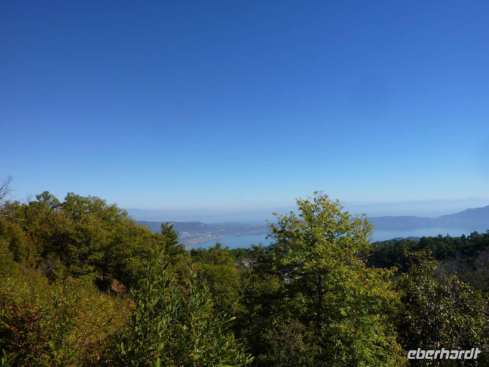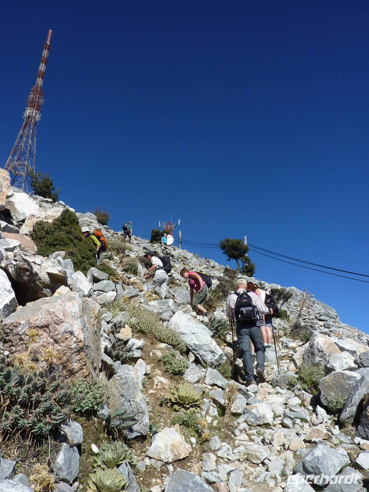 Ganz gemütlich gingen wir den Tag an, schließlich wollten unsere Gäste sich ja erholen. Um 08.30 Uhr gab es auf der Frühstücksterrasse (open-air) eine Stärkung mit Brot, Eier, Schafskäse, Schnittkäse, Wurst, Oliven, Tomaten, Gurke, frisch gepressten Orangensaft, Kaffee und/oder Tee. Eva und ich hatten uns am Morgen im Internet die Wetterkarte angesehen, naja nicht so grandios und die ganze Nacht hatte es reichlich geregnet. Wir besprachen uns und beschlossen, die geplante Wanderung den Witterungsbedingungen ein wenig anzupassen. Regensachen wurden in den Rucksack gepackt für den Fall der Fälle und so brachen wir um 10.00 Uhr zu unserer ersten Wanderung auf. Der Himmel war wolkenverhangen, aber es war angenehm warm und wir in Wanderlaune. Unser Bus brachte uns zunächst zu unserem Ausgangspunkt der Wanderung, einem netten Rastplatz. Hier konnten wir uns mit frischem Obst oder Trockenfrüchten als Wegzehrung eindecken. Ganz gemütlich, ganz siga, siga (langsam, langsam) wie Eva uns immer wieder in den nächsten Tagen auffordern würde, wanderten wir nun los. Das mit dem „siga, siga" mussten wir allerdings erst noch lernen, denn irgendwie waren wir von unserem Alltag noch ganz schön gehetzt. Unsere Sinne mussten sich erst noch öffnen und schärfen. Über alte Karrenwege, leicht bergan, vorbei an unzähligen Oliven-, Feigenbäumen, Platanen und Pinien erreichten wir schließlich das noch sehr traditionsreiche Bergstädtchen Agiasos auf immerhin 700 Metern über dem Meeresspiegel, das sich malerisch an die Hänge des Olymposgebirges schmiegt. Schmale, gepflasterte Gassen mit zahlreichen Cafenions und Tavernen zeichnen diesen Ort gleichermaßen aus, wie deren berühmte Keramikkunst. Wir besichtigen zunächst die Kirche, bevor wir bei einem griechischen Kaffee und den Leckereien aus der Bäckerei gegenüber eine Rast einlegen. Eva liest dazu aus dem Buch von Eva Demski, die darin Ihre Liebe zu dieser Insel beschreibt, z.B. die Form der Insel mit der eines Platanenblattes vergleicht und uns auffordert „mit den Füßen einer Bergziege und dem furchtlosen Herzen eines Wanderfalken" das Inselinnere zu erobern. Wir lauschen Eva dabei ganz gespannt zu, und ganz allmählich gelingt es uns, die Gelassenheit und Ruhe der Menschen dieser Insel auch in uns aufzunehmen. In unserer Freizeit lassen wir das Flair der Gassen auf uns wirken, mit den Häusern deren vorspringende Obergeschosse, bekannt als sachnisia, und hölzerne Balkone mit Blumentöpfen von Begonien, Nelken und Geranien uns verzaubern. Schließlich erwartet uns wieder unser Chauffeur und fährt uns sicher über die engen Bergstraßen zurück in unser Hotel. Das Abendessen lassen wir uns wiederum in der Taverne nahe unseres Hotels servieren. Moussaka wurde heute von Eva bestellt, ein ganz typisches Gericht, bei dem Lammhack und Auberginen geschichtet und mit Schafskäse überbacken wird. Einfach lecker.. Zum Verdauen abermals ein Ouzo hinterher, das hilft.