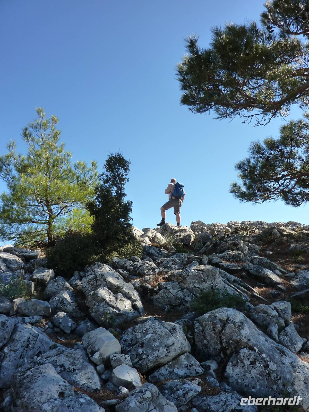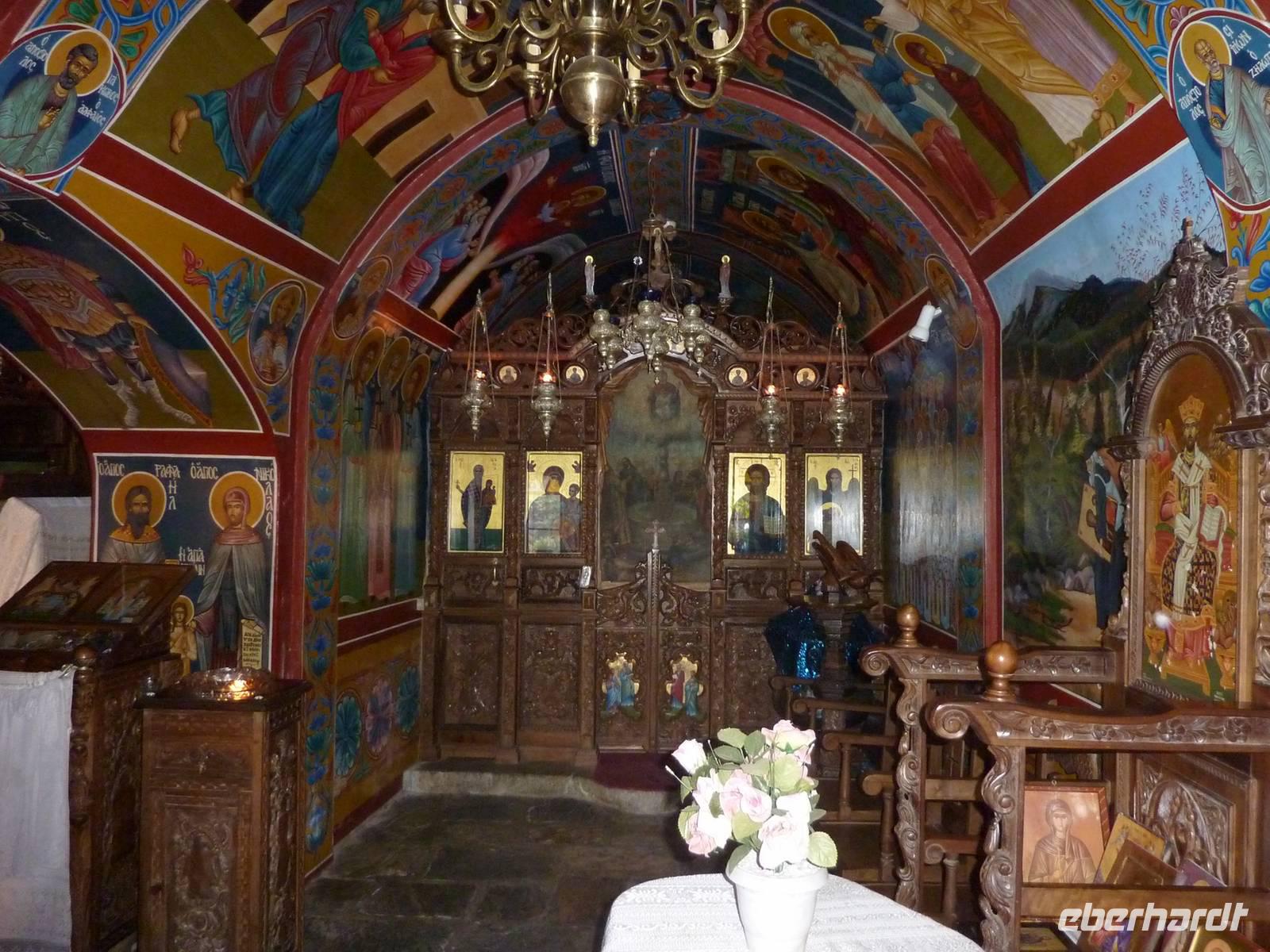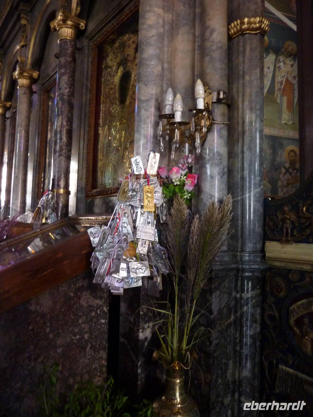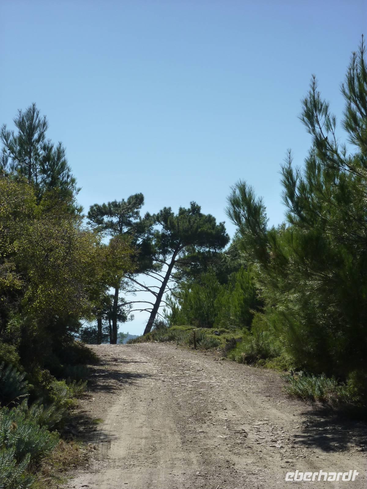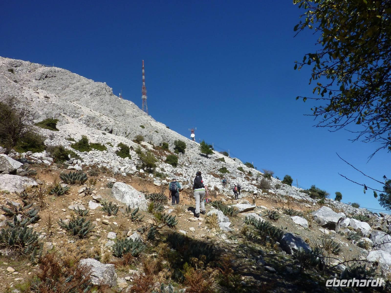 Ganz gemütlich gingen wir den Tag an, schließlich wollten unsere Gäste sich ja erholen. Um 08.30 Uhr gab es auf der Frühstücksterrasse (open-air) eine Stärkung mit Brot, Eier, Schafskäse, Schnittkäse, Wurst, Oliven, Tomaten, Gurke, frisch gepressten Orangensaft, Kaffee und/oder Tee. Eva und ich hatten uns am Morgen im Internet die Wetterkarte angesehen, naja nicht so grandios und die ganze Nacht hatte es reichlich geregnet. Wir besprachen uns und beschlossen, die geplante Wanderung den Witterungsbedingungen ein wenig anzupassen. Regensachen wurden in den Rucksack gepackt für den Fall der Fälle und so brachen wir um 10.00 Uhr zu unserer ersten Wanderung auf. Der Himmel war wolkenverhangen, aber es war angenehm warm und wir in Wanderlaune. Unser Bus brachte uns zunächst zu unserem Ausgangspunkt der Wanderung, einem netten Rastplatz. Hier konnten wir uns mit frischem Obst oder Trockenfrüchten als Wegzehrung eindecken. Ganz gemütlich, ganz siga, siga (langsam, langsam) wie Eva uns immer wieder in den nächsten Tagen auffordern würde, wanderten wir nun los. Das mit dem „siga, siga" mussten wir allerdings erst noch lernen, denn irgendwie waren wir von unserem Alltag noch ganz schön gehetzt. Unsere Sinne mussten sich erst noch öffnen und schärfen. Über alte Karrenwege, leicht bergan, vorbei an unzähligen Oliven-, Feigenbäumen, Platanen und Pinien erreichten wir schließlich das noch sehr traditionsreiche Bergstädtchen Agiasos auf immerhin 700 Metern über dem Meeresspiegel, das sich malerisch an die Hänge des Olymposgebirges schmiegt. Schmale, gepflasterte Gassen mit zahlreichen Cafenions und Tavernen zeichnen diesen Ort gleichermaßen aus, wie deren berühmte Keramikkunst. Wir besichtigen zunächst die Kirche, bevor wir bei einem griechischen Kaffee und den Leckereien aus der Bäckerei gegenüber eine Rast einlegen. Eva liest dazu aus dem Buch von Eva Demski, die darin Ihre Liebe zu dieser Insel beschreibt, z.B. die Form der Insel mit der eines Platanenblattes vergleicht und uns auffordert „mit den Füßen einer Bergziege und dem furchtlosen Herzen eines Wanderfalken" das Inselinnere zu erobern. Wir lauschen Eva dabei ganz gespannt zu, und ganz allmählich gelingt es uns, die Gelassenheit und Ruhe der Menschen dieser Insel auch in uns aufzunehmen. In unserer Freizeit lassen wir das Flair der Gassen auf uns wirken, mit den Häusern deren vorspringende Obergeschosse, bekannt als sachnisia, und hölzerne Balkone mit Blumentöpfen von Begonien, Nelken und Geranien uns verzaubern. Schließlich erwartet uns wieder unser Chauffeur und fährt uns sicher über die engen Bergstraßen zurück in unser Hotel. Das Abendessen lassen wir uns wiederum in der Taverne nahe unseres Hotels servieren. Moussaka wurde heute von Eva bestellt, ein ganz typisches Gericht, bei dem Lammhack und Auberginen geschichtet und mit Schafskäse überbacken wird. Einfach lecker.. Zum Verdauen abermals ein Ouzo hinterher, das hilft.