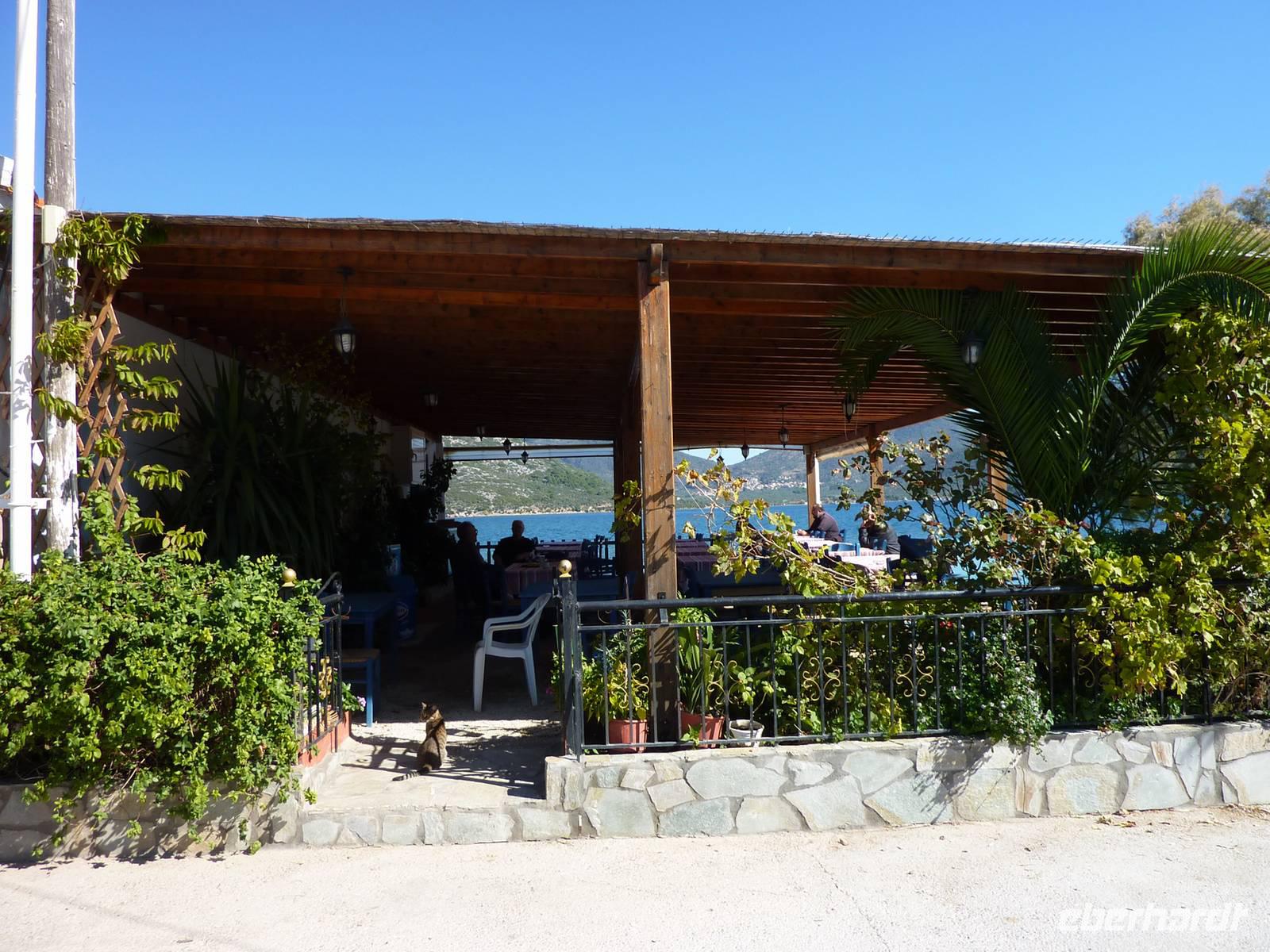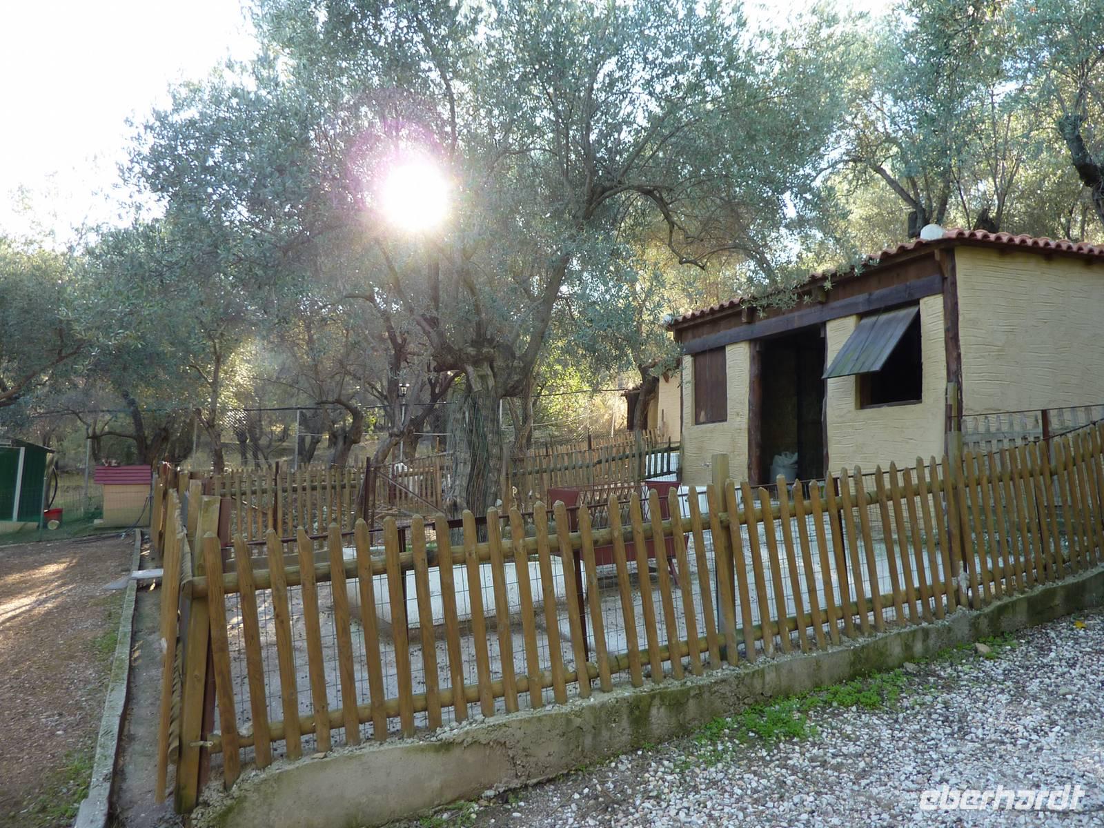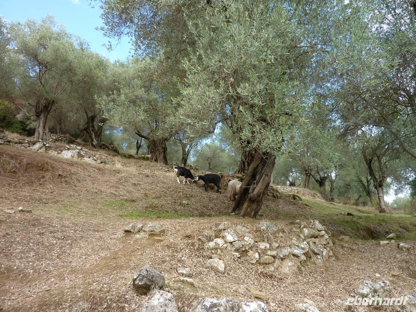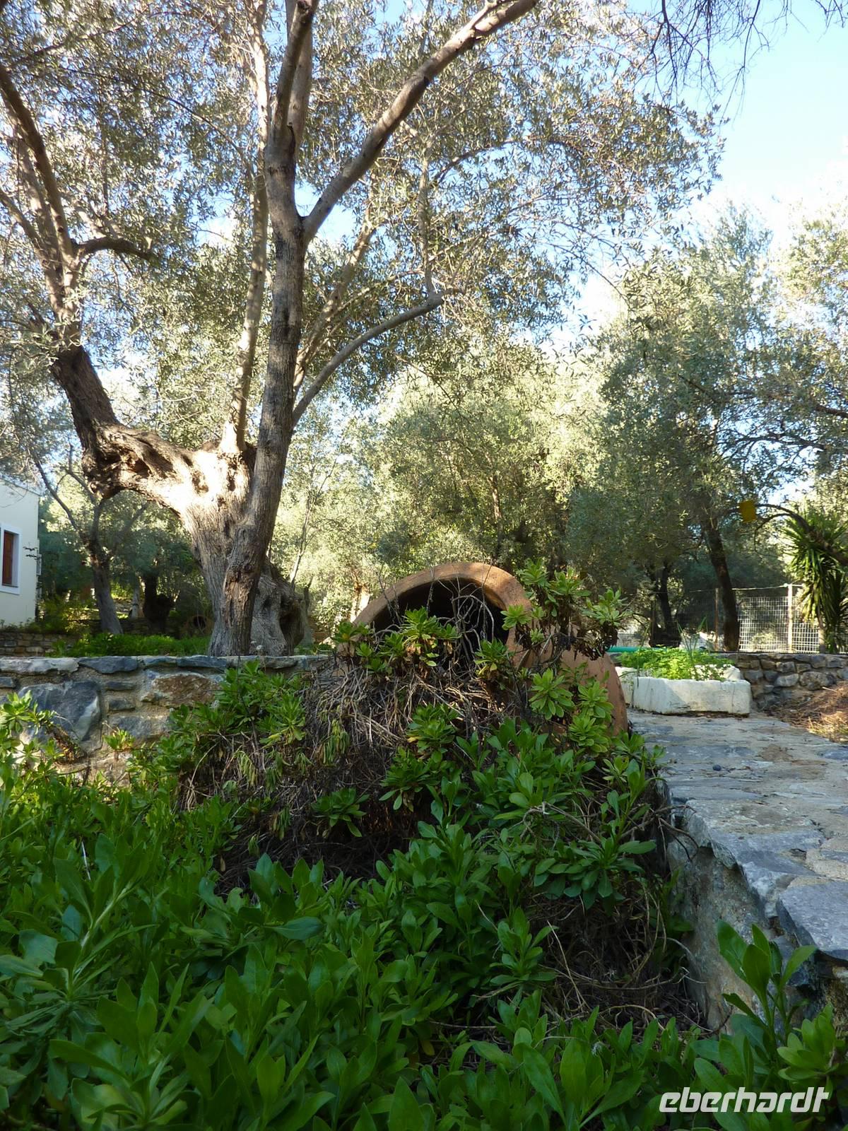 Am Morgen treffe ich 11 meiner Reiseteilnehmer am Flughafen Berlin-Tegel und gemeinsam fliegen wir zunächst nach München, wo bereits 2 weitere Teilnehmer auf uns warten. Pünktlich geht es weiter und um 13.55 Uhr erreichen wir unser Ziel. Schon beim Überfliegen der Insel kann man das üppige Grün bewundern, was eher untypisch für diese Region ist, die im Herbst meist verbrannt und sehr karg daherkommt. Der Flughafen ist winzig, kurze Wege und die Koffer laufen auch schon über das Gepäckband, kaum dass wir die Halle betreten haben. Und da erspähe ich auch schon Eva, die uns braungebrannt herzlich begrüßt. Vor dem Flughafen steht auch schon der Bus und dahinter ist bereits das Meer in Sicht. Der Himmel ist etwas wolkenverhangen, aber das war so angekündigt und ein ganz klein wenig lugt auch die Sonne durch. Aber es ist warm und ein lauer Wind weht uns um die Nase. Nach ca. 40 Minuten Fahrt erreichen wir auch schon unser Domizil für die nächsten Tage direkt am Golf von Gera gelegen - wie sagt Eva so schön - „unsere Luxus-Schafställe" - das kleine lauschige Hotel inmitten eines Olivenhains „ Olive Grove". Hier werden wir bereits vom Hausherren Alexandros erwartet. Zusammen mit seiner Mutter nehmen wir den Check-In vor. Plötzlich entlädt sich der Himmel und ein starker Regenguss erschwert das Beziehen unserer Zimmer ein wenig, denn unsere Zimmer befinden sich in kleinen Häuschen und Bungalows. Aber einer nach dem anderen gelangt dann mehr oder weniger trockenen Fußes zu seinem kleinen rustikal, aber charmant eingerichteten „Luxus-Schafstall". Wir haben ein wenig Zeit uns auszuruhen und anzukommen. Um 17.30 Uhr treffen wir uns auf der Frühstücksterrasse und Eva stellt kurz das Programm für die kommenden Tage vor. Und anschließend spazieren wir ca. 10 Minuten bis zur nächsten Taverne, in der uns ein äußerst leckeres, sehr griechisches Abendessen serviert wird, mit frischen Salaten, gegrillten Garnelen, eingelegten Sardellen, Tsatsiki natürlich... alles frisch zubereitet, einfach grandios. Dazu ein Gläschen Wein und abschließend noch einen Ouzo und wir waren rundum zufrieden.