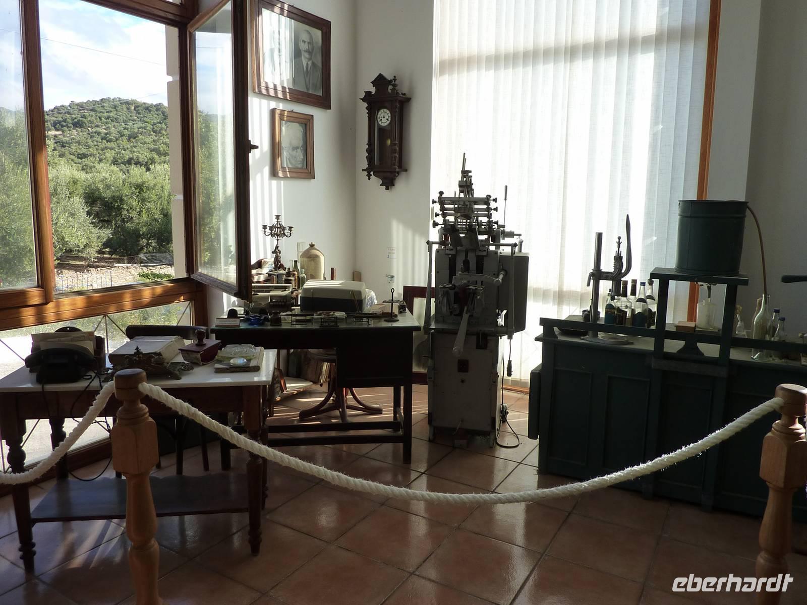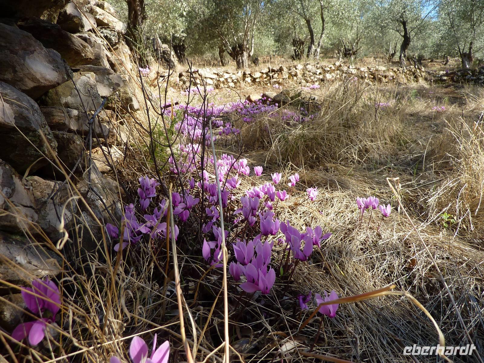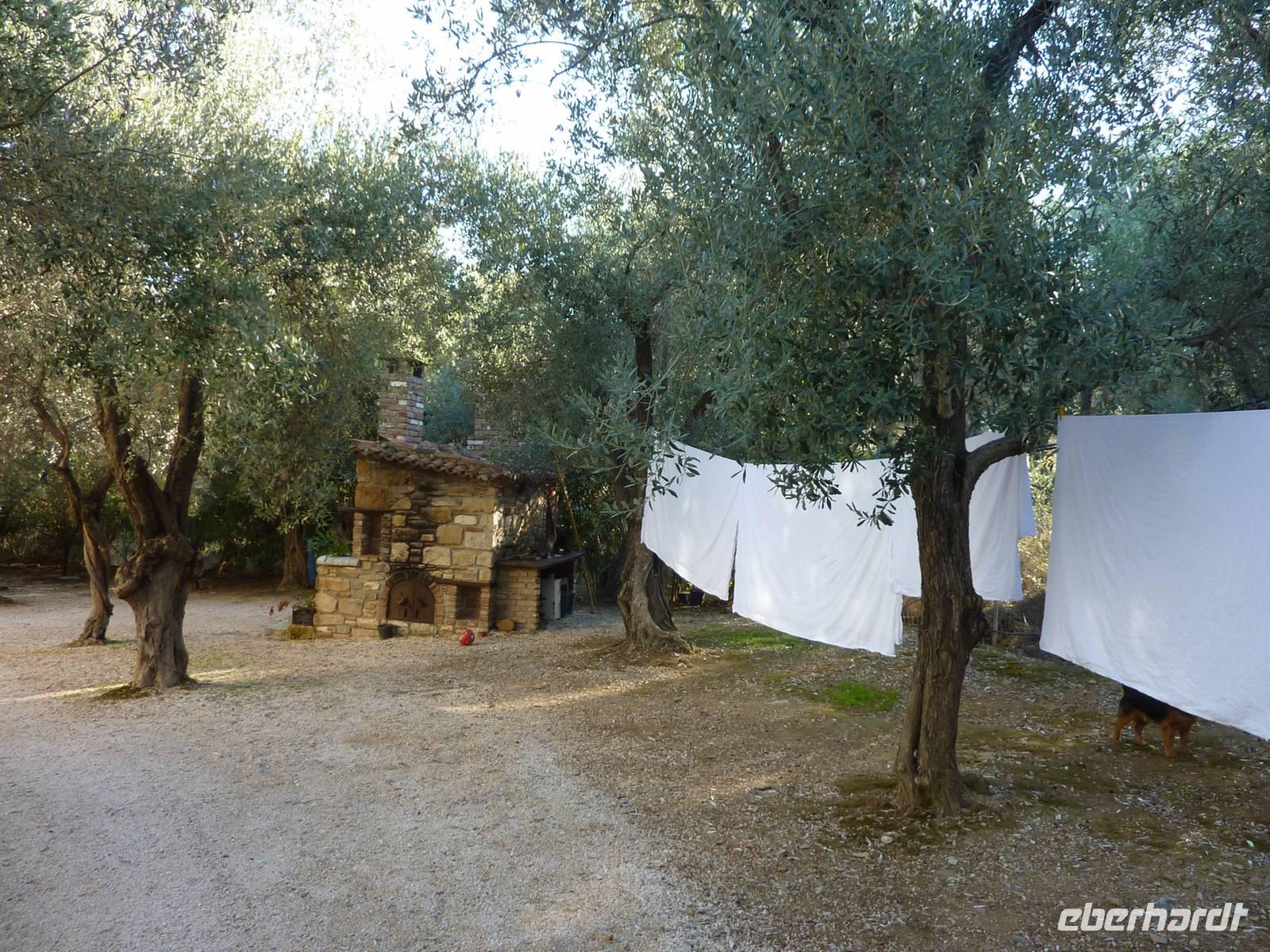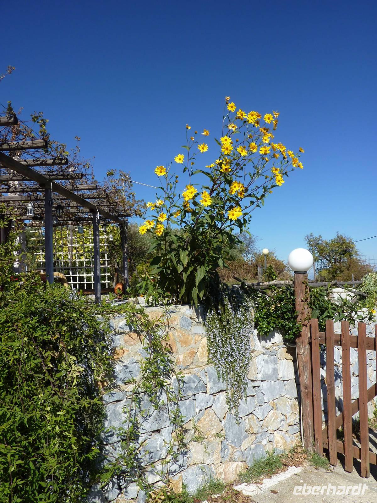 Am Morgen treffe ich 11 meiner Reiseteilnehmer am Flughafen Berlin-Tegel und gemeinsam fliegen wir zunächst nach München, wo bereits 2 weitere Teilnehmer auf uns warten. Pünktlich geht es weiter und um 13.55 Uhr erreichen wir unser Ziel. Schon beim Überfliegen der Insel kann man das üppige Grün bewundern, was eher untypisch für diese Region ist, die im Herbst meist verbrannt und sehr karg daherkommt. Der Flughafen ist winzig, kurze Wege und die Koffer laufen auch schon über das Gepäckband, kaum dass wir die Halle betreten haben. Und da erspähe ich auch schon Eva, die uns braungebrannt herzlich begrüßt. Vor dem Flughafen steht auch schon der Bus und dahinter ist bereits das Meer in Sicht. Der Himmel ist etwas wolkenverhangen, aber das war so angekündigt und ein ganz klein wenig lugt auch die Sonne durch. Aber es ist warm und ein lauer Wind weht uns um die Nase. Nach ca. 40 Minuten Fahrt erreichen wir auch schon unser Domizil für die nächsten Tage direkt am Golf von Gera gelegen - wie sagt Eva so schön - „unsere Luxus-Schafställe" - das kleine lauschige Hotel inmitten eines Olivenhains „ Olive Grove". Hier werden wir bereits vom Hausherren Alexandros erwartet. Zusammen mit seiner Mutter nehmen wir den Check-In vor. Plötzlich entlädt sich der Himmel und ein starker Regenguss erschwert das Beziehen unserer Zimmer ein wenig, denn unsere Zimmer befinden sich in kleinen Häuschen und Bungalows. Aber einer nach dem anderen gelangt dann mehr oder weniger trockenen Fußes zu seinem kleinen rustikal, aber charmant eingerichteten „Luxus-Schafstall". Wir haben ein wenig Zeit uns auszuruhen und anzukommen. Um 17.30 Uhr treffen wir uns auf der Frühstücksterrasse und Eva stellt kurz das Programm für die kommenden Tage vor. Und anschließend spazieren wir ca. 10 Minuten bis zur nächsten Taverne, in der uns ein äußerst leckeres, sehr griechisches Abendessen serviert wird, mit frischen Salaten, gegrillten Garnelen, eingelegten Sardellen, Tsatsiki natürlich... alles frisch zubereitet, einfach grandios. Dazu ein Gläschen Wein und abschließend noch einen Ouzo und wir waren rundum zufrieden.