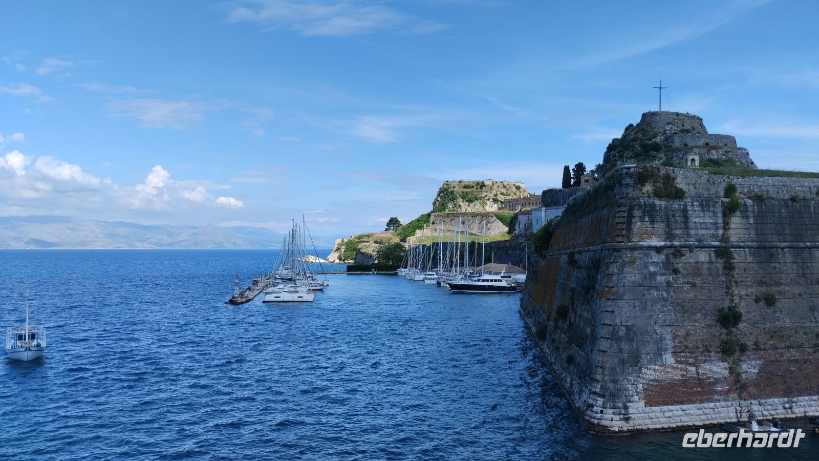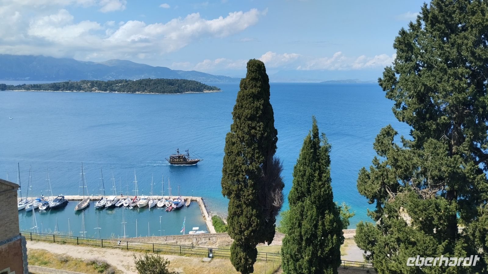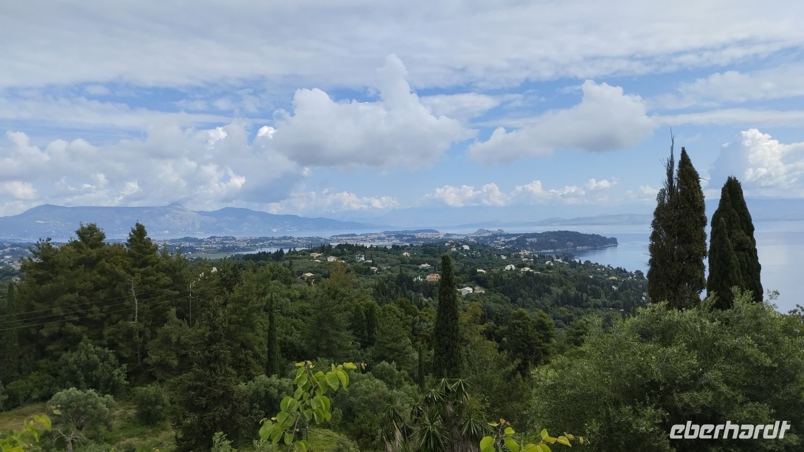 Wieder an Land angekommen, laufen wir die Treppen hoch bis zu dem Parkplatz mit einer schönen Aussicht und setzen unsere Reise zur Korfu-Stadt fort.
