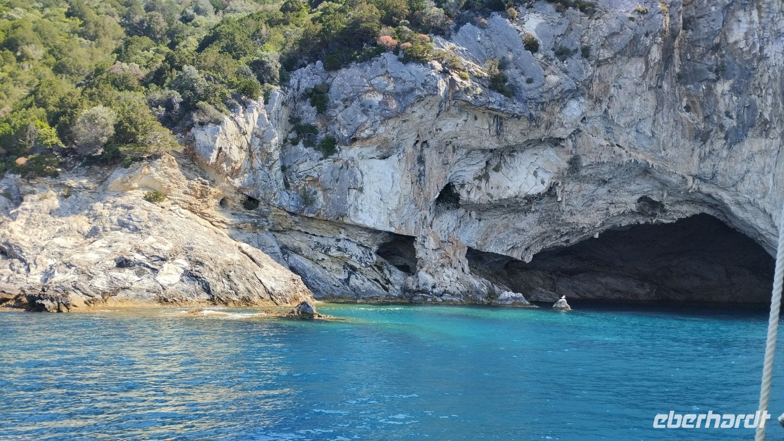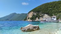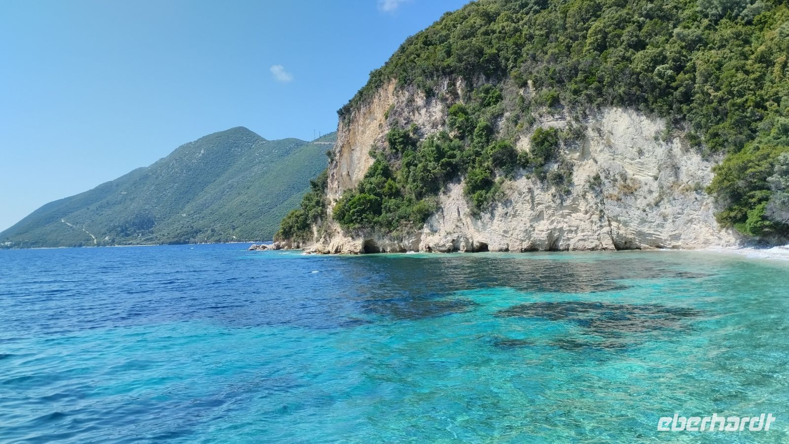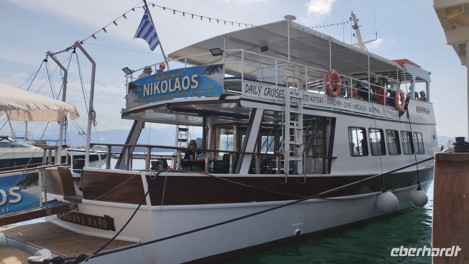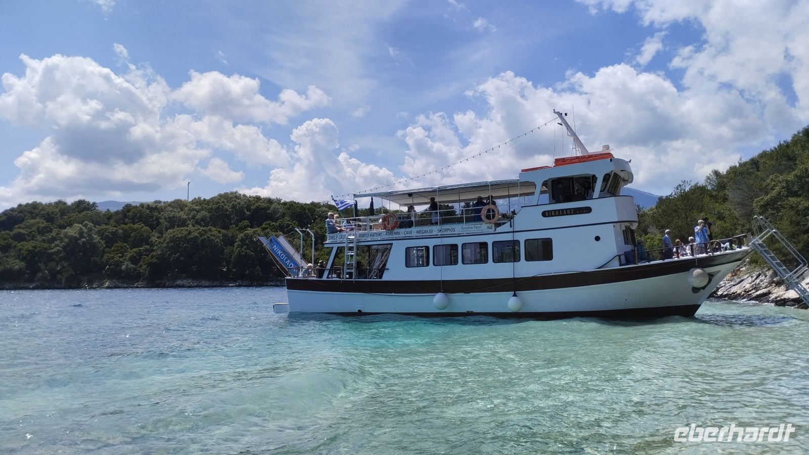 An diesem sonnigen Tag unternehmen wir eine Bootsfahrt von dem Ort Nidri auf der Insel Lefkada zu den anderen Ionischen Inseln - Maduri, Skorpios und Meganisi. Unterwegs sehen wir die Höhle Papanikolis und machen insgesamt zwei Badestopps. Da die Wassertemperatur noch recht kühl ist, gehen nur wenige baden.