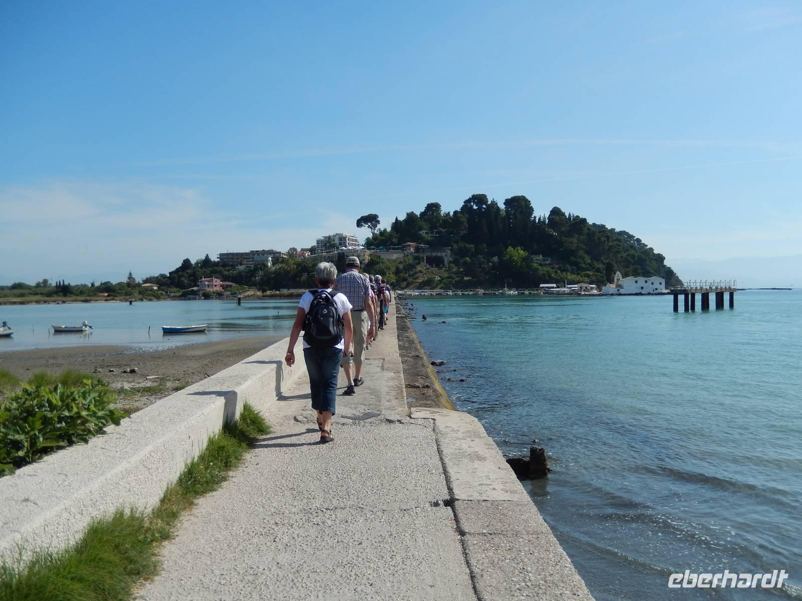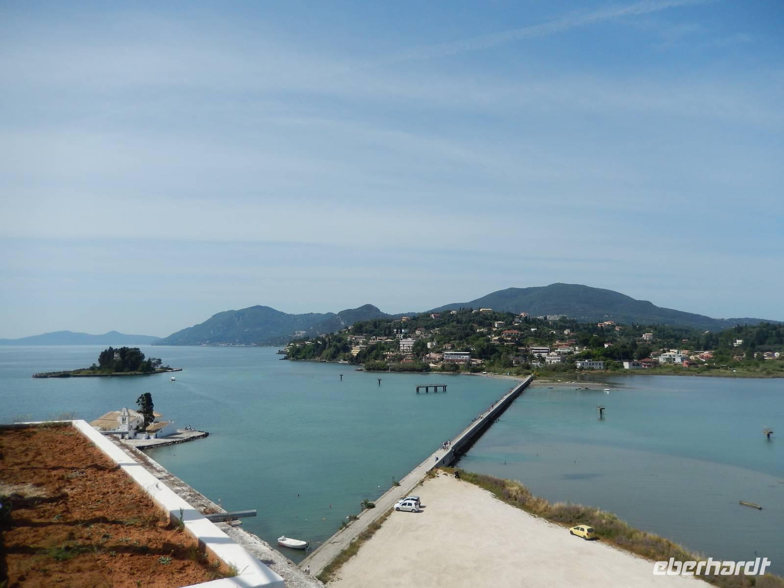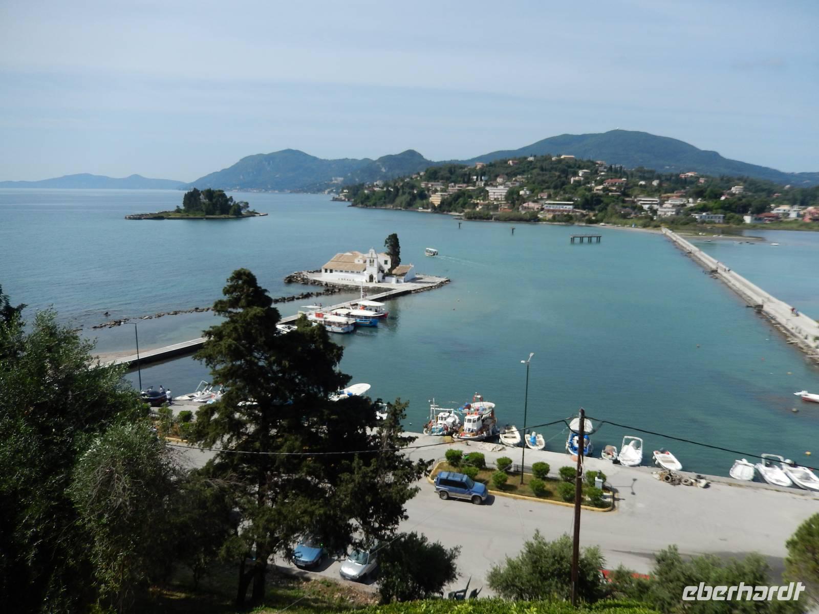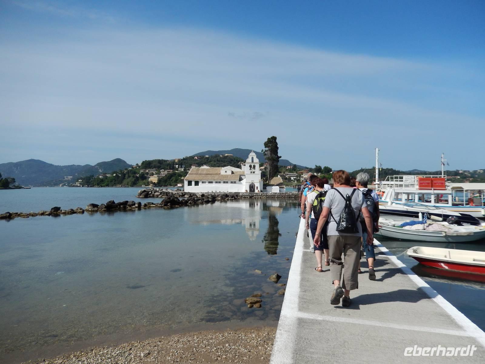 Nachdem alle Reisegäste von Dresden und Leipzig schließlich vereint war, freuten wir uns auf einen Wanderausflug in die Inselshauptstadt Korfu-Stadt. Auf der Fahrt dahin stieß unsere korfiotische Reiseleiterin Eleni zu uns, die uns mit einem griechischen „Kalimera", also Guten Morgen, begrüßte. Wir fuhren weiter südlich zum beschaulichen Kloster Vlacherna, welches nur über einen schmalen Zementsteg zu erreichen war. Von außen sieht es mit seinem weißen Glockensegel sehr reizvoll aus, im kleinen Klosterinnenhof, stechen die üppigen Pflanzen und das kleine Geschäft ins Auge. Anschließend stiegen wir dann zum Aussichtspunkt auf und hatten einen tollen Blick auf das Kloster mit der dahinterliegenden Mäuseinsel und konnten nebenbei noch einigen Fliegern beim Start bzw. Landen zusehen. Ein eindrucksvolles Schauspiel. Nach einer kurzen Pause fuhr uns unser Fahrer Menios zur Parkanlage Mon Repos, durch die wir durch spazierten. Eleni erkläre uns alle Begebenheiten in ihrer Kurzfassung bevor wir weiter wanderten in das Zentrum der Hauptstadt. Vorbei am Markt und der neuen Festung schauten wir in einer traditionellen Olivenseifenmanufaktur rein und schlenderten über den Markt. Dann hatten wir uns eine Pause in einer korfiotischen Taverne redlich verdient. Als Abschluss unseres Stadtbesuches besichtigten wir noch kurz die eindrucksvolle Kirche der beiden Heiligen Jason und Sosipatros und die Alte venezianische Festung. Nach einem etwas mühsamen Aufstieg wurden wir mit einer grandiosen Aussicht auf Korfu-Stadt und dem dahinterliegenden Gebirge entschädigt. Nun machten wir uns wieder auf dem Weg ins Hotel, um bei einem leckeren Abendessen den Tag Revue passieren zu lassen.