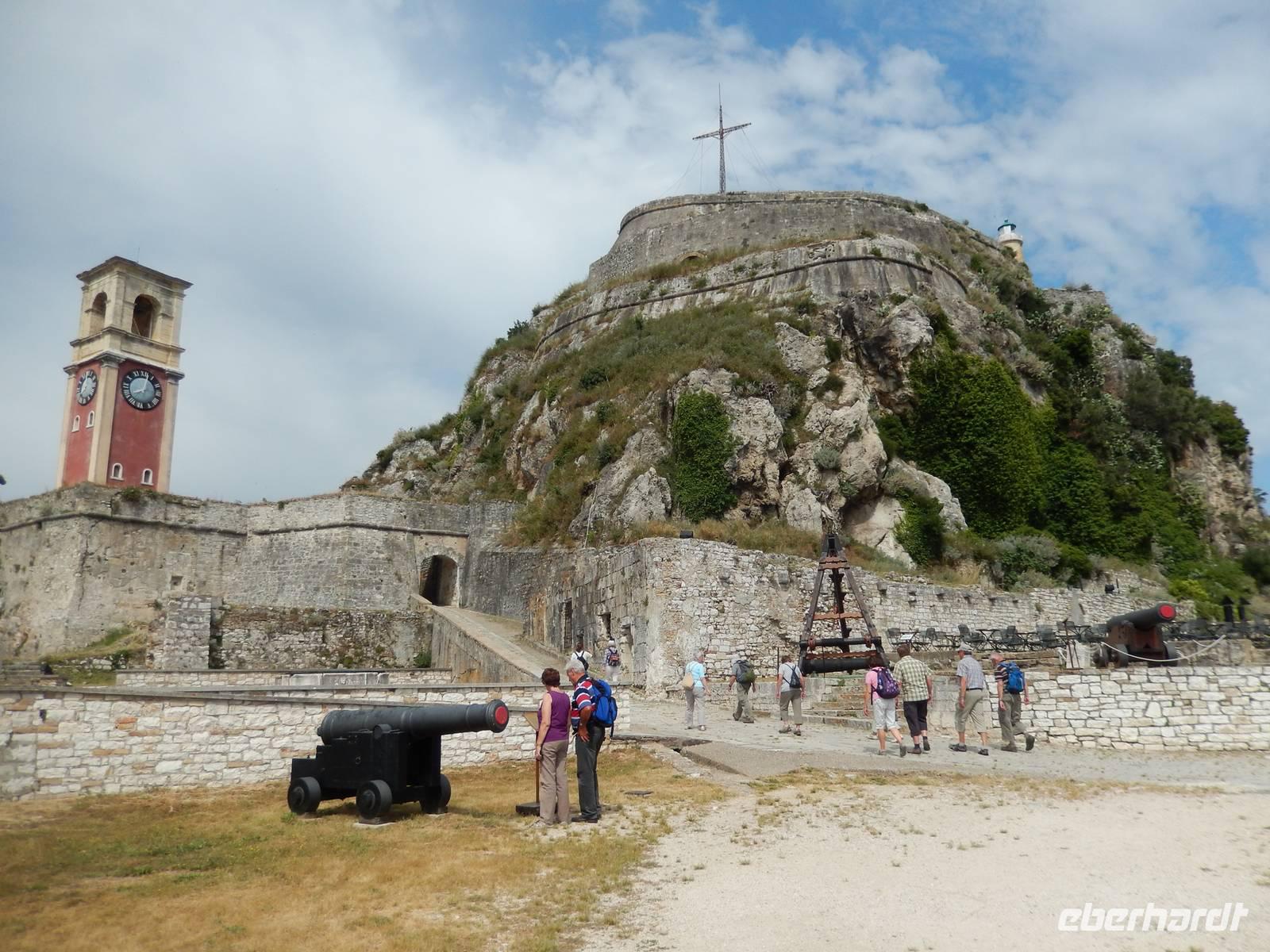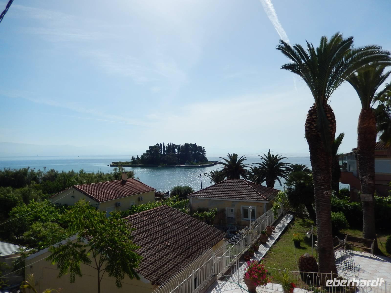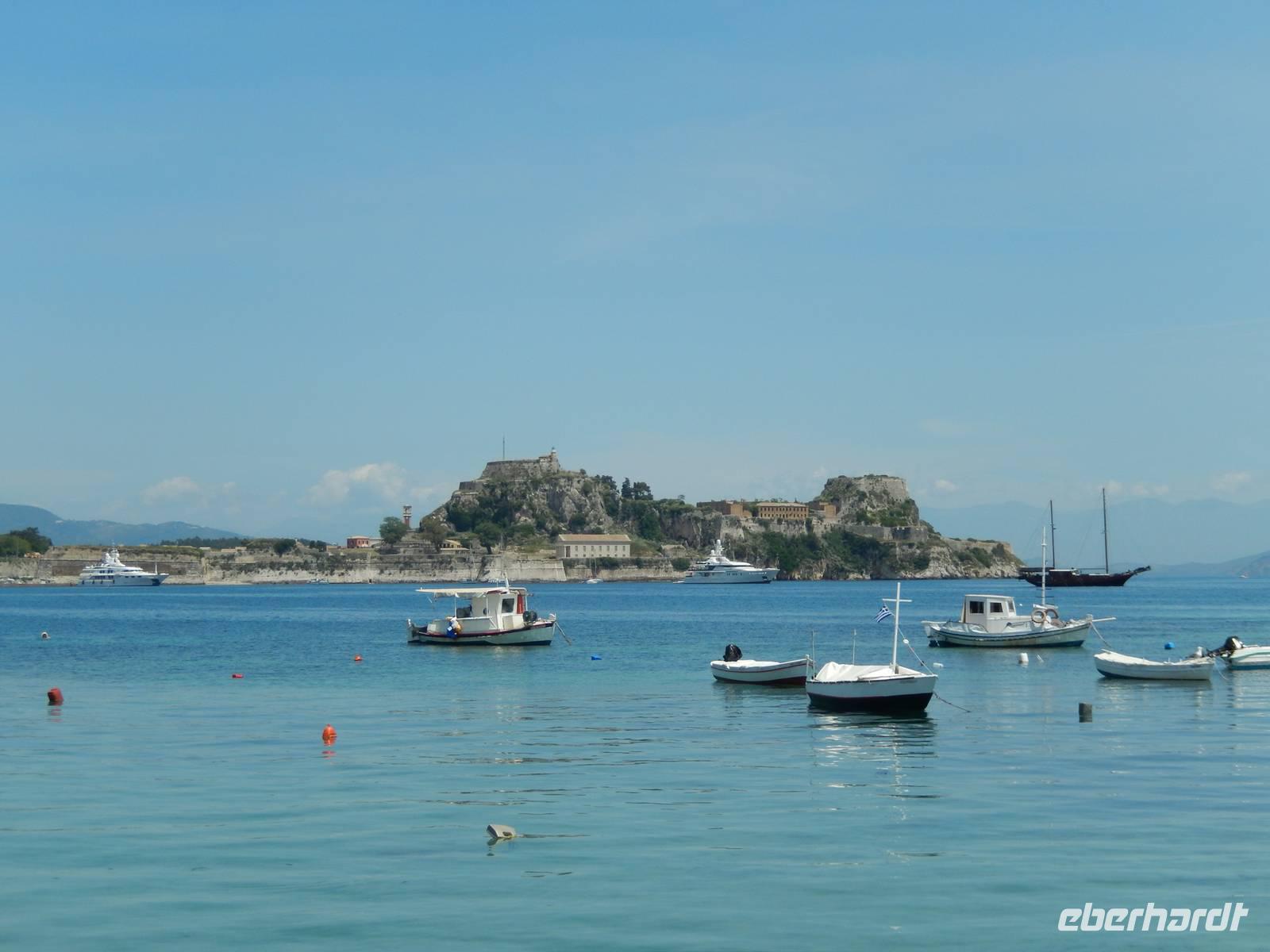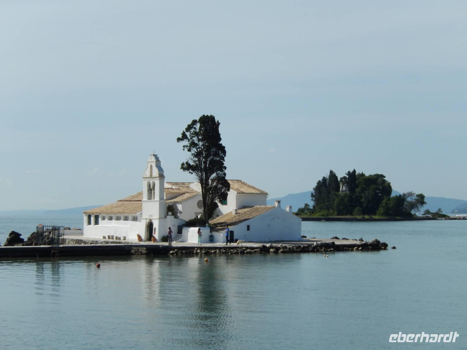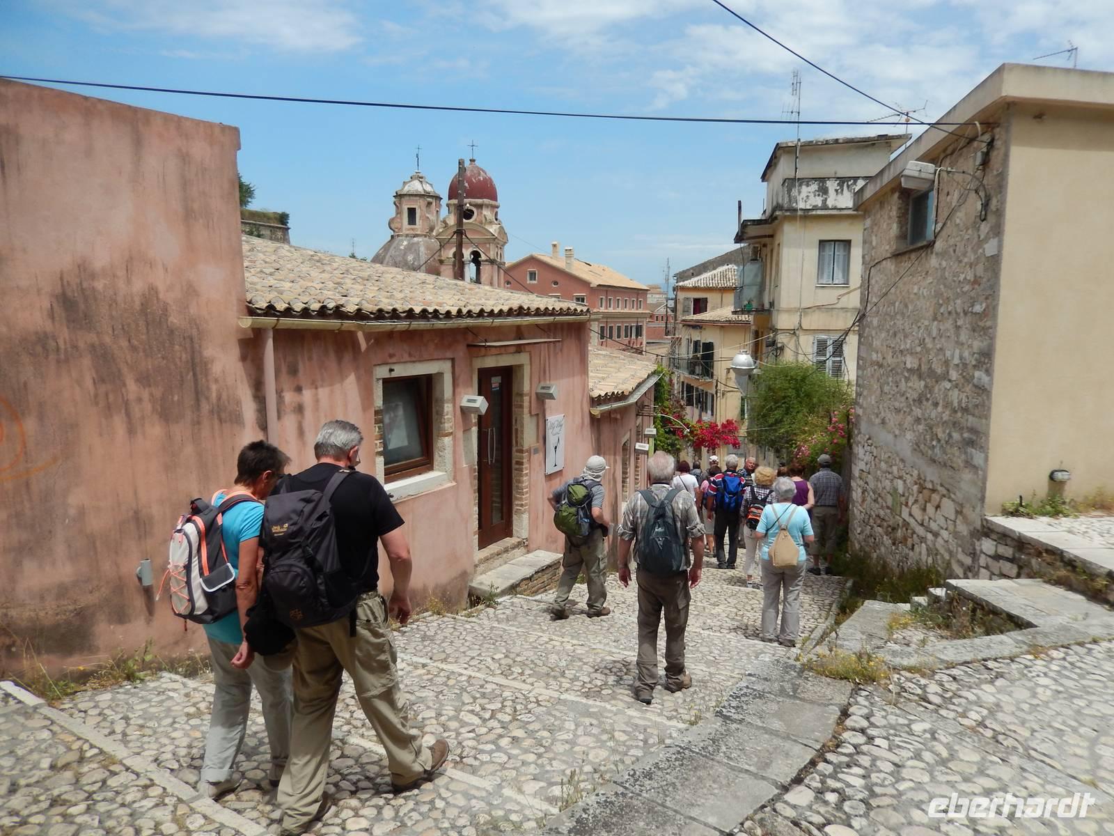 Nachdem alle Reisegäste von Dresden und Leipzig schließlich vereint war, freuten wir uns auf einen Wanderausflug in die Inselshauptstadt Korfu-Stadt. Auf der Fahrt dahin stieß unsere korfiotische Reiseleiterin Eleni zu uns, die uns mit einem griechischen „Kalimera", also Guten Morgen, begrüßte. Wir fuhren weiter südlich zum beschaulichen Kloster Vlacherna, welches nur über einen schmalen Zementsteg zu erreichen war. Von außen sieht es mit seinem weißen Glockensegel sehr reizvoll aus, im kleinen Klosterinnenhof, stechen die üppigen Pflanzen und das kleine Geschäft ins Auge. Anschließend stiegen wir dann zum Aussichtspunkt auf und hatten einen tollen Blick auf das Kloster mit der dahinterliegenden Mäuseinsel und konnten nebenbei noch einigen Fliegern beim Start bzw. Landen zusehen. Ein eindrucksvolles Schauspiel. Nach einer kurzen Pause fuhr uns unser Fahrer Menios zur Parkanlage Mon Repos, durch die wir durch spazierten. Eleni erkläre uns alle Begebenheiten in ihrer Kurzfassung bevor wir weiter wanderten in das Zentrum der Hauptstadt. Vorbei am Markt und der neuen Festung schauten wir in einer traditionellen Olivenseifenmanufaktur rein und schlenderten über den Markt. Dann hatten wir uns eine Pause in einer korfiotischen Taverne redlich verdient. Als Abschluss unseres Stadtbesuches besichtigten wir noch kurz die eindrucksvolle Kirche der beiden Heiligen Jason und Sosipatros und die Alte venezianische Festung. Nach einem etwas mühsamen Aufstieg wurden wir mit einer grandiosen Aussicht auf Korfu-Stadt und dem dahinterliegenden Gebirge entschädigt. Nun machten wir uns wieder auf dem Weg ins Hotel, um bei einem leckeren Abendessen den Tag Revue passieren zu lassen.