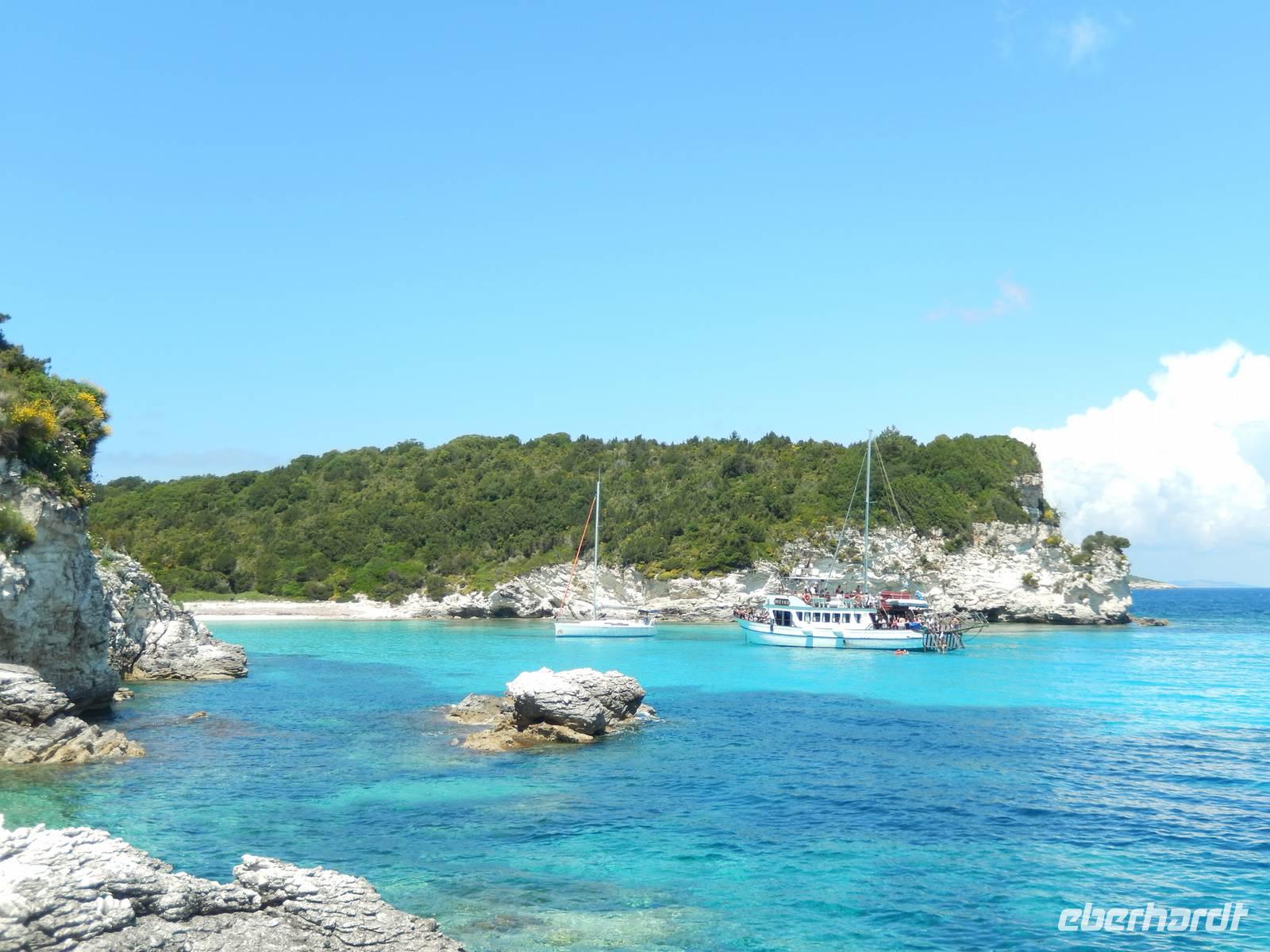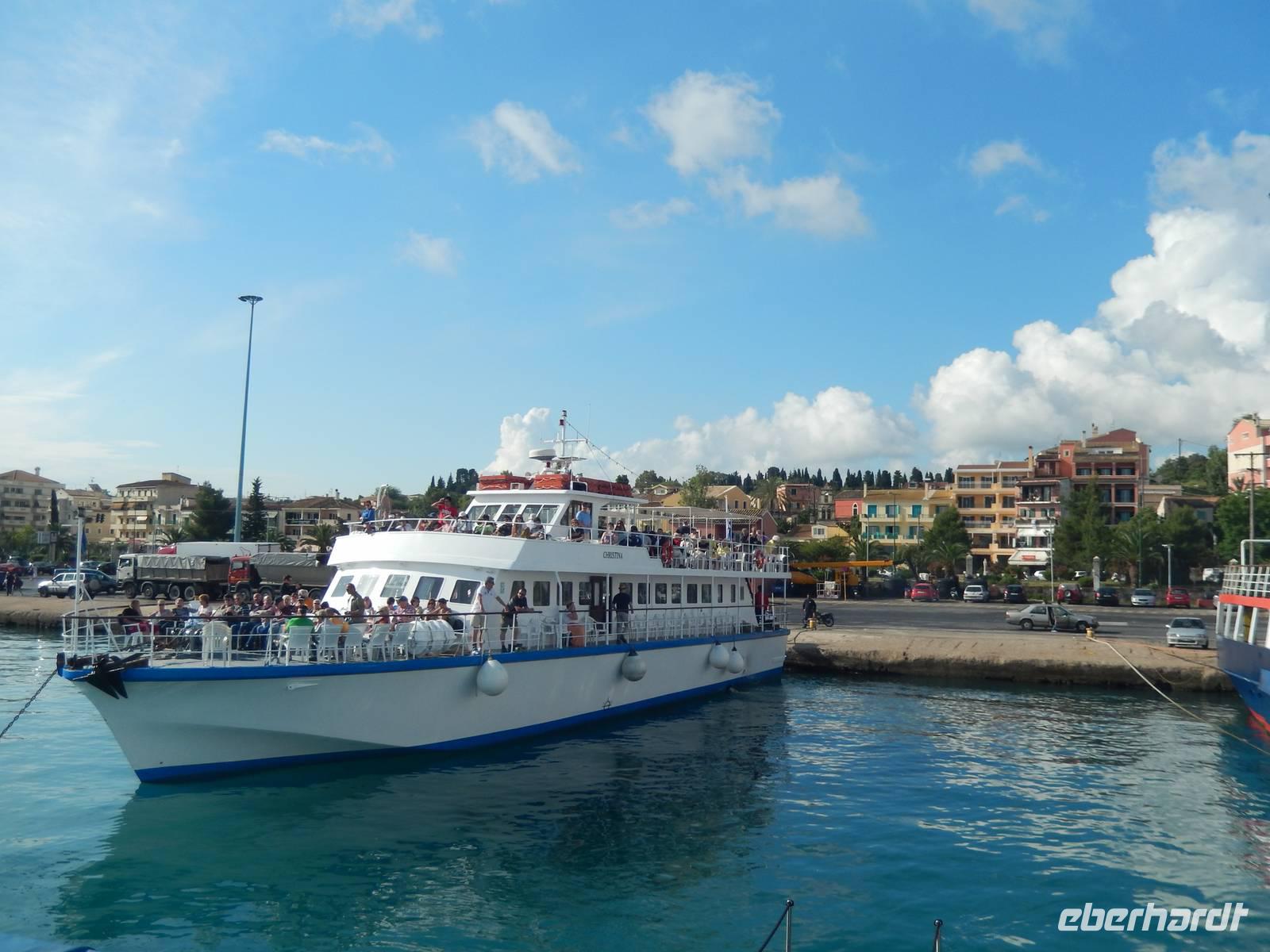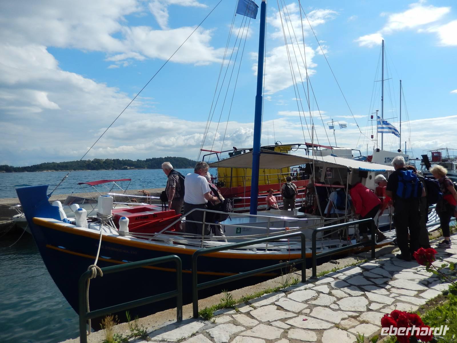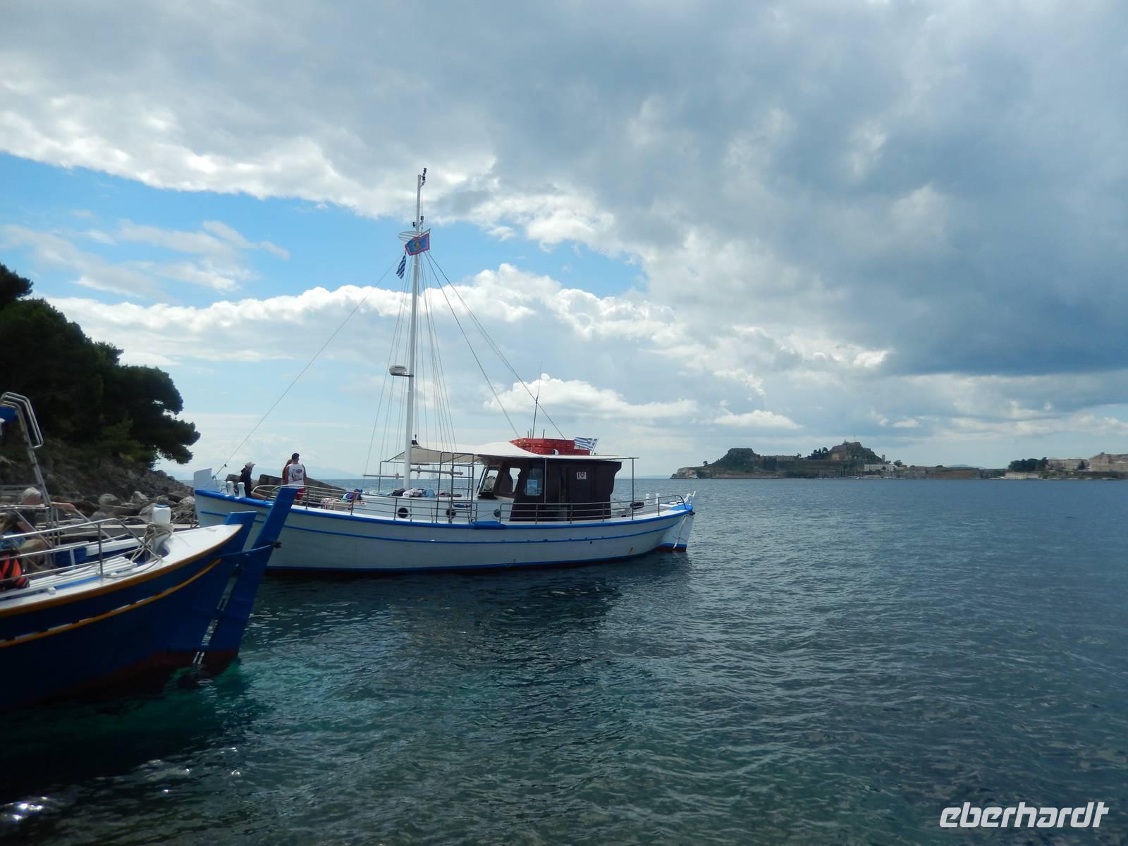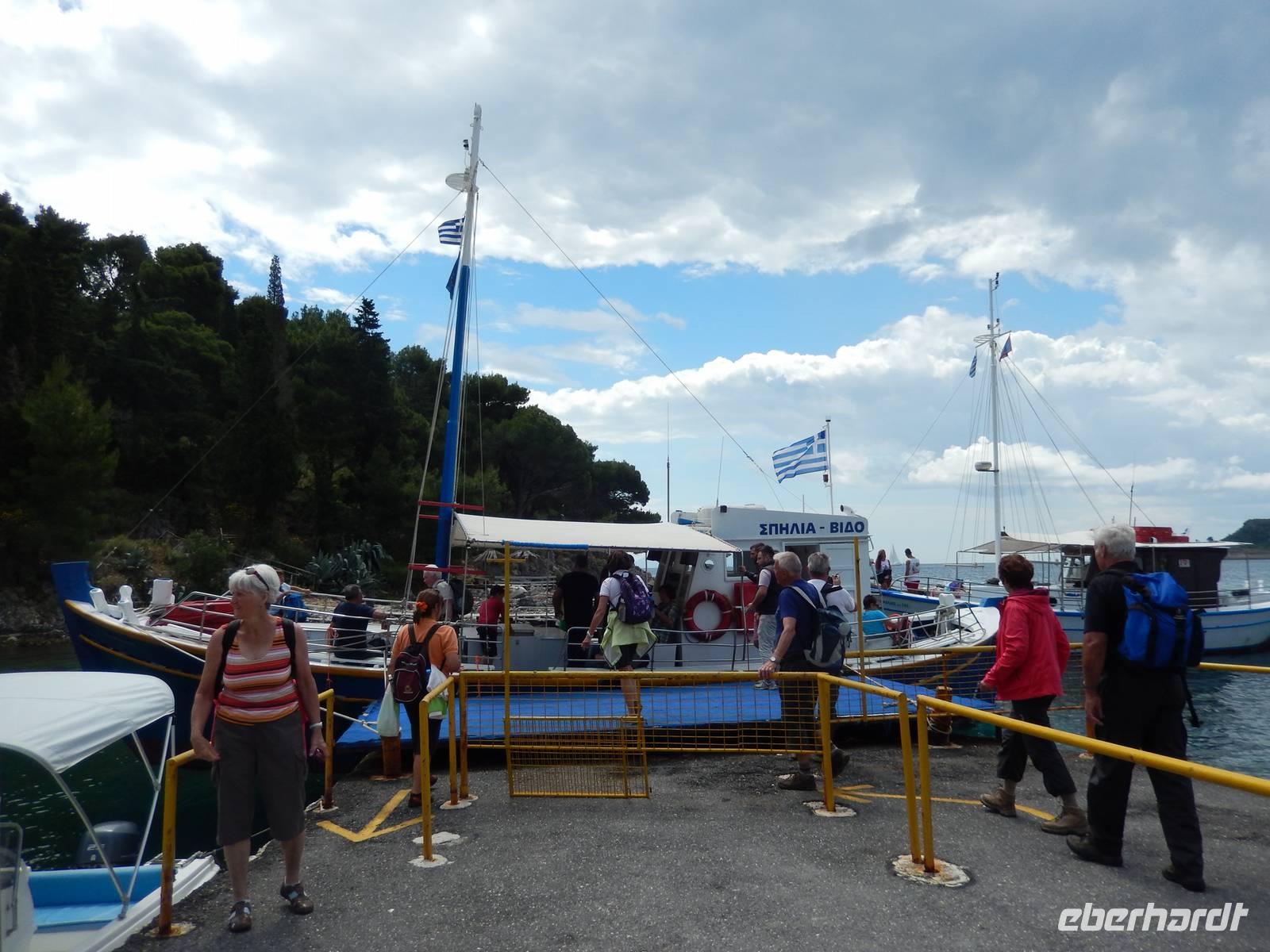 Heute gönnten wir unseren Wanderstiefeln ein kleines Päuschen und schnürten unseren Ausflugsrucksack für eine Mini-Kreuzfahrt nach Antipaxos und Paxos. Wer dies nicht wollte, hatte dafür heute frei und konnte den Tag individuell gestalten. Nachdem wir eine regenreiche Nacht hinter uns hatten und wir alles andere als optimistisch in die Wetterprognosen gingen, war widerum bei der Ankunft in Korfu-Stadt von den dunklen Regenwolken kaum noch etwas zu sehen. Es klarte auf und wir gingen an Board der „Ionnian Sun" und verweilten getreu dem Namen natürlich auf dem Sonnendeck. Wir schipperten entlang der Ostküste in den Süden, vorbei an der Alten Festung der Stadt, Benitses und schließlich waren wir ganz auf dem offenen Meer und ließen uns die salzige Briese um die Nase wehen. Zuerst fuhren wir in die Grotten von Paxos, in die widererwartend das Boot hineinfahren konnte und wir nur noch staunen konnten über die meterhohen Felswände und die Gebilde, die die Natur so geschaffen hatte. Dann ging es weiter auf die kleine Insel Antipaxos, die nur 20 Inselbewohner hat und bekannt ist für ihre kristallklaren und türkisblauen Badebuchten. Dort stoppten wir und einige nutzten die Zeit für ein Bad im erfrischenden Meer. Herrlich! Weiter ging es nun zum Hauptort der Insel Paxos, nach Gaios. Dort hatten wir einen 2-stündigen Aufenthalt um die kleinen Gassen mit seinen Tavernen, traditionellen Geschäften und die Hafenpromenade kennenzulernen und einfach nur die Seele baumeln zu lassen. Nun stand wieder eine knapp 3-stündige Rückfahrt von Gaios nach Korfu-Stadt auf dem Programm, aber da uns Petrus immer noch wohlgesonnen war, genossen wir die gute Luft und ließen die vielen neuen Eindrücke Revue passieren.