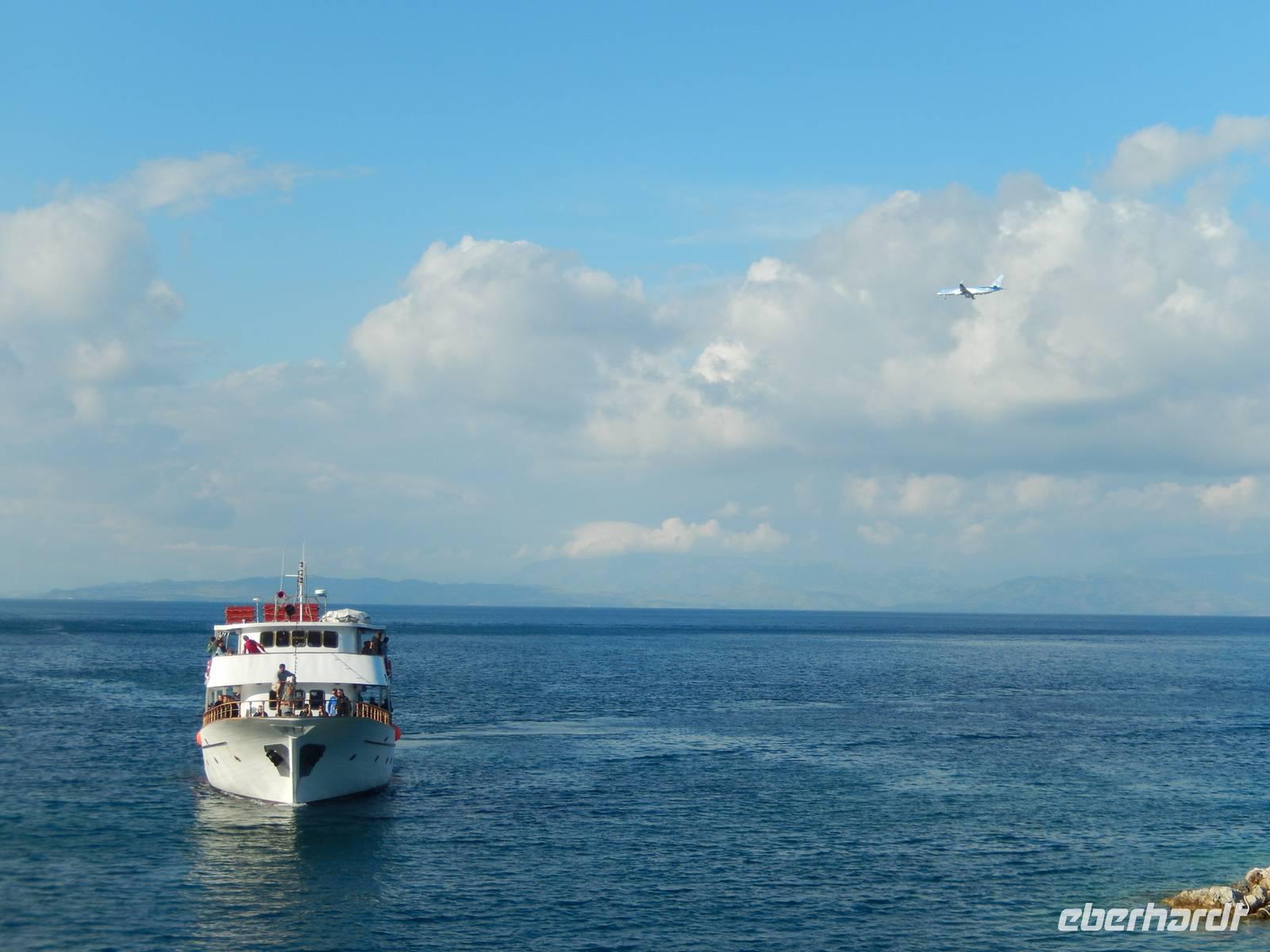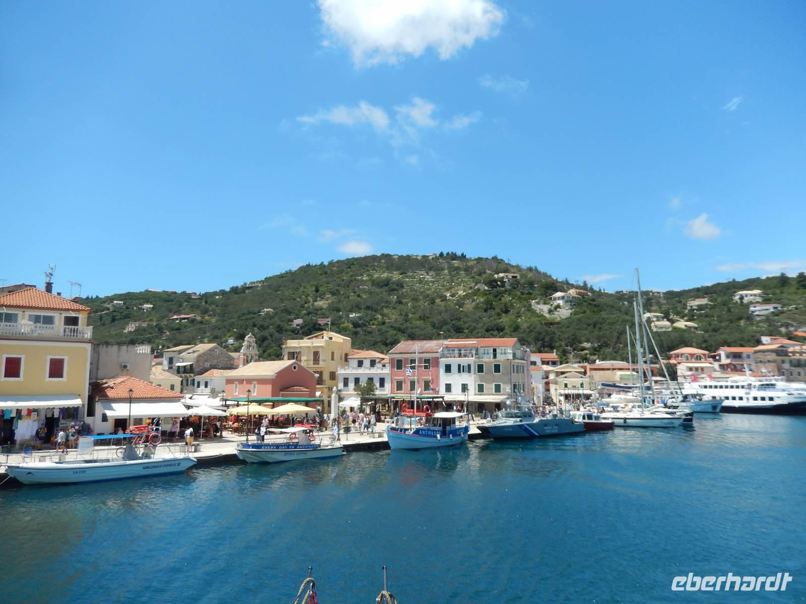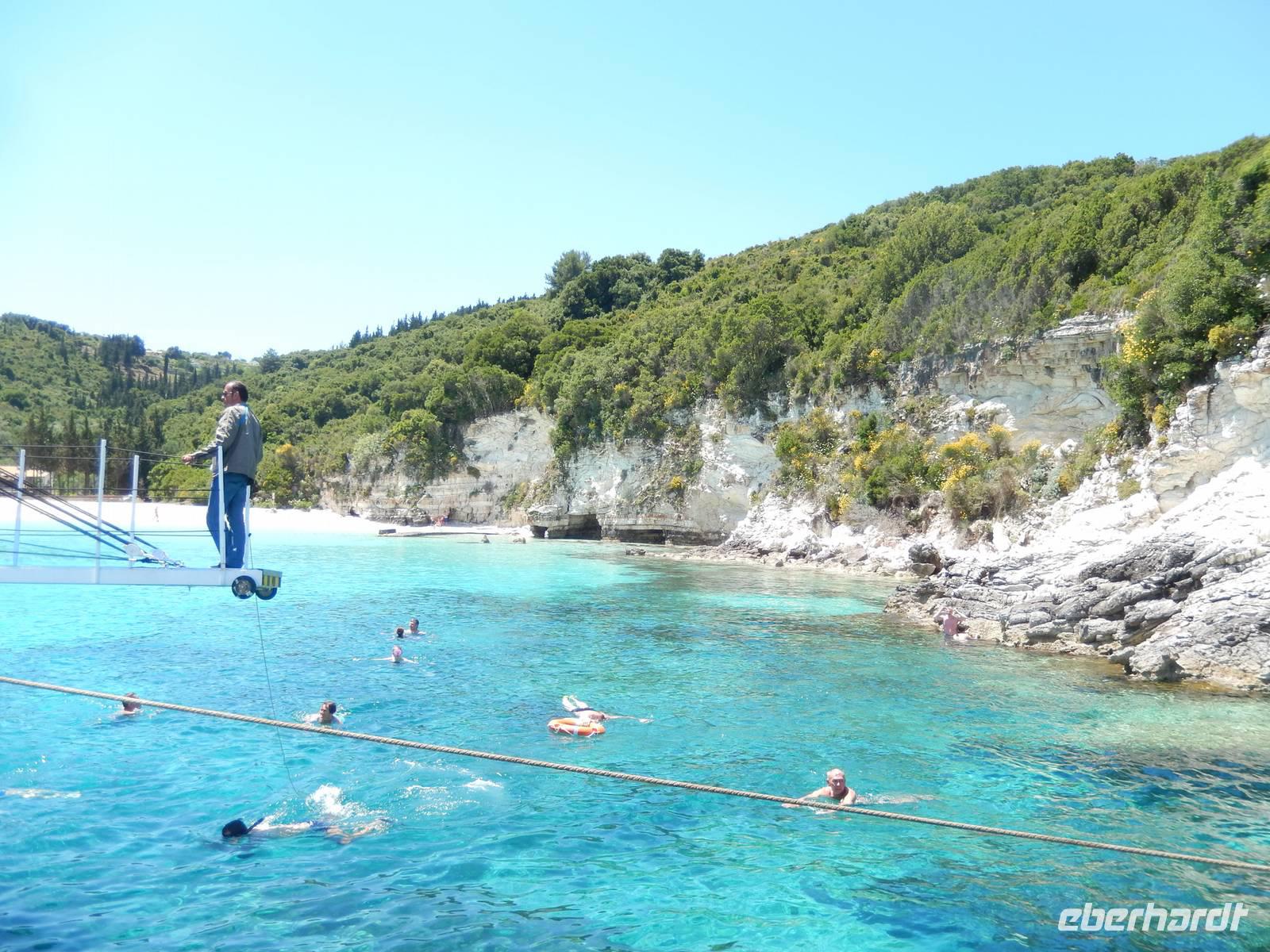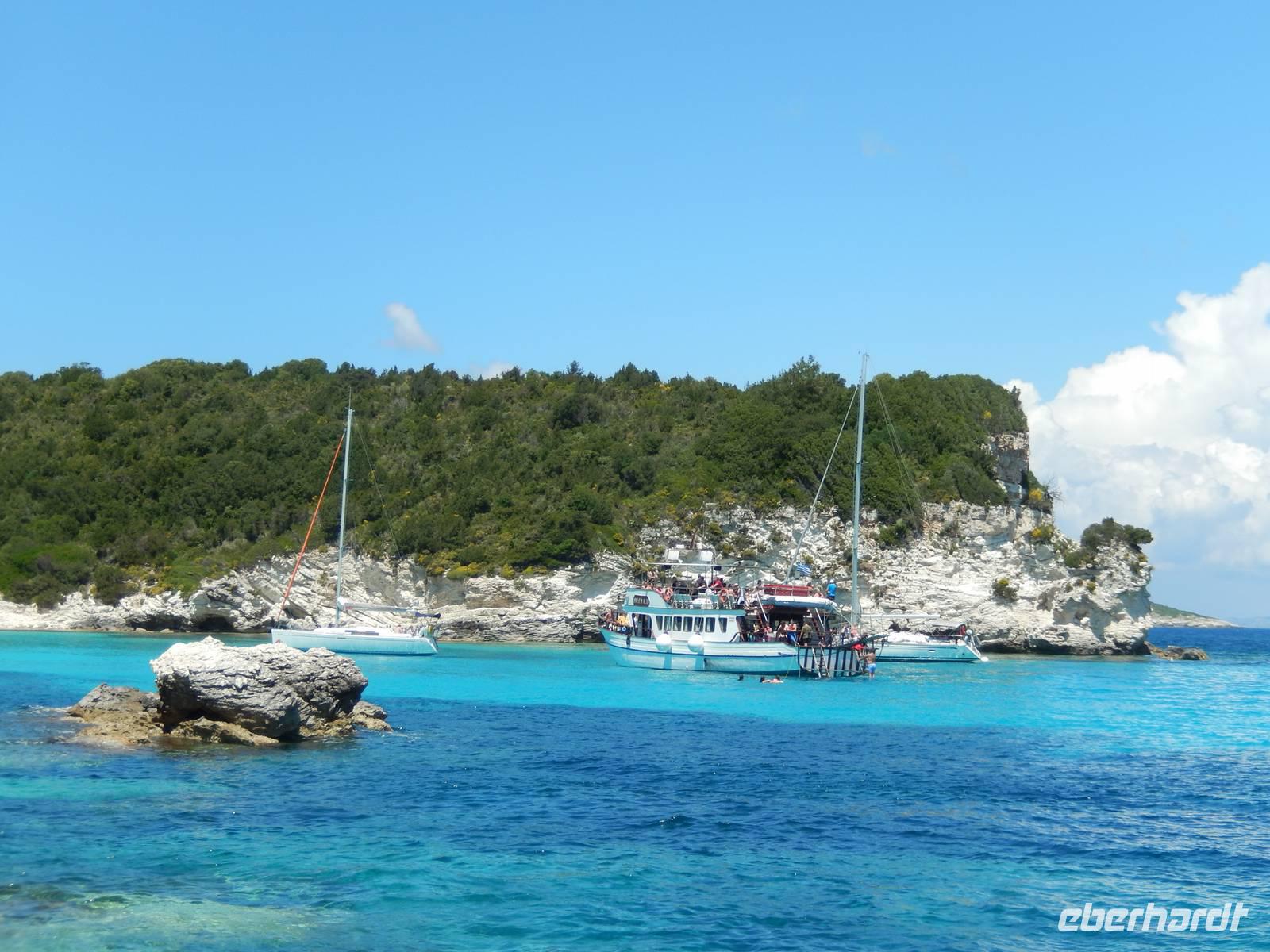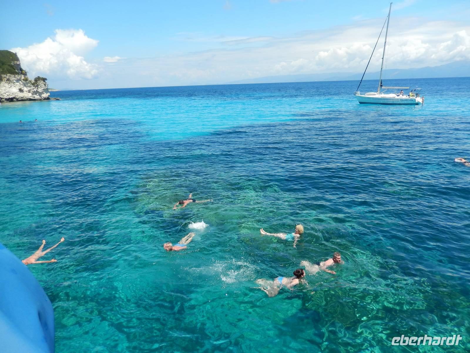 Heute gönnten wir unseren Wanderstiefeln ein kleines Päuschen und schnürten unseren Ausflugsrucksack für eine Mini-Kreuzfahrt nach Antipaxos und Paxos. Wer dies nicht wollte, hatte dafür heute frei und konnte den Tag individuell gestalten. Nachdem wir eine regenreiche Nacht hinter uns hatten und wir alles andere als optimistisch in die Wetterprognosen gingen, war widerum bei der Ankunft in Korfu-Stadt von den dunklen Regenwolken kaum noch etwas zu sehen. Es klarte auf und wir gingen an Board der „Ionnian Sun" und verweilten getreu dem Namen natürlich auf dem Sonnendeck. Wir schipperten entlang der Ostküste in den Süden, vorbei an der Alten Festung der Stadt, Benitses und schließlich waren wir ganz auf dem offenen Meer und ließen uns die salzige Briese um die Nase wehen. Zuerst fuhren wir in die Grotten von Paxos, in die widererwartend das Boot hineinfahren konnte und wir nur noch staunen konnten über die meterhohen Felswände und die Gebilde, die die Natur so geschaffen hatte. Dann ging es weiter auf die kleine Insel Antipaxos, die nur 20 Inselbewohner hat und bekannt ist für ihre kristallklaren und türkisblauen Badebuchten. Dort stoppten wir und einige nutzten die Zeit für ein Bad im erfrischenden Meer. Herrlich! Weiter ging es nun zum Hauptort der Insel Paxos, nach Gaios. Dort hatten wir einen 2-stündigen Aufenthalt um die kleinen Gassen mit seinen Tavernen, traditionellen Geschäften und die Hafenpromenade kennenzulernen und einfach nur die Seele baumeln zu lassen. Nun stand wieder eine knapp 3-stündige Rückfahrt von Gaios nach Korfu-Stadt auf dem Programm, aber da uns Petrus immer noch wohlgesonnen war, genossen wir die gute Luft und ließen die vielen neuen Eindrücke Revue passieren.