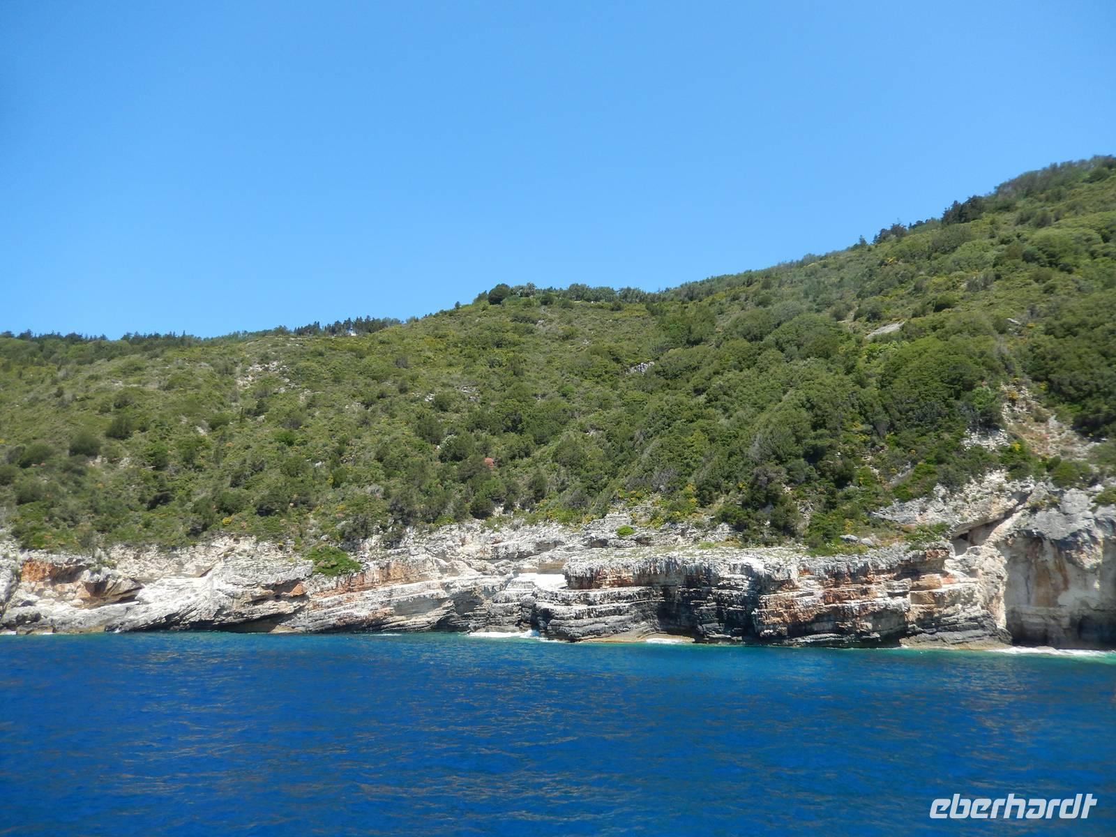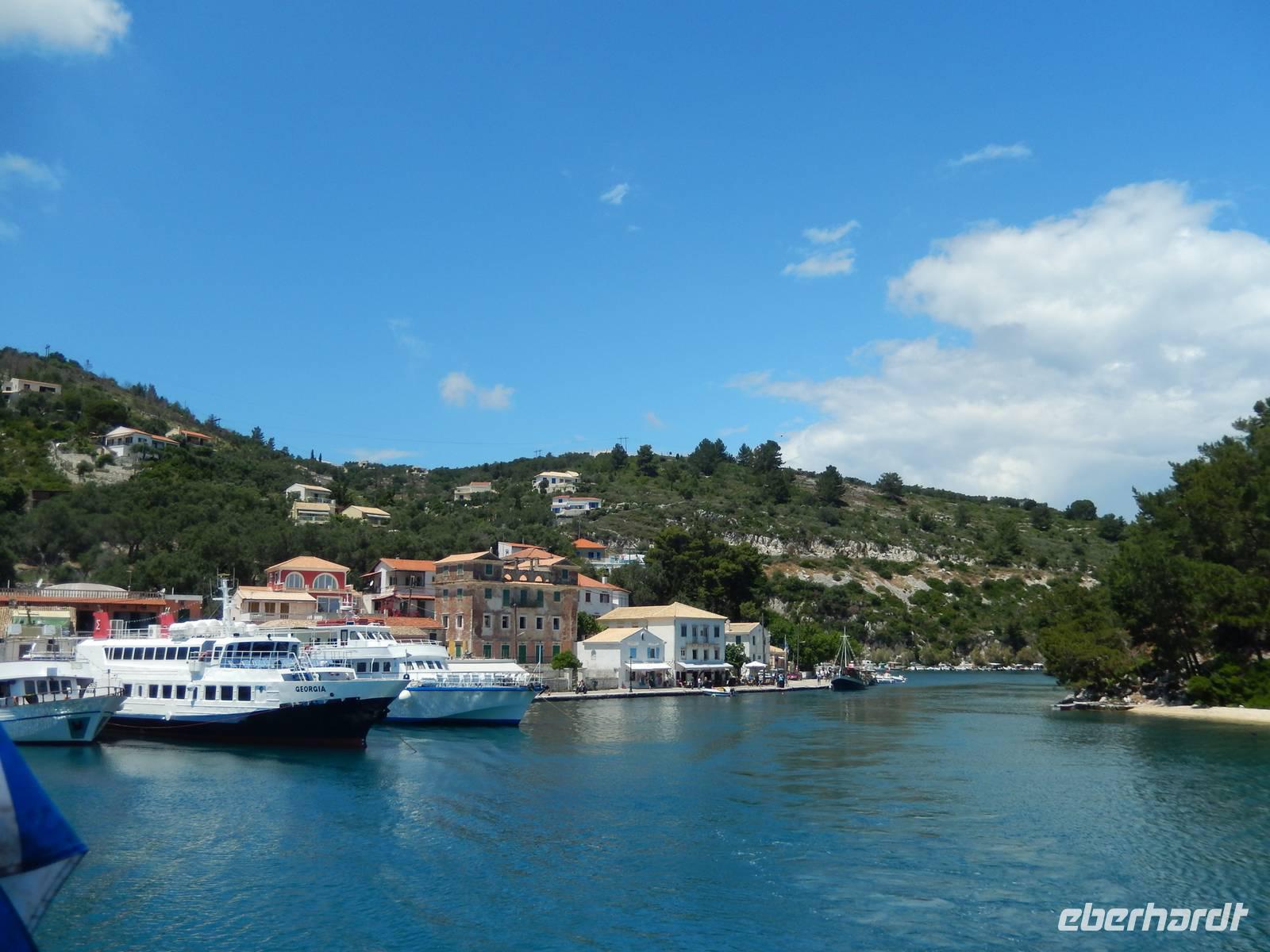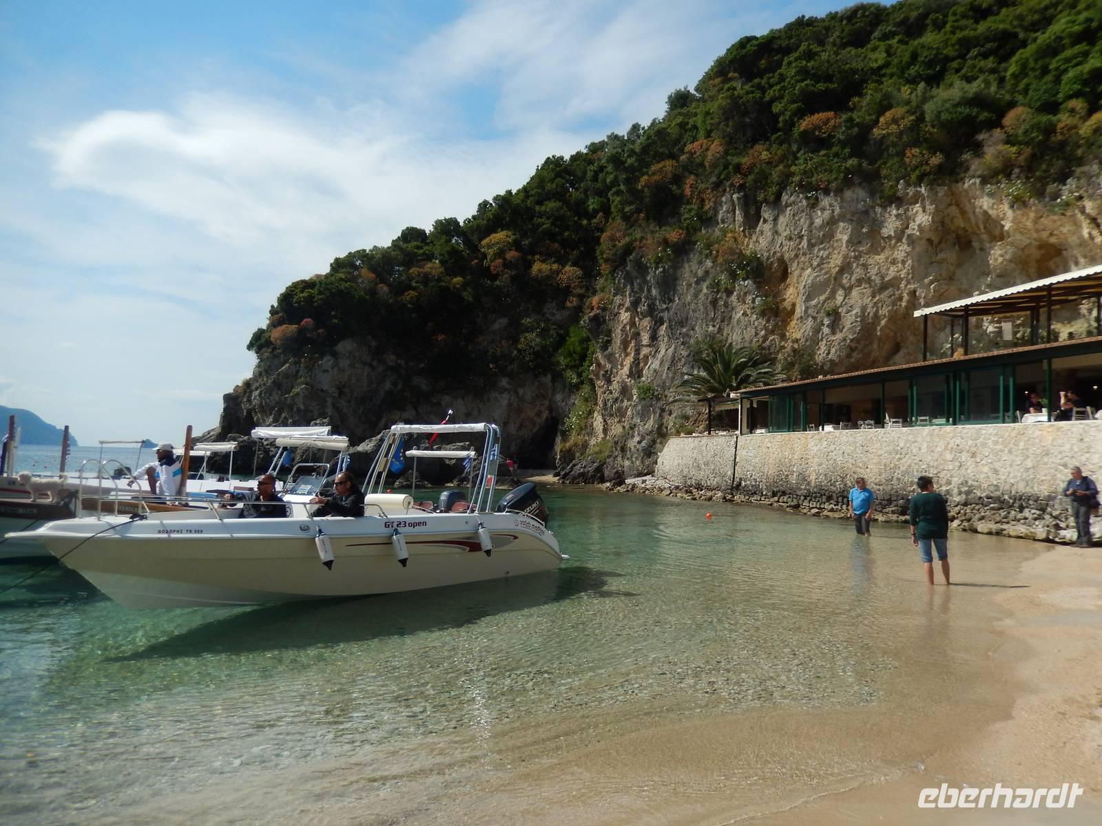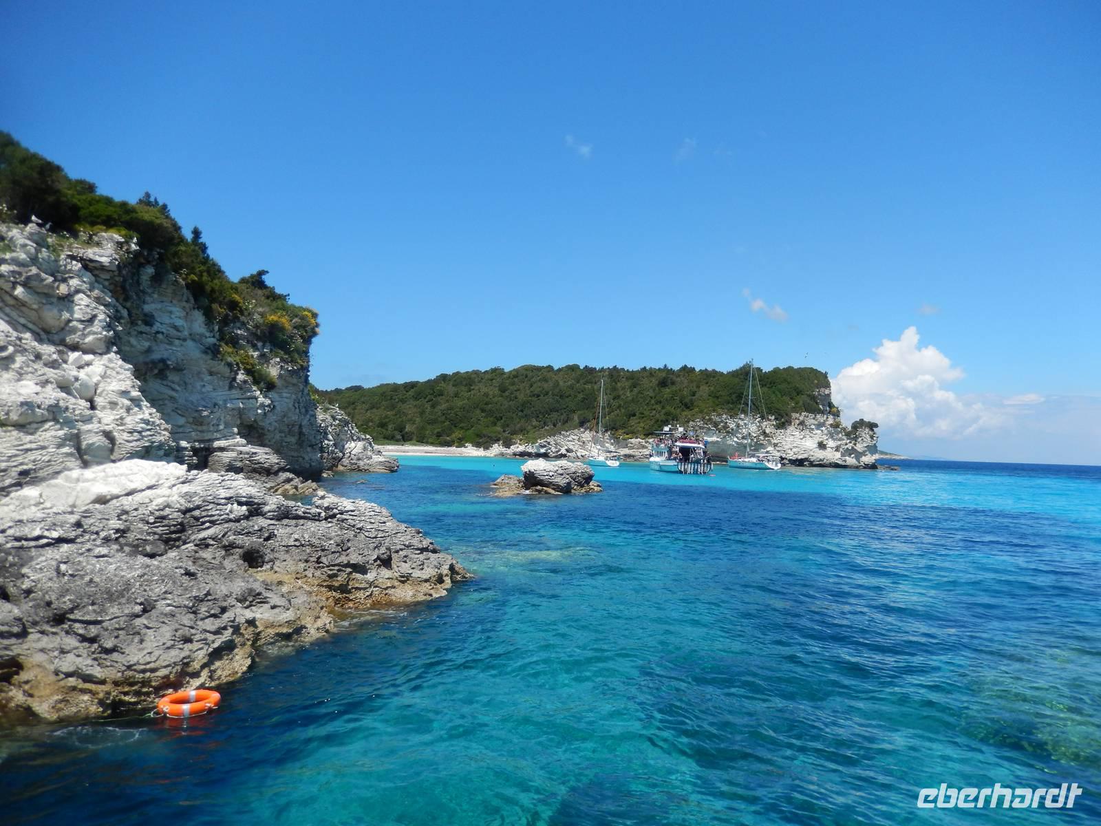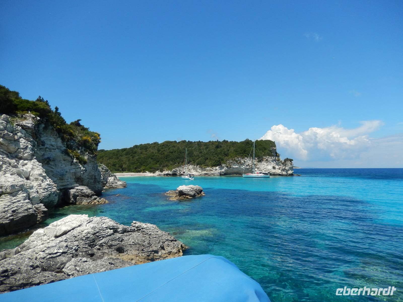 Heute gönnten wir unseren Wanderstiefeln ein kleines Päuschen und schnürten unseren Ausflugsrucksack für eine Mini-Kreuzfahrt nach Antipaxos und Paxos. Wer dies nicht wollte, hatte dafür heute frei und konnte den Tag individuell gestalten. Nachdem wir eine regenreiche Nacht hinter uns hatten und wir alles andere als optimistisch in die Wetterprognosen gingen, war widerum bei der Ankunft in Korfu-Stadt von den dunklen Regenwolken kaum noch etwas zu sehen. Es klarte auf und wir gingen an Board der „Ionnian Sun" und verweilten getreu dem Namen natürlich auf dem Sonnendeck. Wir schipperten entlang der Ostküste in den Süden, vorbei an der Alten Festung der Stadt, Benitses und schließlich waren wir ganz auf dem offenen Meer und ließen uns die salzige Briese um die Nase wehen. Zuerst fuhren wir in die Grotten von Paxos, in die widererwartend das Boot hineinfahren konnte und wir nur noch staunen konnten über die meterhohen Felswände und die Gebilde, die die Natur so geschaffen hatte. Dann ging es weiter auf die kleine Insel Antipaxos, die nur 20 Inselbewohner hat und bekannt ist für ihre kristallklaren und türkisblauen Badebuchten. Dort stoppten wir und einige nutzten die Zeit für ein Bad im erfrischenden Meer. Herrlich! Weiter ging es nun zum Hauptort der Insel Paxos, nach Gaios. Dort hatten wir einen 2-stündigen Aufenthalt um die kleinen Gassen mit seinen Tavernen, traditionellen Geschäften und die Hafenpromenade kennenzulernen und einfach nur die Seele baumeln zu lassen. Nun stand wieder eine knapp 3-stündige Rückfahrt von Gaios nach Korfu-Stadt auf dem Programm, aber da uns Petrus immer noch wohlgesonnen war, genossen wir die gute Luft und ließen die vielen neuen Eindrücke Revue passieren.