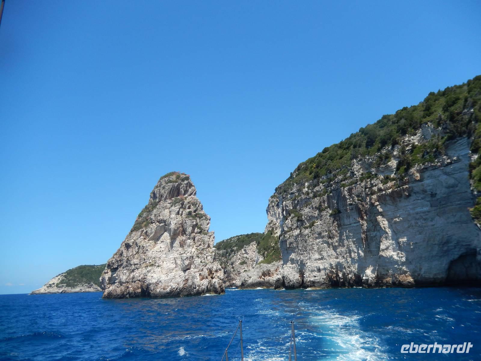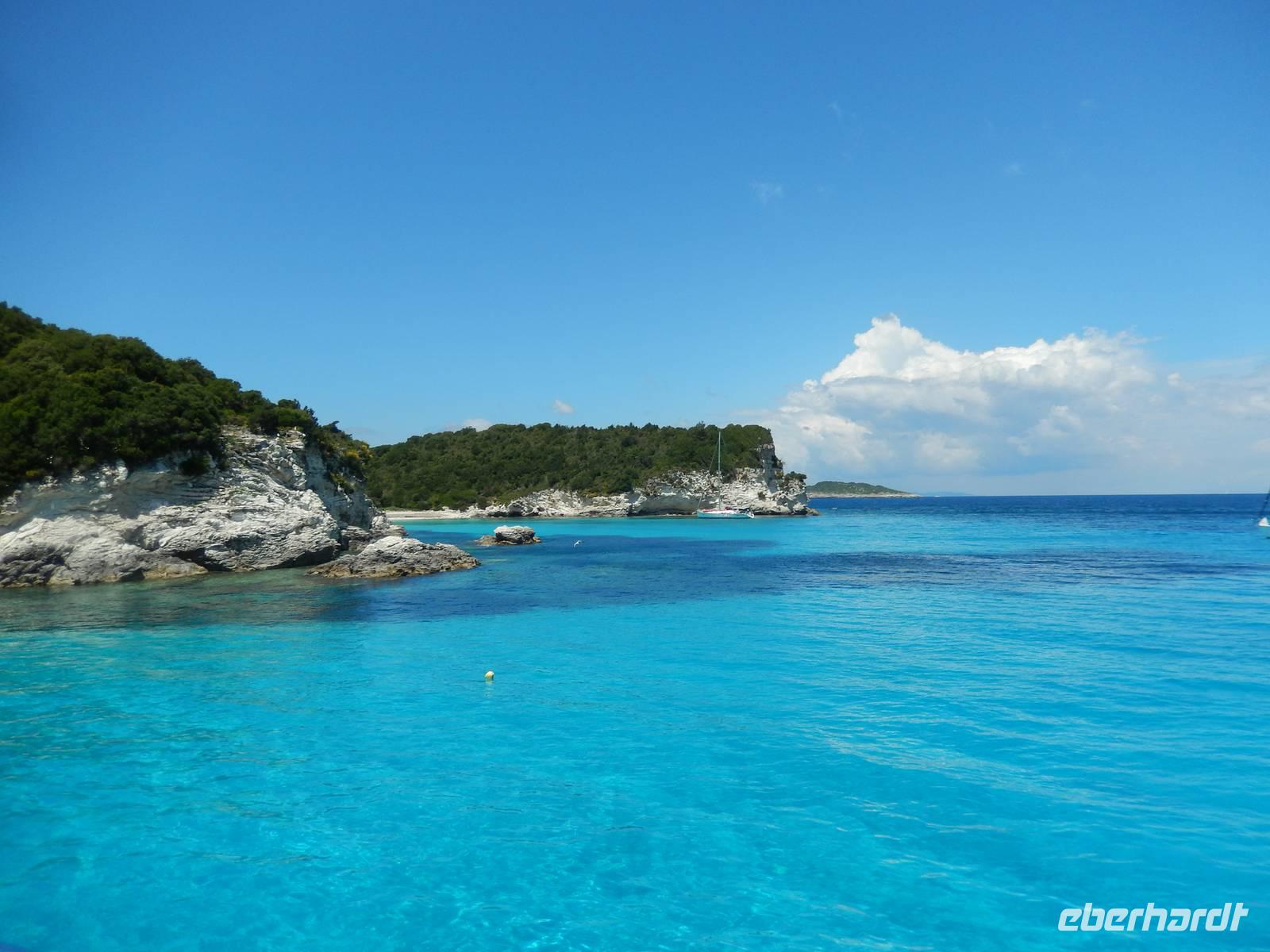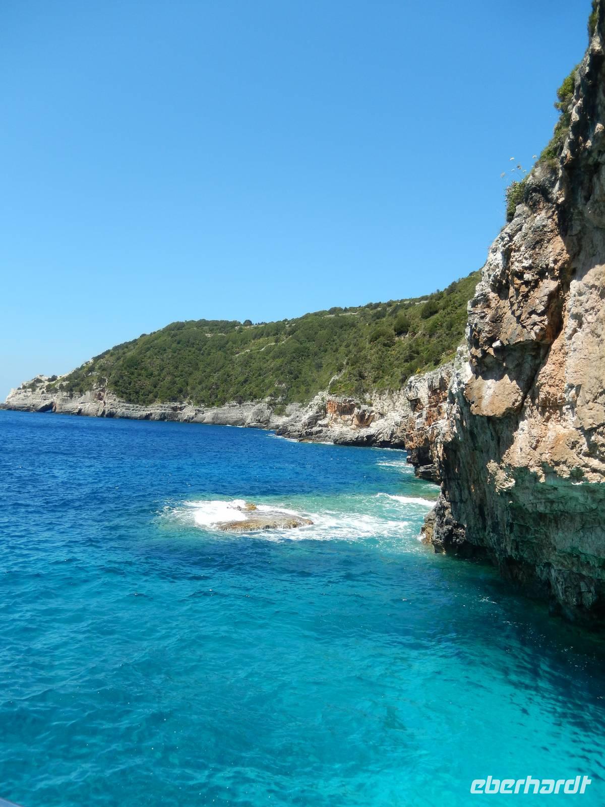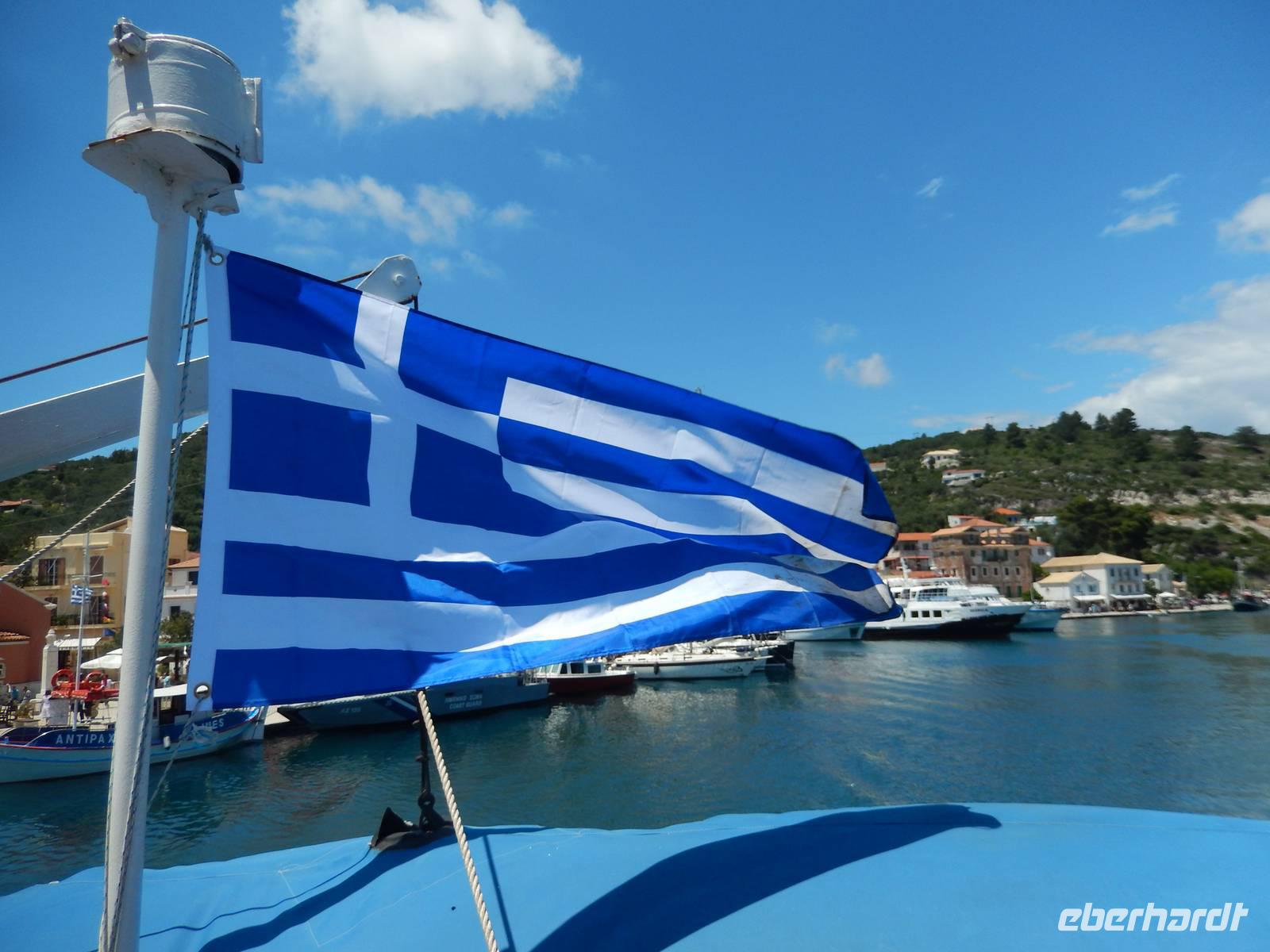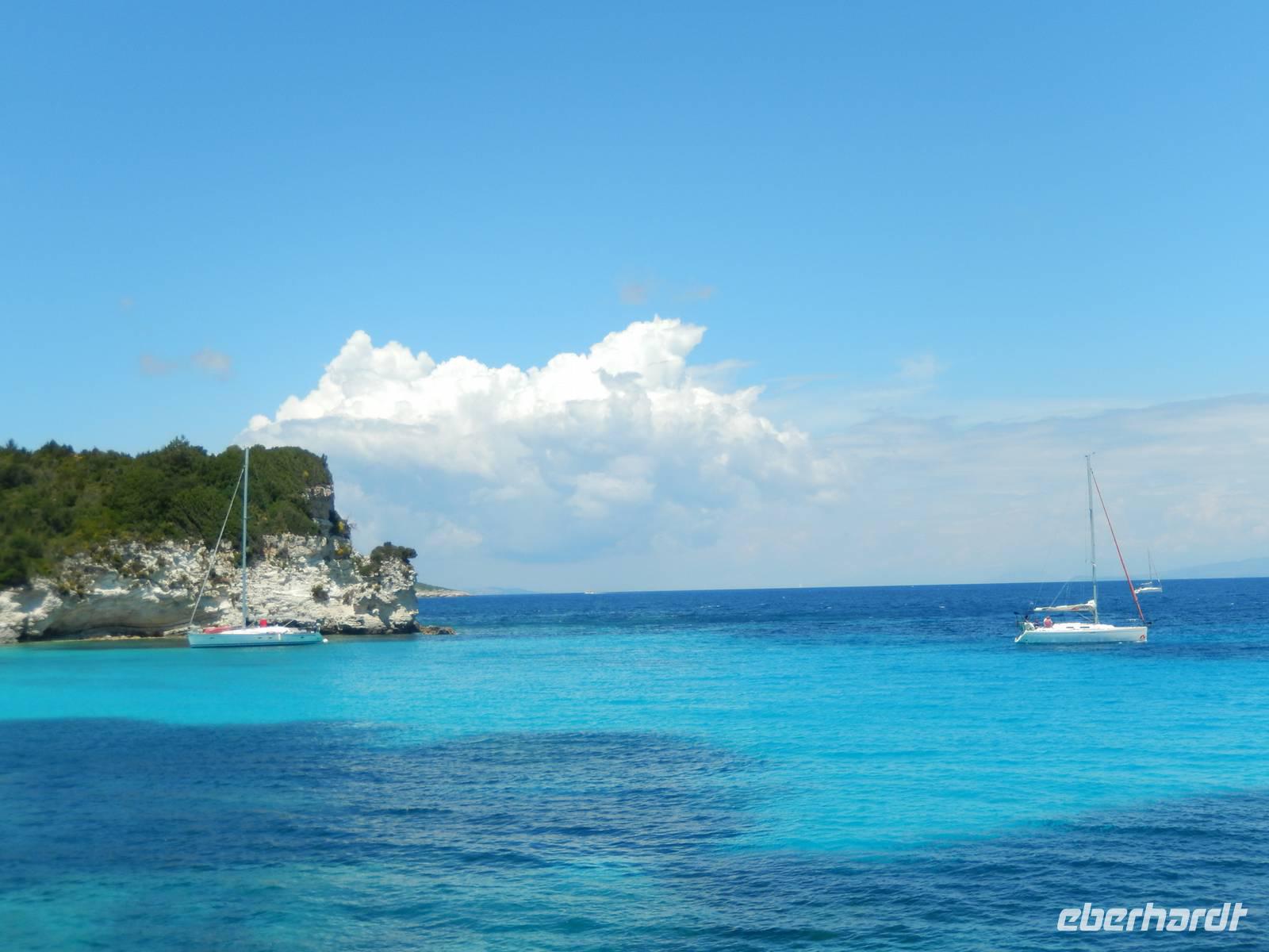 Heute gönnten wir unseren Wanderstiefeln ein kleines Päuschen und schnürten unseren Ausflugsrucksack für eine Mini-Kreuzfahrt nach Antipaxos und Paxos. Wer dies nicht wollte, hatte dafür heute frei und konnte den Tag individuell gestalten. Nachdem wir eine regenreiche Nacht hinter uns hatten und wir alles andere als optimistisch in die Wetterprognosen gingen, war widerum bei der Ankunft in Korfu-Stadt von den dunklen Regenwolken kaum noch etwas zu sehen. Es klarte auf und wir gingen an Board der „Ionnian Sun" und verweilten getreu dem Namen natürlich auf dem Sonnendeck. Wir schipperten entlang der Ostküste in den Süden, vorbei an der Alten Festung der Stadt, Benitses und schließlich waren wir ganz auf dem offenen Meer und ließen uns die salzige Briese um die Nase wehen. Zuerst fuhren wir in die Grotten von Paxos, in die widererwartend das Boot hineinfahren konnte und wir nur noch staunen konnten über die meterhohen Felswände und die Gebilde, die die Natur so geschaffen hatte. Dann ging es weiter auf die kleine Insel Antipaxos, die nur 20 Inselbewohner hat und bekannt ist für ihre kristallklaren und türkisblauen Badebuchten. Dort stoppten wir und einige nutzten die Zeit für ein Bad im erfrischenden Meer. Herrlich! Weiter ging es nun zum Hauptort der Insel Paxos, nach Gaios. Dort hatten wir einen 2-stündigen Aufenthalt um die kleinen Gassen mit seinen Tavernen, traditionellen Geschäften und die Hafenpromenade kennenzulernen und einfach nur die Seele baumeln zu lassen. Nun stand wieder eine knapp 3-stündige Rückfahrt von Gaios nach Korfu-Stadt auf dem Programm, aber da uns Petrus immer noch wohlgesonnen war, genossen wir die gute Luft und ließen die vielen neuen Eindrücke Revue passieren.
