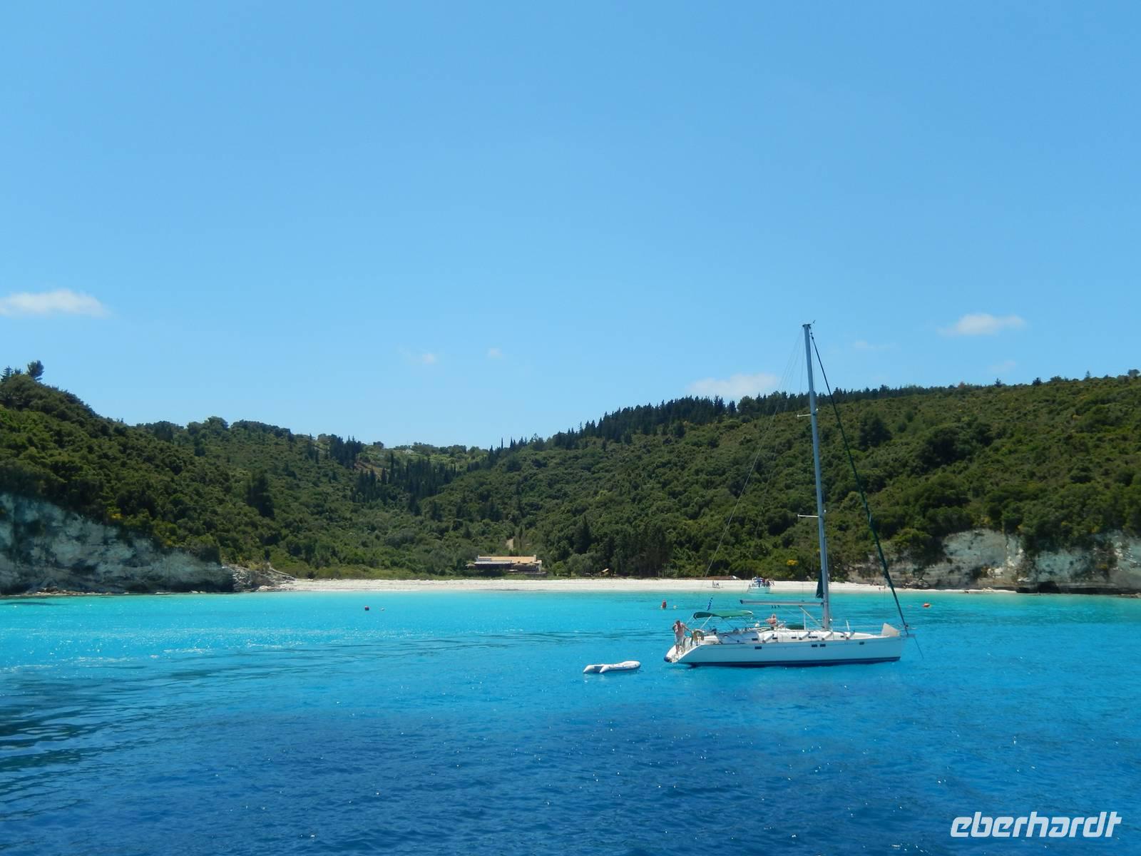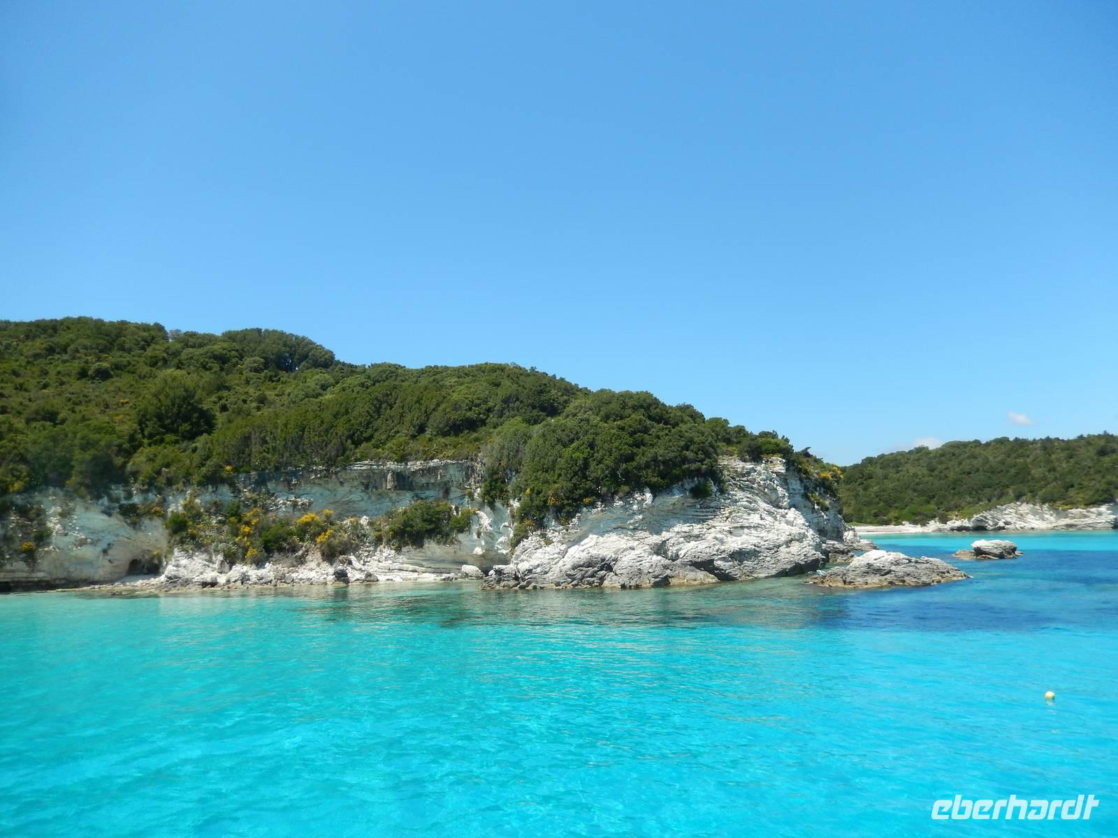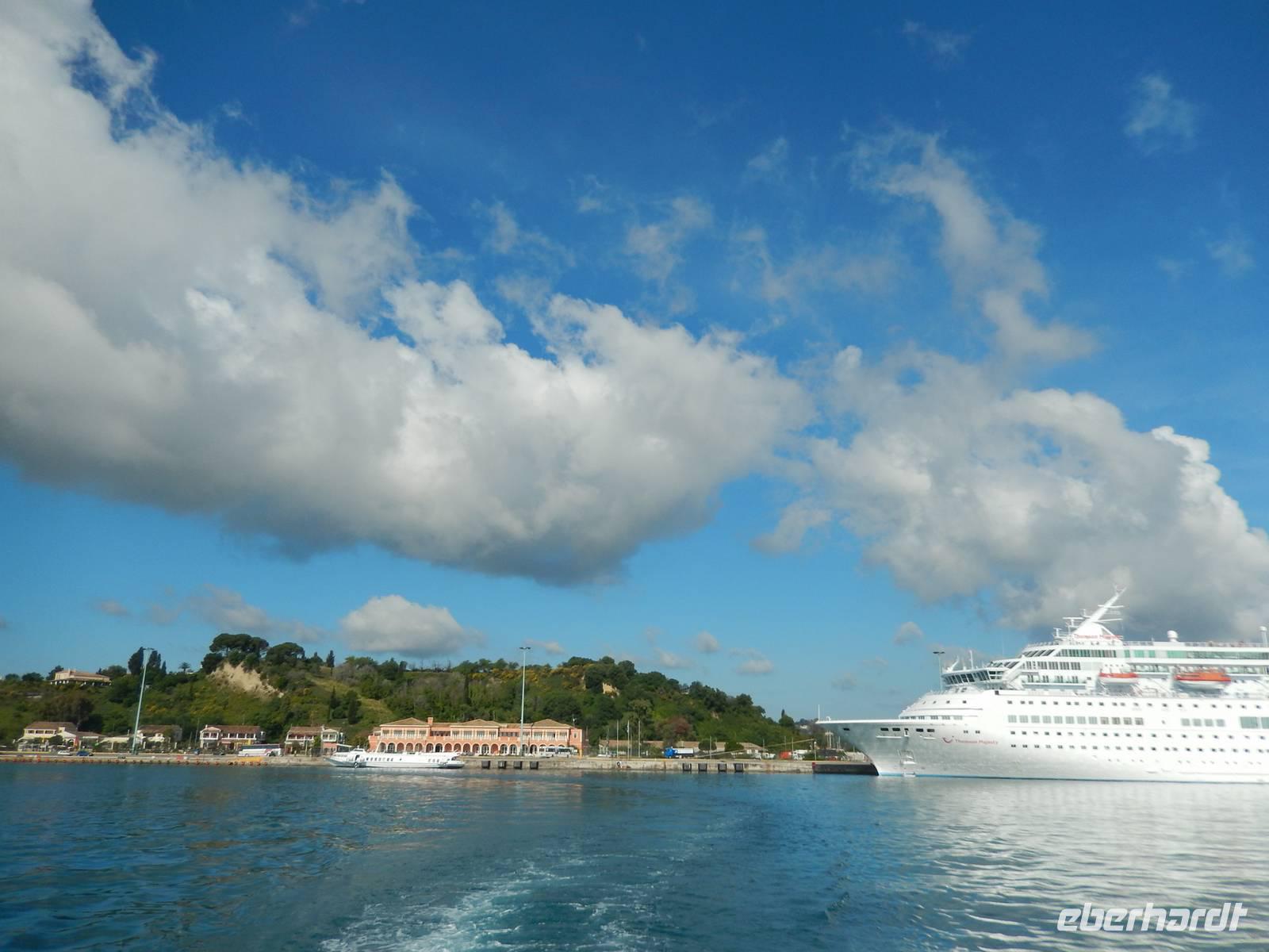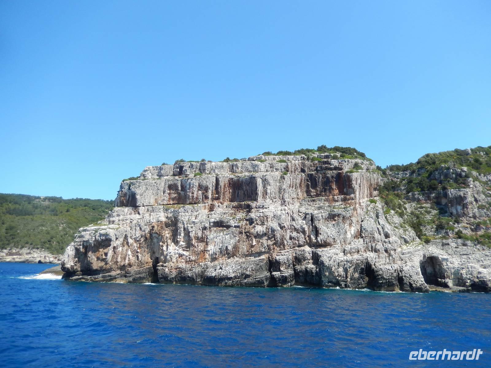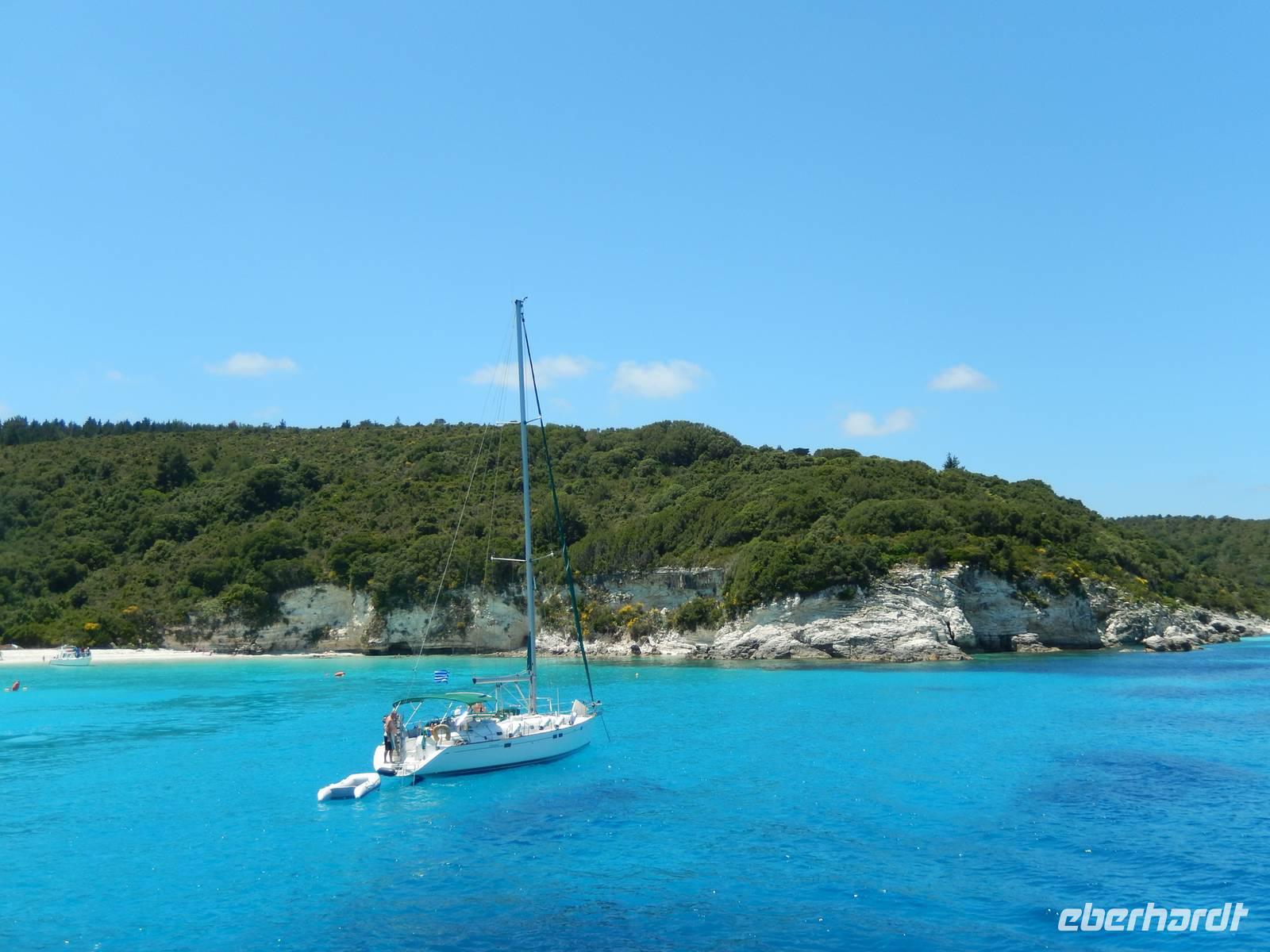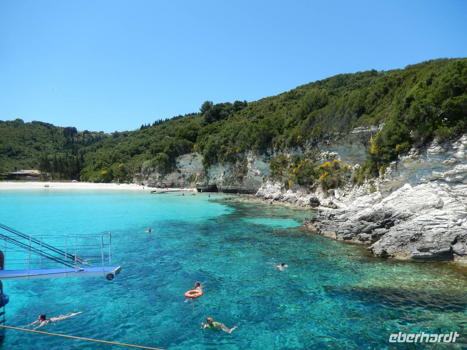Heute gönnten wir unseren Wanderstiefeln ein kleines Päuschen und schnürten unseren Ausflugsrucksack für eine Mini-Kreuzfahrt nach Antipaxos und Paxos. Wer dies nicht wollte, hatte dafür heute frei und konnte den Tag individuell gestalten. Nachdem wir eine regenreiche Nacht hinter uns hatten und wir alles andere als optimistisch in die Wetterprognosen gingen, war widerum bei der Ankunft in Korfu-Stadt von den dunklen Regenwolken kaum noch etwas zu sehen. Es klarte auf und wir gingen an Board der „Ionnian Sun" und verweilten getreu dem Namen natürlich auf dem Sonnendeck. Wir schipperten entlang der Ostküste in den Süden, vorbei an der Alten Festung der Stadt, Benitses und schließlich waren wir ganz auf dem offenen Meer und ließen uns die salzige Briese um die Nase wehen. Zuerst fuhren wir in die Grotten von Paxos, in die widererwartend das Boot hineinfahren konnte und wir nur noch staunen konnten über die meterhohen Felswände und die Gebilde, die die Natur so geschaffen hatte. Dann ging es weiter auf die kleine Insel Antipaxos, die nur 20 Inselbewohner hat und bekannt ist für ihre kristallklaren und türkisblauen Badebuchten. Dort stoppten wir und einige nutzten die Zeit für ein Bad im erfrischenden Meer. Herrlich! Weiter ging es nun zum Hauptort der Insel Paxos, nach Gaios. Dort hatten wir einen 2-stündigen Aufenthalt um die kleinen Gassen mit seinen Tavernen, traditionellen Geschäften und die Hafenpromenade kennenzulernen und einfach nur die Seele baumeln zu lassen. Nun stand wieder eine knapp 3-stündige Rückfahrt von Gaios nach Korfu-Stadt auf dem Programm, aber da uns Petrus immer noch wohlgesonnen war, genossen wir die gute Luft und ließen die vielen neuen Eindrücke Revue passieren.