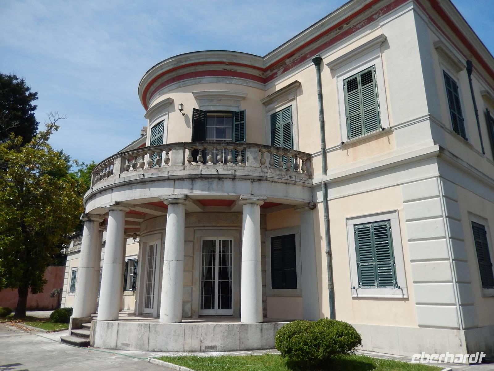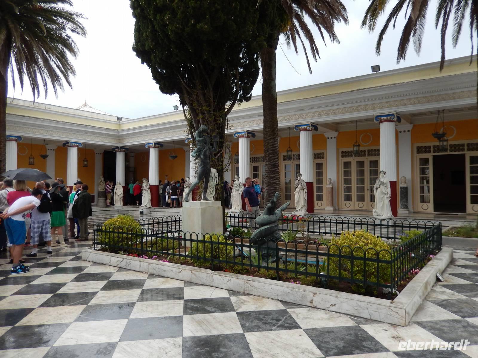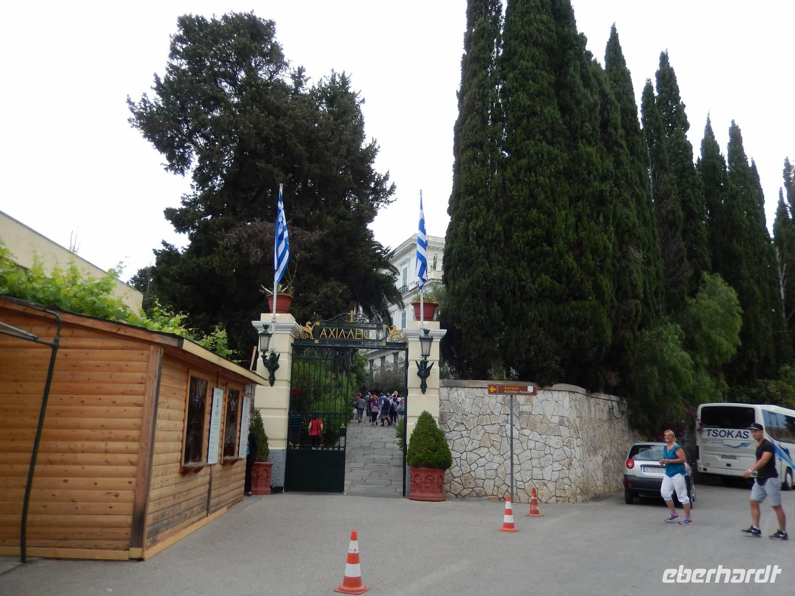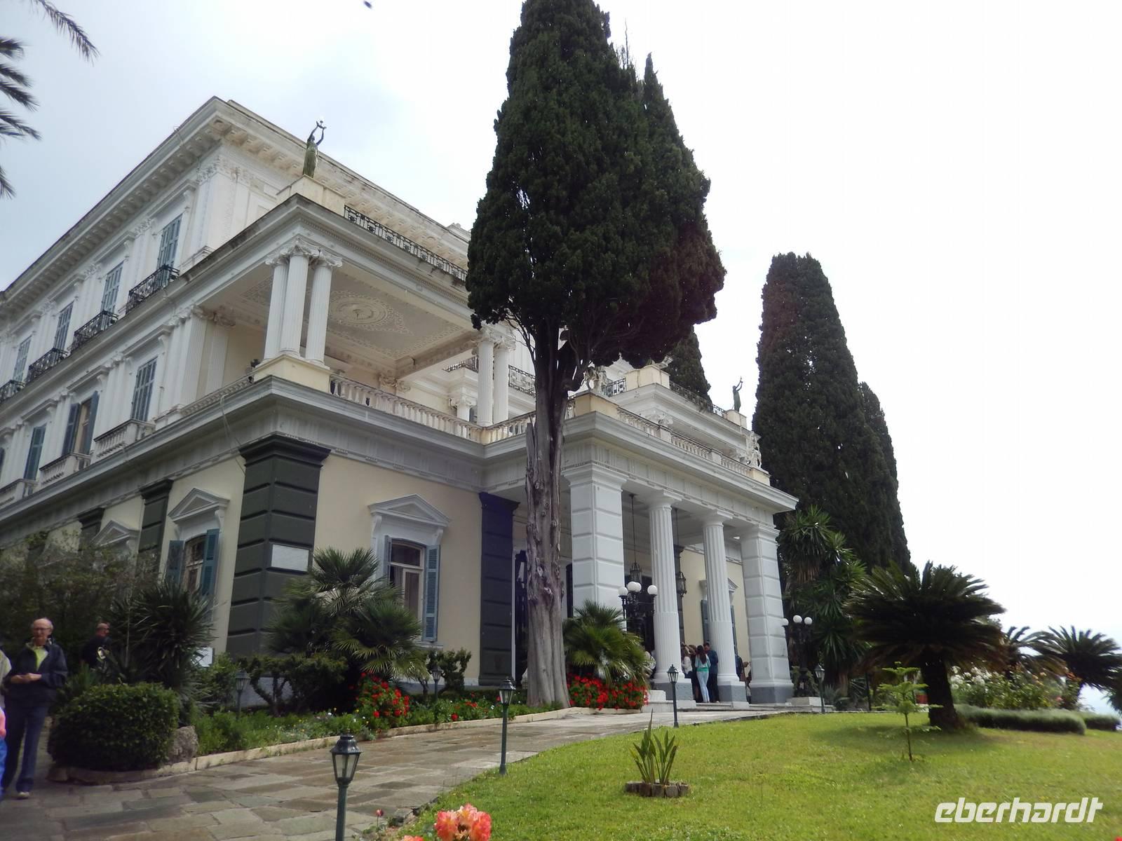 Heute war Christi Himmerlfahrt, also Männertag und somit Feiertag in Deutschland. Diesen kann man ja auch genausogut im Ausland feiern - somit beglückwünschte heute morgen besonders alle Männer und hatte natürlich auch eine Überraschung vorbereitet. Zuvor stand aber mit dem Besuch des Märchenpalastes der Kaiserin Sissi erst einmal etwas korfiotische Kulturgeschichte auf dem Programm. Auf dem Weg dahin stieg wieder Eleni dazu und erklärte schon einmal einige Sachen zu Korfus meistbesuchter Attraktion. Wir besuchten das skulpturengeschmückte Anwesen und Eleni führte uns zudem auch in die Villa und zeigte uns die Räumlichkeiten. Die österreichische Kaiserin Elisabeth, genannt Sissi, kaufte im 18. Jahrhundert dieses Anwesen um es zu einer pompösen Sommerresidenz im altgriechischen Stil umbauen zu lassen. Nach ihrem Tod diente es dann als Militärhospiz, Wohnheim, Schule, Kinderheim und sogar als Kasino. Nach der Besichtigung wurde leider das Wetter immer schlechter, sodass wir uns entschieden nur eine kurze Wanderung in das nahgelegene Bergdorf Agio Deka zu machen. Unterwegs bestaunten wir die typisch griechischen „Vorgärten" und die älteren Korfioten freuten sich, dass uns ihre Blumen und Pflanzen so gefielen. Nun wurde der Regen immer stärker, daher kehrten wir in Agio Deka ein und ließen uns von Menios, unserem Busfahrer, abholen. Zum Abschluß des etwas anderen „Männertages" stießen wir mit einem korfiotischen Ouzo auf den Tag an und fuhren zurück in unser Hotel.