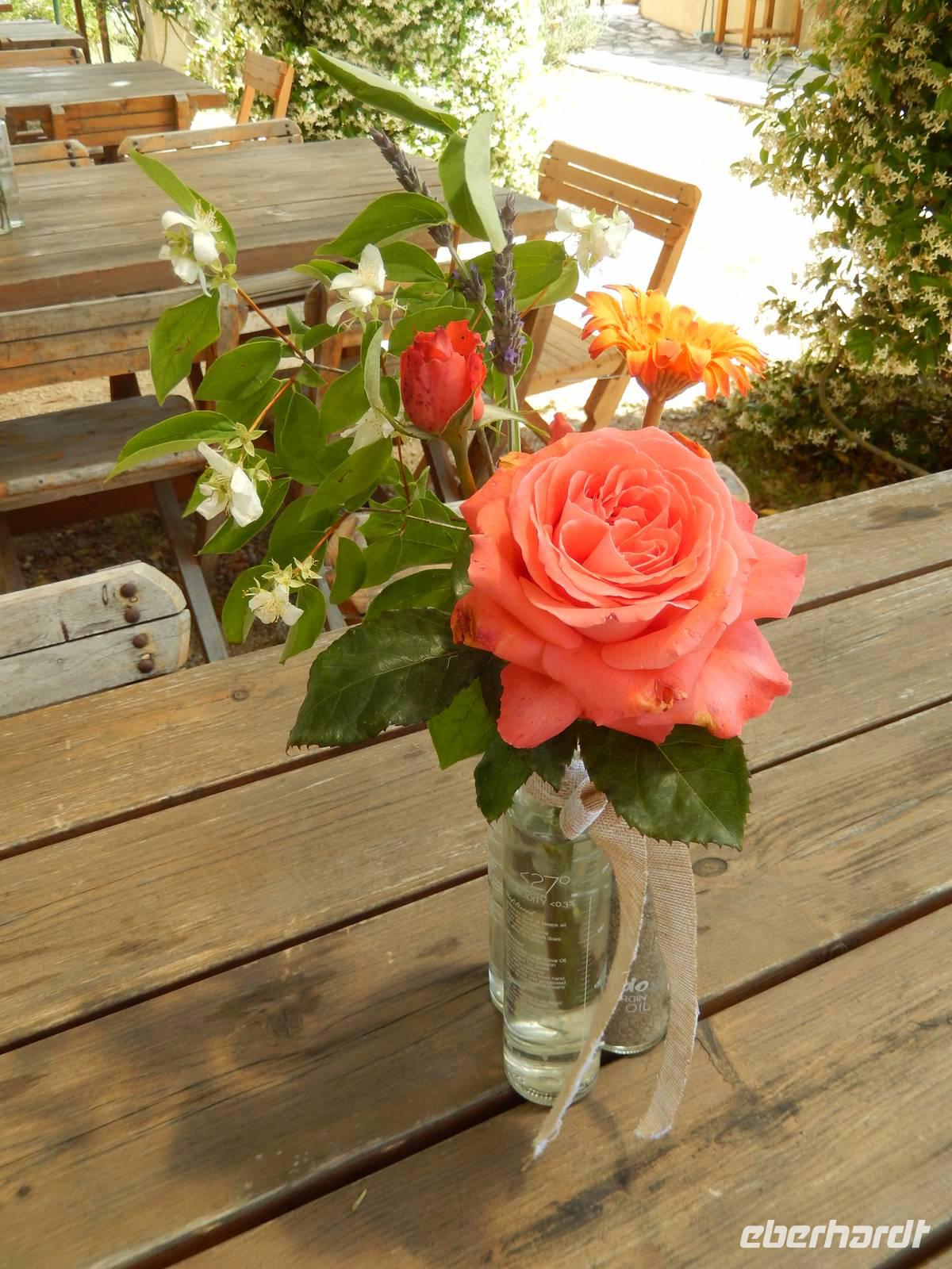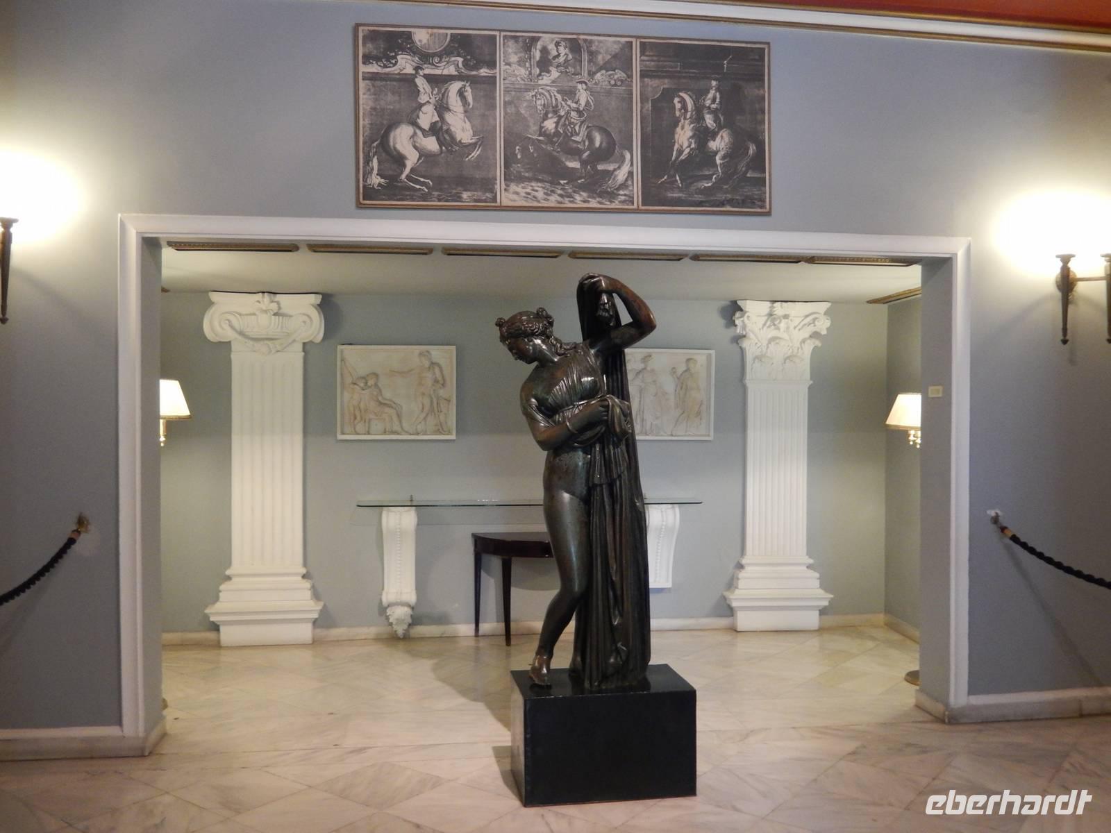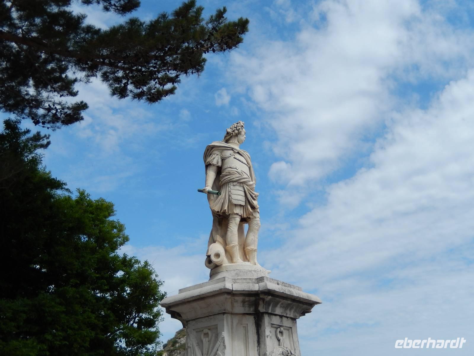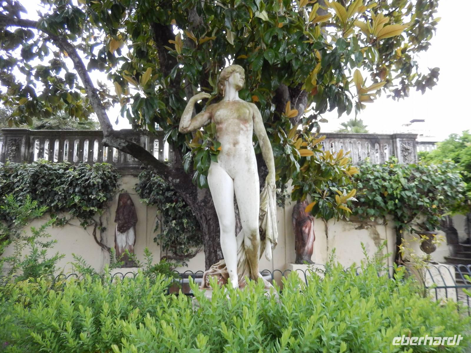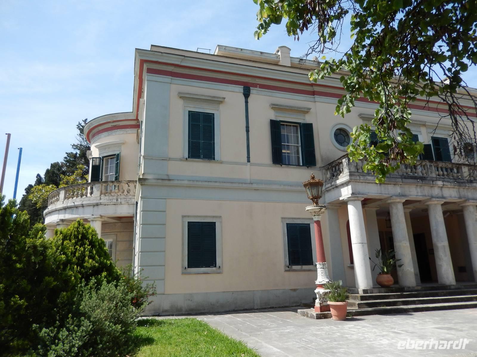 Heute war Christi Himmerlfahrt, also Männertag und somit Feiertag in Deutschland. Diesen kann man ja auch genausogut im Ausland feiern - somit beglückwünschte heute morgen besonders alle Männer und hatte natürlich auch eine Überraschung vorbereitet. Zuvor stand aber mit dem Besuch des Märchenpalastes der Kaiserin Sissi erst einmal etwas korfiotische Kulturgeschichte auf dem Programm. Auf dem Weg dahin stieg wieder Eleni dazu und erklärte schon einmal einige Sachen zu Korfus meistbesuchter Attraktion. Wir besuchten das skulpturengeschmückte Anwesen und Eleni führte uns zudem auch in die Villa und zeigte uns die Räumlichkeiten. Die österreichische Kaiserin Elisabeth, genannt Sissi, kaufte im 18. Jahrhundert dieses Anwesen um es zu einer pompösen Sommerresidenz im altgriechischen Stil umbauen zu lassen. Nach ihrem Tod diente es dann als Militärhospiz, Wohnheim, Schule, Kinderheim und sogar als Kasino. Nach der Besichtigung wurde leider das Wetter immer schlechter, sodass wir uns entschieden nur eine kurze Wanderung in das nahgelegene Bergdorf Agio Deka zu machen. Unterwegs bestaunten wir die typisch griechischen „Vorgärten" und die älteren Korfioten freuten sich, dass uns ihre Blumen und Pflanzen so gefielen. Nun wurde der Regen immer stärker, daher kehrten wir in Agio Deka ein und ließen uns von Menios, unserem Busfahrer, abholen. Zum Abschluß des etwas anderen „Männertages" stießen wir mit einem korfiotischen Ouzo auf den Tag an und fuhren zurück in unser Hotel.