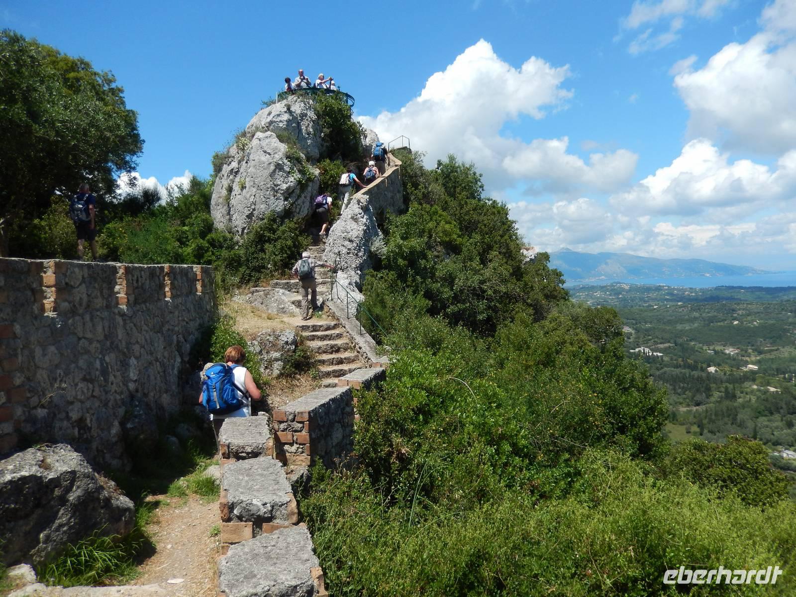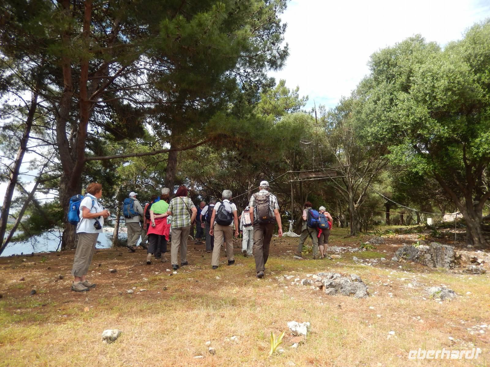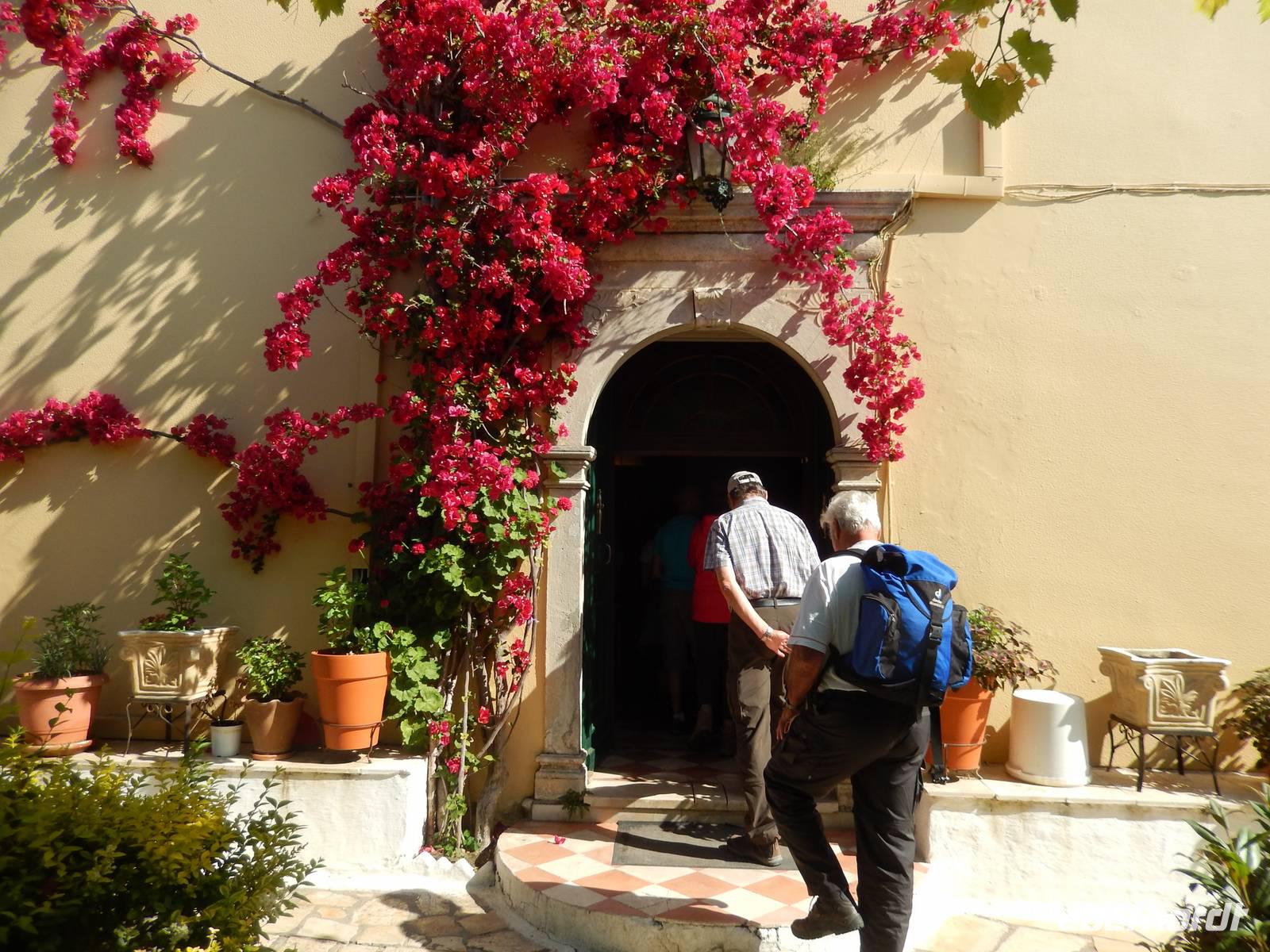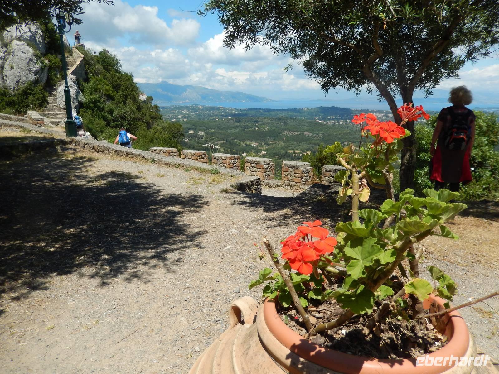Nach einem erholsamen Tag auf den Inseln Paxos und Antipaxos wollten wir heute den höchsten Berg Korfus, den Pantokrator (906m) „erklimmen". Da das Wetter anfänglich etwas unsicher erschien, entschied sich unsere Wanderleiterin etwas weiter hinaufzufahren. Nach dem Dorf Strinlias stiegen wir nun das letzte Stück zum Berg hinauf. Oben angekommen, besichtigten wir erst einmal das Kloster, das nur noch von 2 Mönchen bewohnt war. Aber mehr ins Auge stach die riesige Antennenanlage mitten im Klosterinnenhof, die uns wie ein Fremdkörper gar nicht so recht auf unseren Fotos gefiel. Nach einer kleinen Erfrischung in dem Café und einem Gruppenfoto stiegen wir wieder ab zu unserem Ausgangspunkt, wanderten aber rechts weg um zum Dorf Pelia Perithia zu gelangen. Der Weg war zwar sehr schotterig und steinig, lief sich dennoch ganz gut. Wir kamen in dem kleinen verlassen Dorf an, das scheinbar mehr Tavernen hatte, als Wohnhäuser. Wir suchten uns die schönste mit Blick auf den Pantokrator aus und ließen den Tag ganz gemütlich bei einem Halloumi-Salat oder leckerem Kuchen ausklingen.