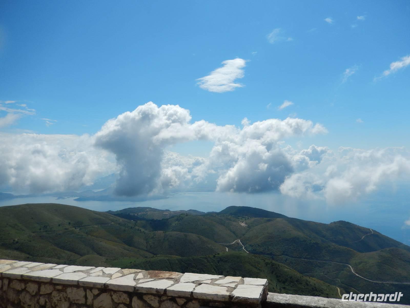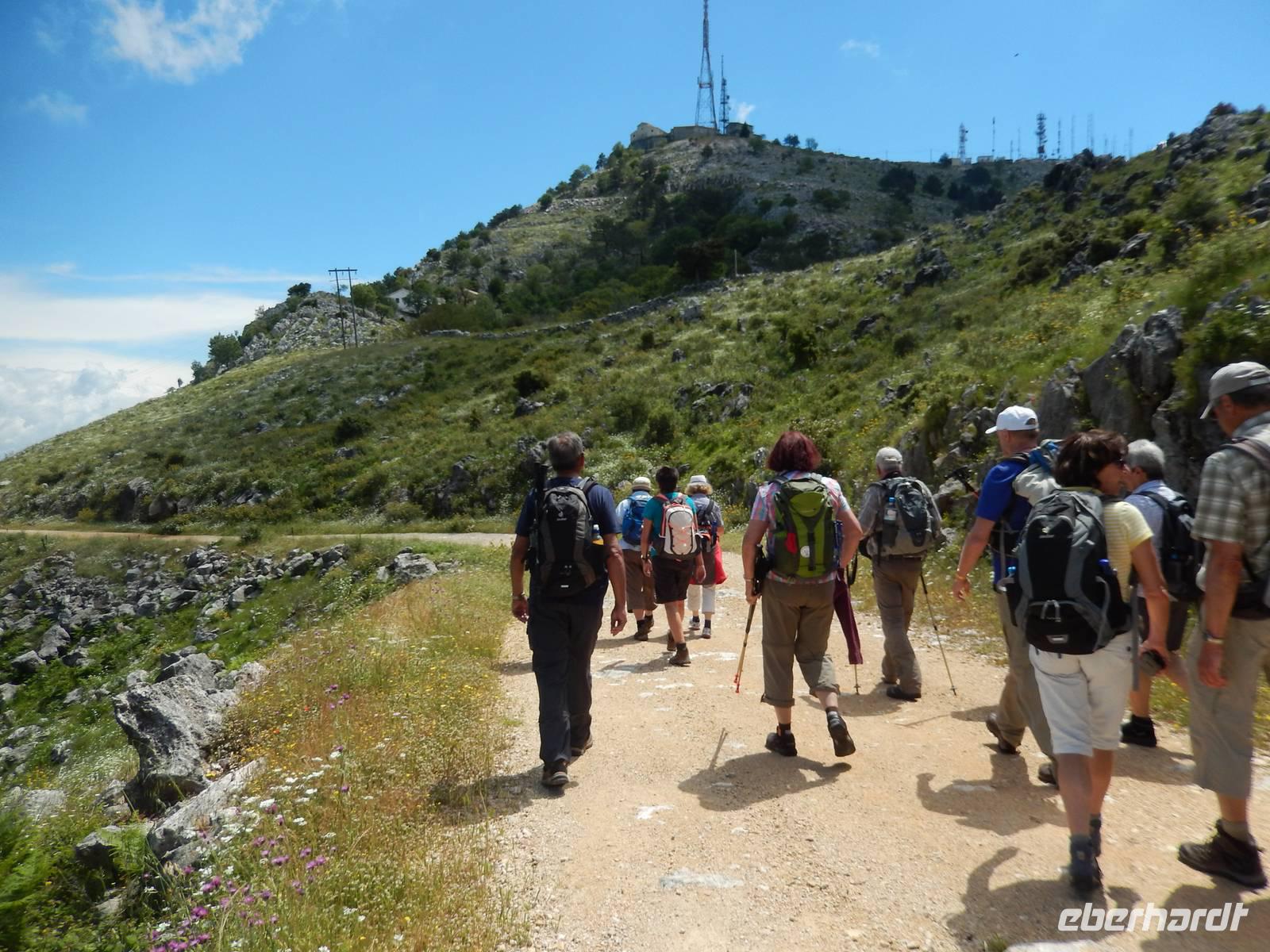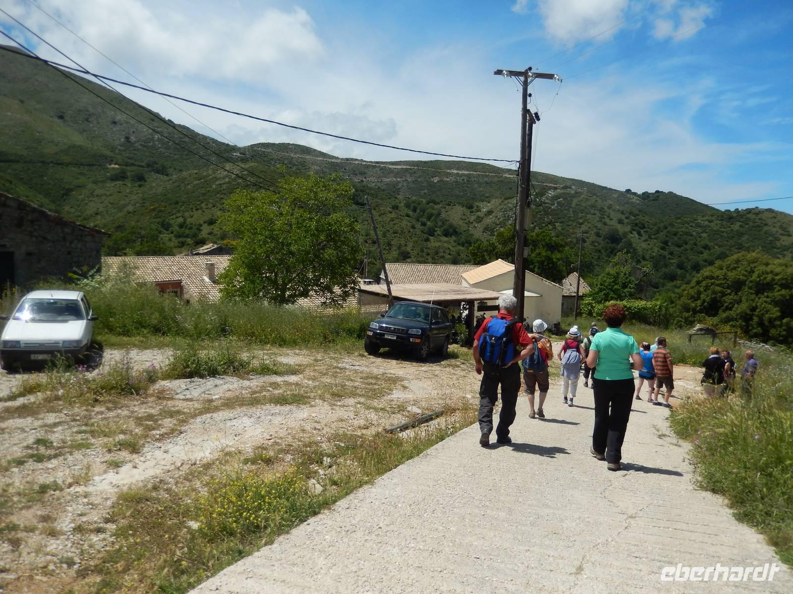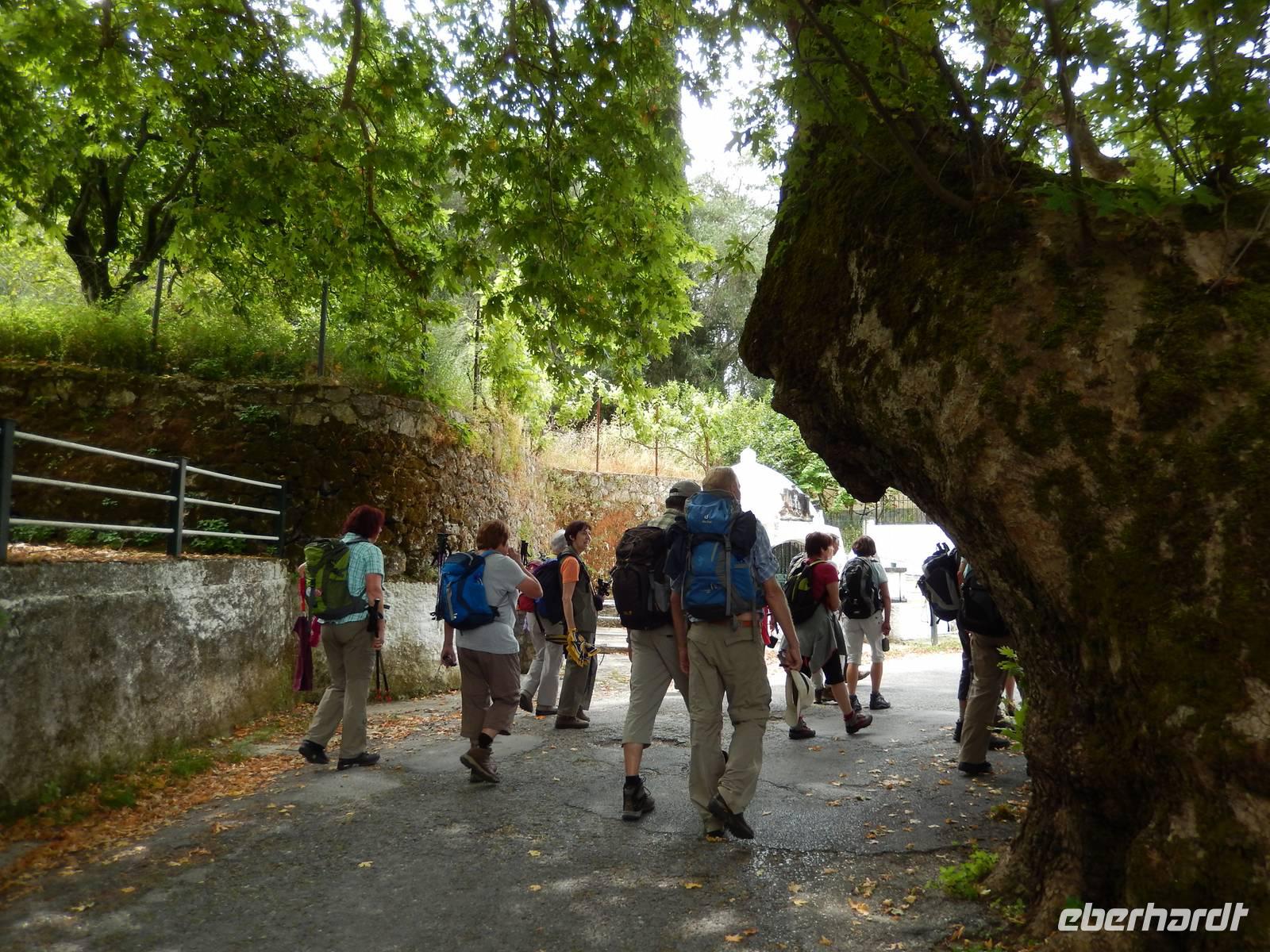 Nach einem erholsamen Tag auf den Inseln Paxos und Antipaxos wollten wir heute den höchsten Berg Korfus, den Pantokrator (906m) „erklimmen". Da das Wetter anfänglich etwas unsicher erschien, entschied sich unsere Wanderleiterin etwas weiter hinaufzufahren. Nach dem Dorf Strinlias stiegen wir nun das letzte Stück zum Berg hinauf. Oben angekommen, besichtigten wir erst einmal das Kloster, das nur noch von 2 Mönchen bewohnt war. Aber mehr ins Auge stach die riesige Antennenanlage mitten im Klosterinnenhof, die uns wie ein Fremdkörper gar nicht so recht auf unseren Fotos gefiel. Nach einer kleinen Erfrischung in dem Café und einem Gruppenfoto stiegen wir wieder ab zu unserem Ausgangspunkt, wanderten aber rechts weg um zum Dorf Pelia Perithia zu gelangen. Der Weg war zwar sehr schotterig und steinig, lief sich dennoch ganz gut. Wir kamen in dem kleinen verlassen Dorf an, das scheinbar mehr Tavernen hatte, als Wohnhäuser. Wir suchten uns die schönste mit Blick auf den Pantokrator aus und ließen den Tag ganz gemütlich bei einem Halloumi-Salat oder leckerem Kuchen ausklingen.