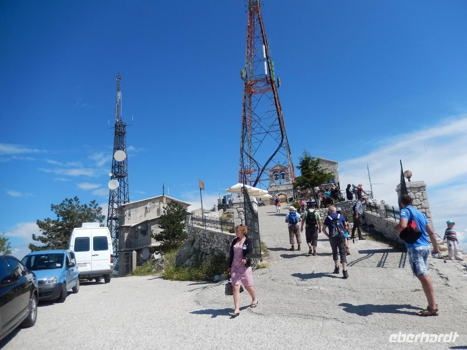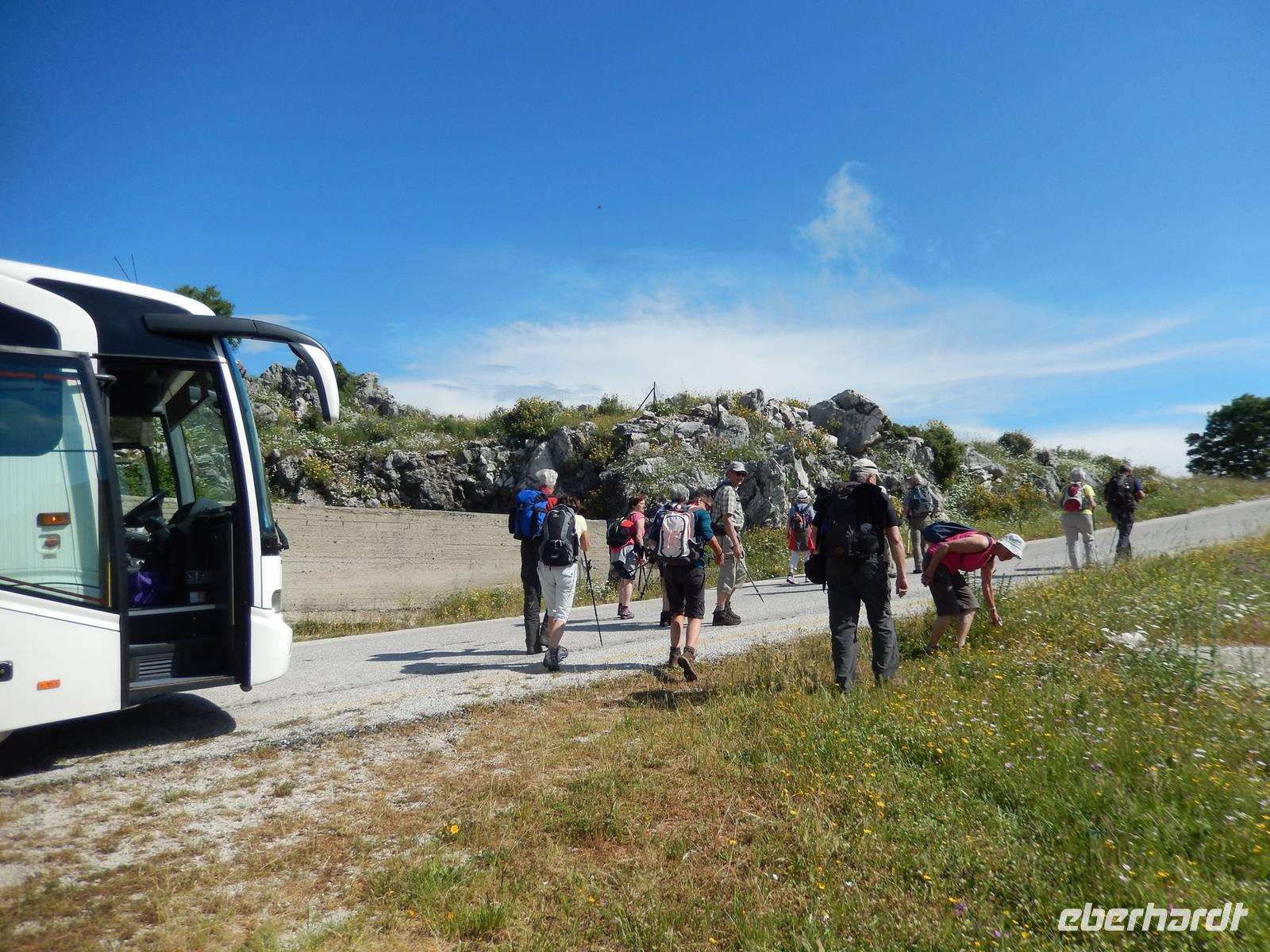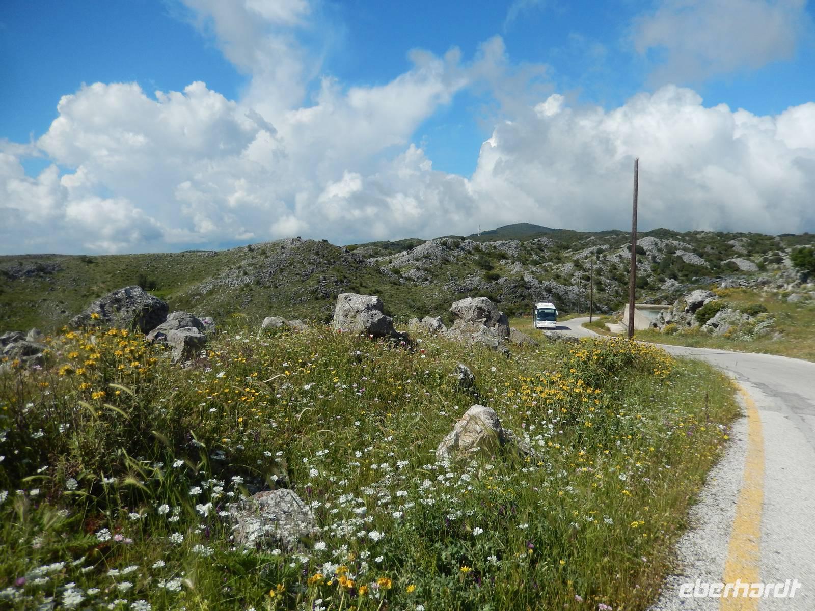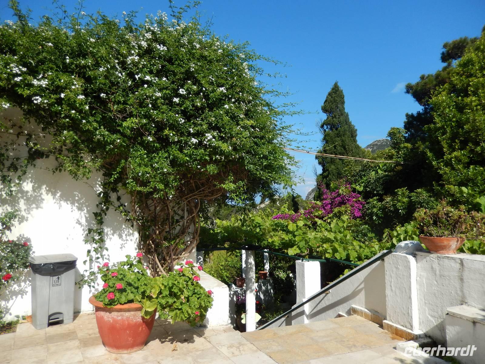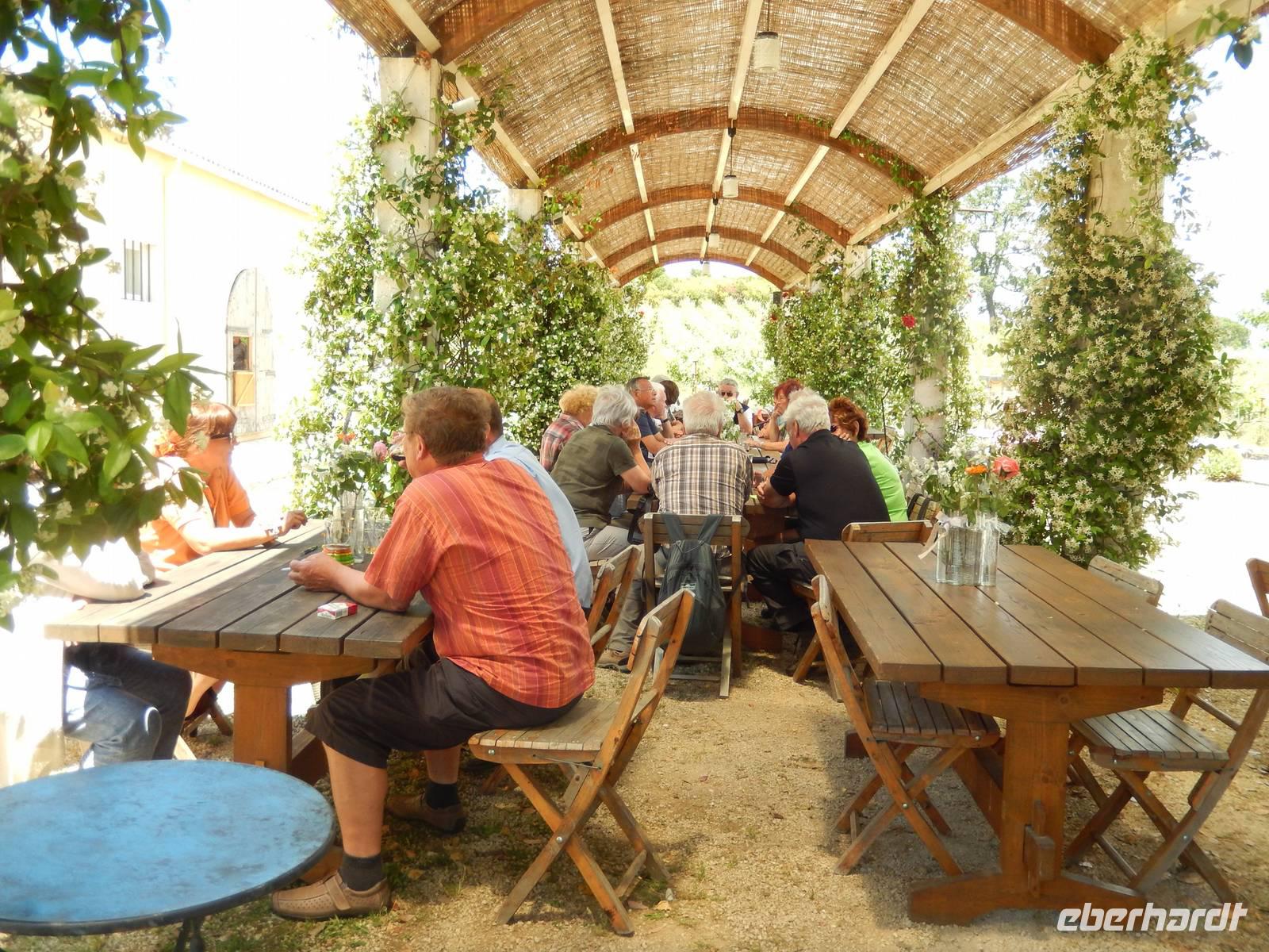 Nach einem erholsamen Tag auf den Inseln Paxos und Antipaxos wollten wir heute den höchsten Berg Korfus, den Pantokrator (906m) „erklimmen". Da das Wetter anfänglich etwas unsicher erschien, entschied sich unsere Wanderleiterin etwas weiter hinaufzufahren. Nach dem Dorf Strinlias stiegen wir nun das letzte Stück zum Berg hinauf. Oben angekommen, besichtigten wir erst einmal das Kloster, das nur noch von 2 Mönchen bewohnt war. Aber mehr ins Auge stach die riesige Antennenanlage mitten im Klosterinnenhof, die uns wie ein Fremdkörper gar nicht so recht auf unseren Fotos gefiel. Nach einer kleinen Erfrischung in dem Café und einem Gruppenfoto stiegen wir wieder ab zu unserem Ausgangspunkt, wanderten aber rechts weg um zum Dorf Pelia Perithia zu gelangen. Der Weg war zwar sehr schotterig und steinig, lief sich dennoch ganz gut. Wir kamen in dem kleinen verlassen Dorf an, das scheinbar mehr Tavernen hatte, als Wohnhäuser. Wir suchten uns die schönste mit Blick auf den Pantokrator aus und ließen den Tag ganz gemütlich bei einem Halloumi-Salat oder leckerem Kuchen ausklingen.