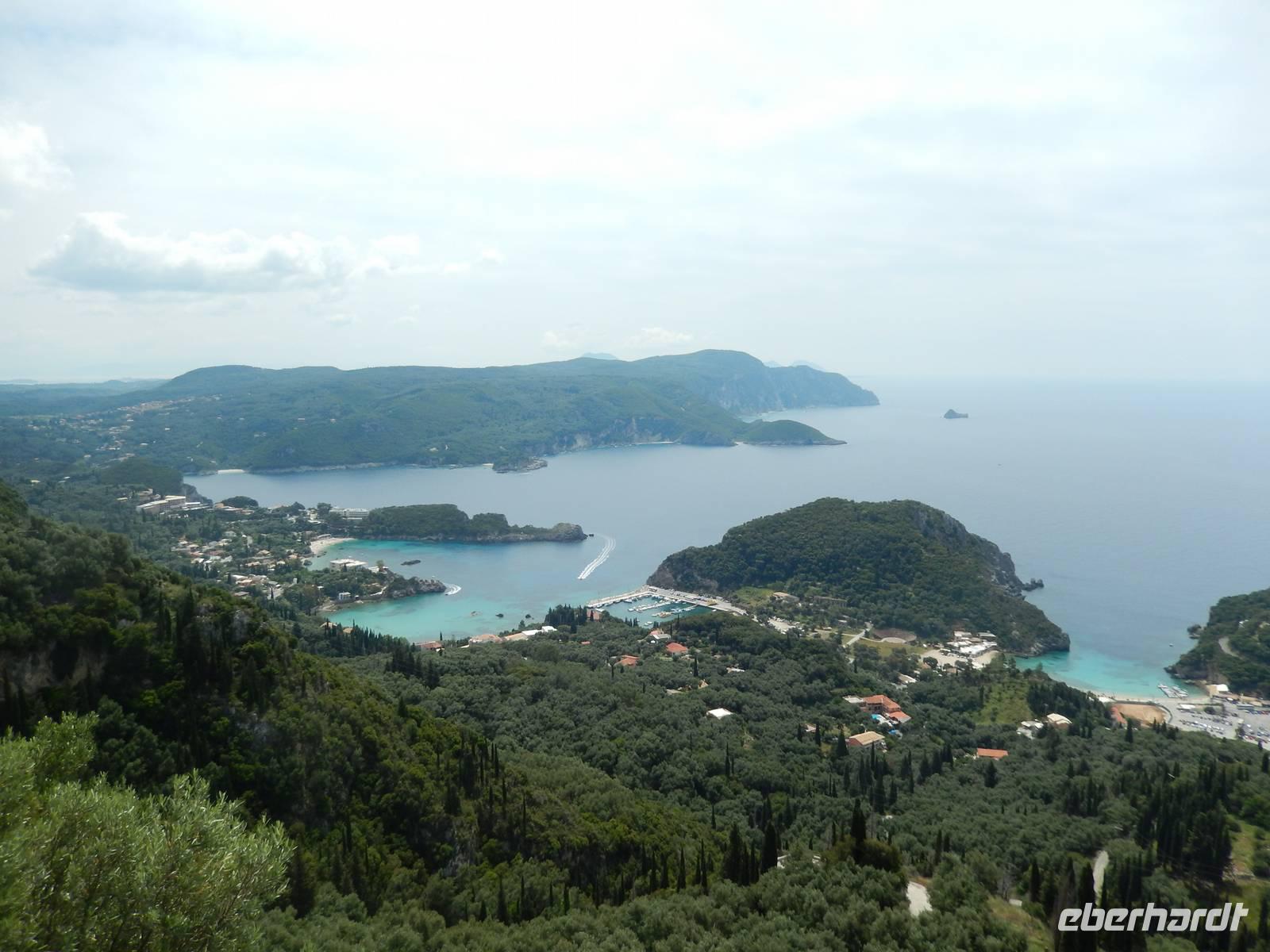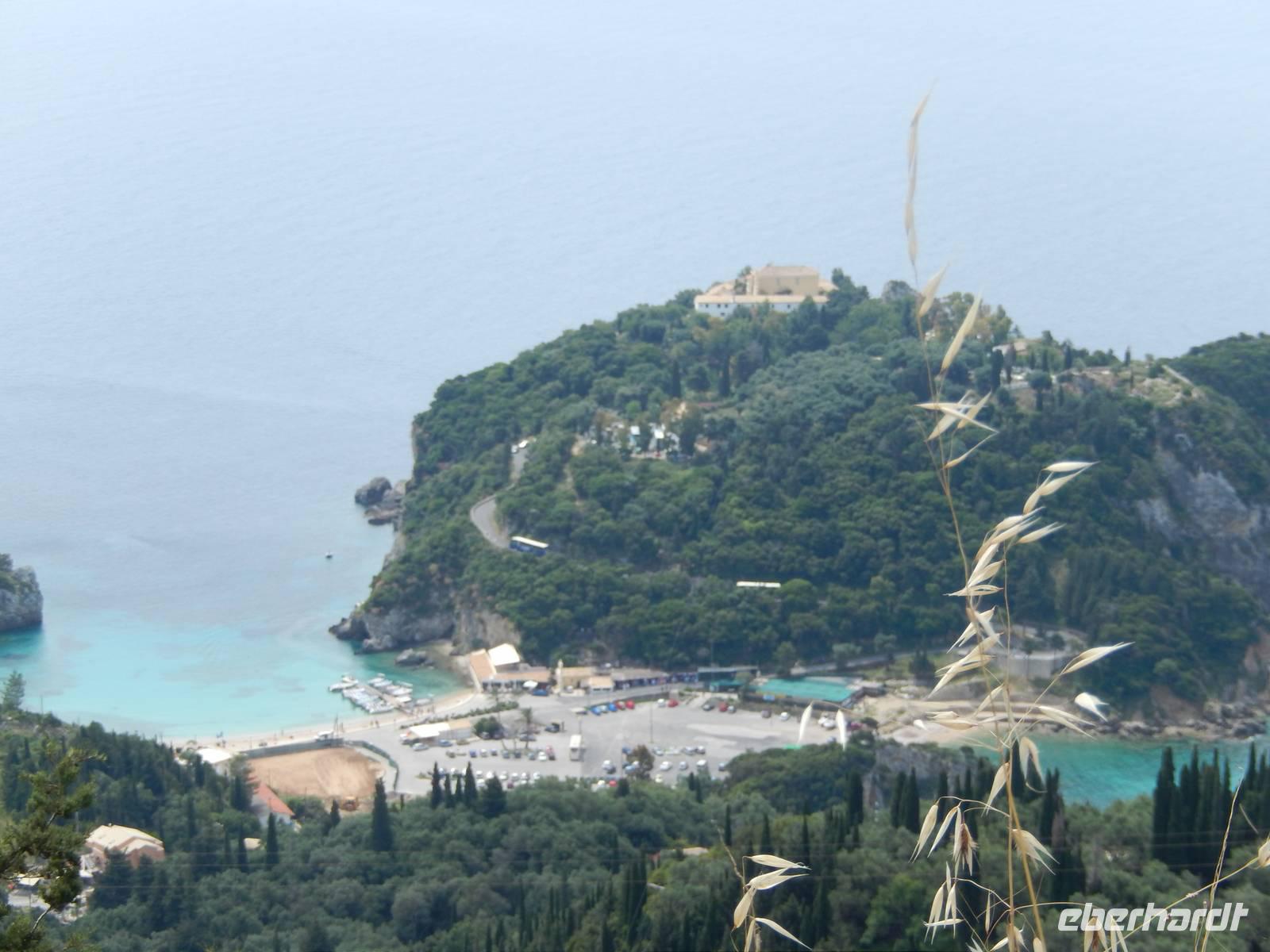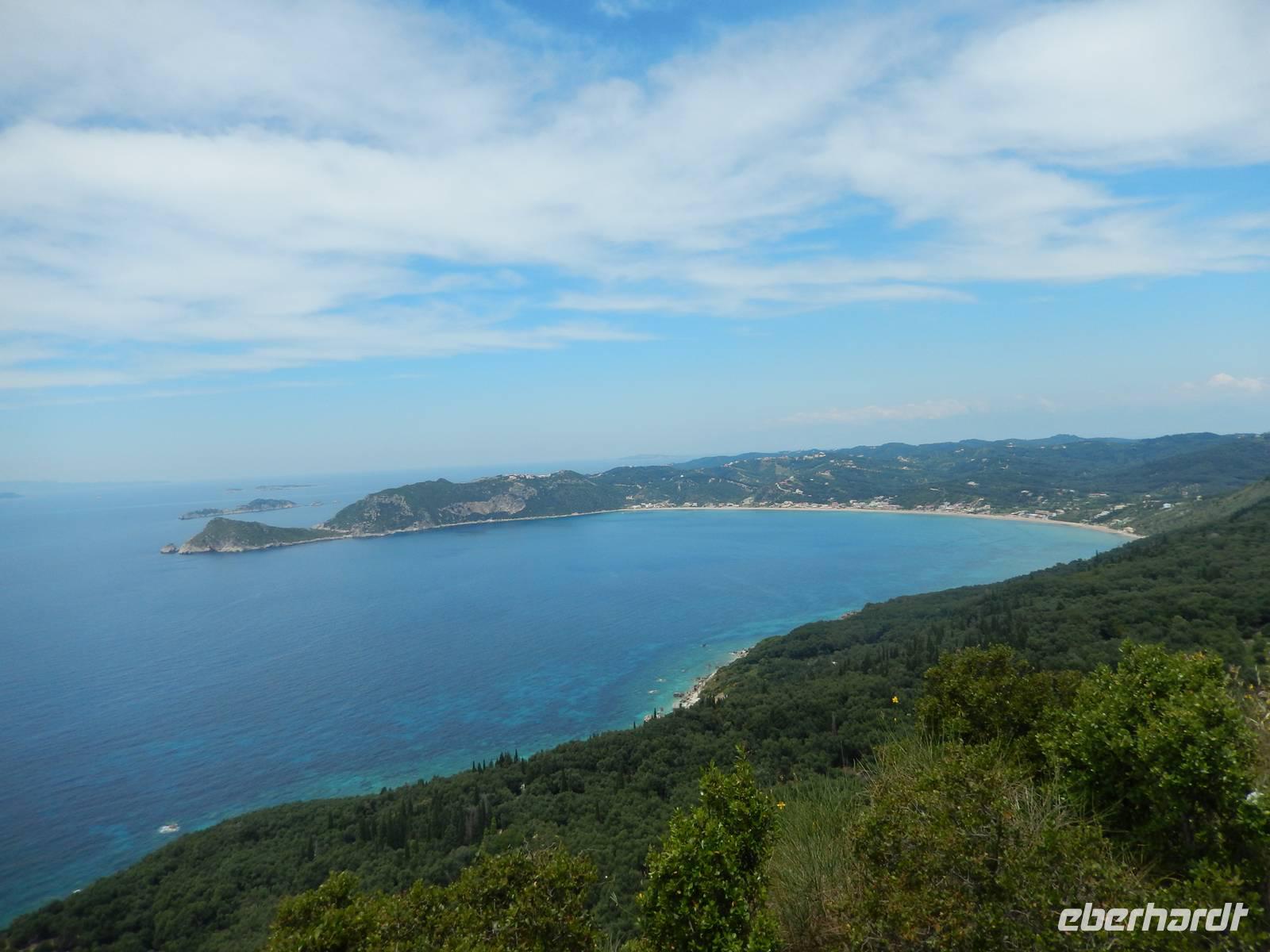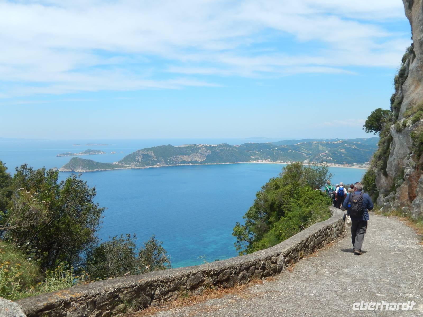 Die Zeit verging wie im Fluge und schon stand unser letzter gemeinsamer Wandertag auf dem Programm. Heute wollten wir die Westküste erkunden, also fuhr uns unser Busfahrer Menios zuerst nach Paleokastritsa. Wir besuchten das im 18. Jahrhunderte errichtete Kloster Moni Panagia Theotokoutis. Die weiß gekalkten Mauern sind umrahmt von einem blumenreichen Garten, einer kleinen Klosterkirche, einer stillgelegten Ölmühle und die teils als Museum genutzten Klostertrakte. Anschließend chauffierte uns Menios an den Strand von dem aus wir loswanderten. Der erste Teil hinauf ins Dorf Lakones war sehr steil, aber je höher wir kamen, desto gigantischer war die Aussicht. Wir hatten vom Aussichtspunkt „Bella Vista" wie der Name schon sagt einen tollen Blick auf die herrlichen Badebuchten und bewaldeten Kaps von Paleokastritsa. Wir genossen die Aussicht noch ein paar Minuten bei einem leckeren Eis oder einem Kaffee. Danach ging es wieder bergab, denn unser Tagesziel war Agios Georgios Pagon. Bis dahin musste man immer wieder stehen bleiben, denn die Aussicht auf das türkisblaue Meer war einfach traumhaft. Im Ort angekommen, erfrischten sich einige im kühlen Nass oder genossen die griechische Atmosphäre in einer Taverne. Nun war langsam die Zeit des Abschieds gekommen, denn Eleni verließ uns auf dem Weg ins Hotel. Wir verabschiedeten uns und bedankten uns bei ihr und natürlich auch ganz besonders unserem lieben Busfahrer Menios für die gute und sichere Fahrt. Unsere Wanderreise ließen wir am Abend bei griechischen Spezialitäten und Musik freudig ausklingen.