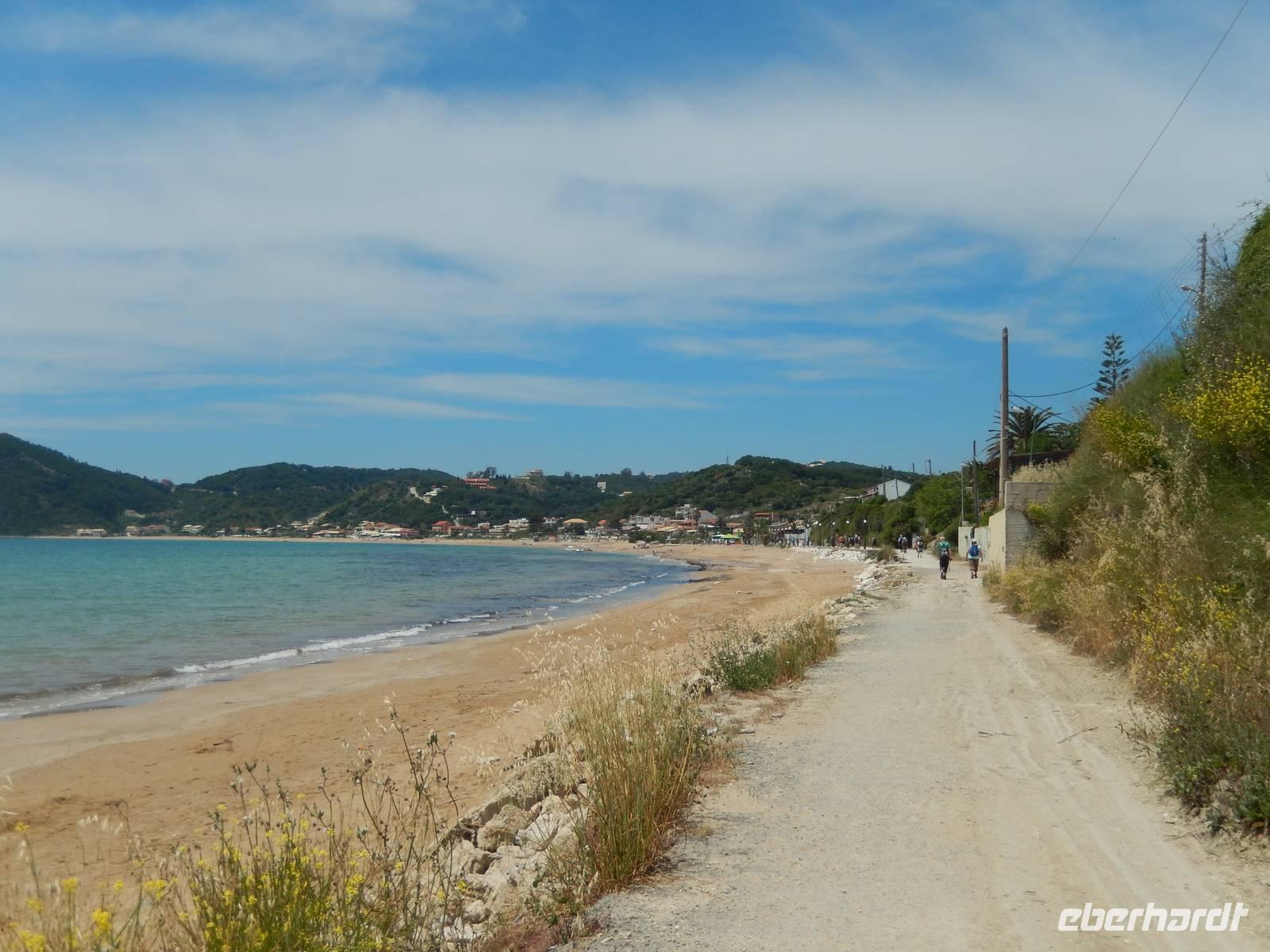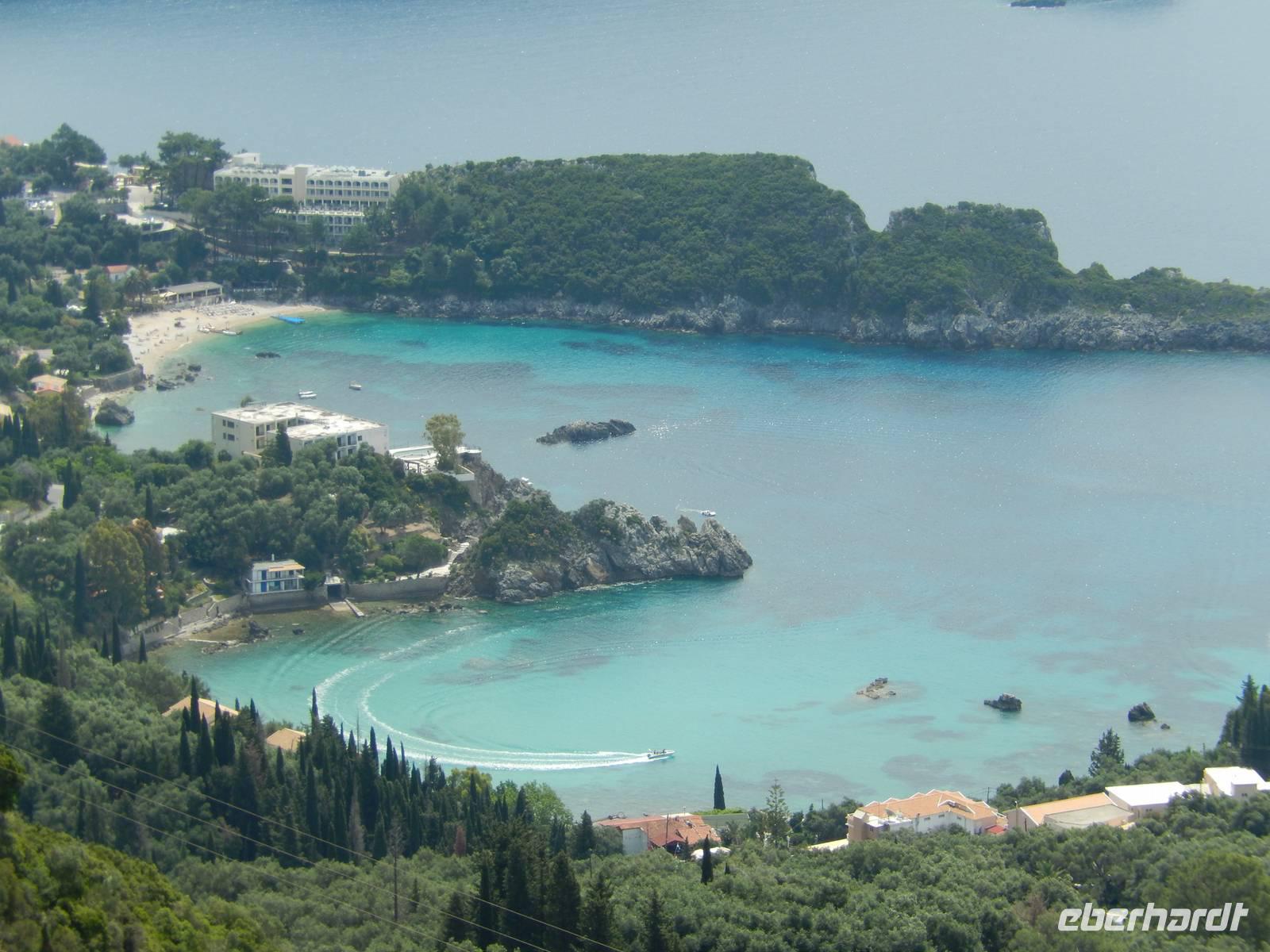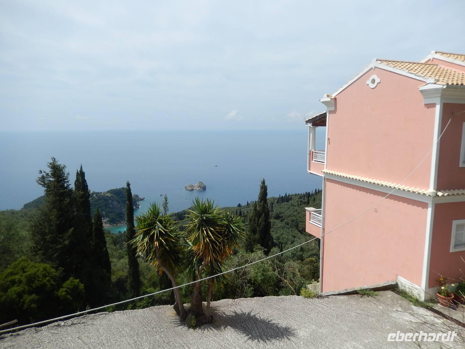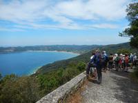 Die Zeit verging wie im Fluge und schon stand unser letzter gemeinsamer Wandertag auf dem Programm. Heute wollten wir die Westküste erkunden, also fuhr uns unser Busfahrer Menios zuerst nach Paleokastritsa. Wir besuchten das im 18. Jahrhunderte errichtete Kloster Moni Panagia Theotokoutis. Die weiß gekalkten Mauern sind umrahmt von einem blumenreichen Garten, einer kleinen Klosterkirche, einer stillgelegten Ölmühle und die teils als Museum genutzten Klostertrakte. Anschließend chauffierte uns Menios an den Strand von dem aus wir loswanderten. Der erste Teil hinauf ins Dorf Lakones war sehr steil, aber je höher wir kamen, desto gigantischer war die Aussicht. Wir hatten vom Aussichtspunkt „Bella Vista" wie der Name schon sagt einen tollen Blick auf die herrlichen Badebuchten und bewaldeten Kaps von Paleokastritsa. Wir genossen die Aussicht noch ein paar Minuten bei einem leckeren Eis oder einem Kaffee. Danach ging es wieder bergab, denn unser Tagesziel war Agios Georgios Pagon. Bis dahin musste man immer wieder stehen bleiben, denn die Aussicht auf das türkisblaue Meer war einfach traumhaft. Im Ort angekommen, erfrischten sich einige im kühlen Nass oder genossen die griechische Atmosphäre in einer Taverne. Nun war langsam die Zeit des Abschieds gekommen, denn Eleni verließ uns auf dem Weg ins Hotel. Wir verabschiedeten uns und bedankten uns bei ihr und natürlich auch ganz besonders unserem lieben Busfahrer Menios für die gute und sichere Fahrt. Unsere Wanderreise ließen wir am Abend bei griechischen Spezialitäten und Musik freudig ausklingen.